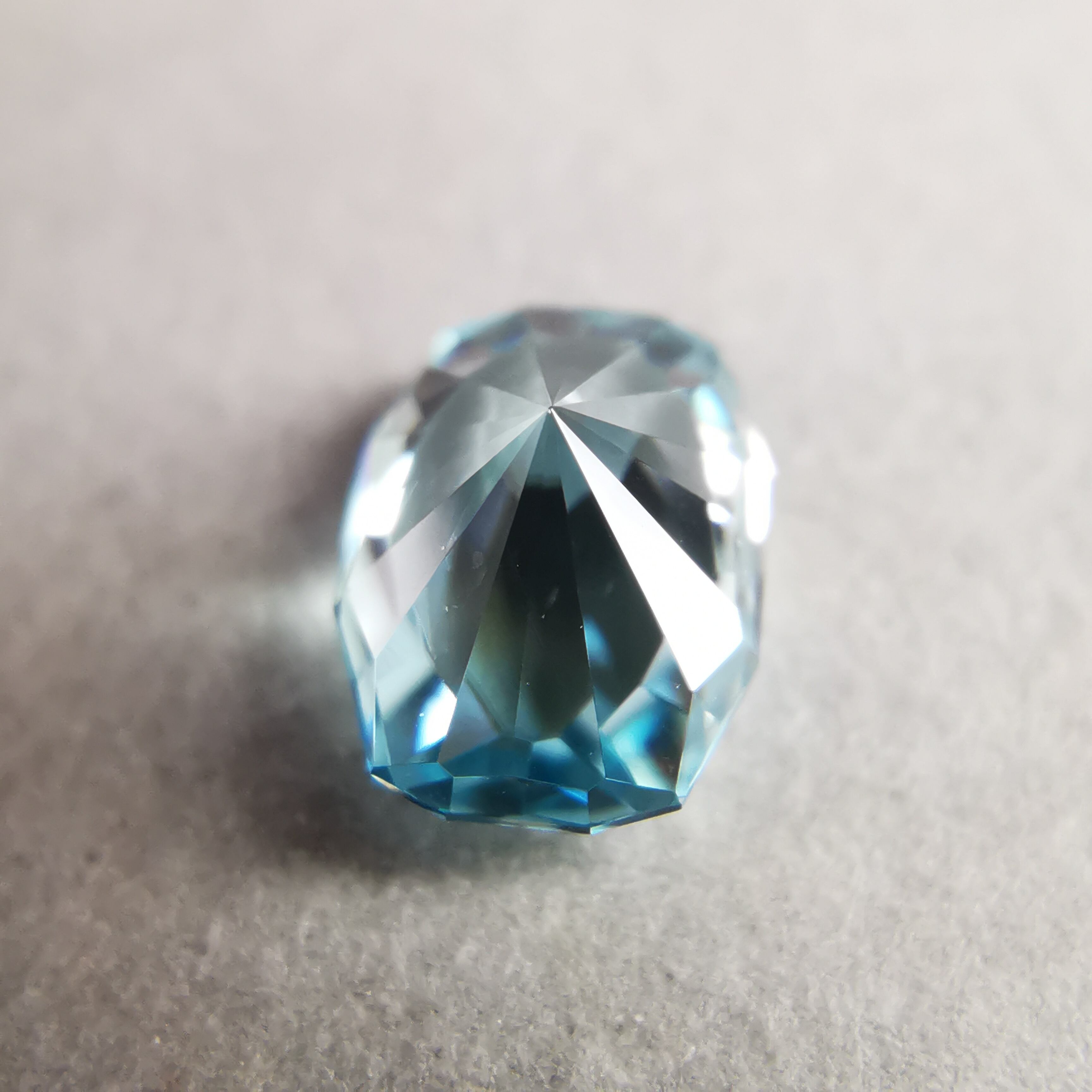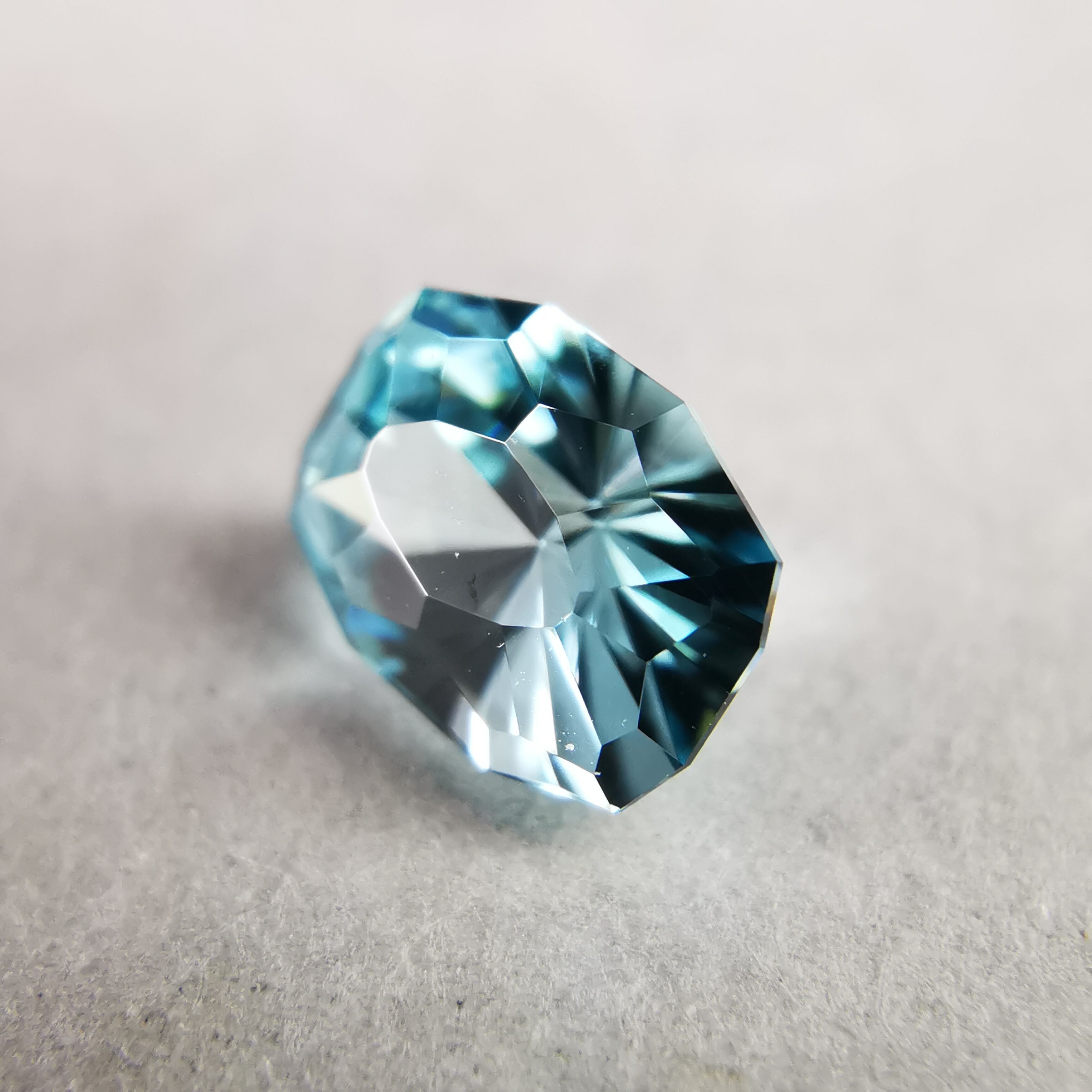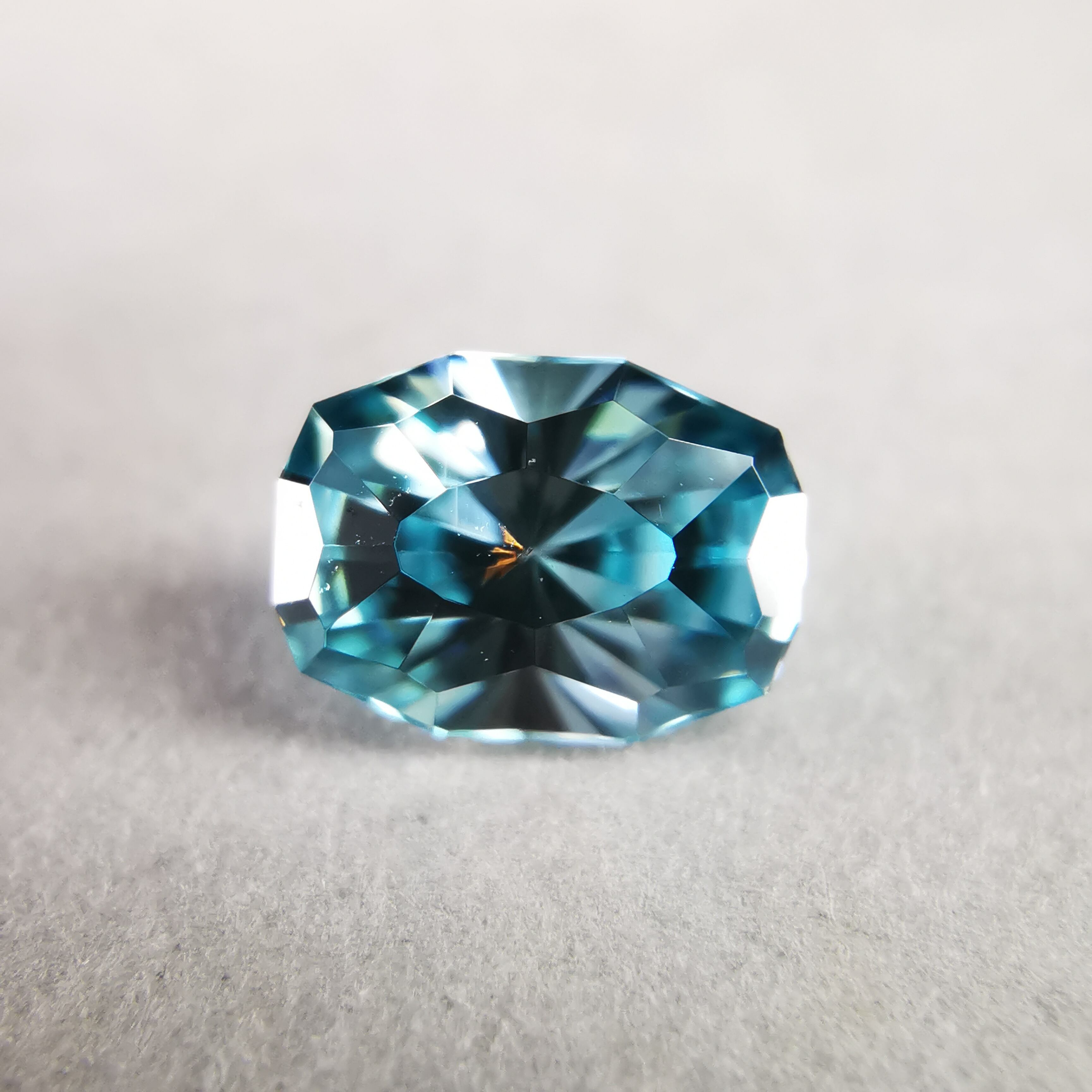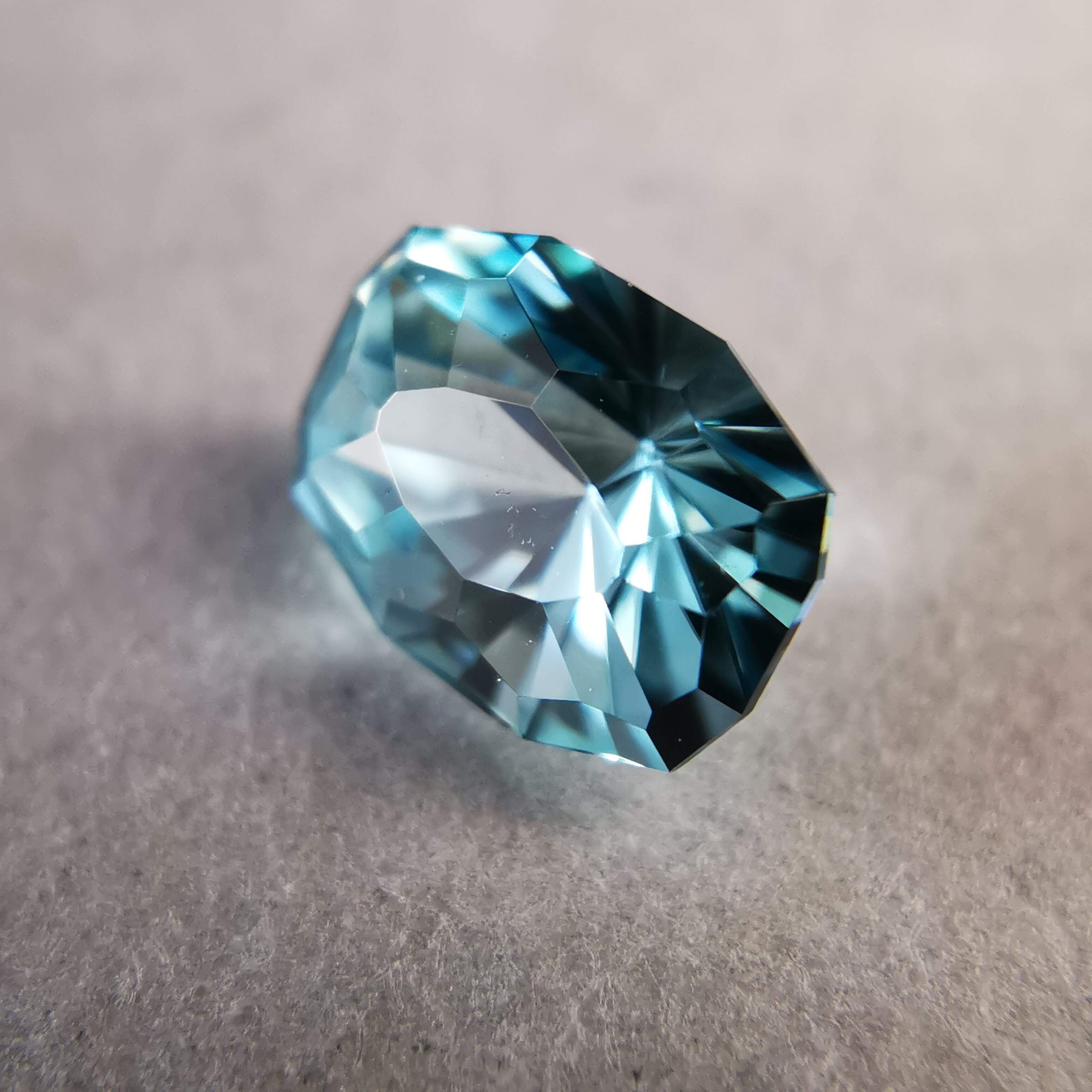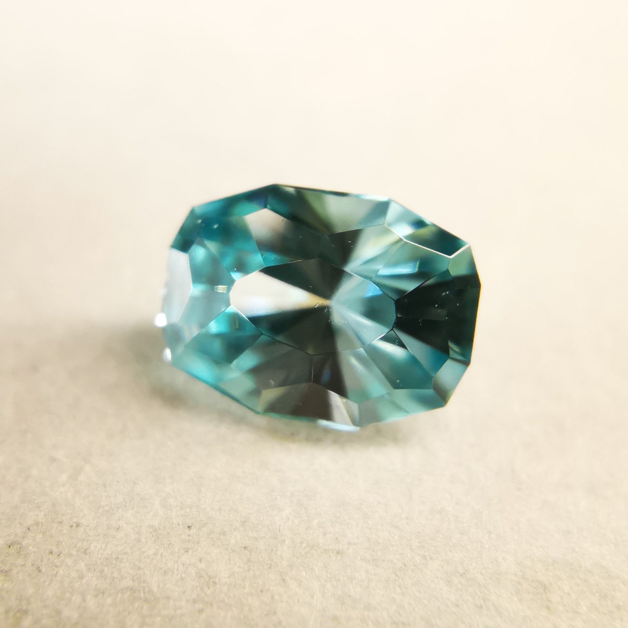 カスタムクッションカットの両端に色だまりがあり、やや色濃く南国の海の色、中心はもう少し透明感が高く、色の濃淡が楽しい一石です。