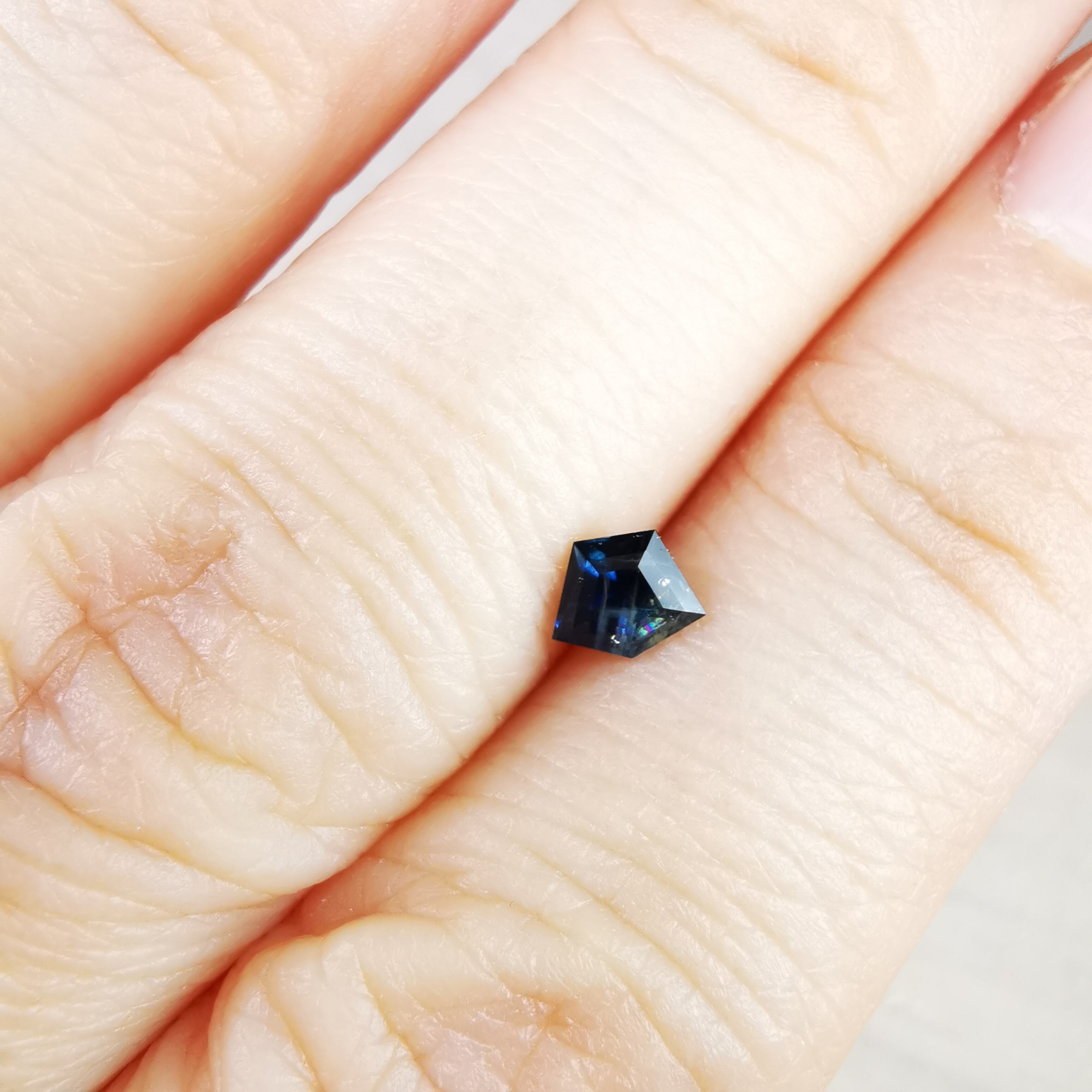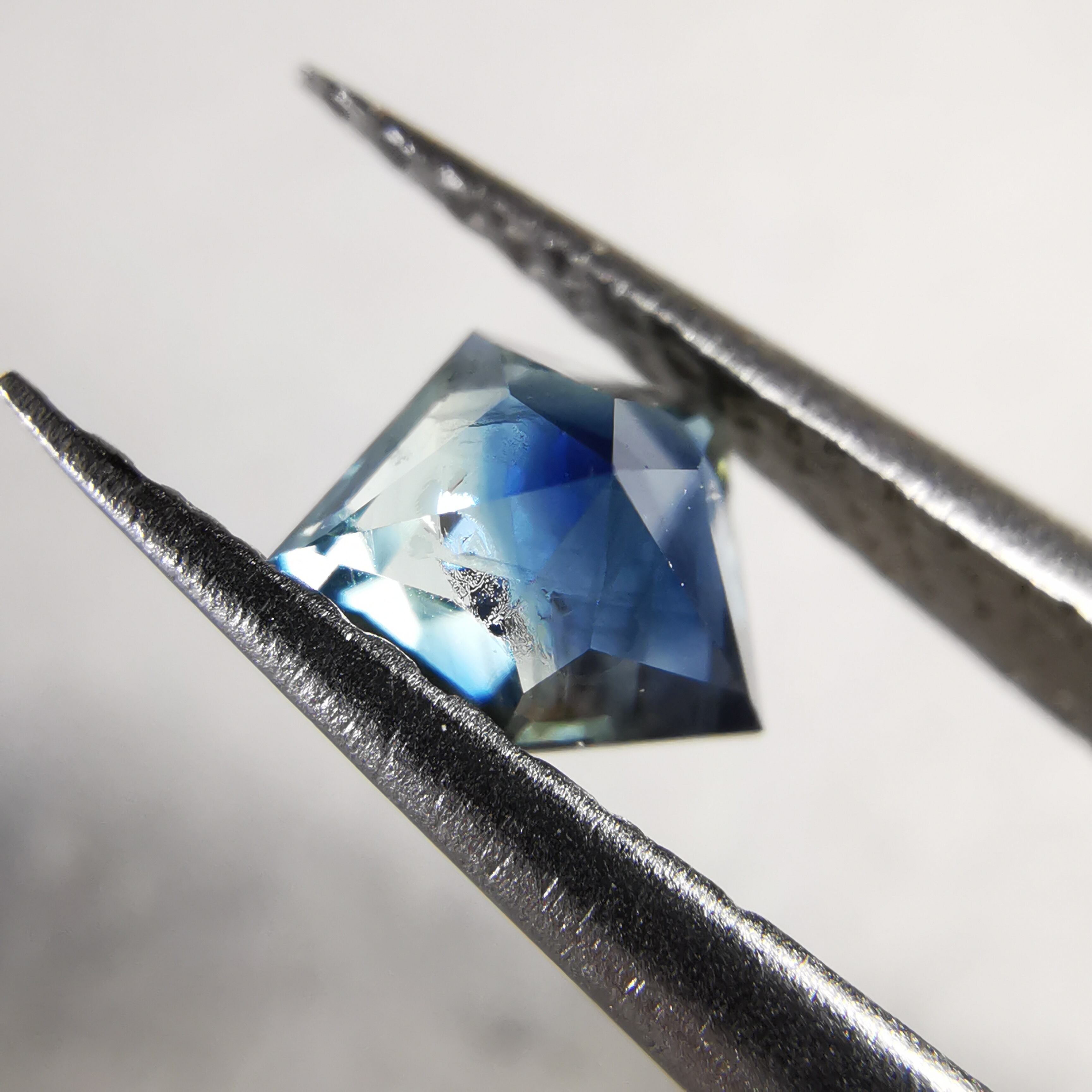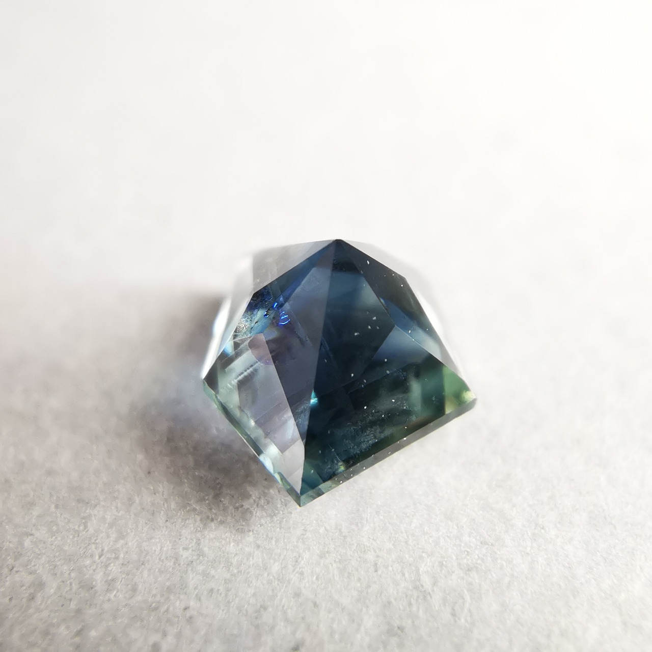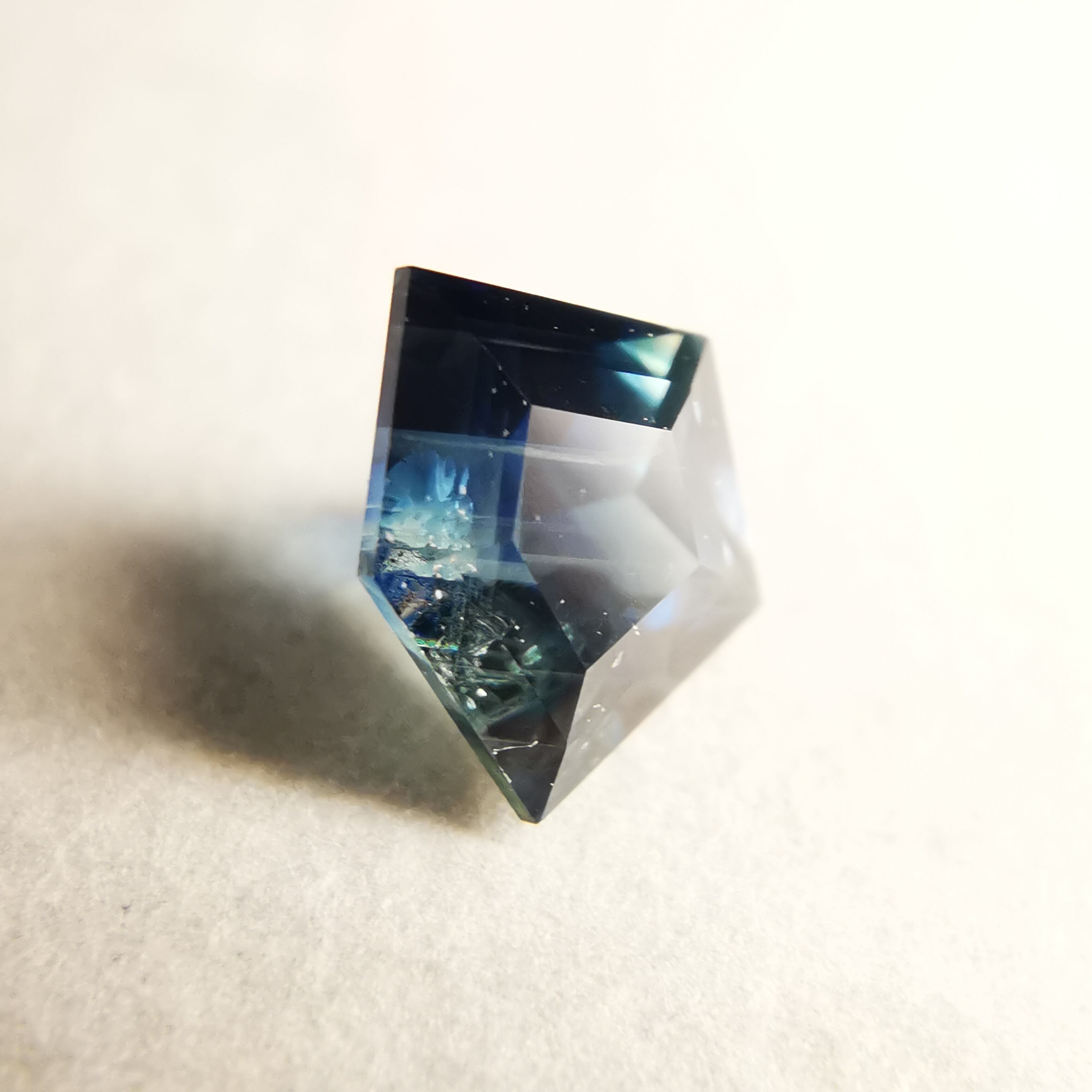 内包物とクラックがたっぷり入り、イエロー、ブルー、グリーンが混じり合ったサファイアです。