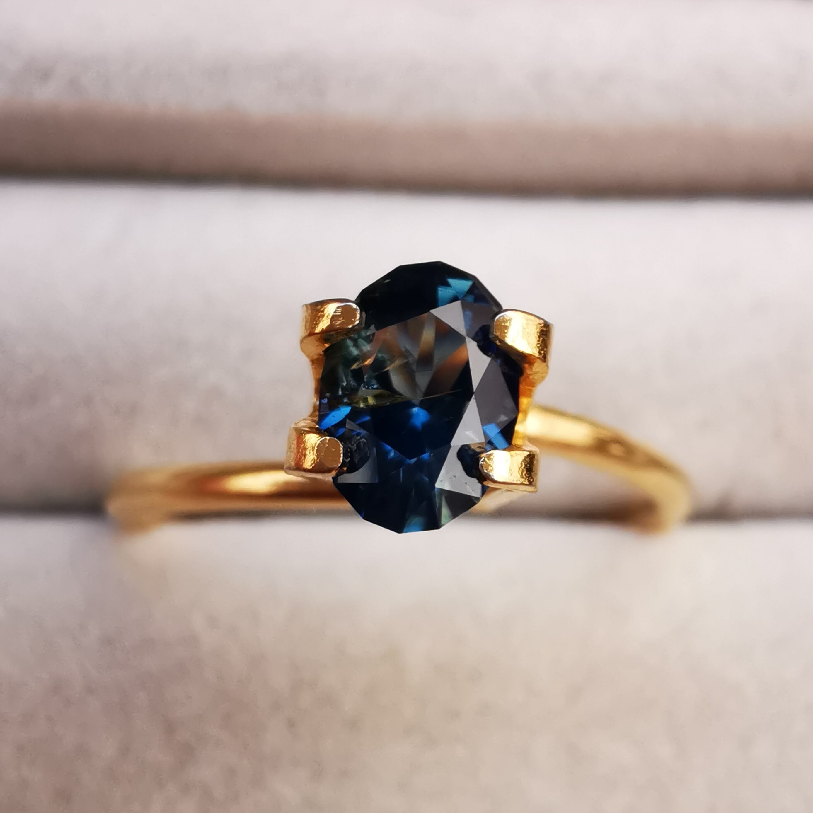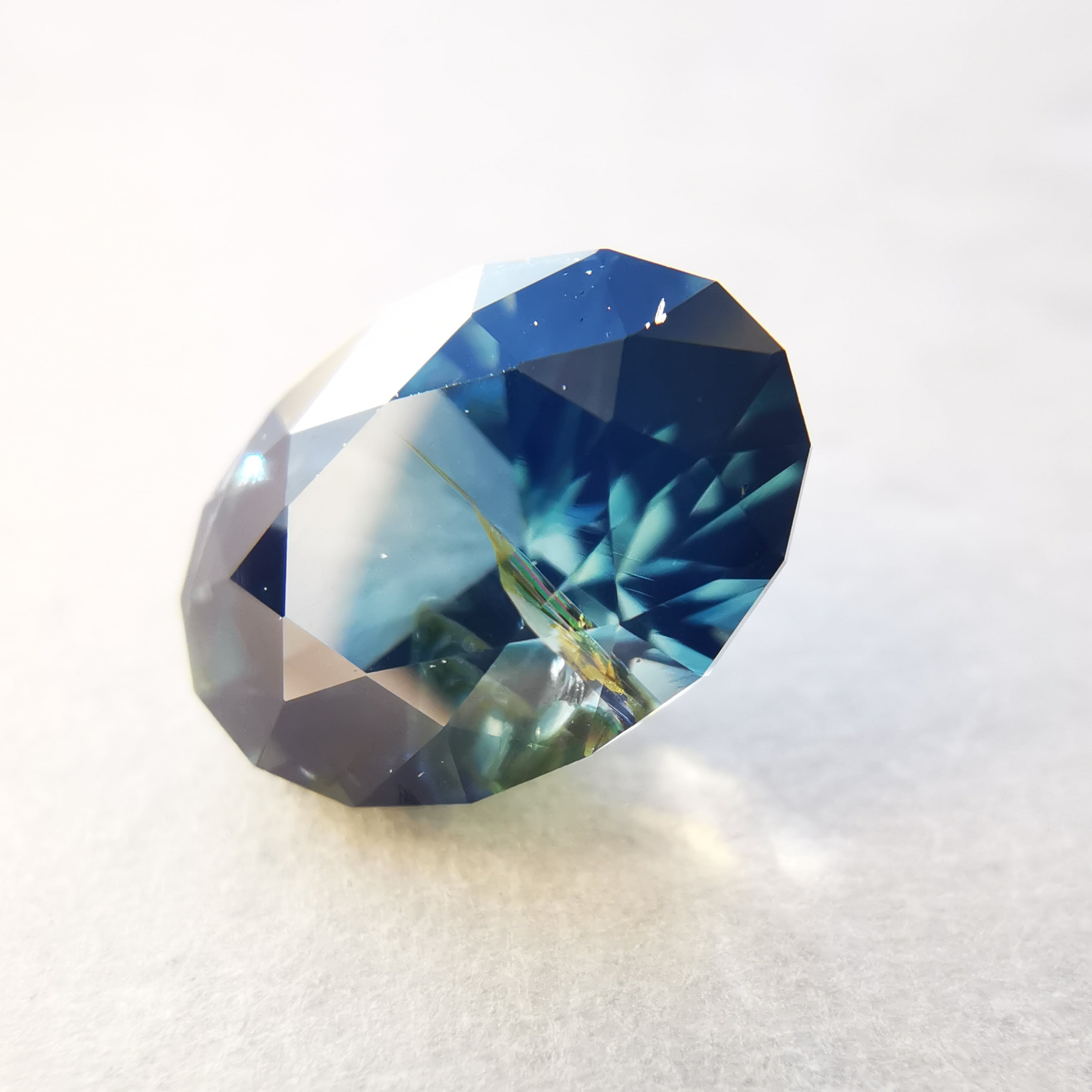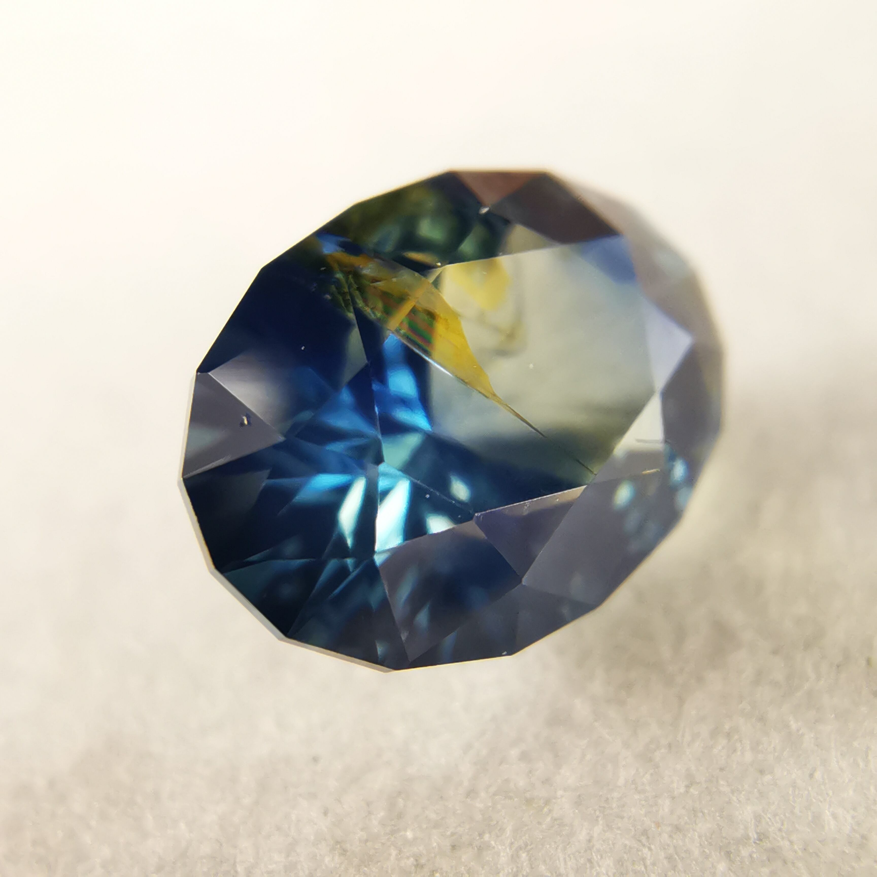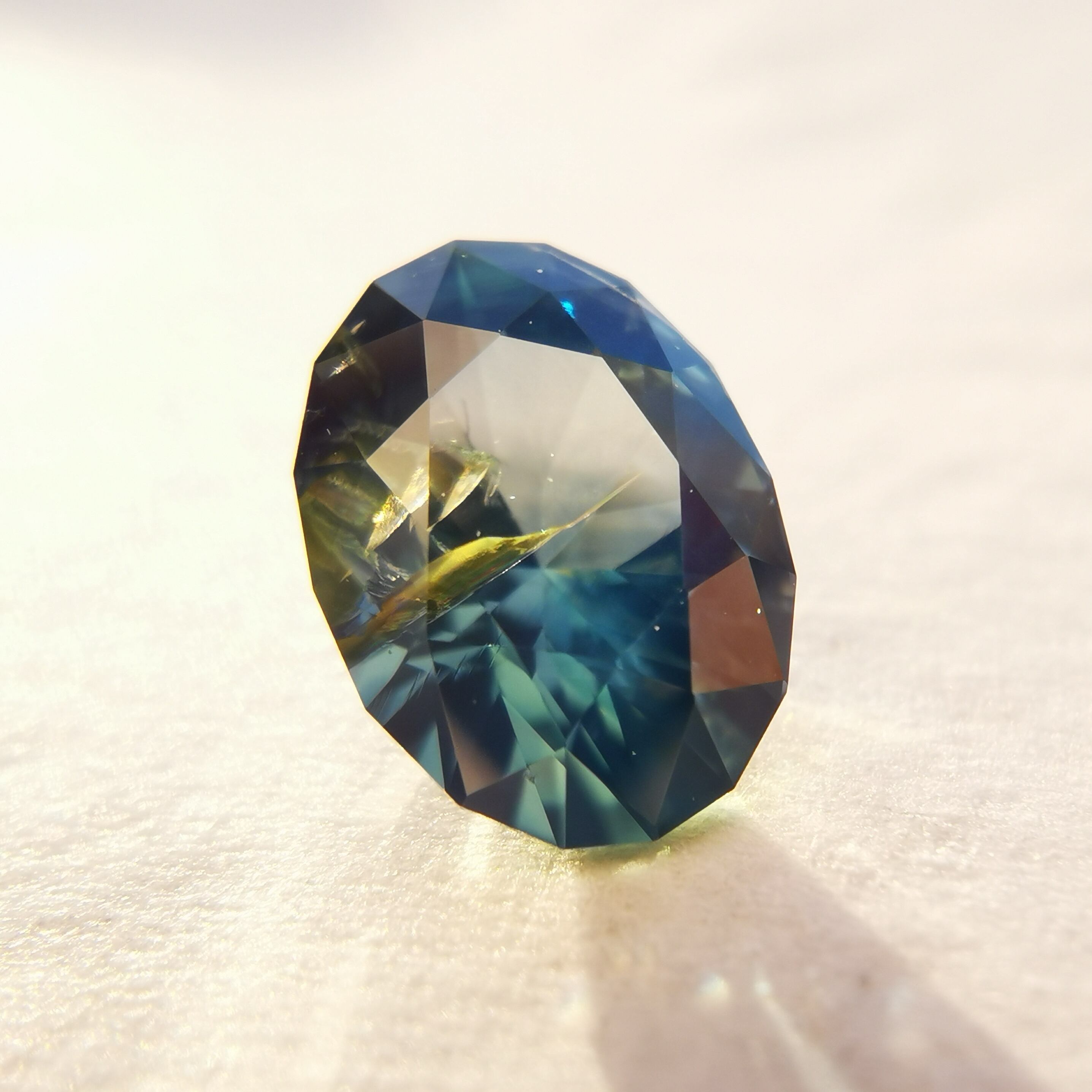 ティールカラーのサファイアに、一筋の煙のような黄色いインクルージョンが目を引きます。