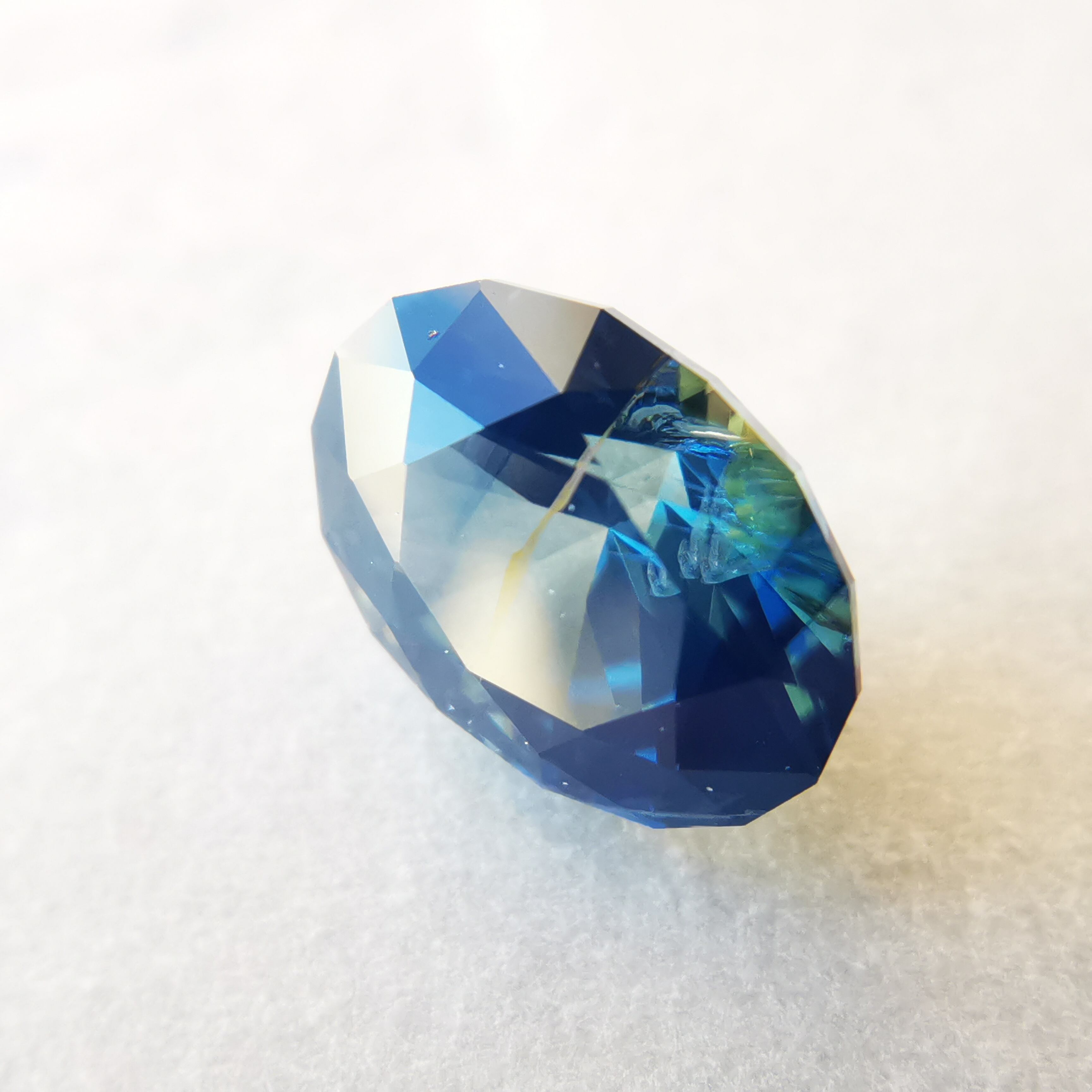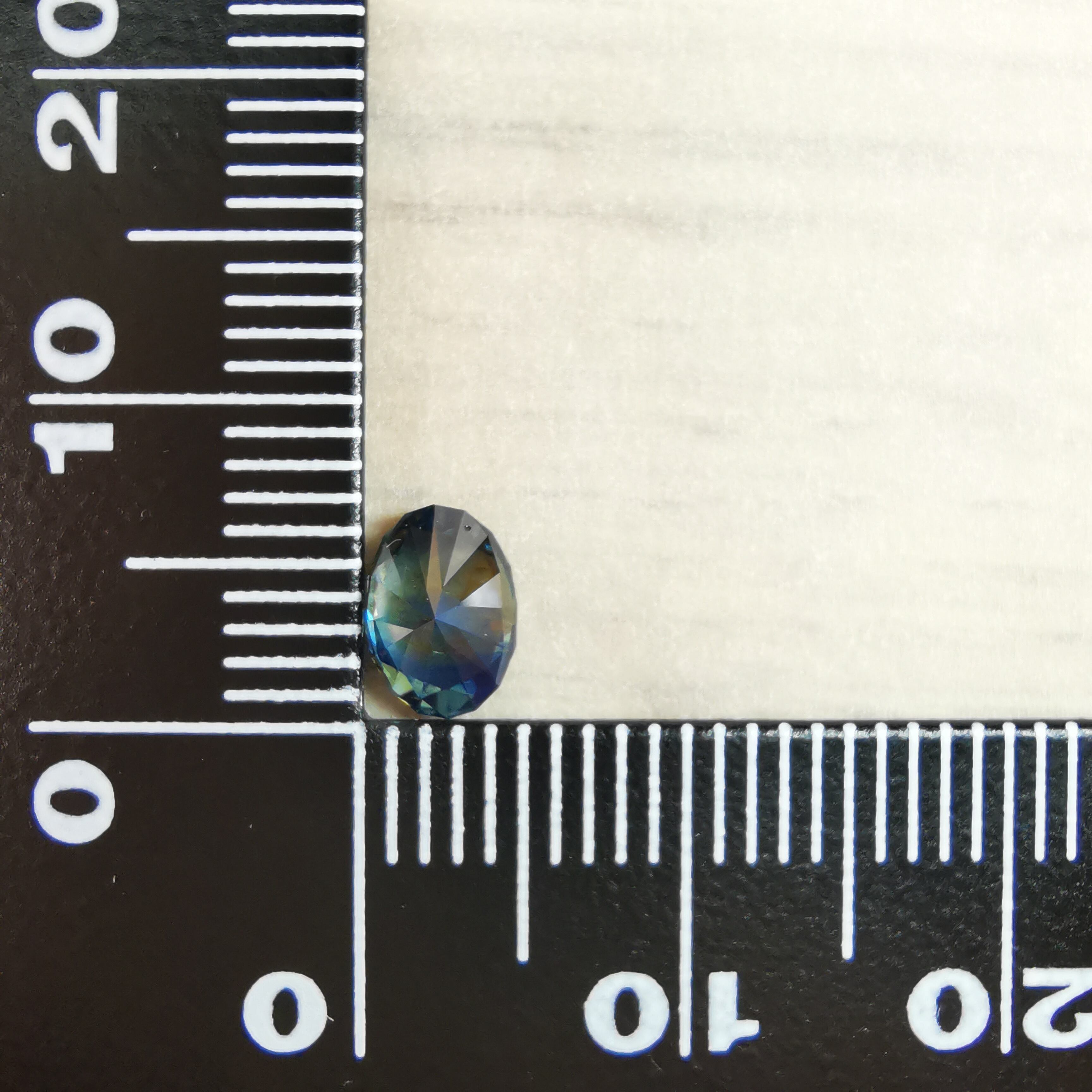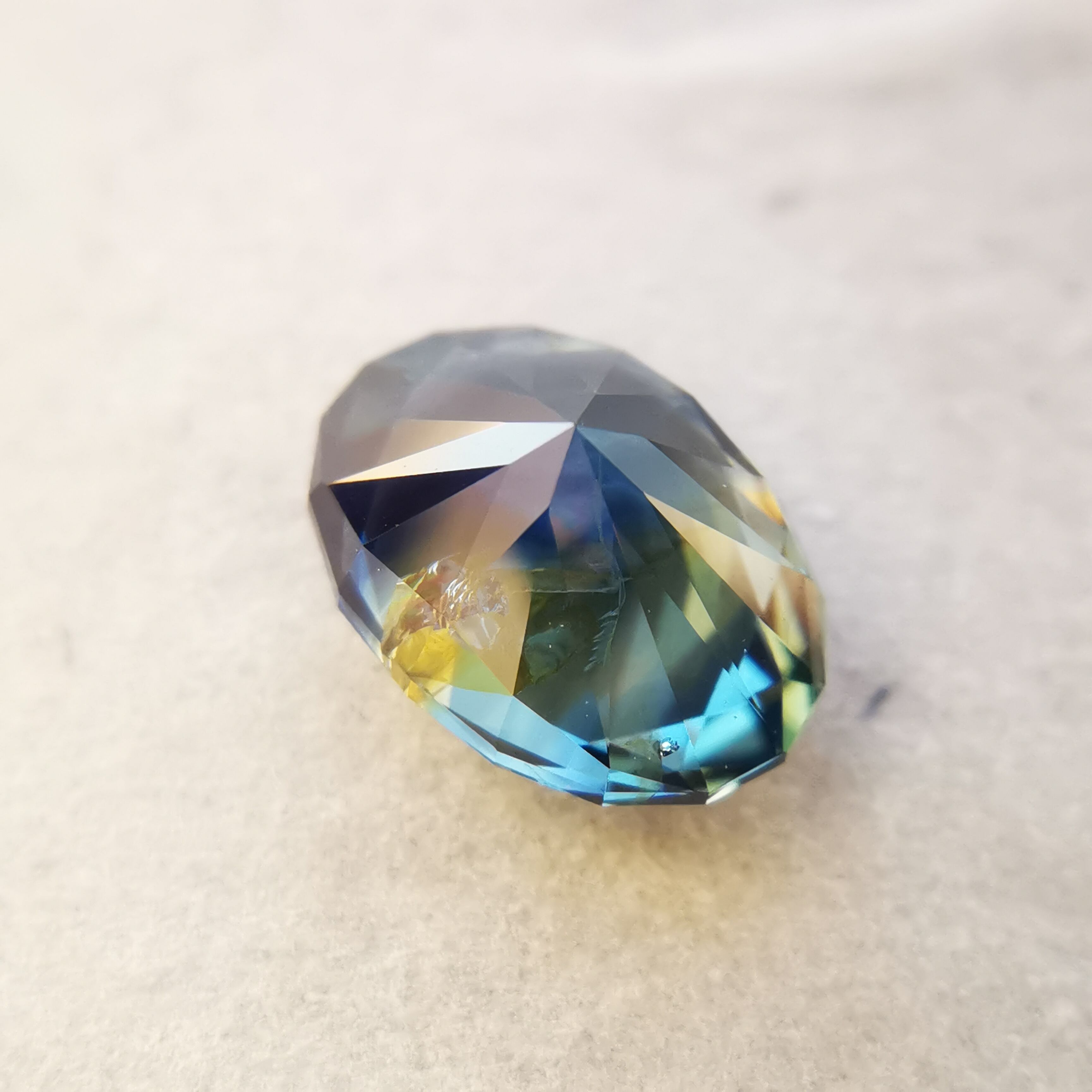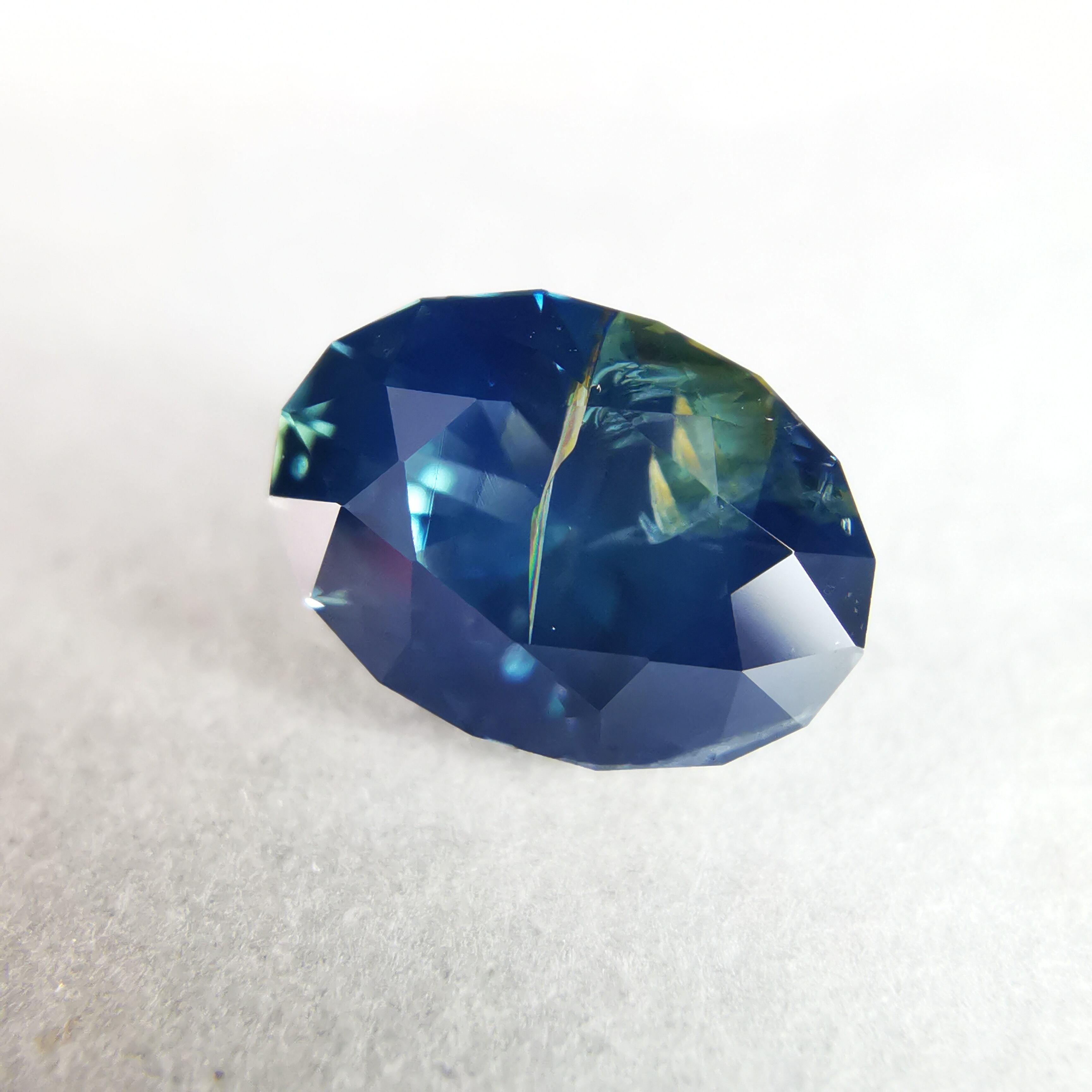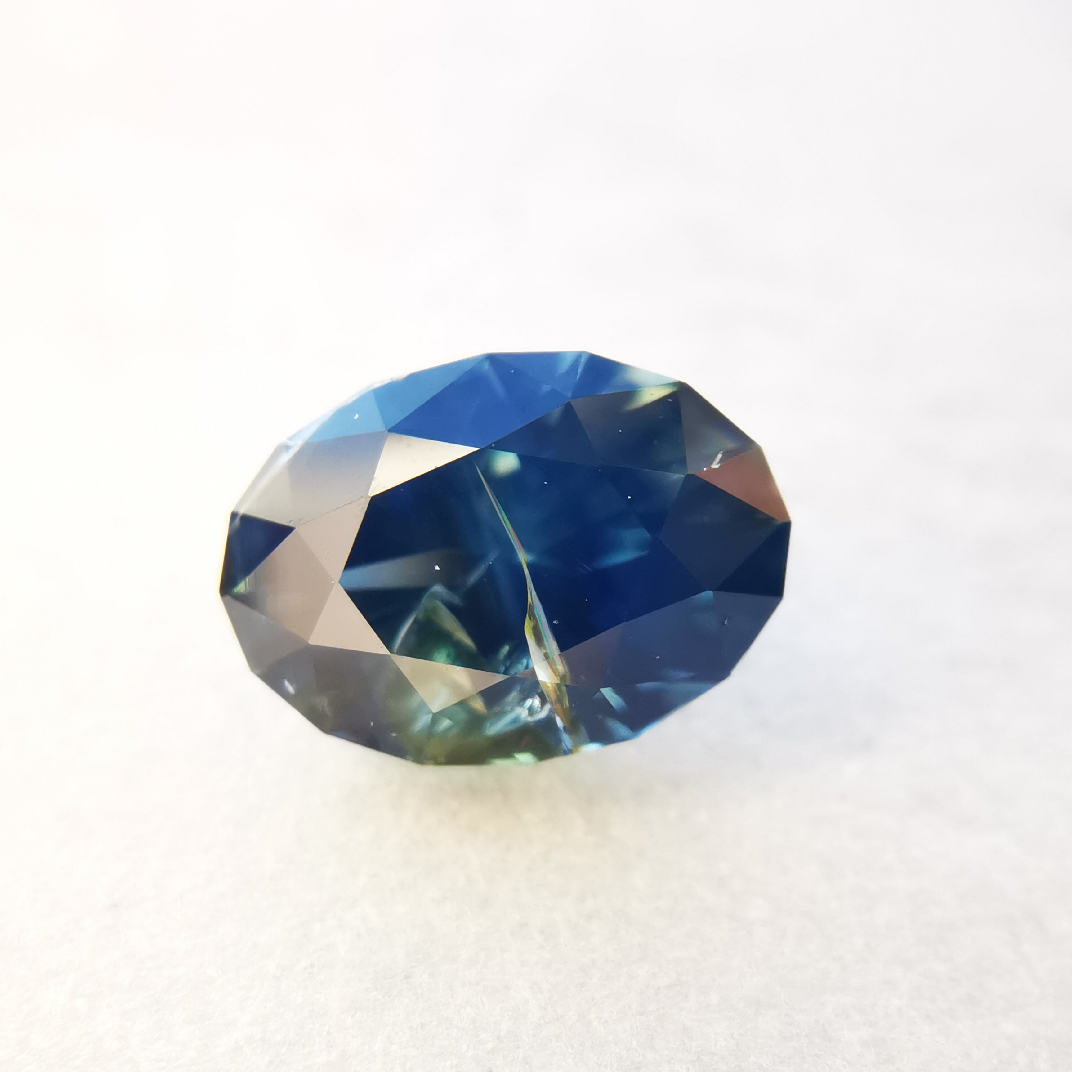 ティールカラーのサファイアに、一筋の煙のような黄色いインクルージョンが目を引きます。