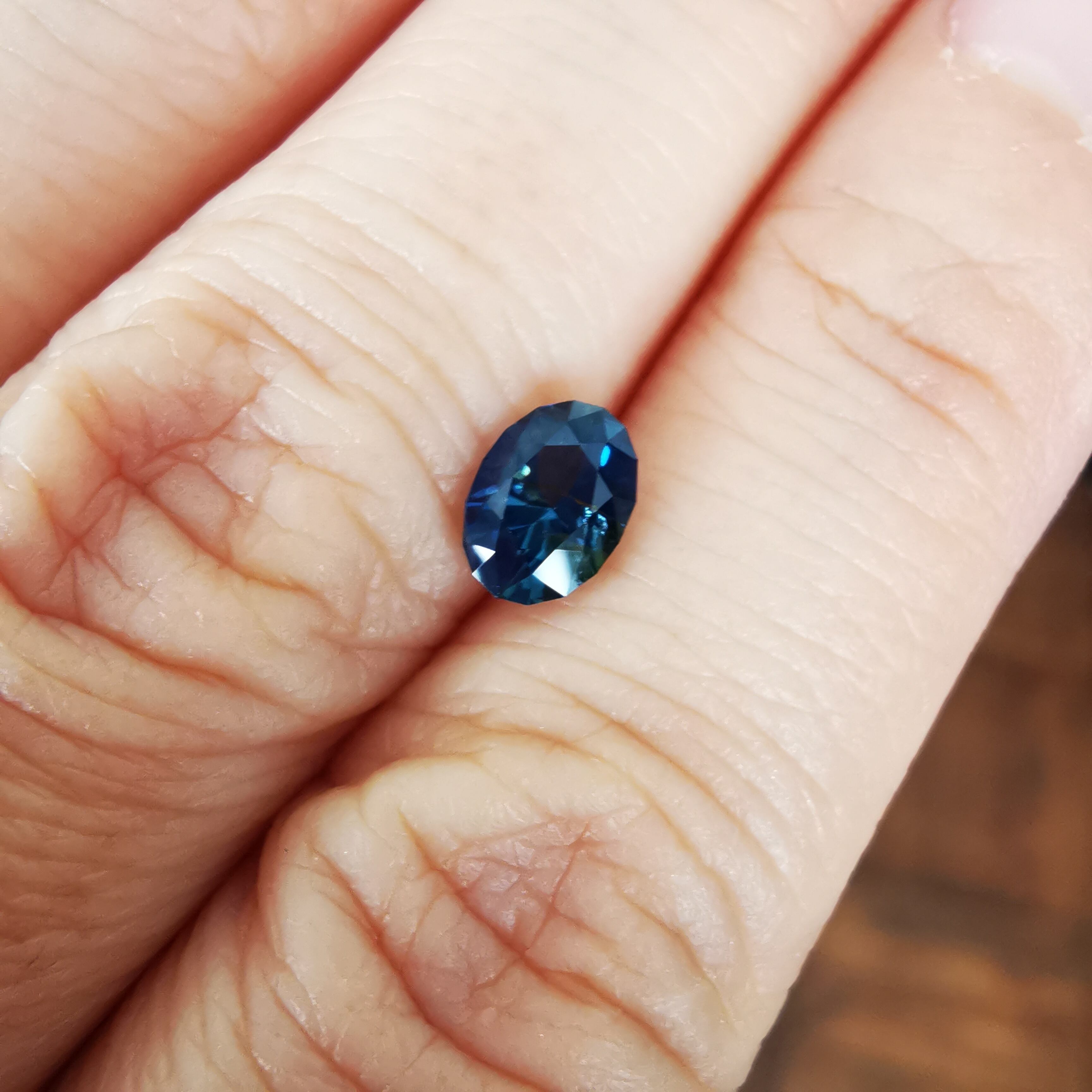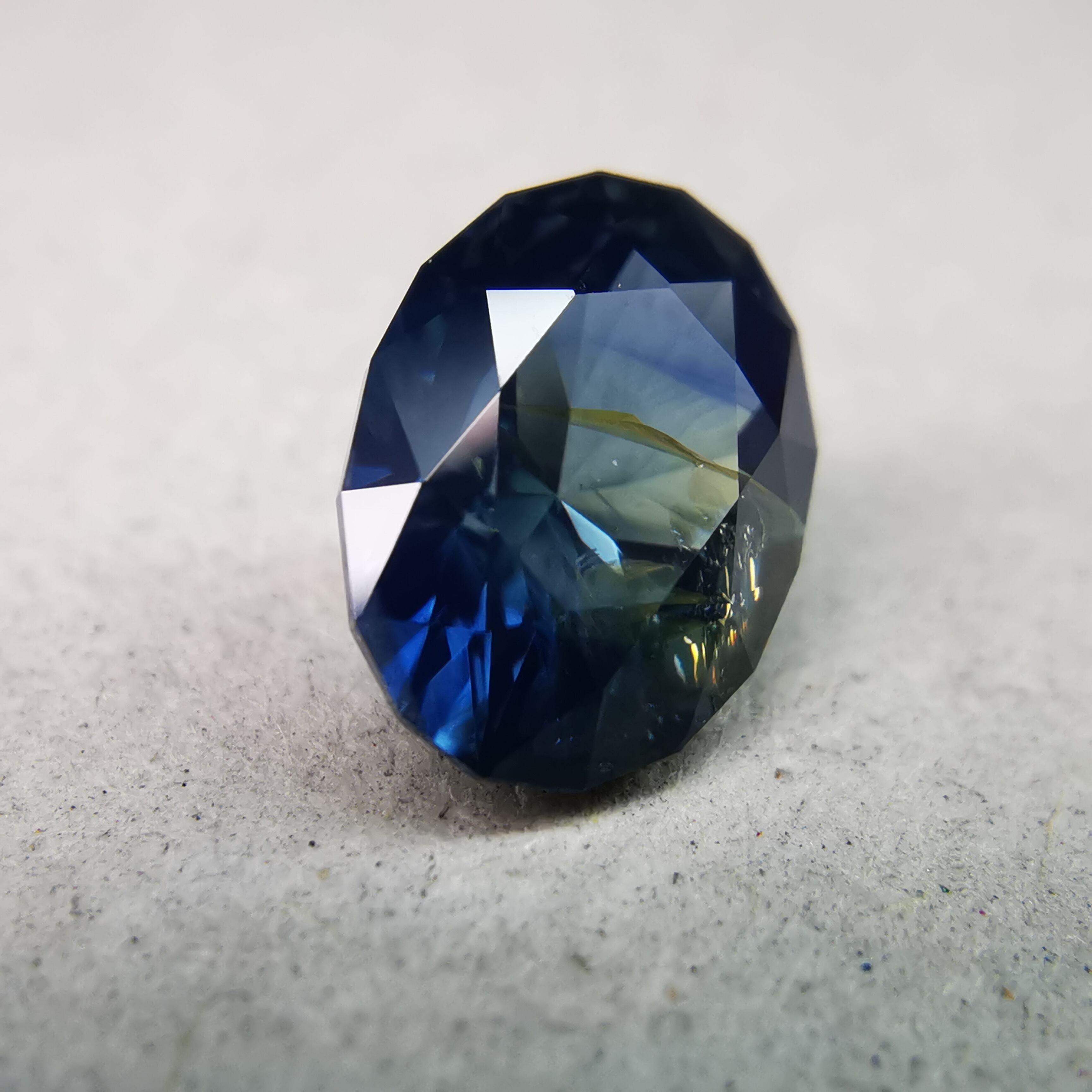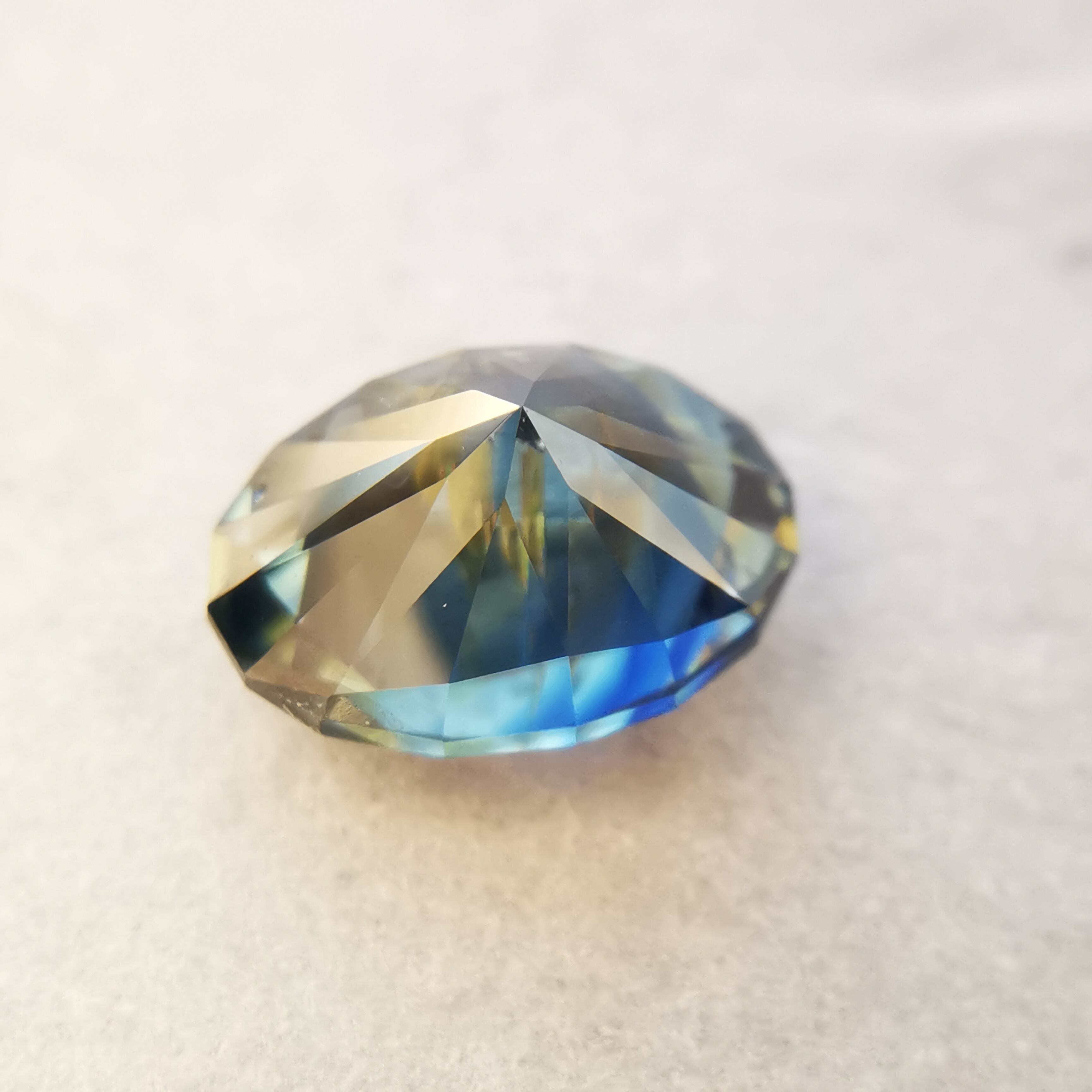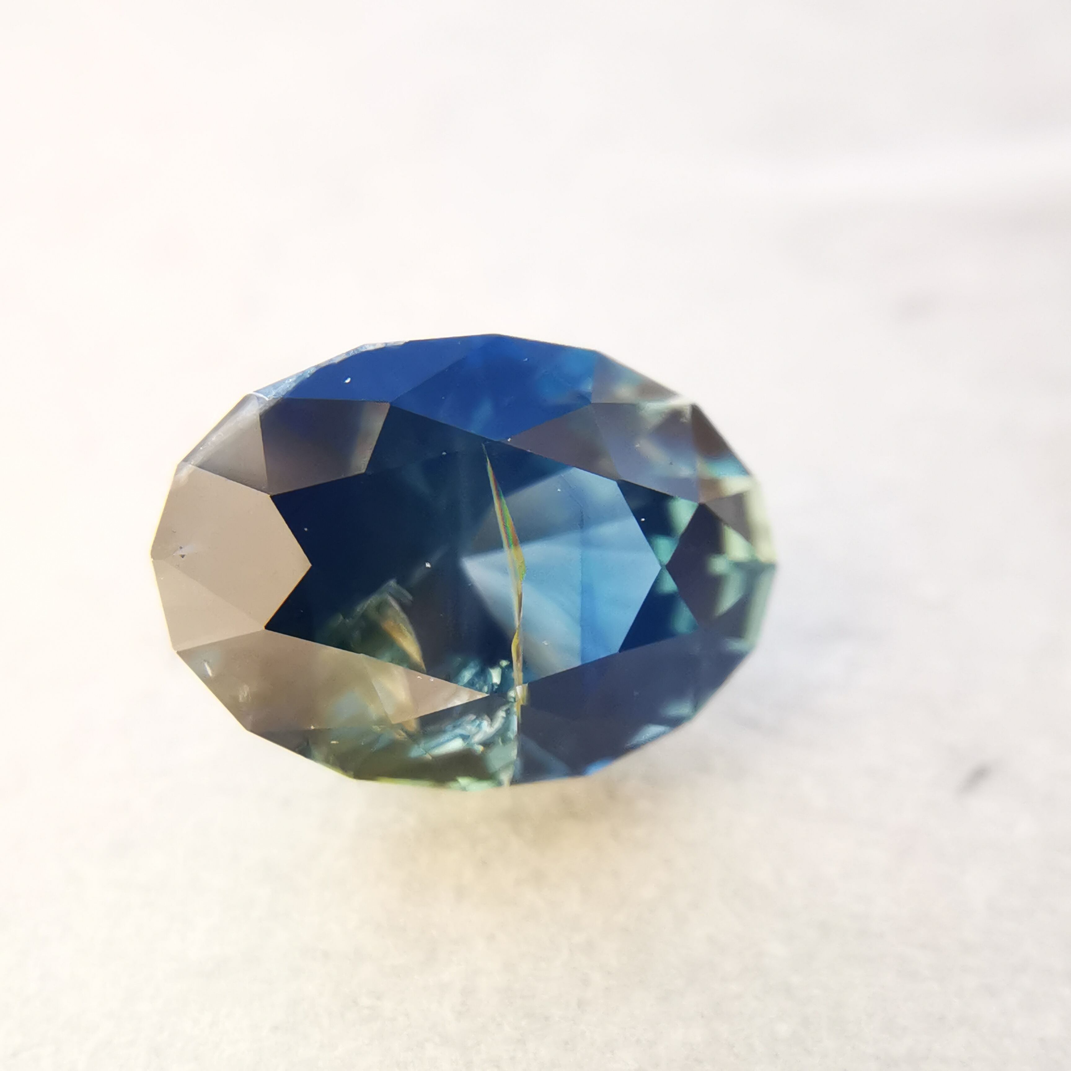 ティールカラーのサファイアに、一筋の煙のような黄色いインクルージョンが目を引きます。