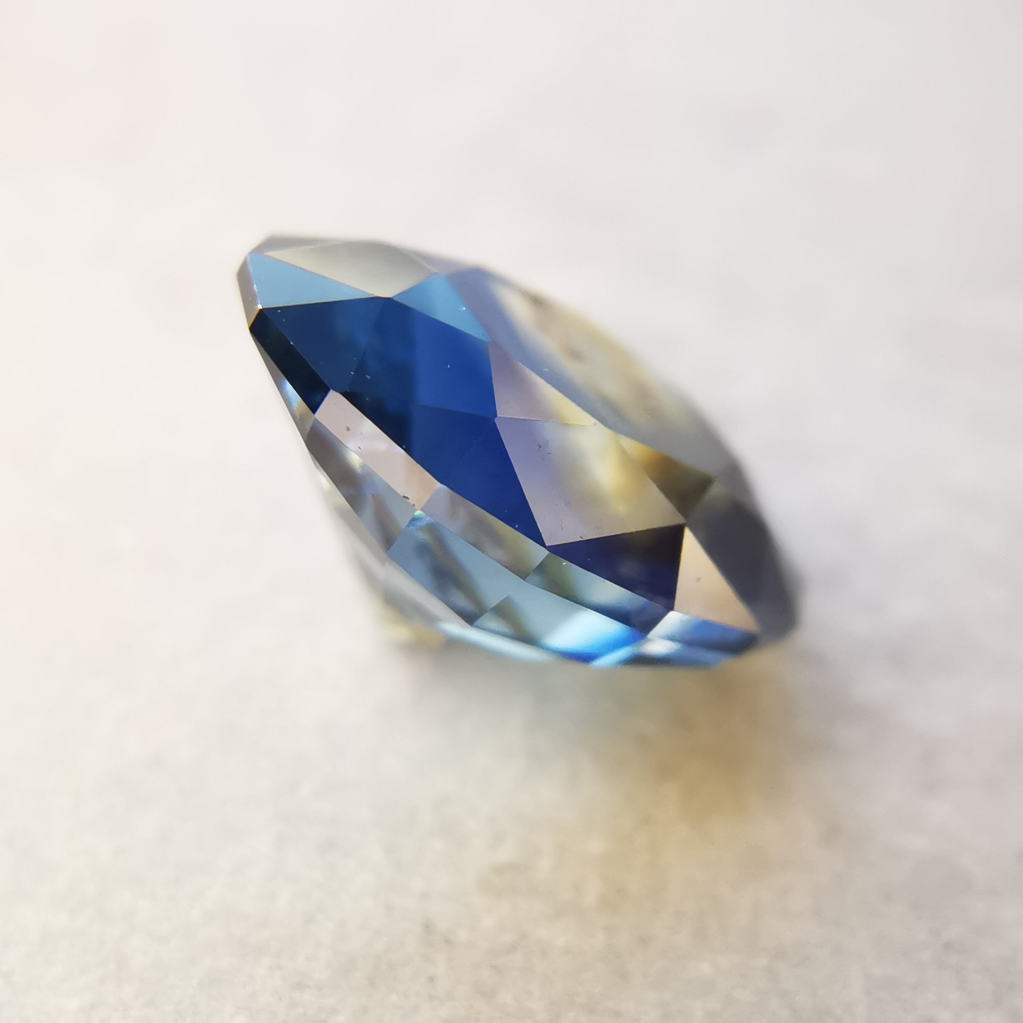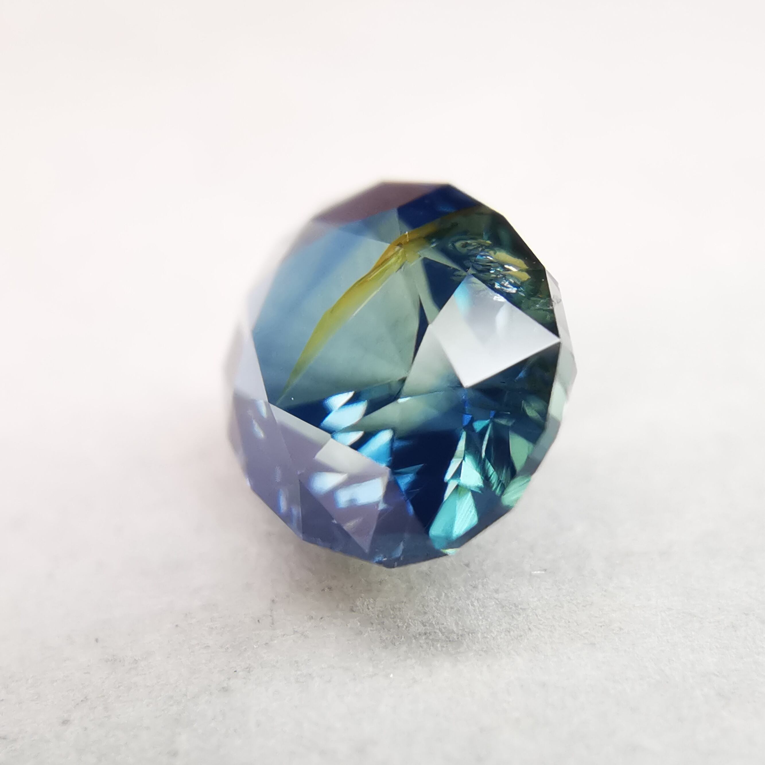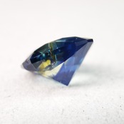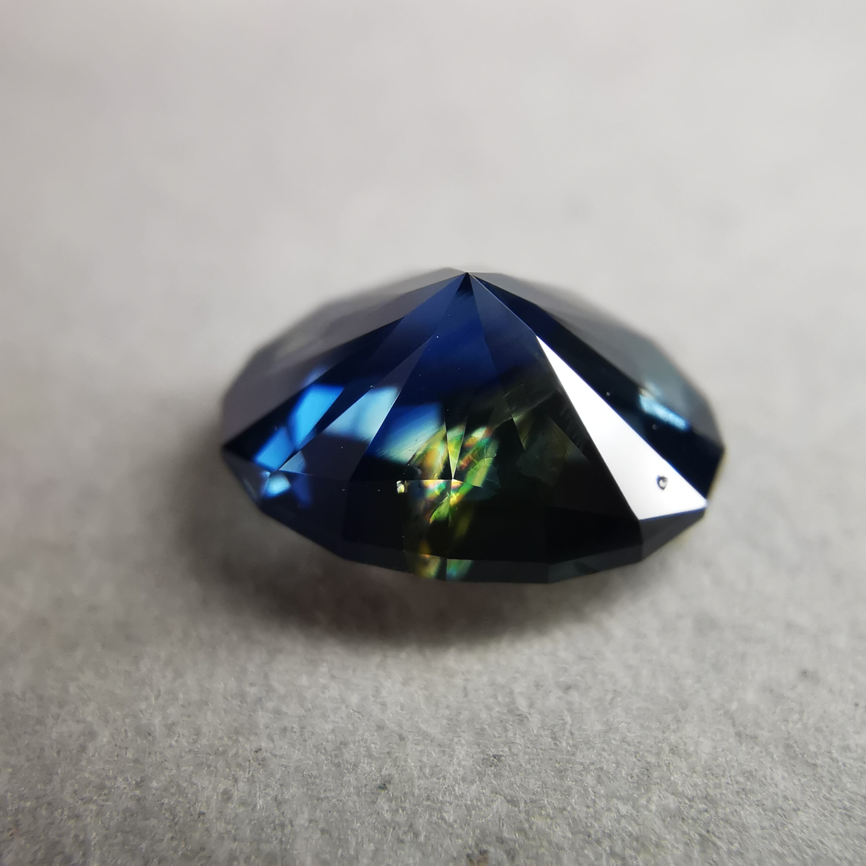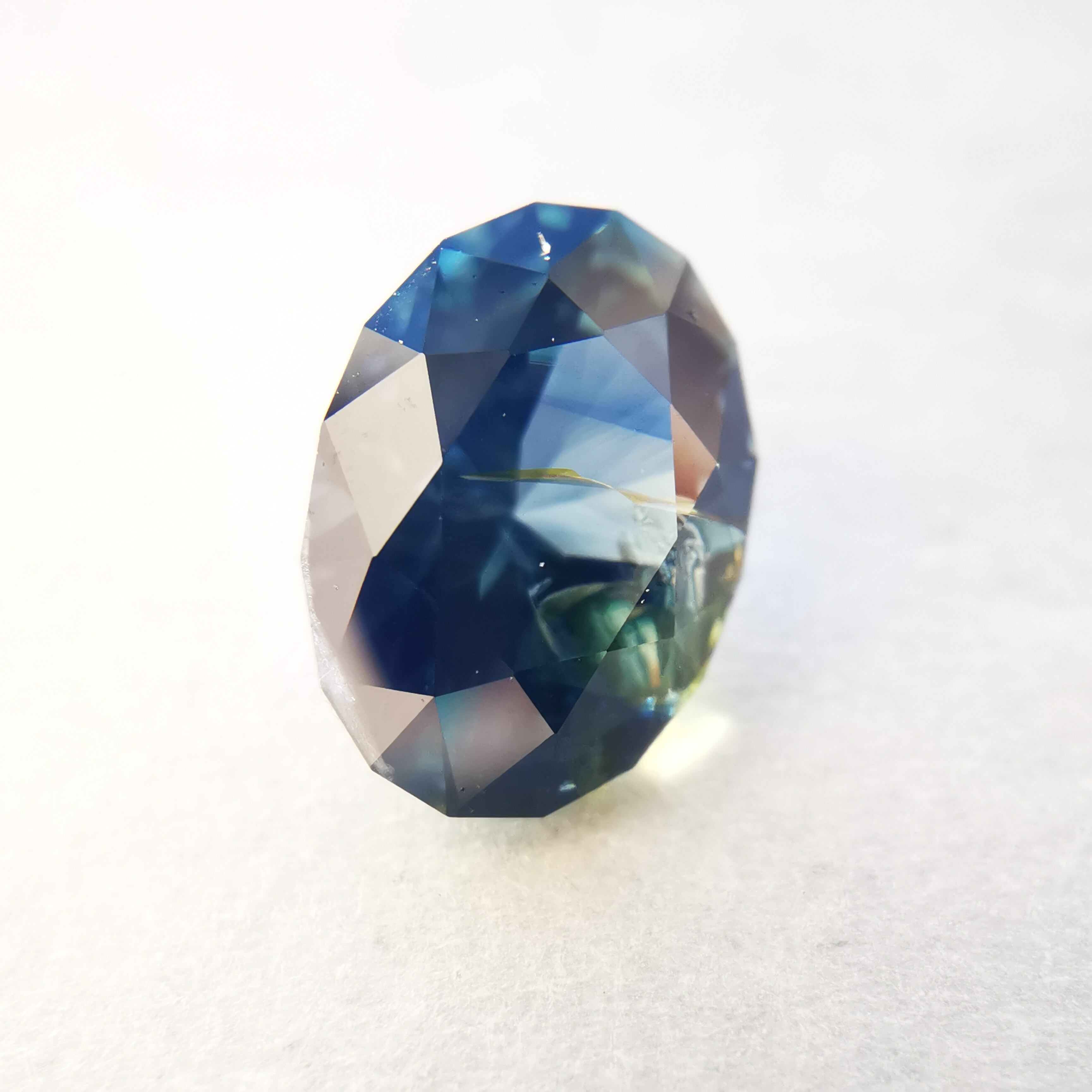 ティールカラーのサファイアに、一筋の煙のような黄色いインクルージョンが目を引きます。