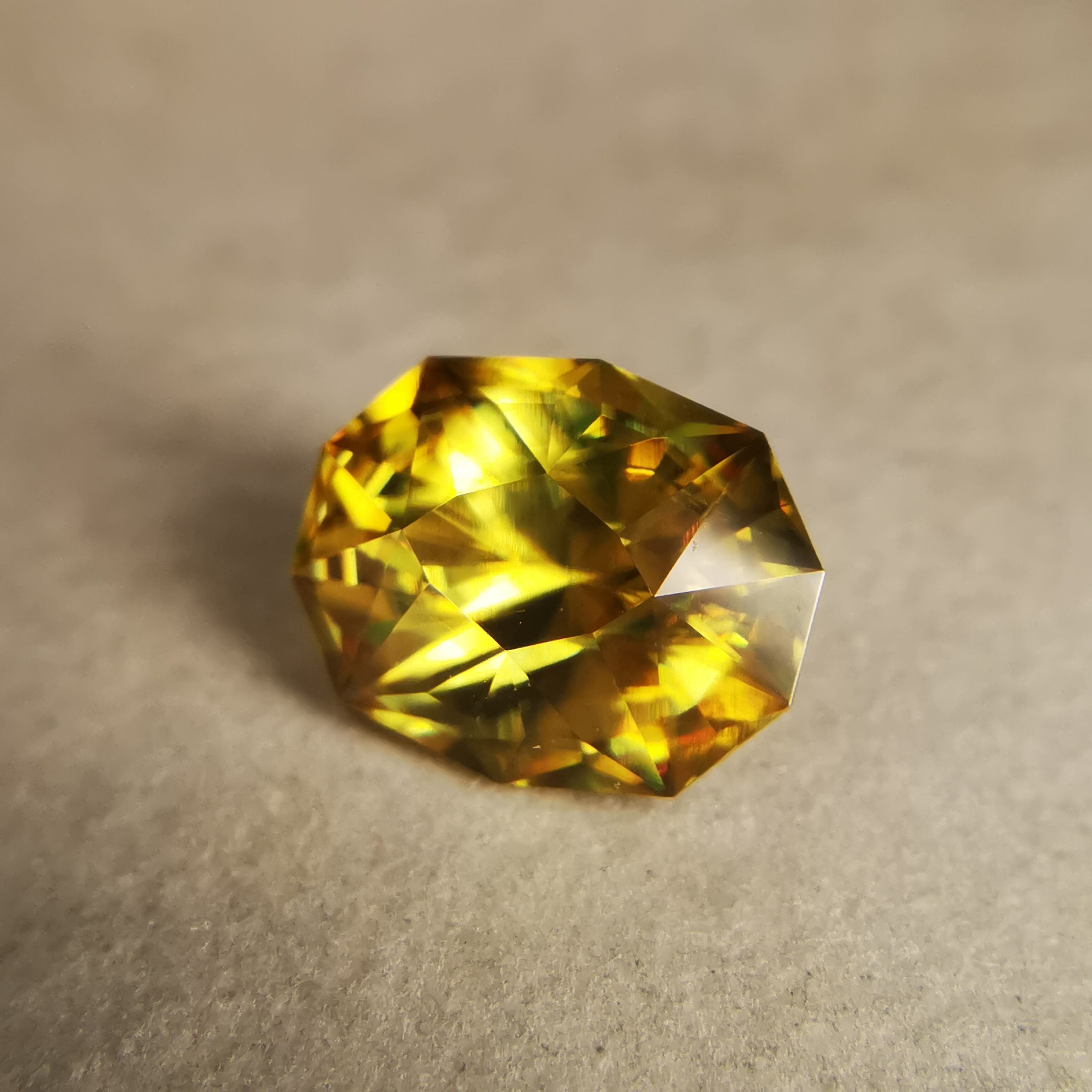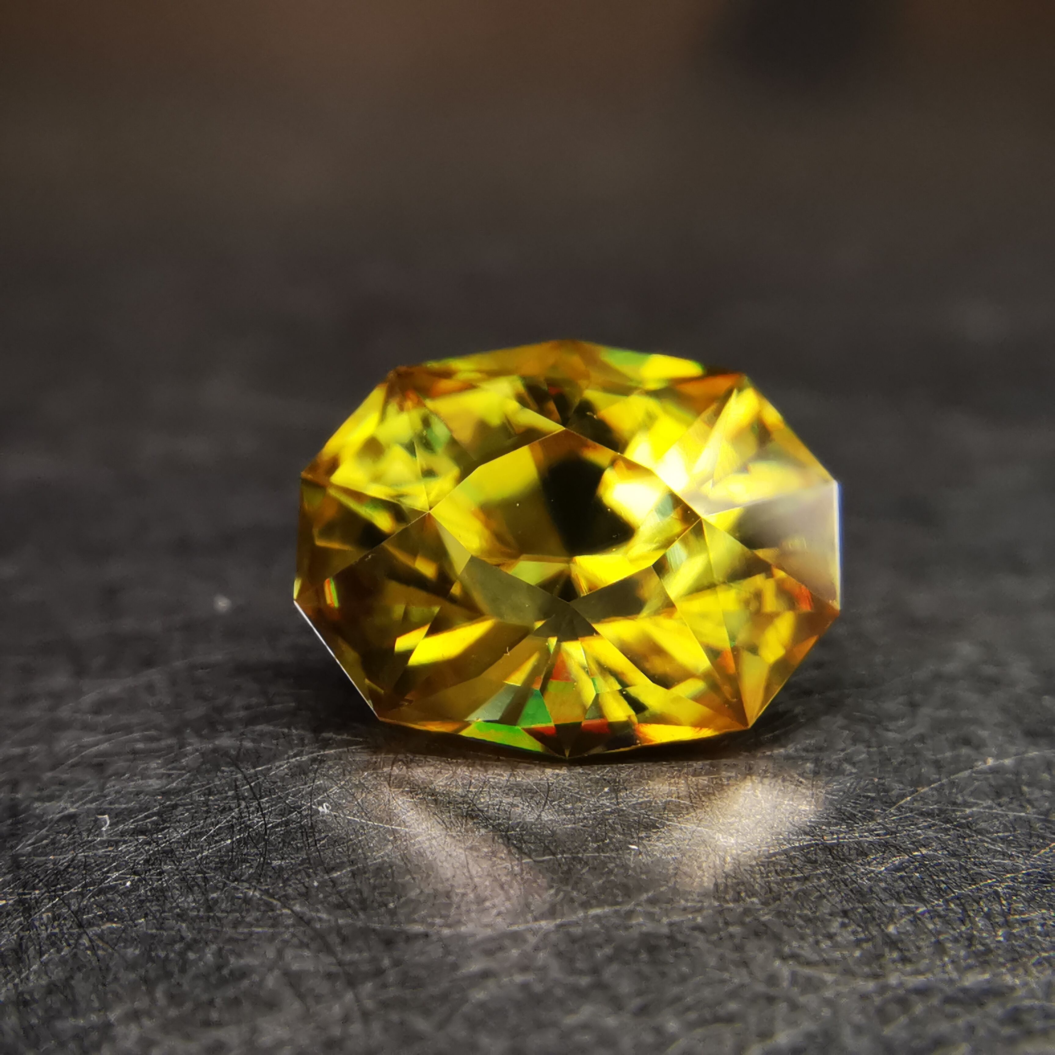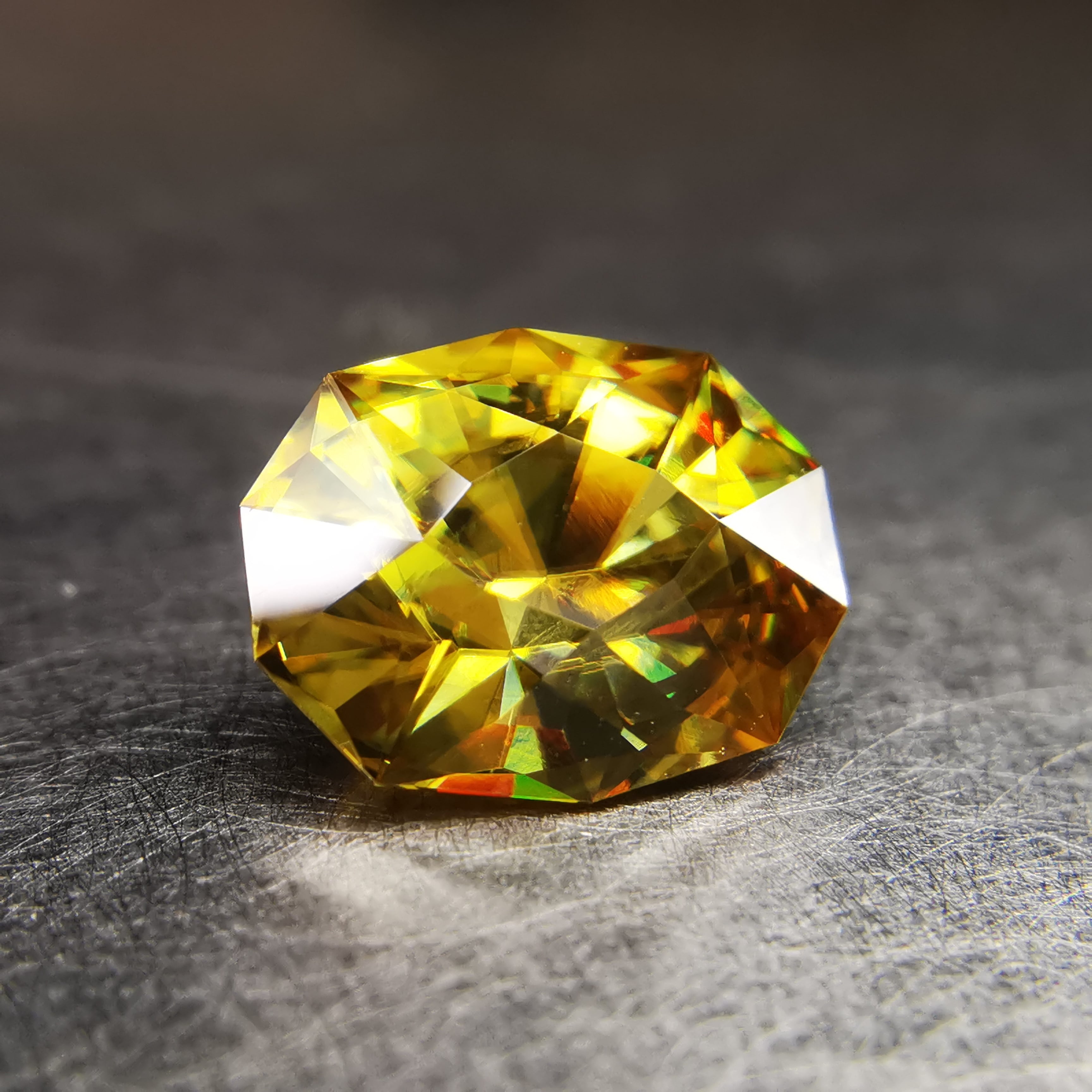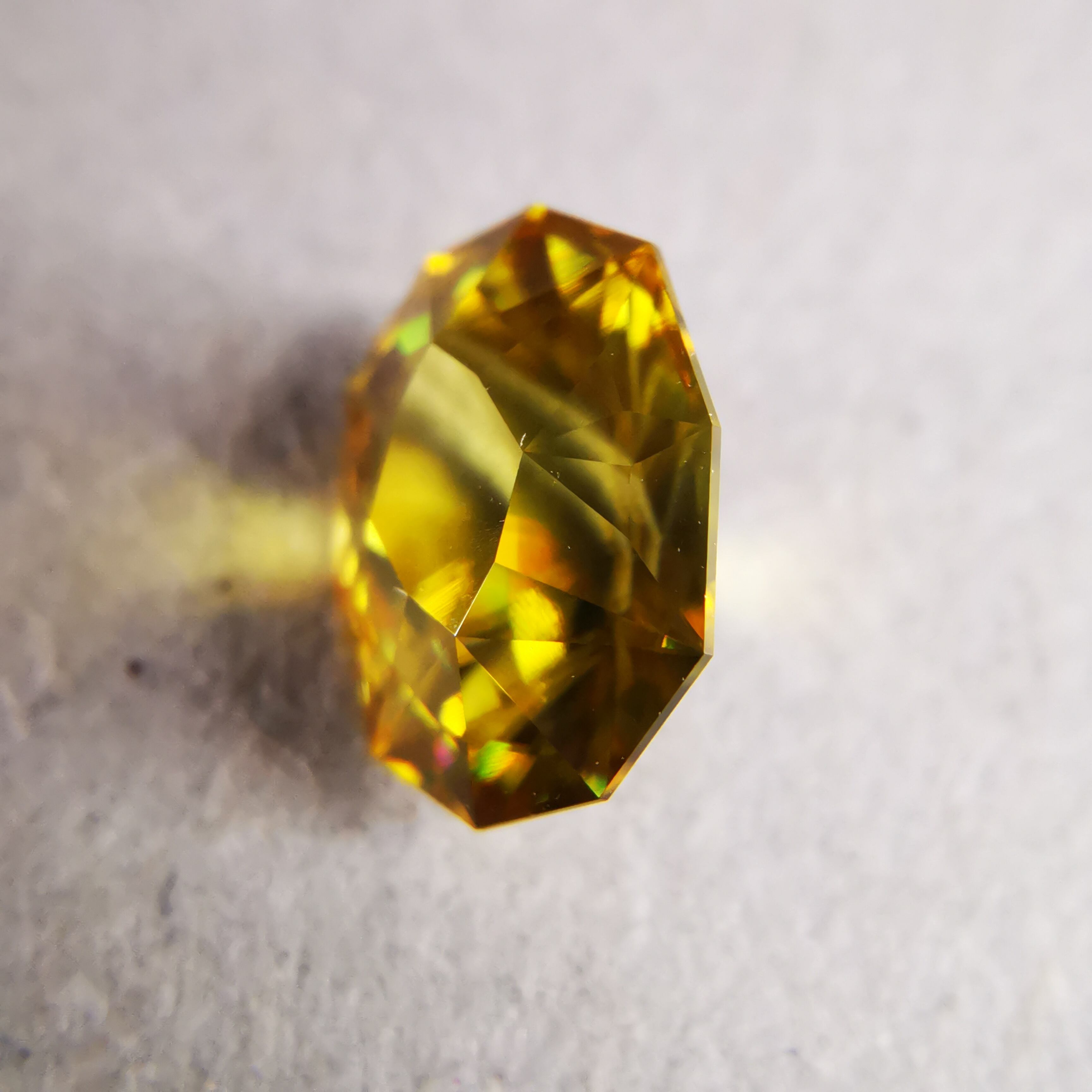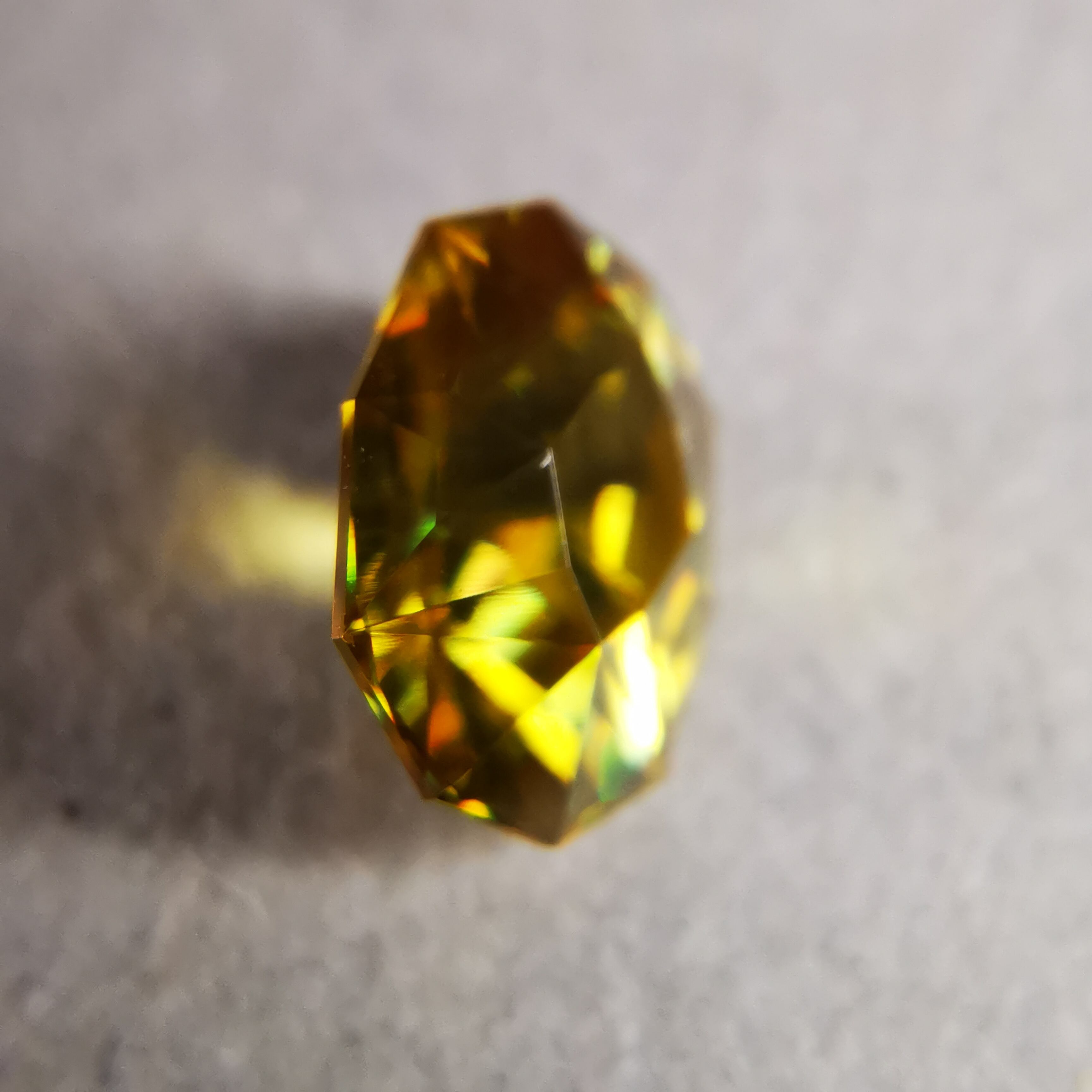 ややシルキーな落ち着いたイエローですが、スフェーンらしいギラギラとした虹色のファイアが、強くきらめきます。