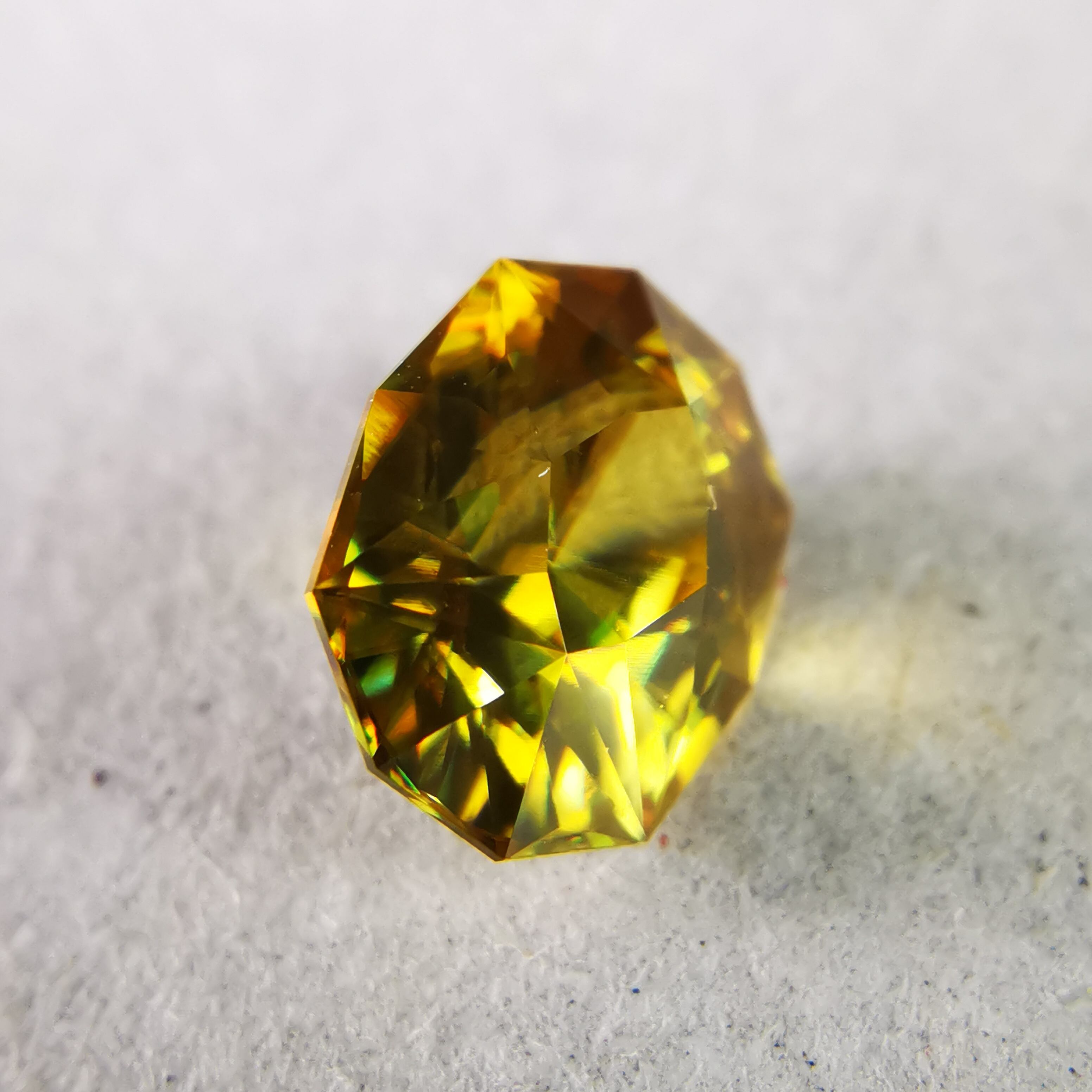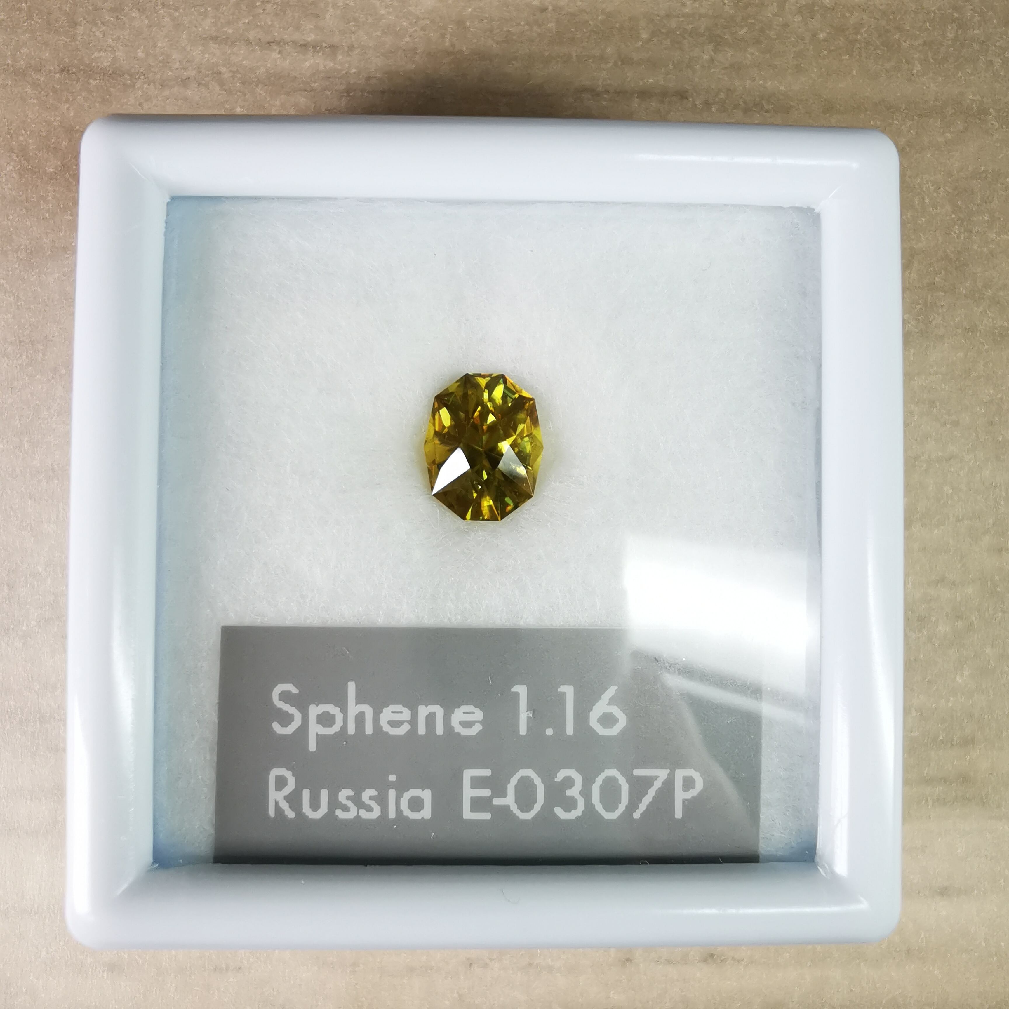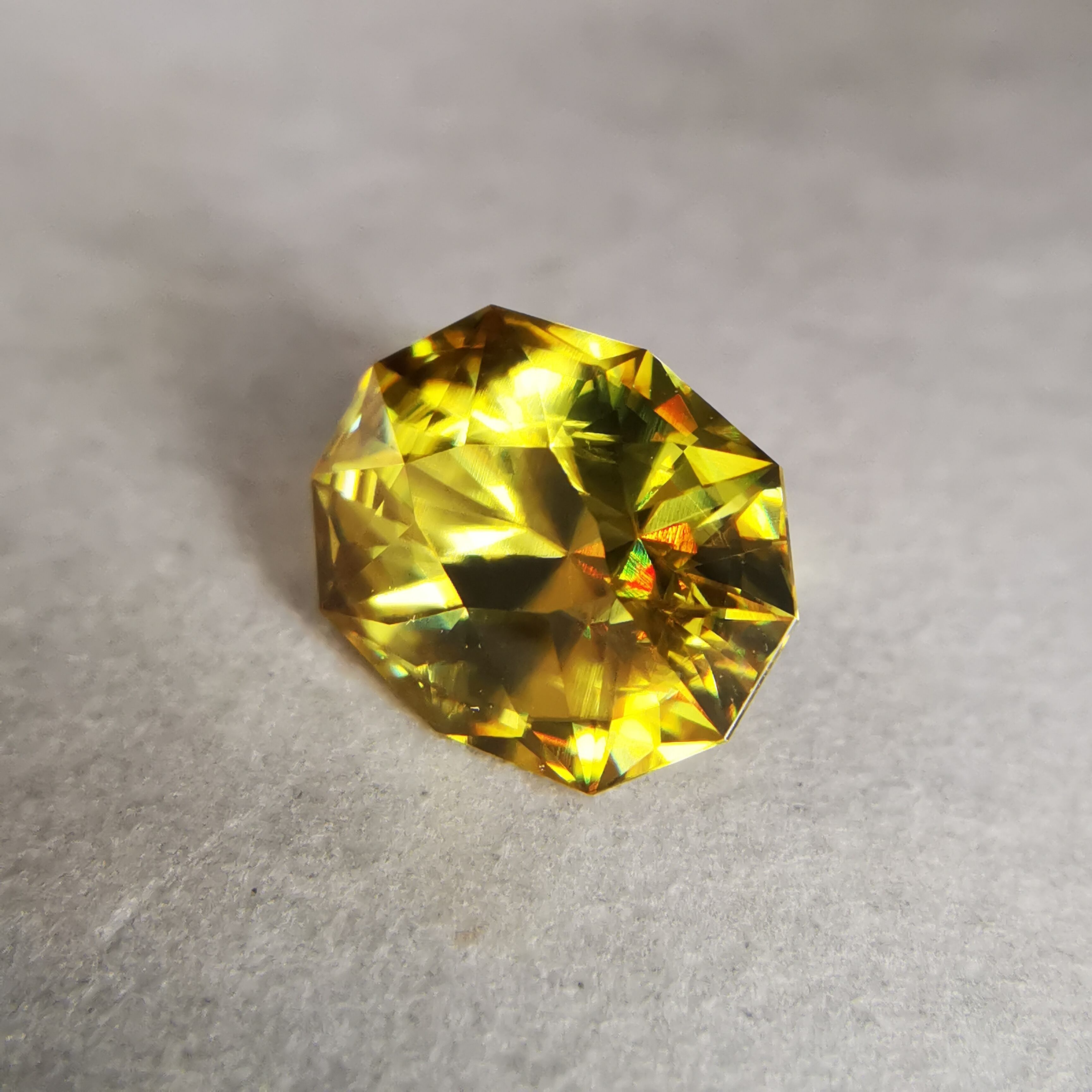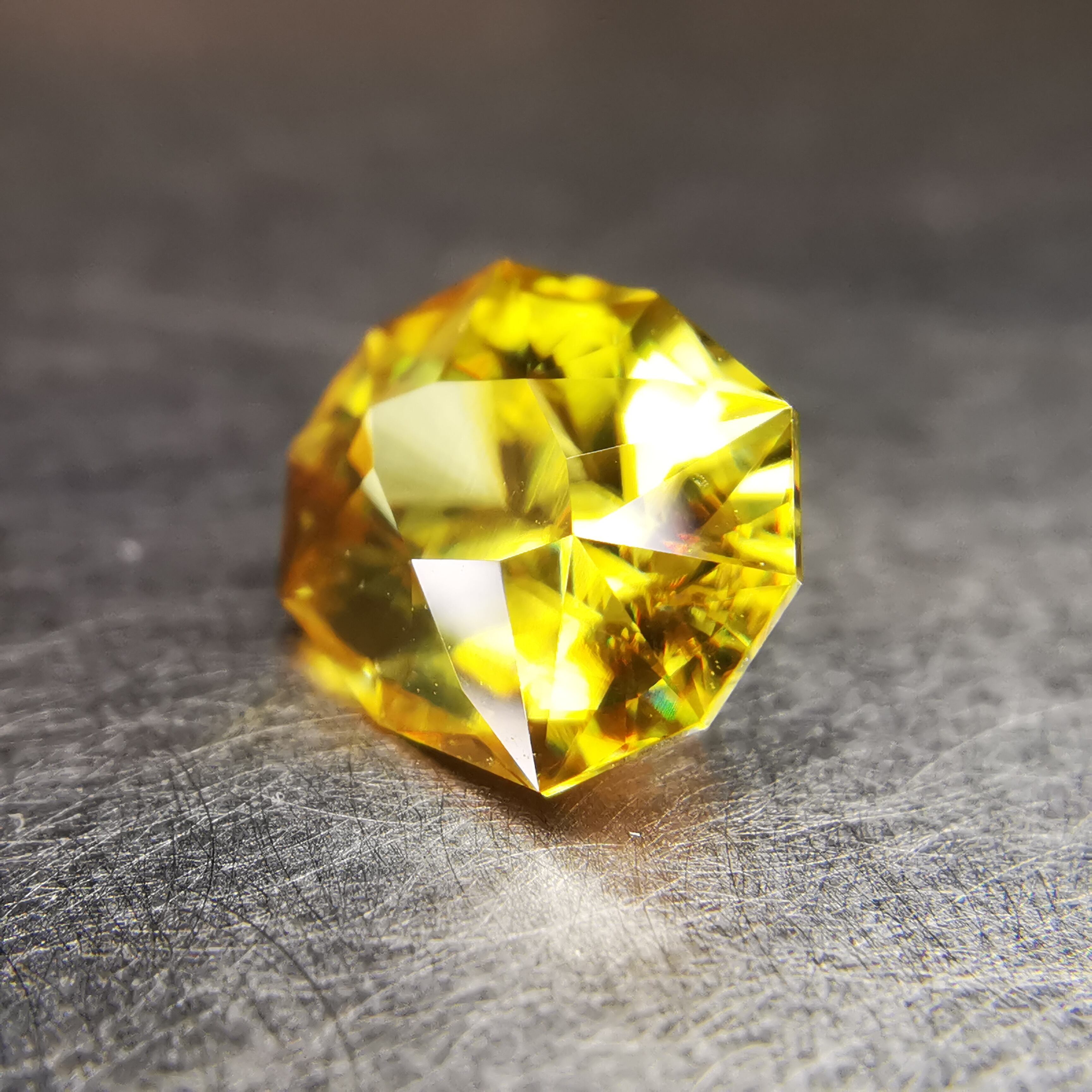 ややシルキーな落ち着いたイエローですが、スフェーンらしいギラギラとした虹色のファイアが、強くきらめきます。
