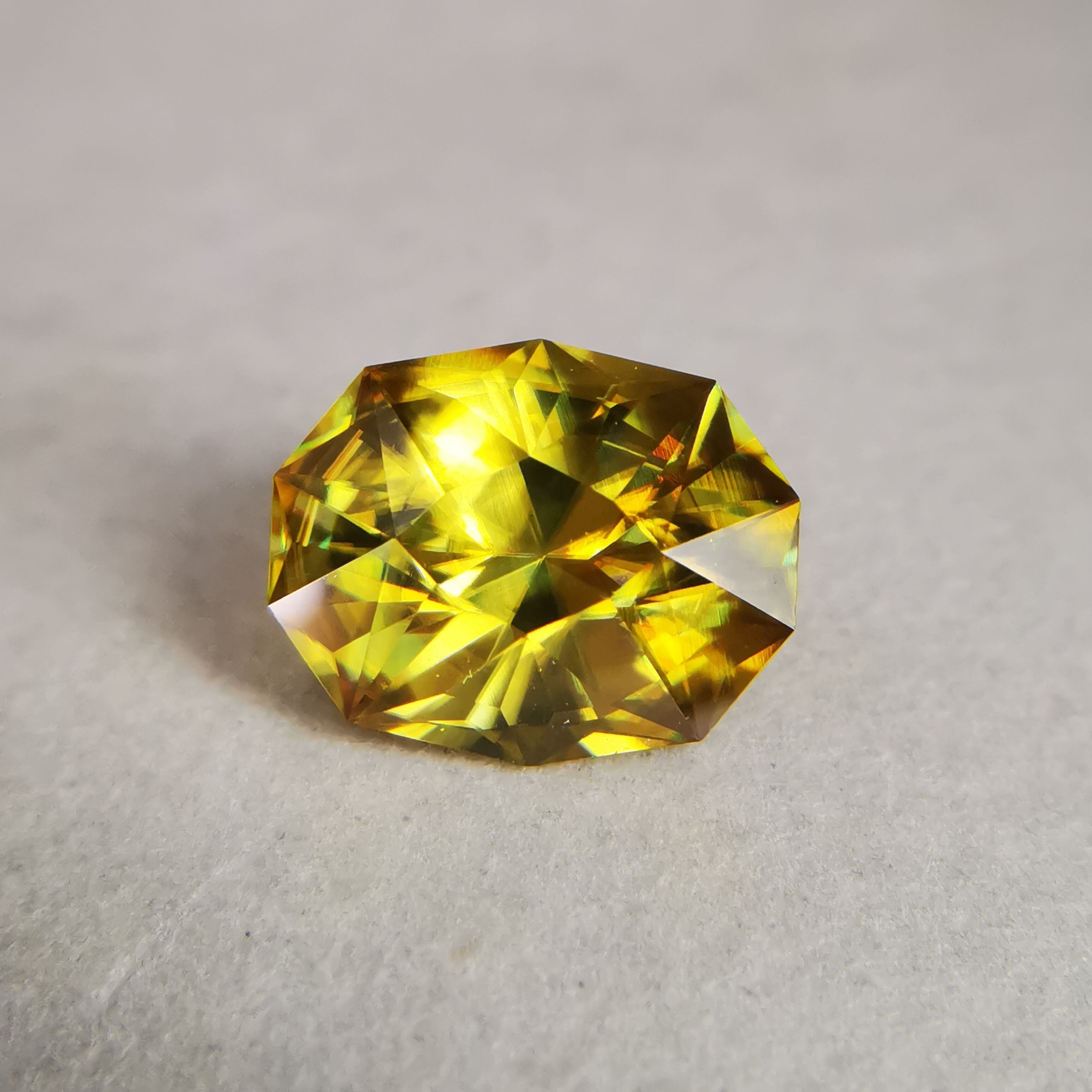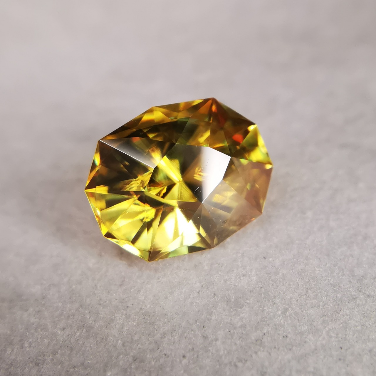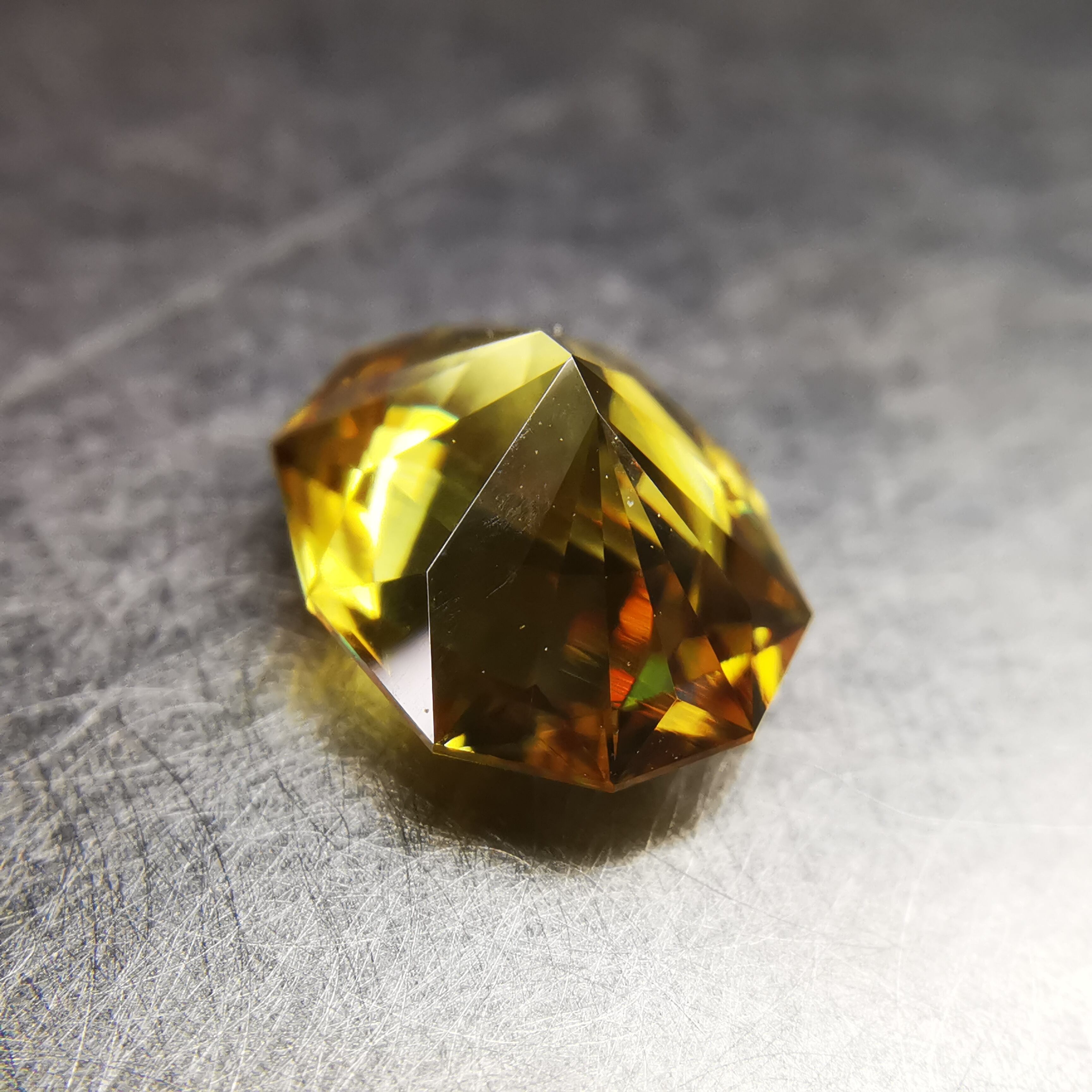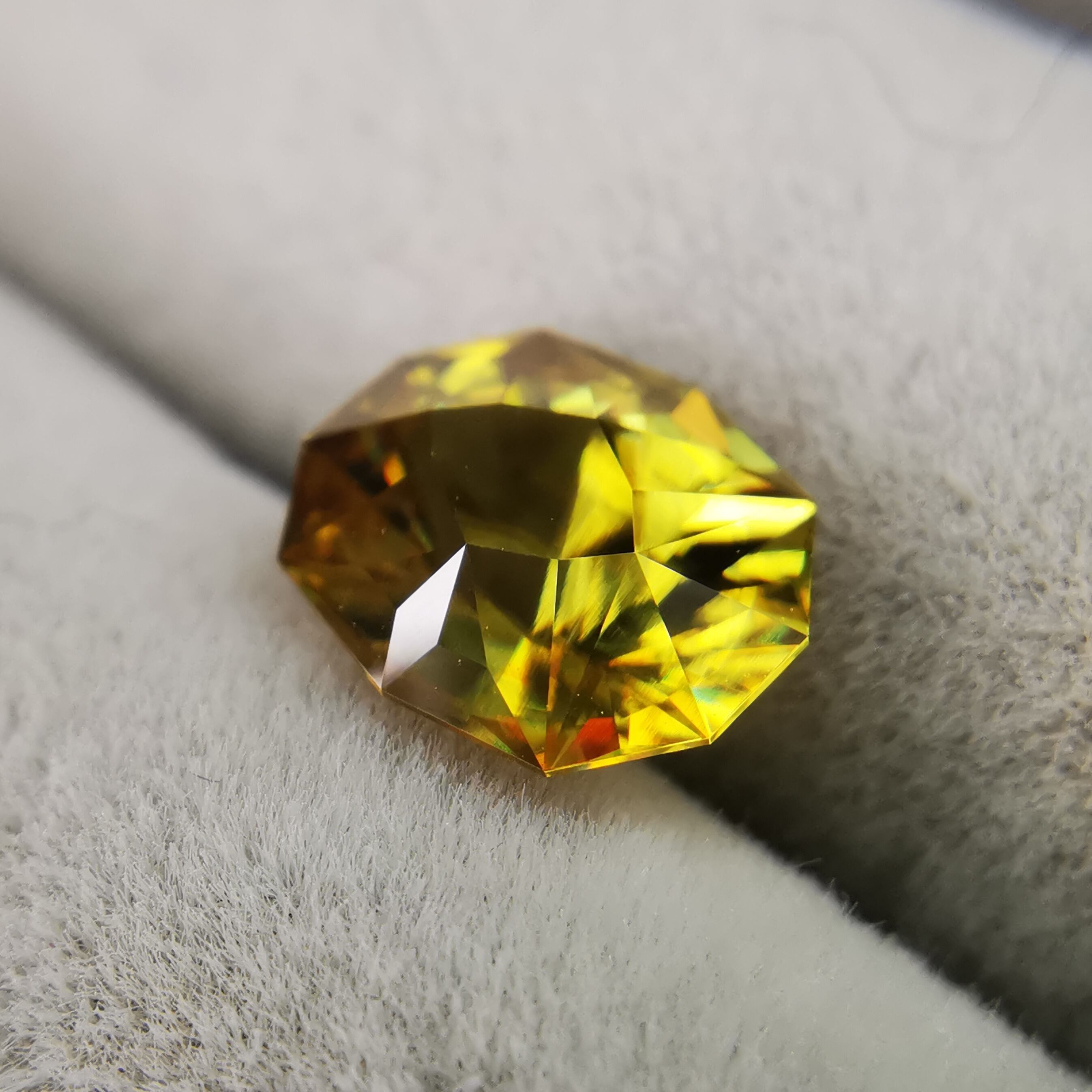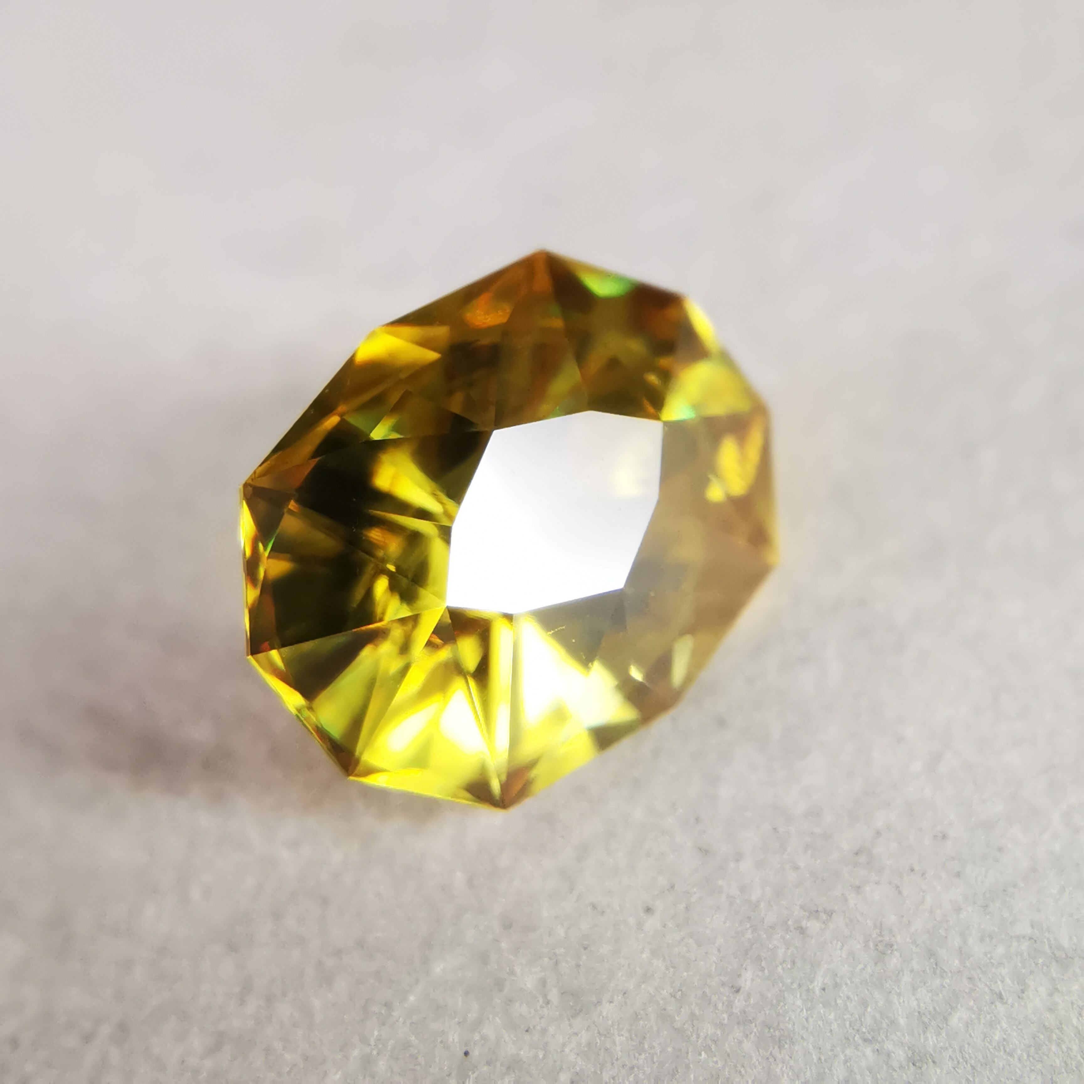 ややシルキーな落ち着いたイエローですが、スフェーンらしいギラギラとした虹色のファイアが、強くきらめきます。