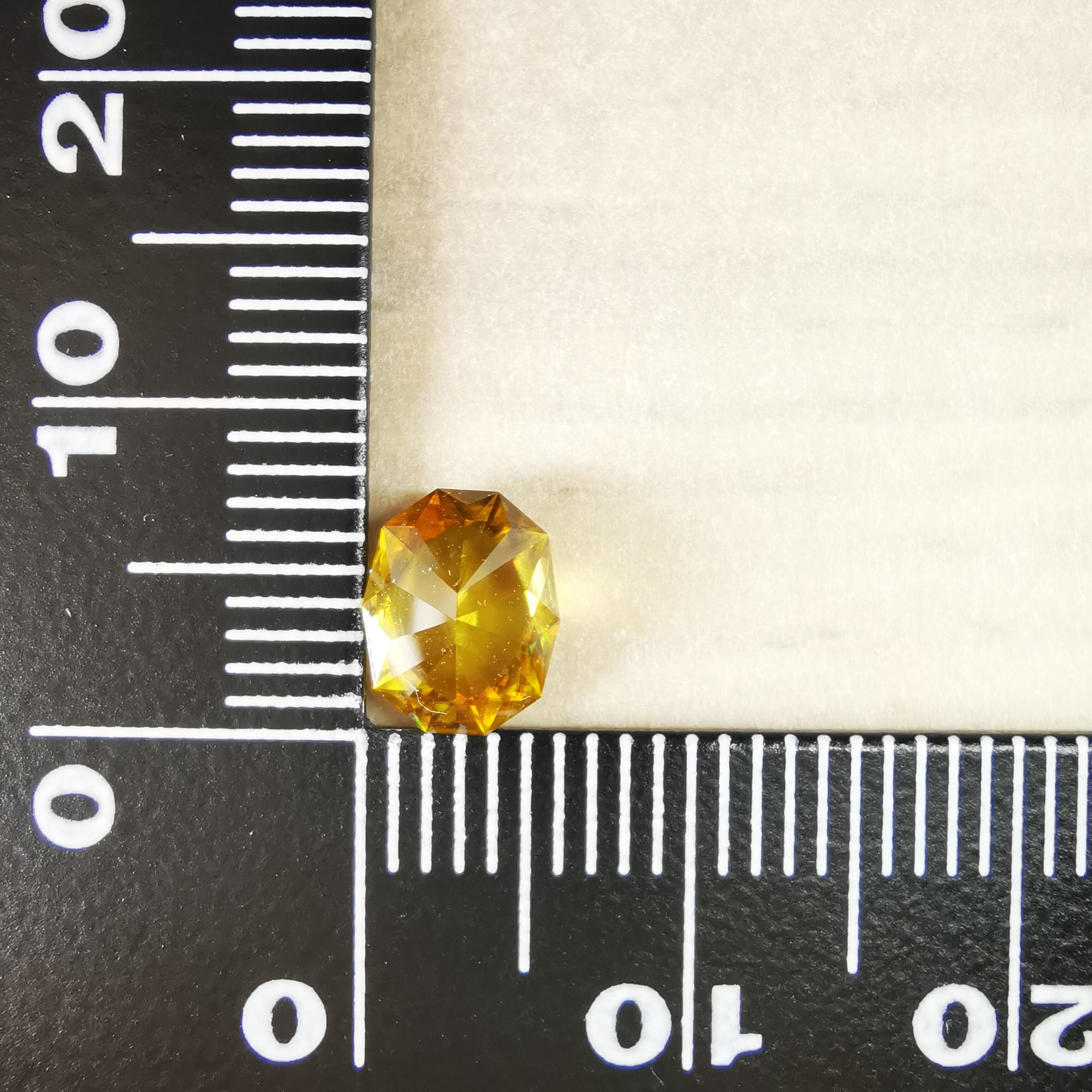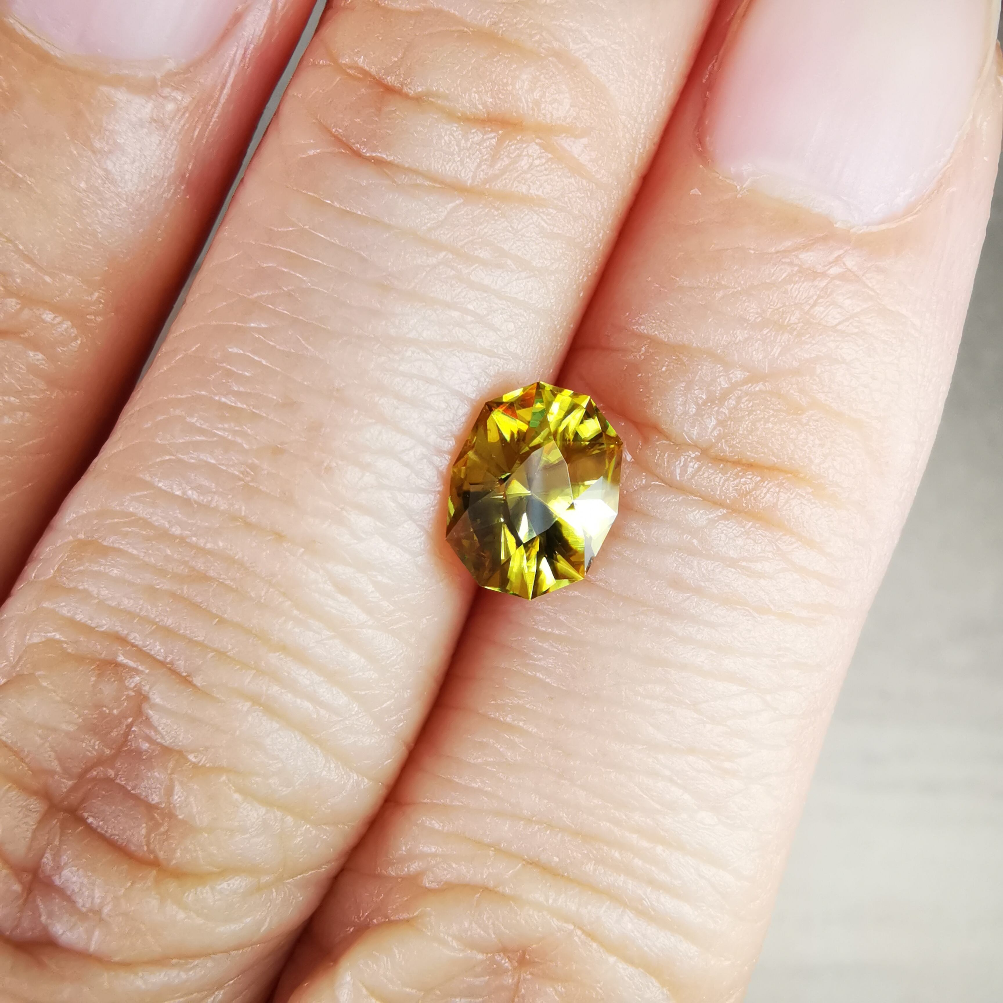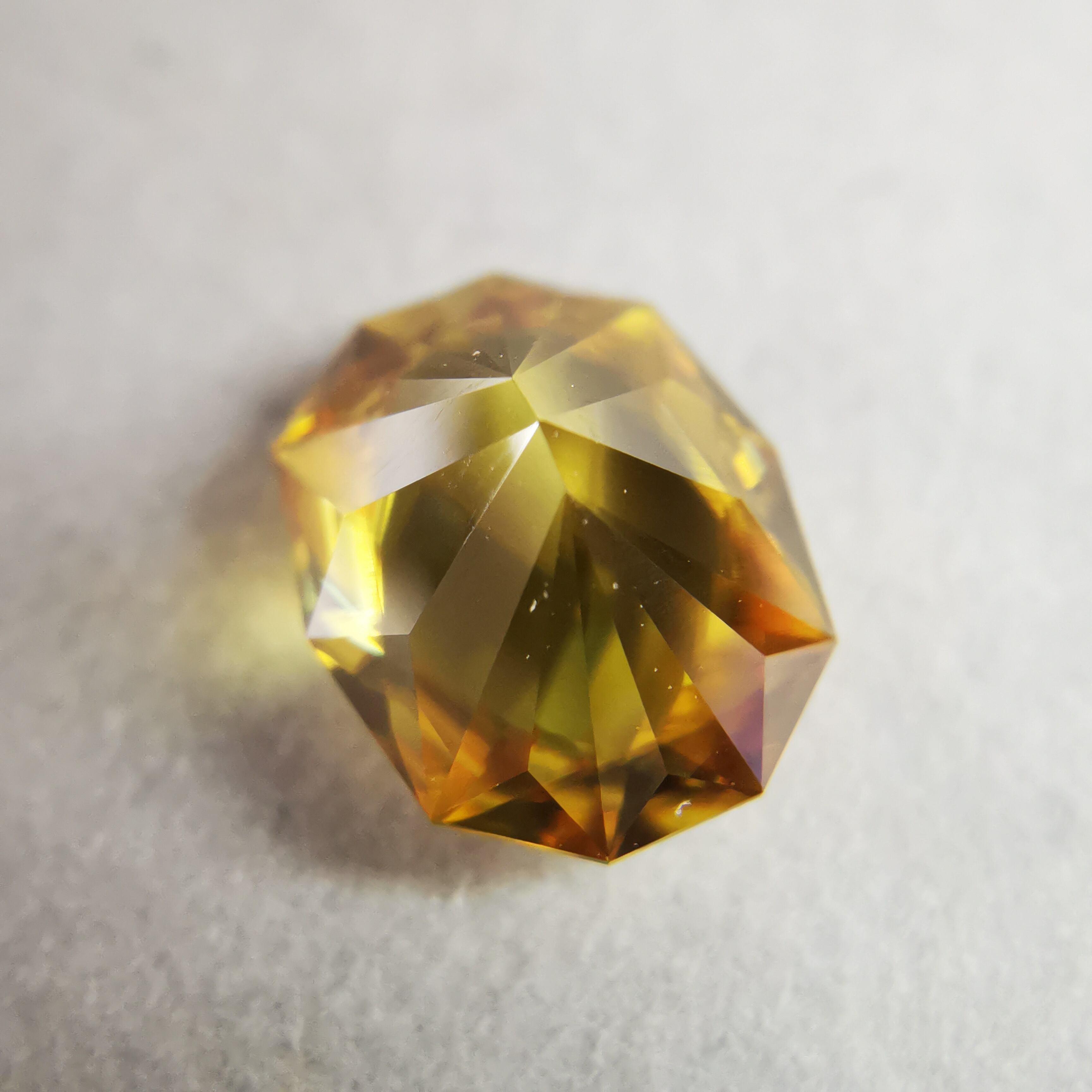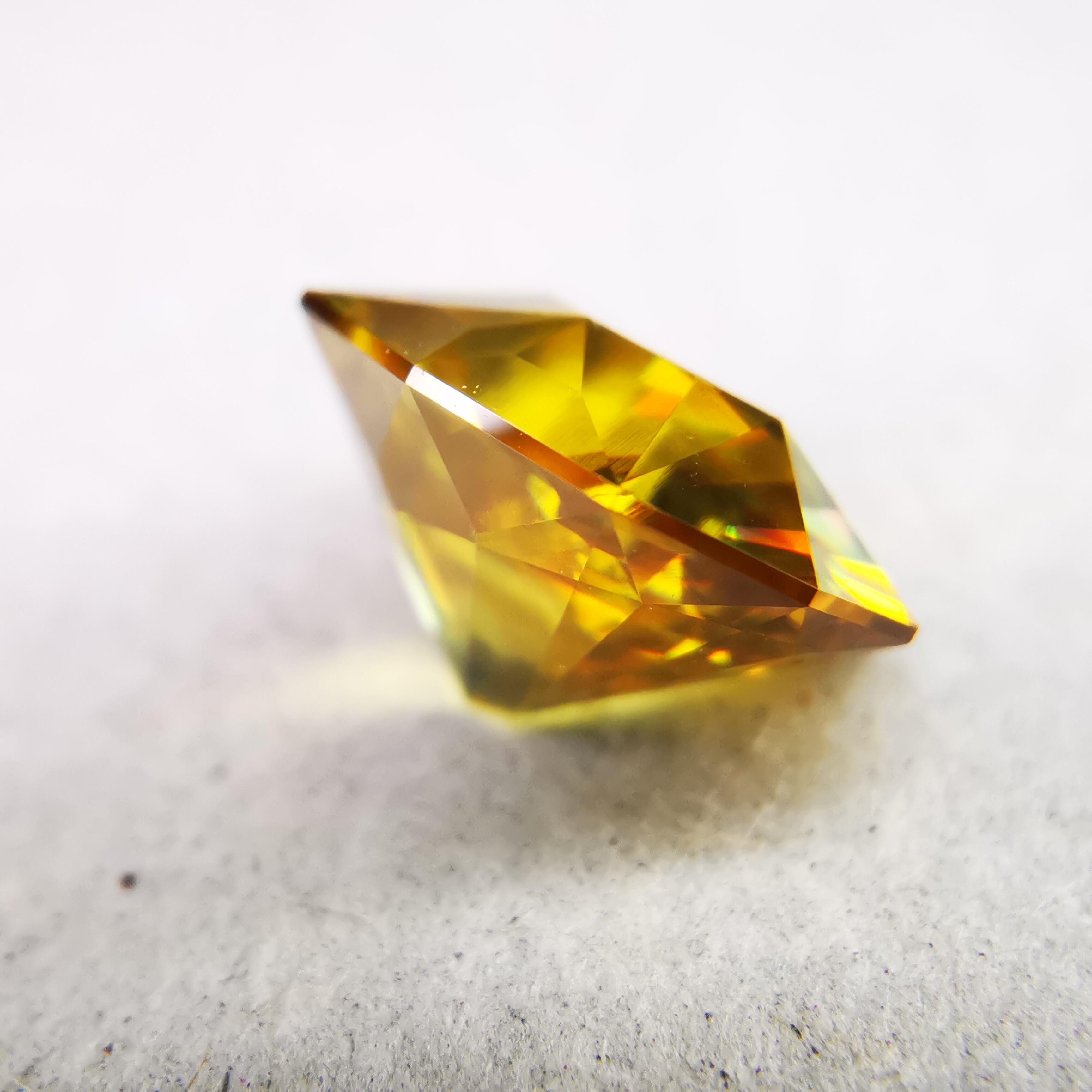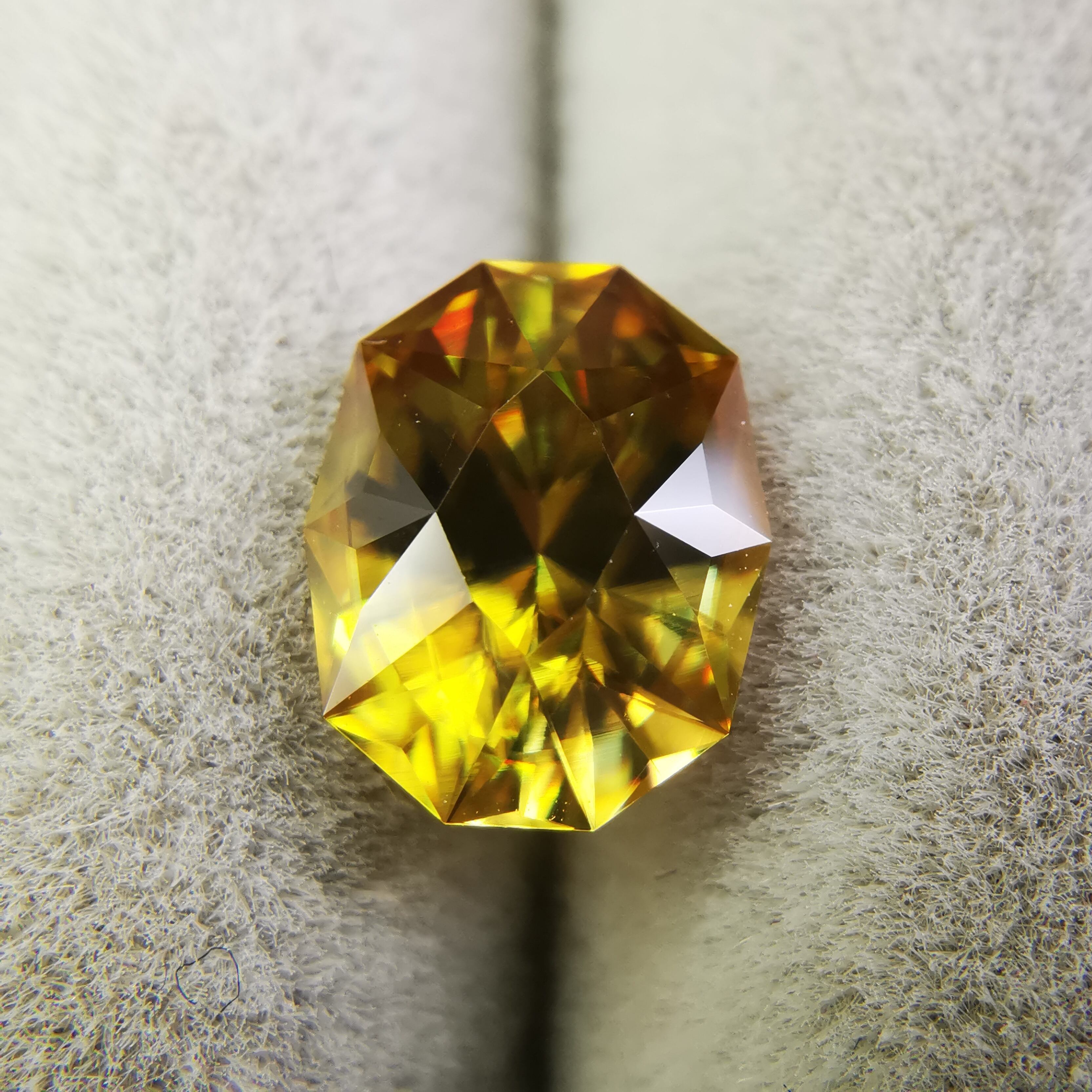 ややシルキーな落ち着いたイエローですが、スフェーンらしいギラギラとした虹色のファイアが、強くきらめきます。