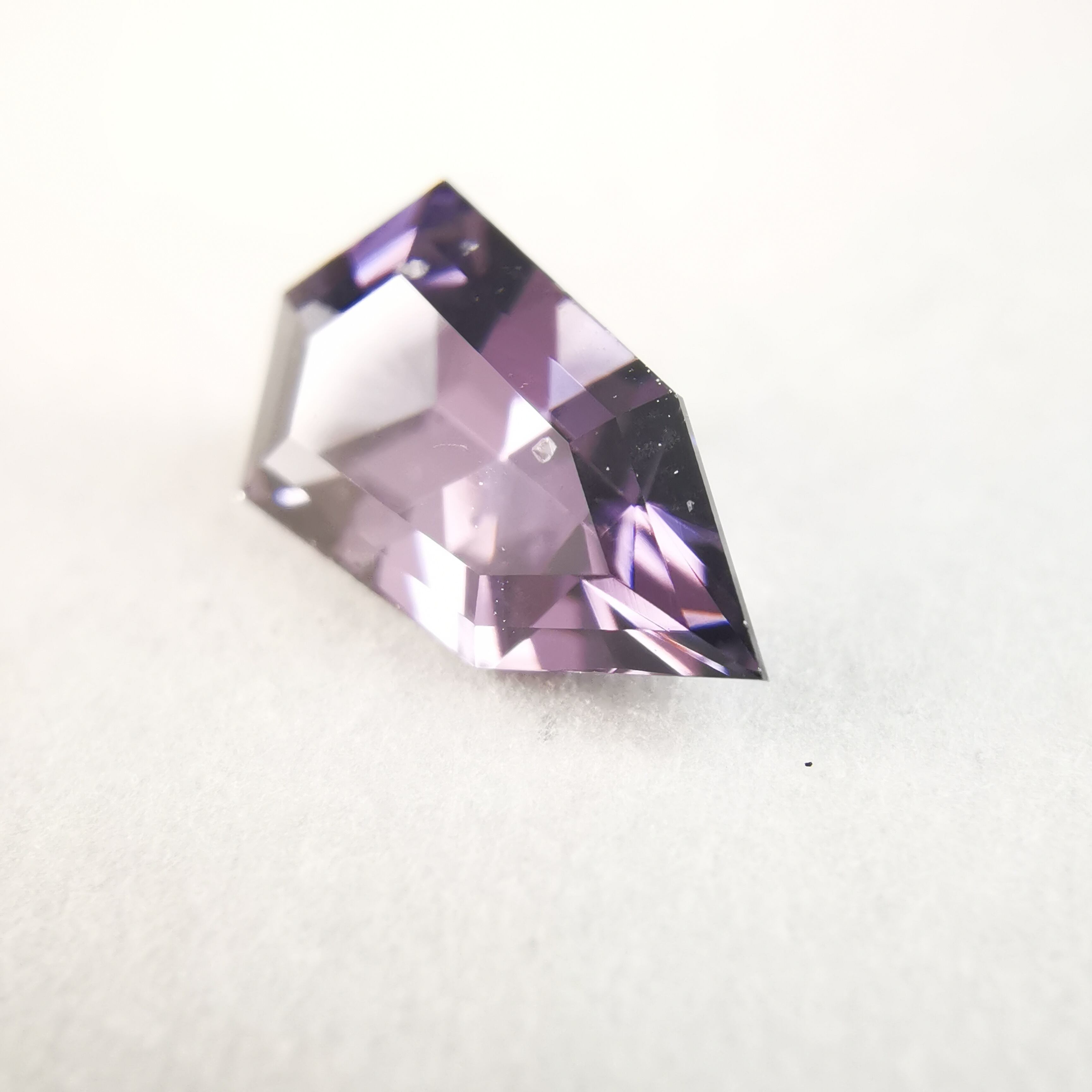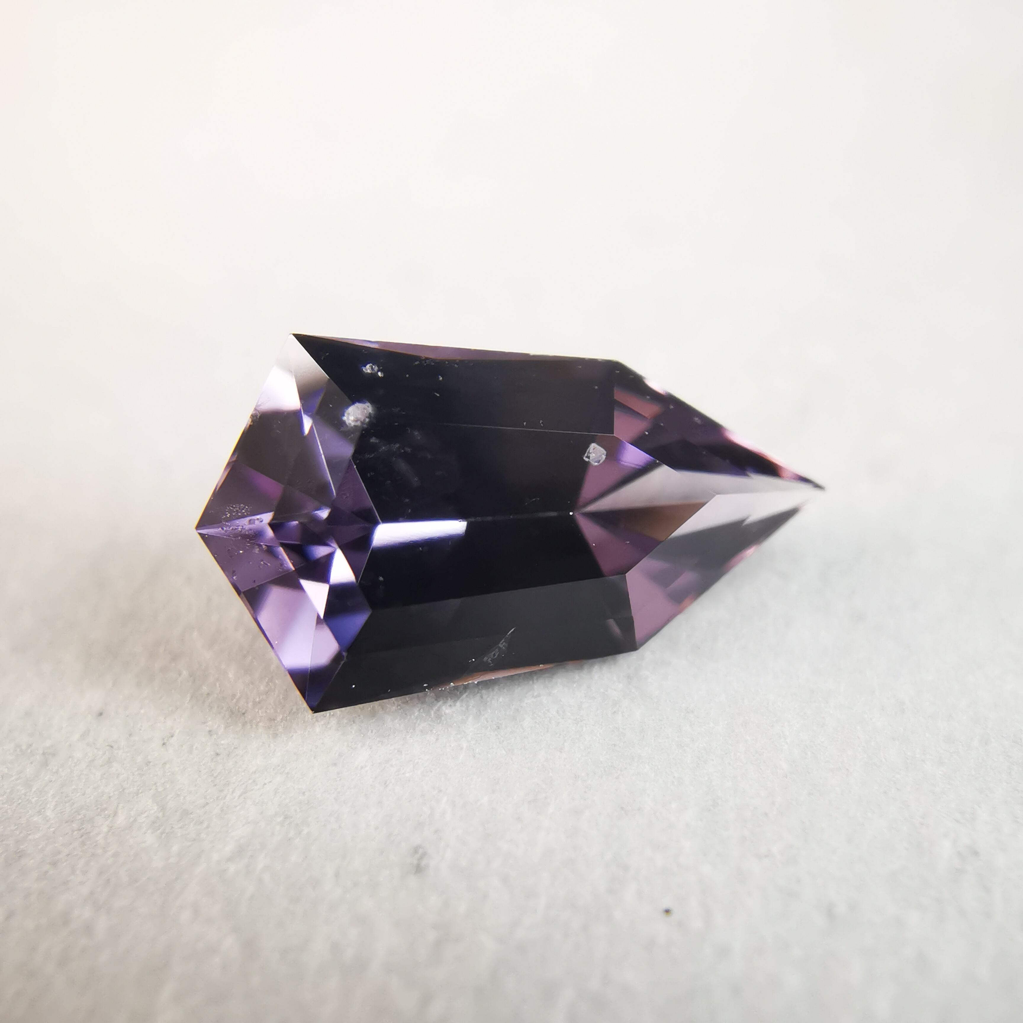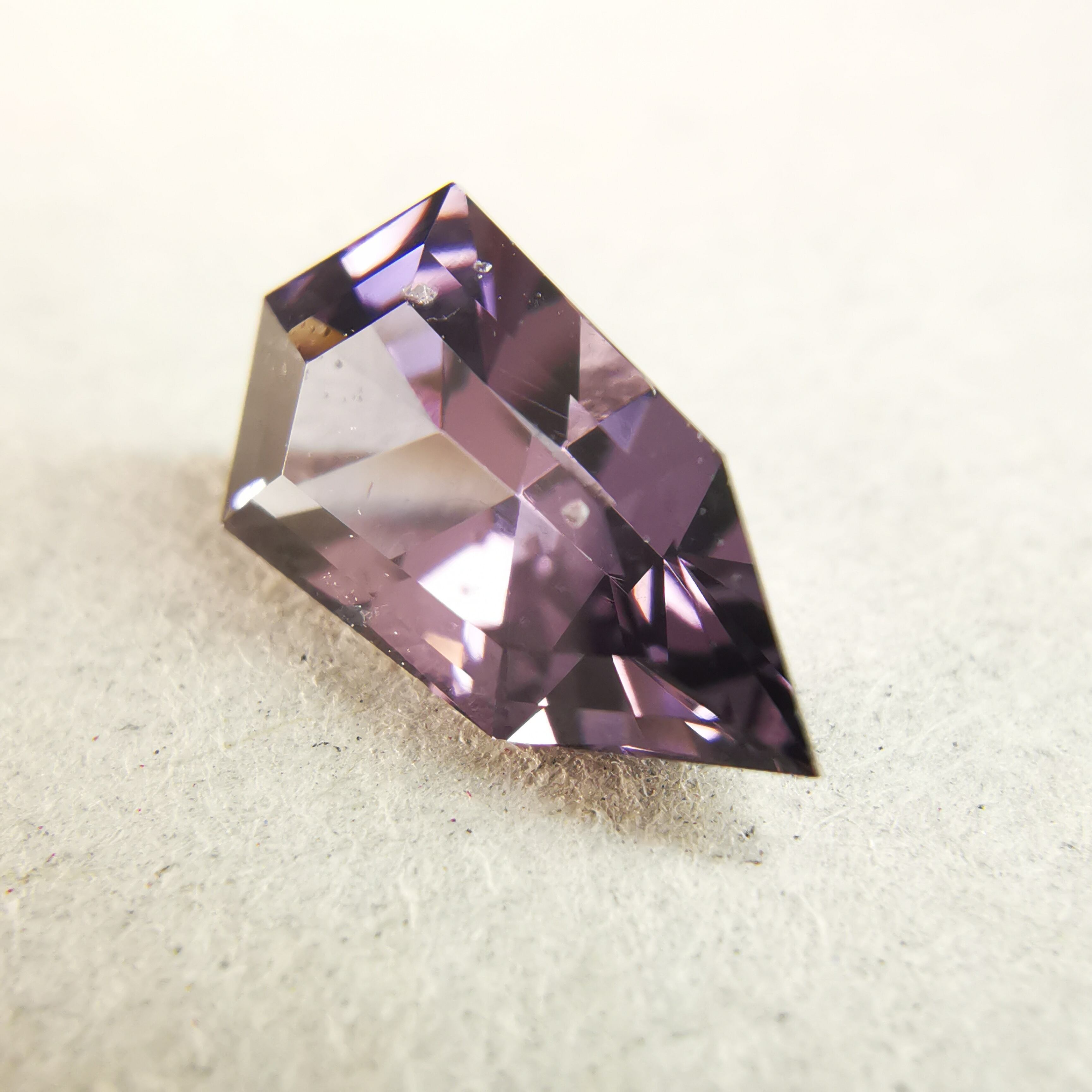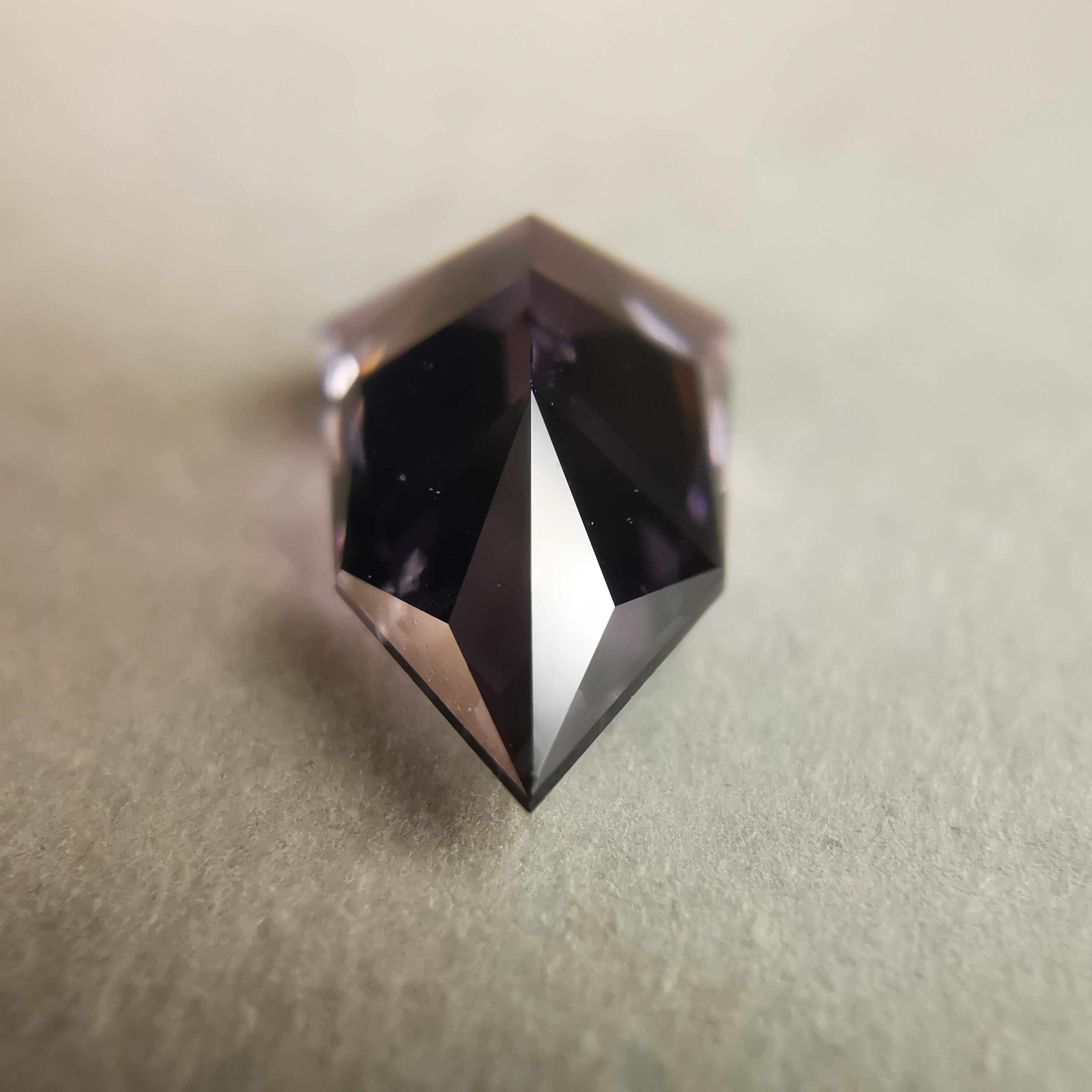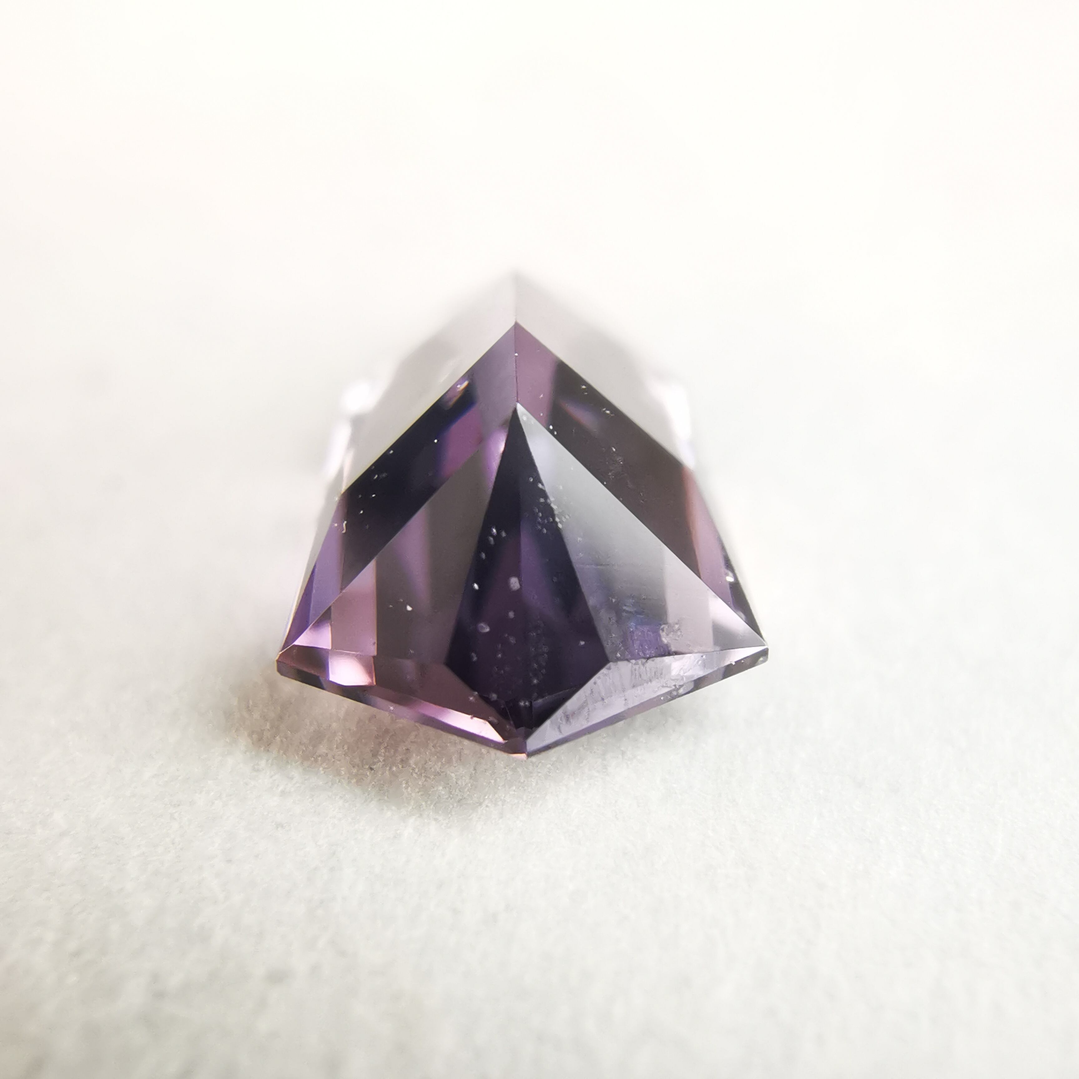 スピネルらしい、落ち着いたモーブカラー、P氏が得意とする鋭い盾のようなカットが、バランスの良い一石です。