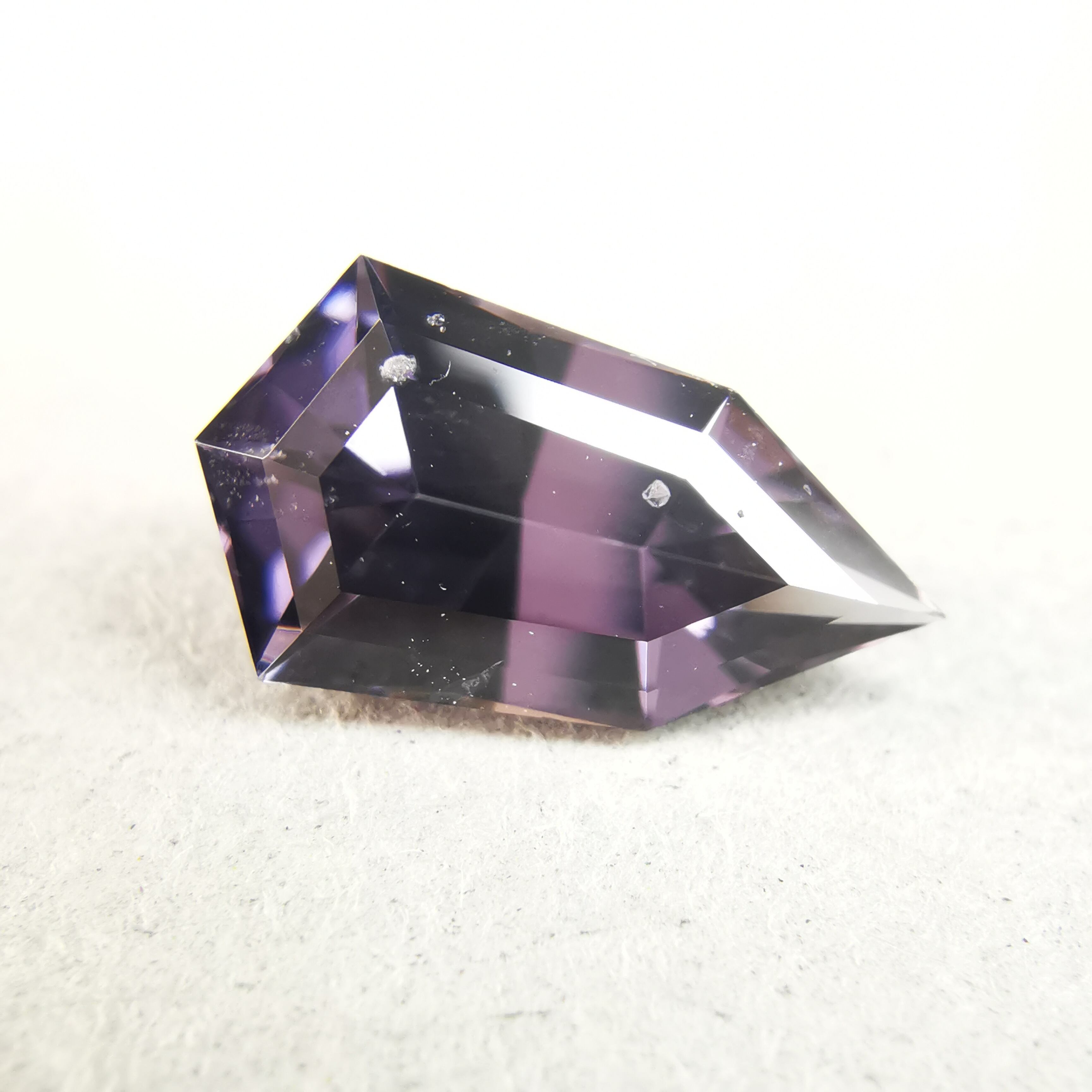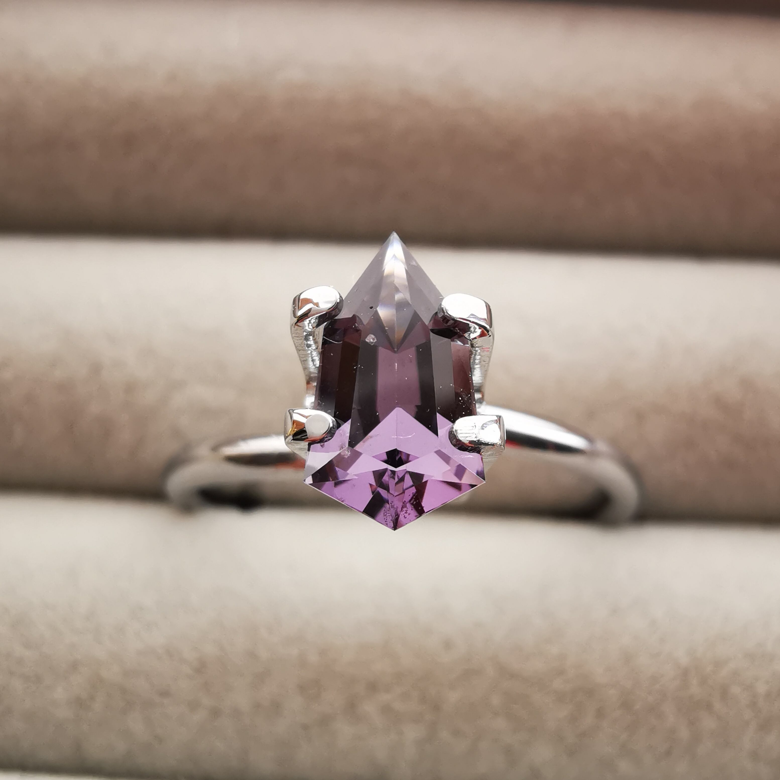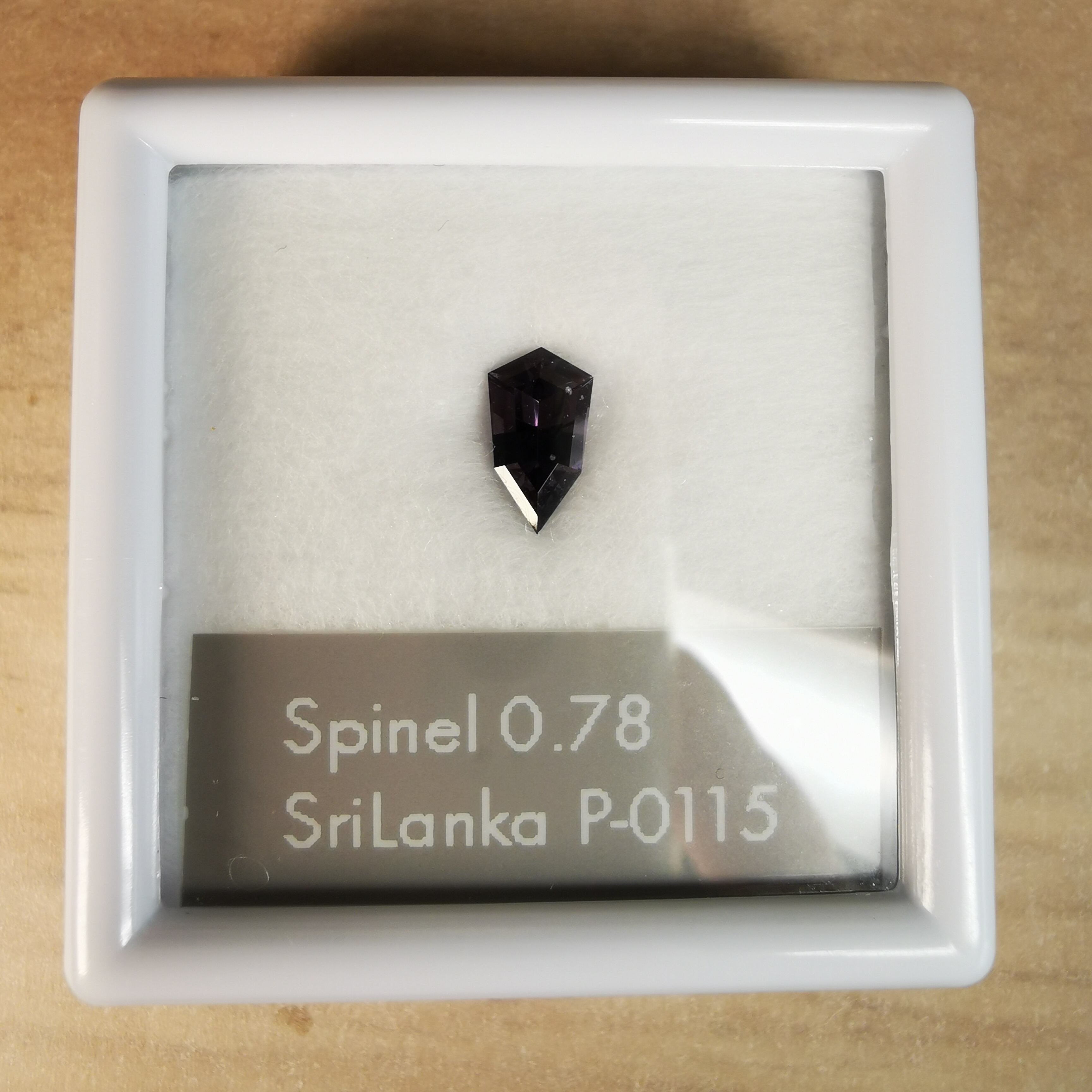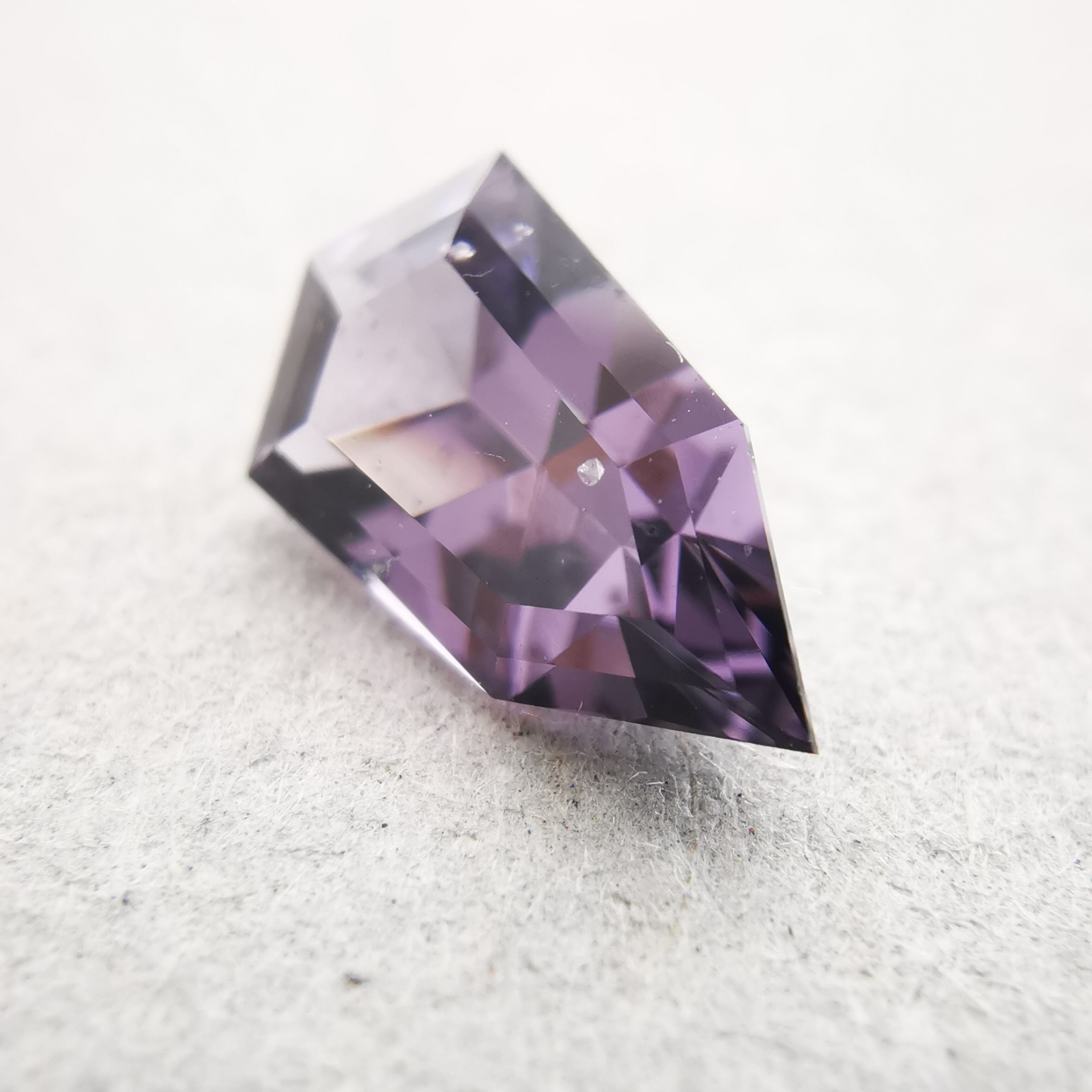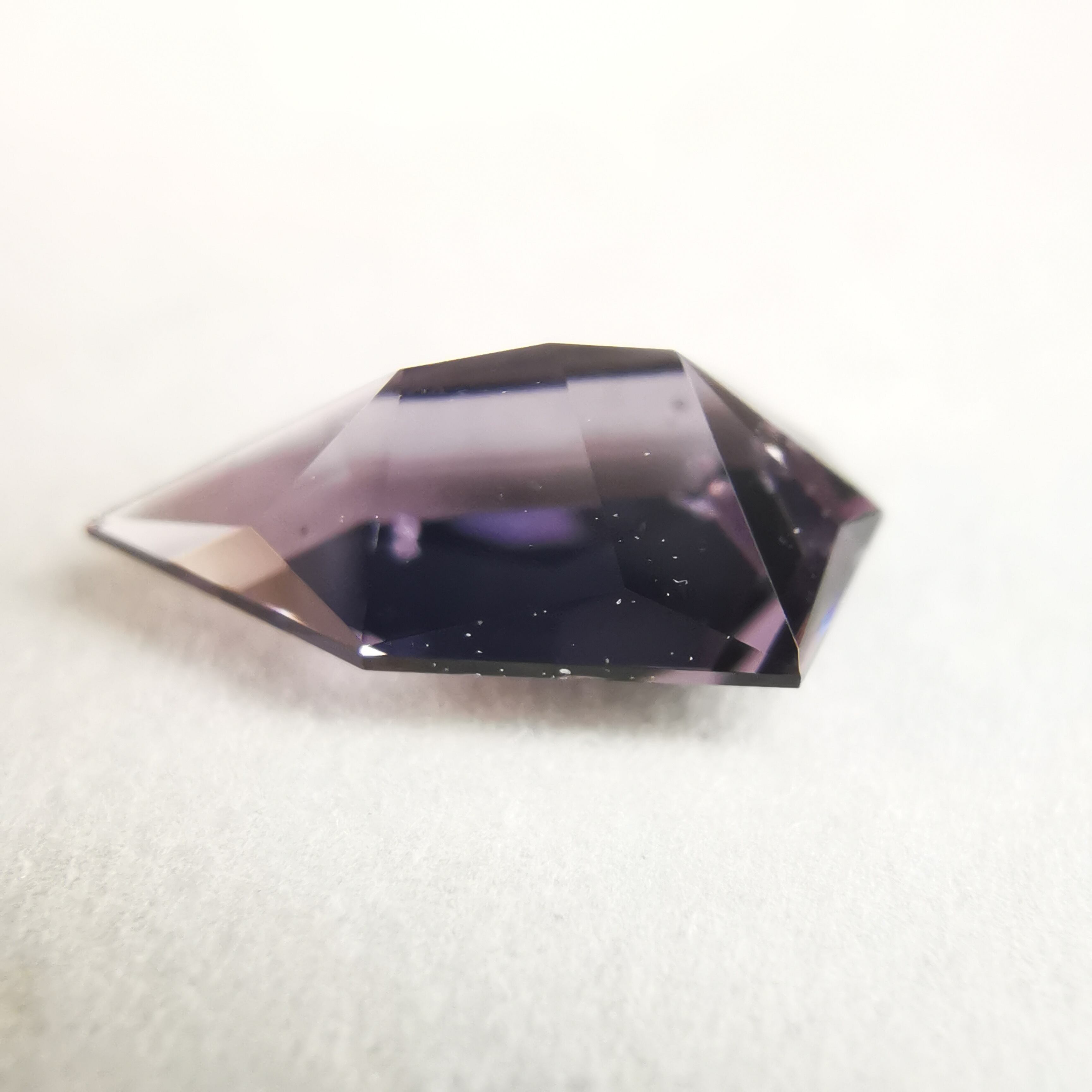 スピネルらしい、落ち着いたモーブカラー、P氏が得意とする鋭い盾のようなカットが、バランスの良い一石です。