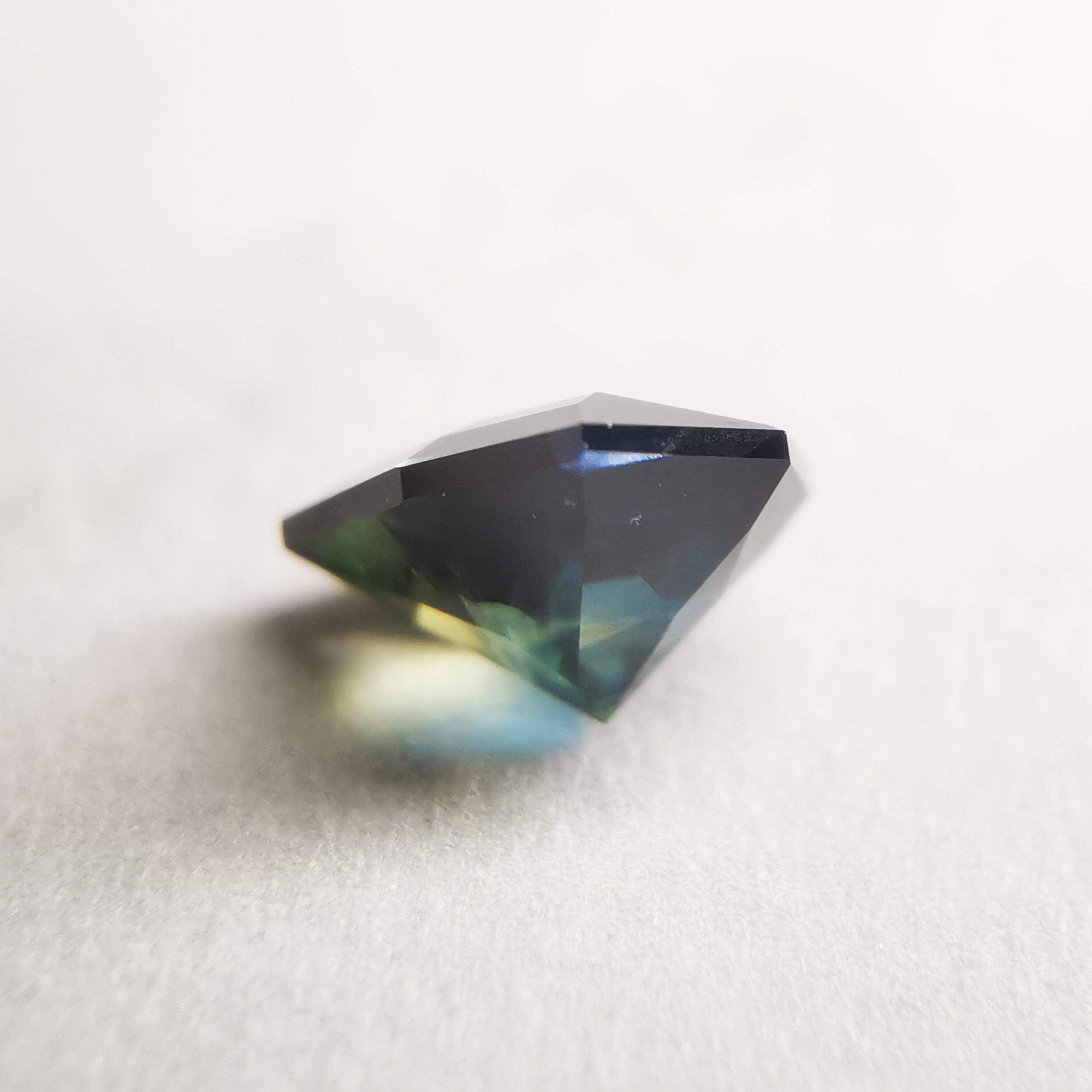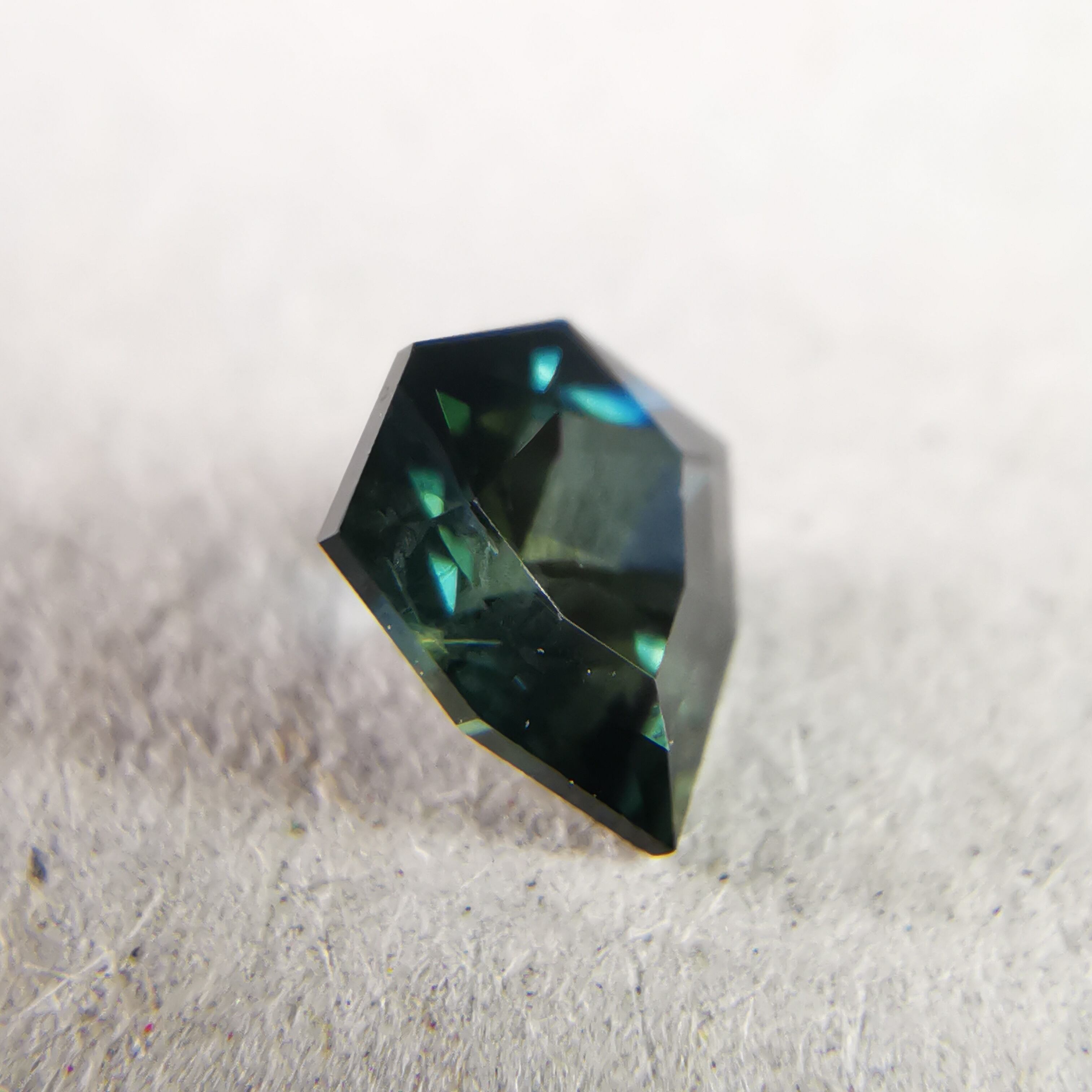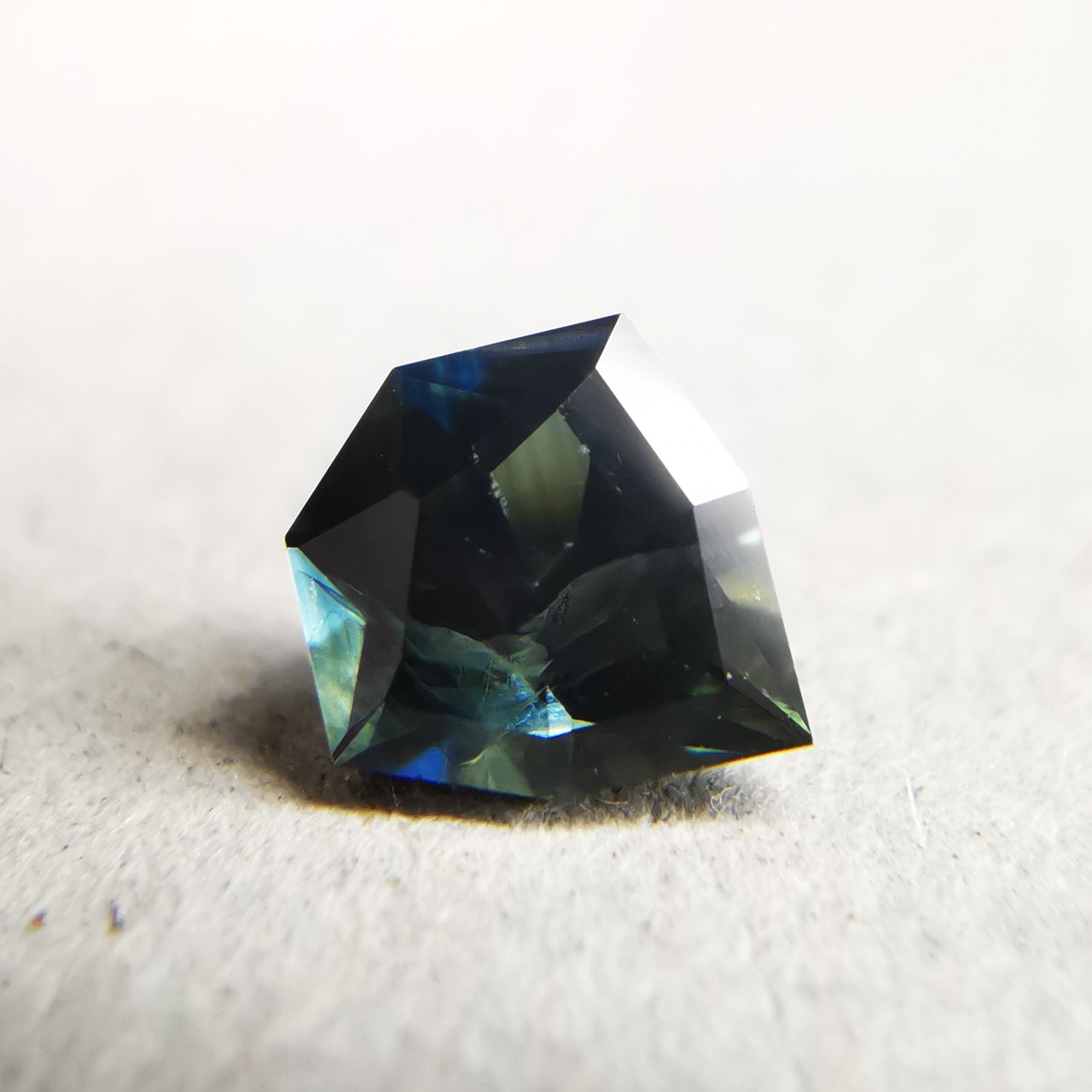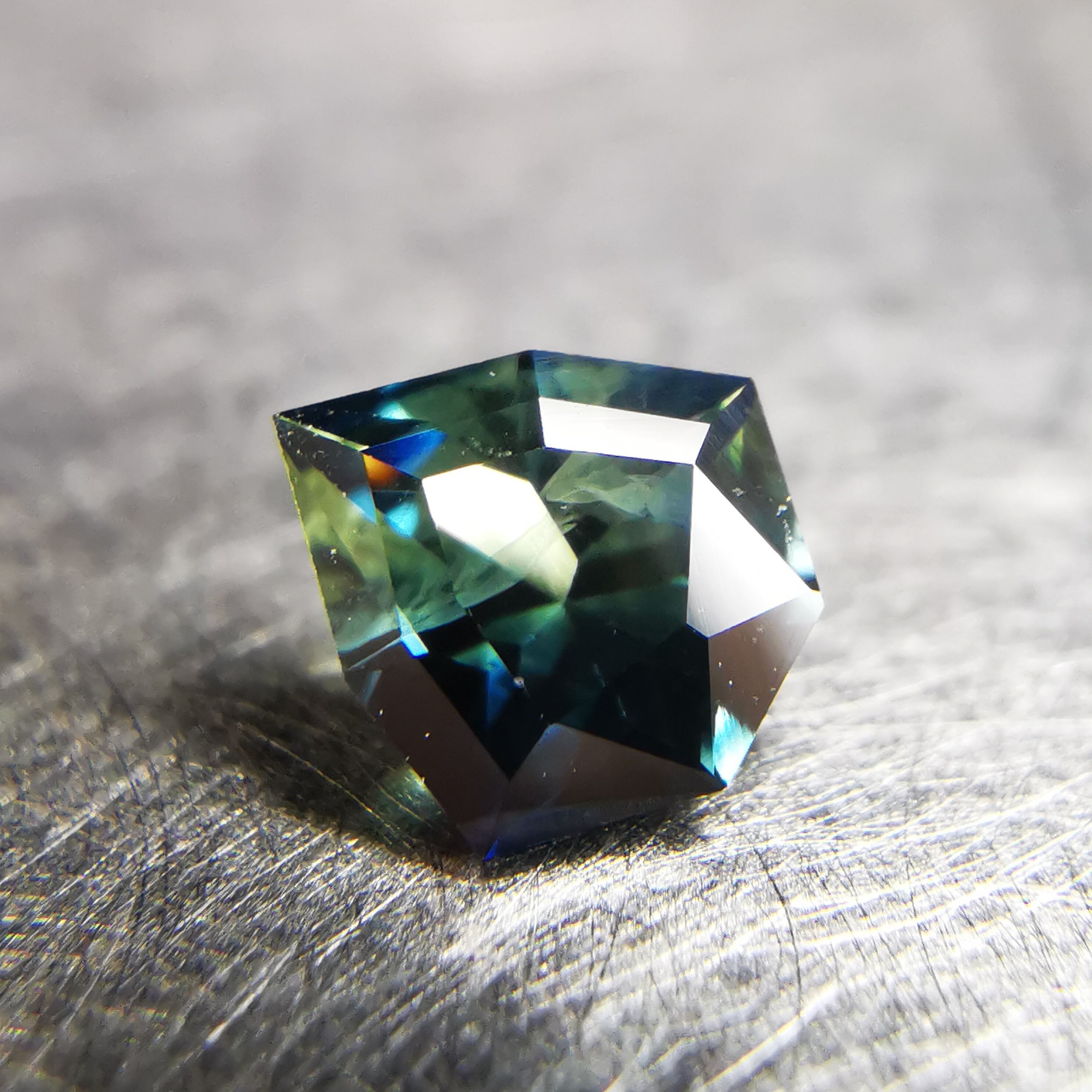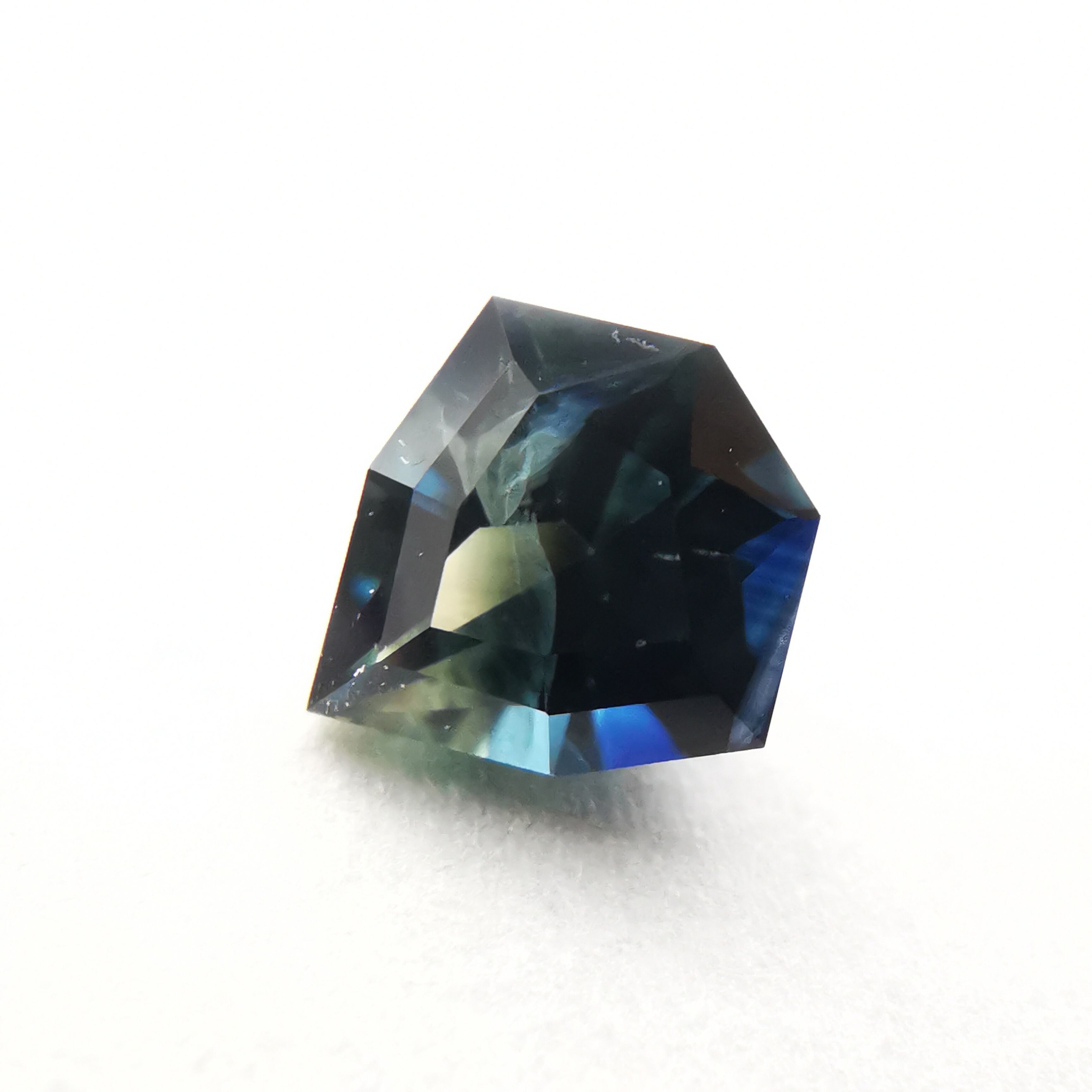 やや暗いティールカラーのサファイアですが、傾けると先端の方はクリアなイエロー、角度を変えるとブルーやグリーンがきらめきます。