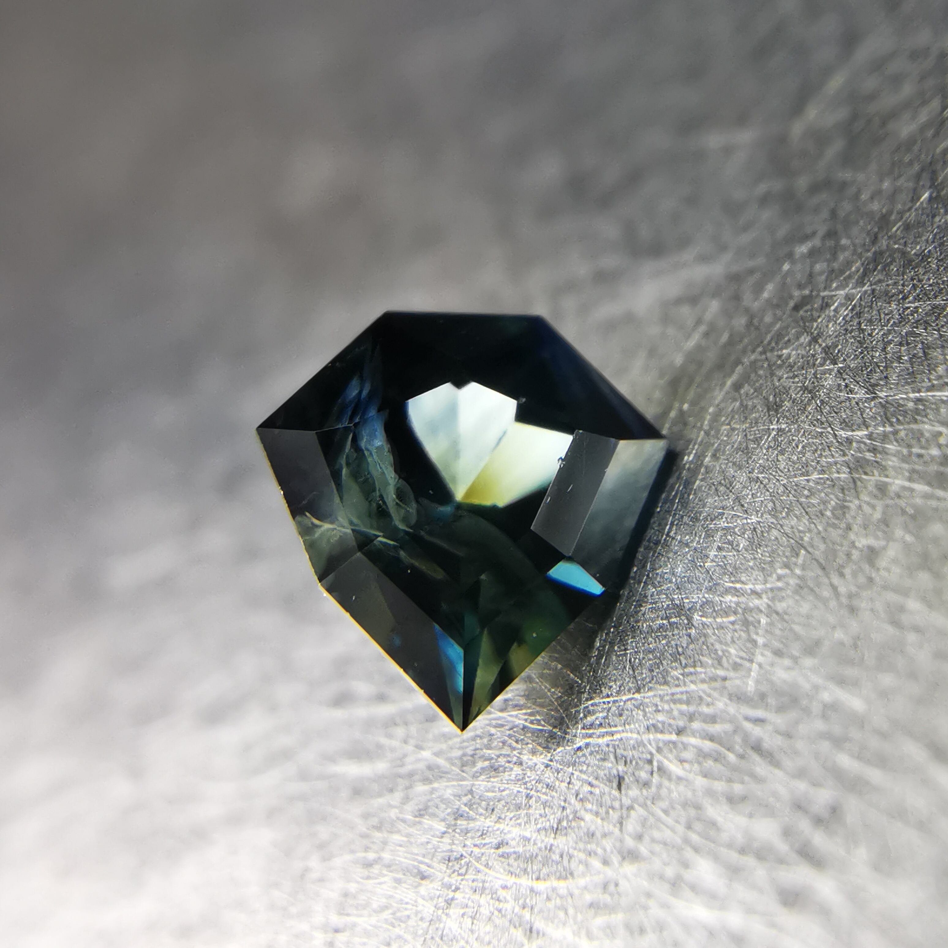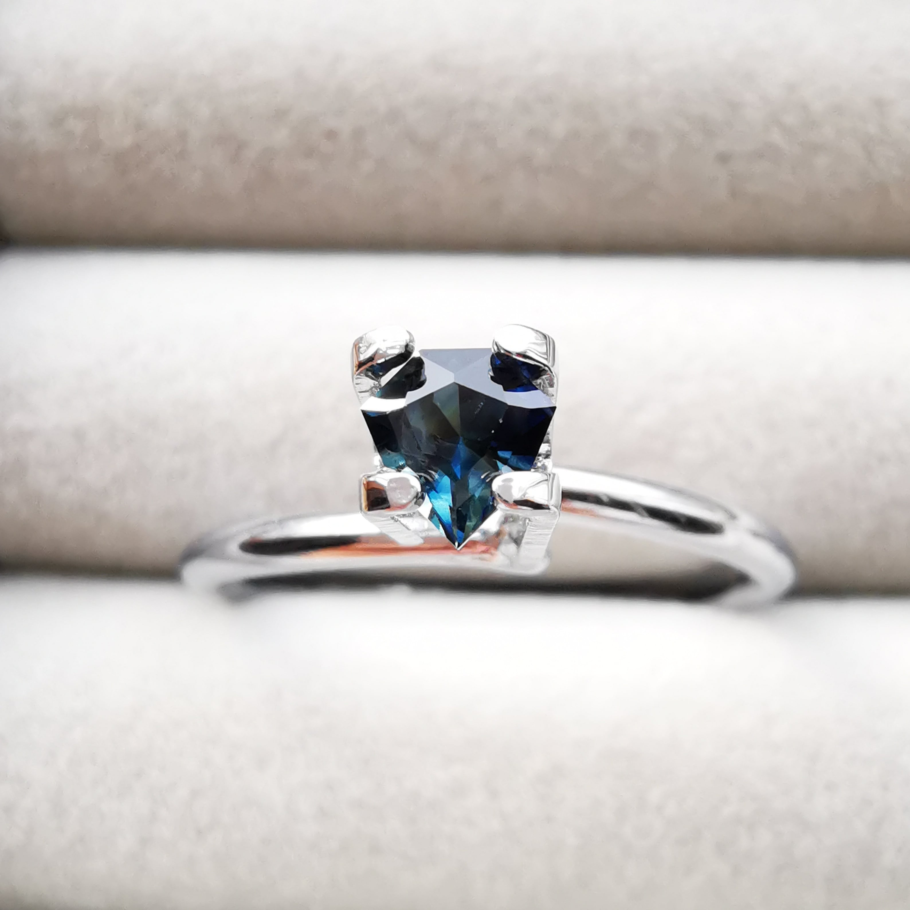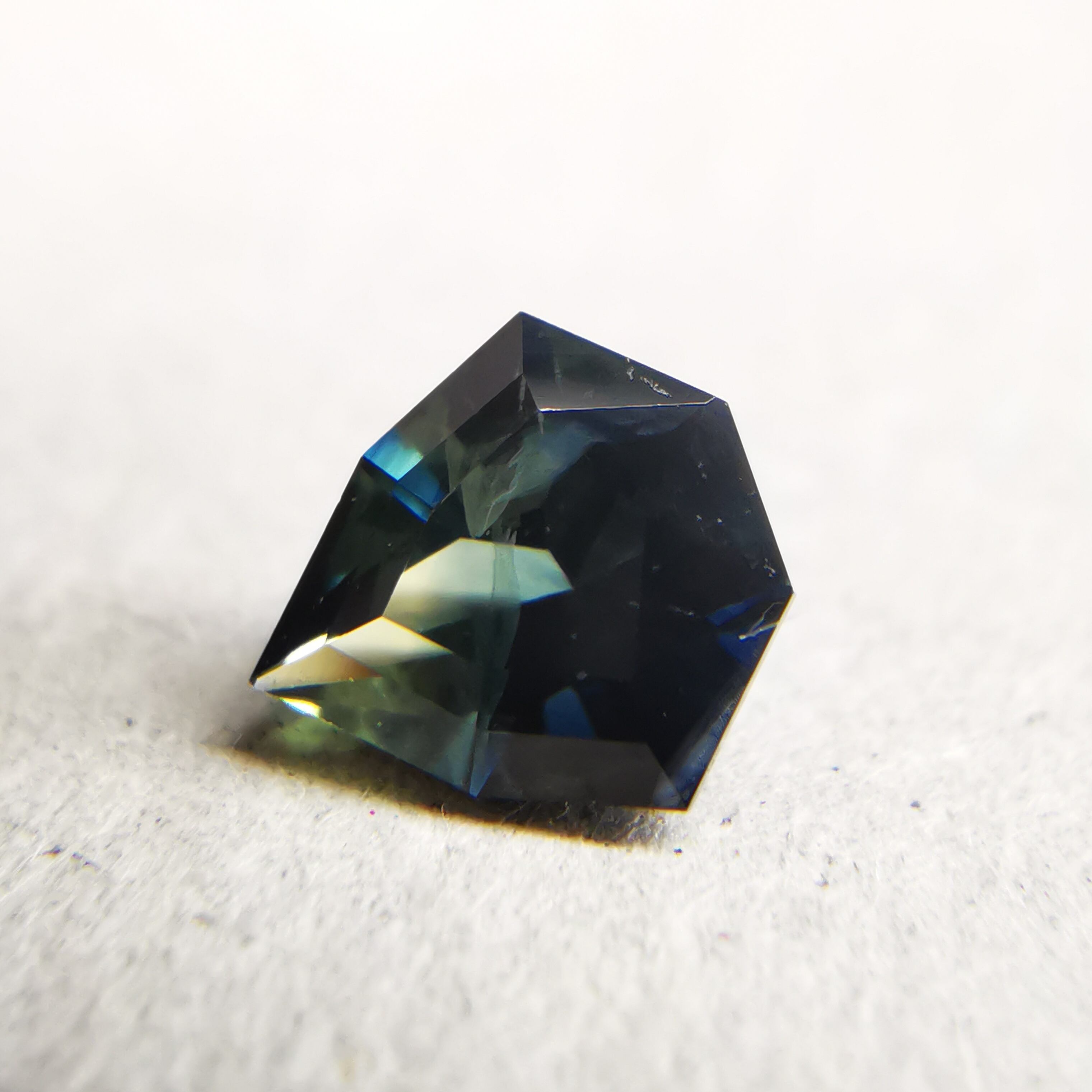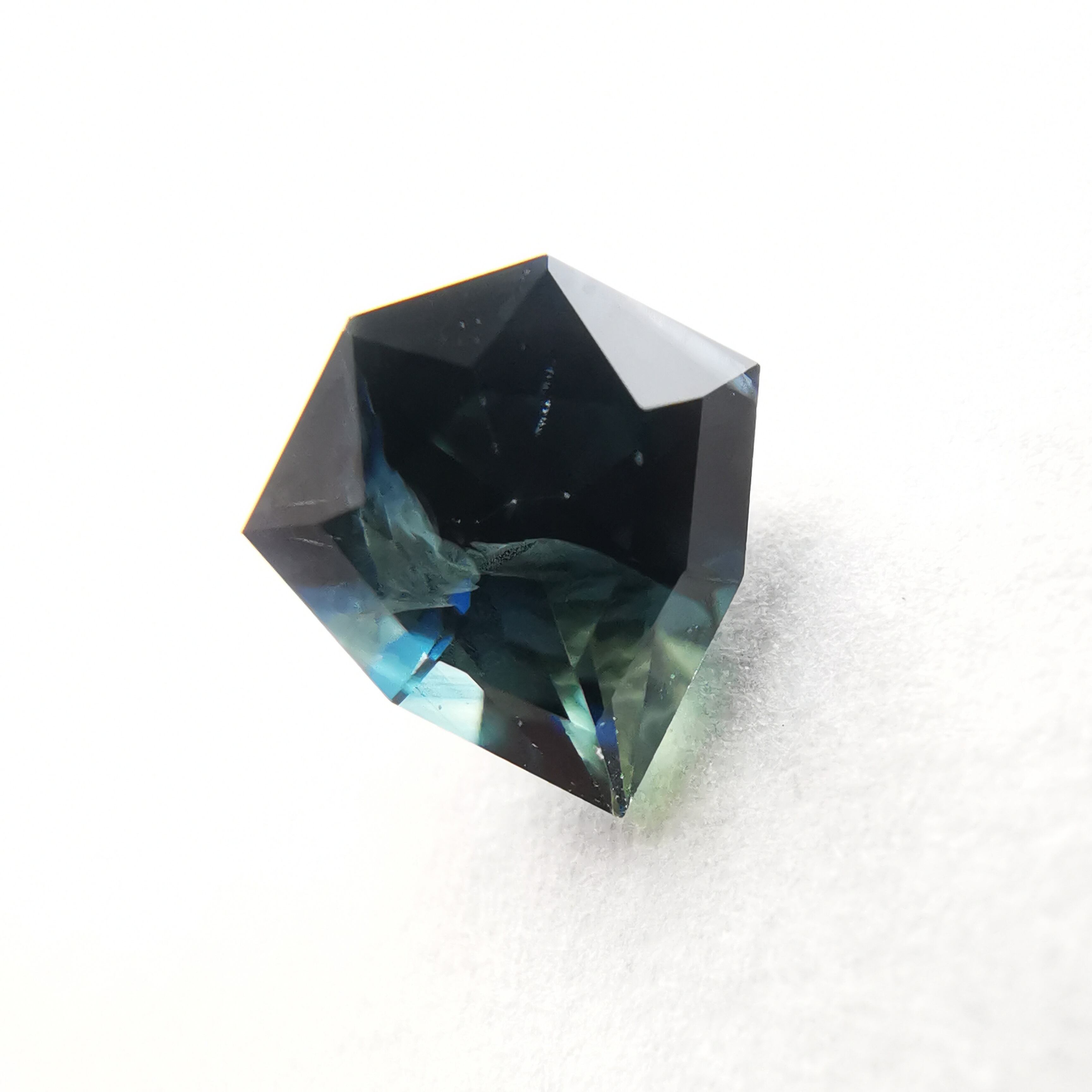 やや暗いティールカラーのサファイアですが、傾けると先端の方はクリアなイエロー、角度を変えるとブルーやグリーンがきらめきます。