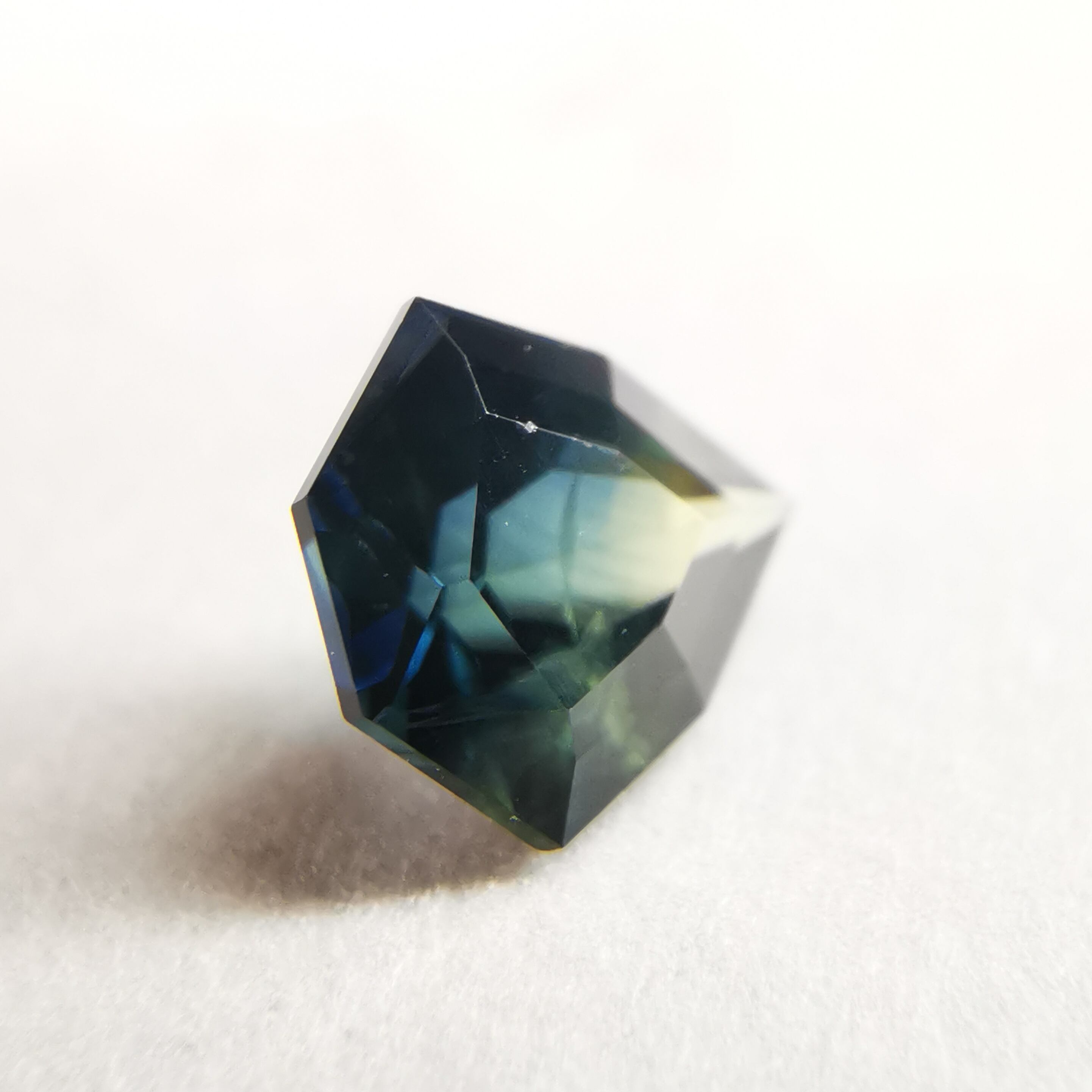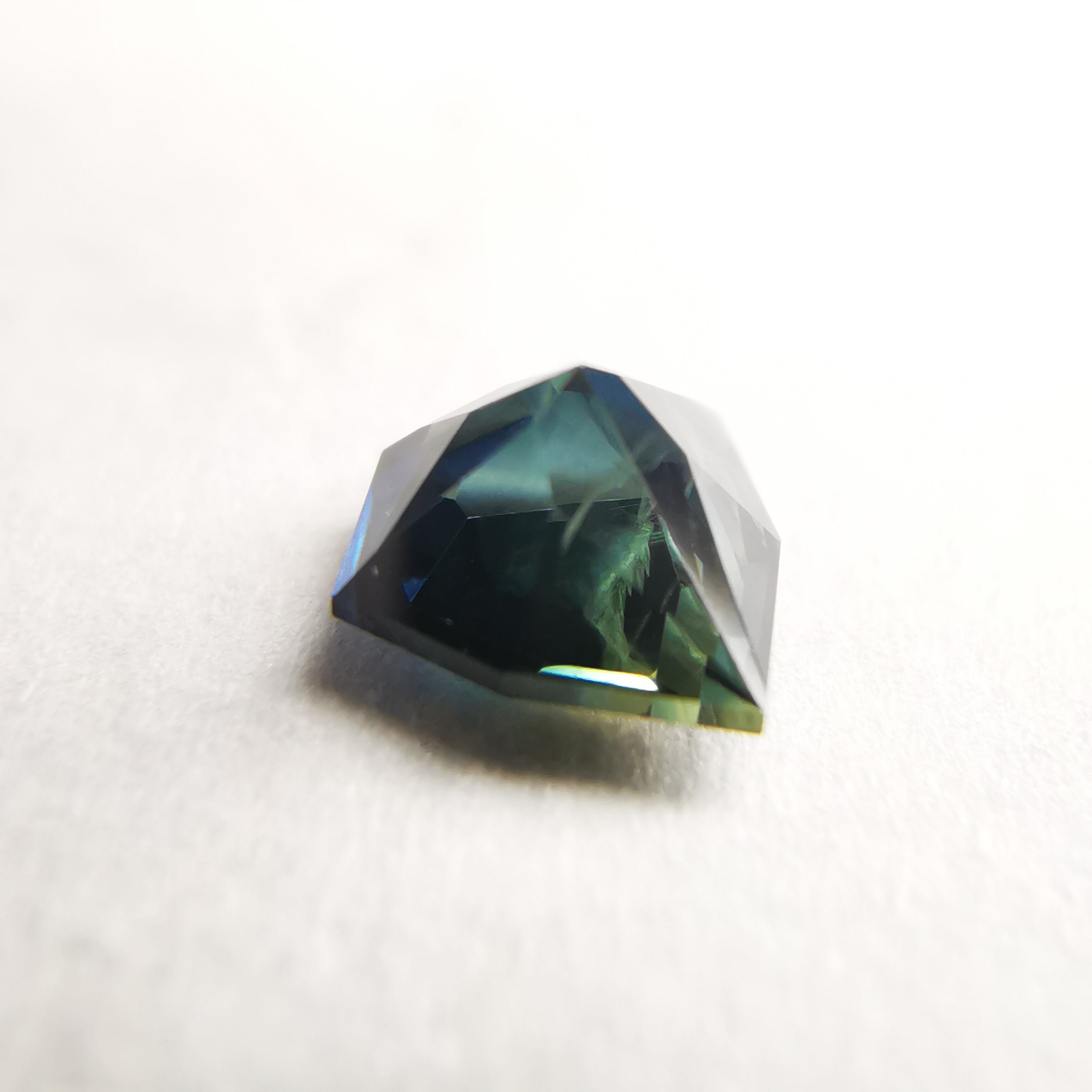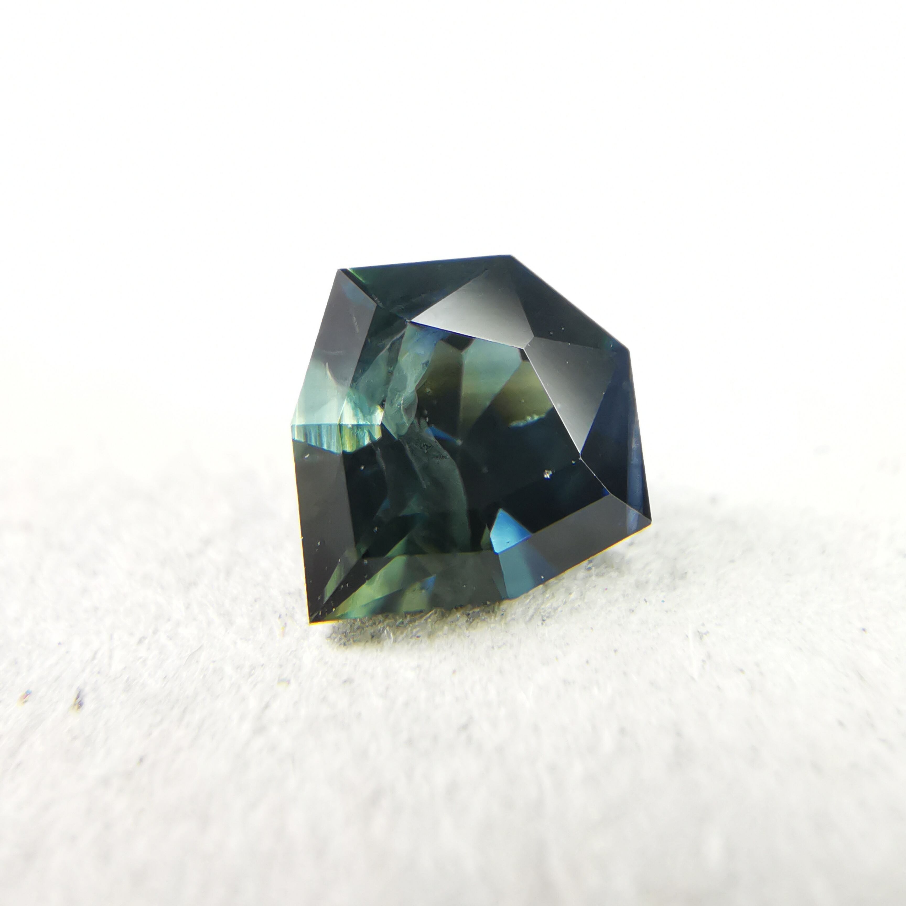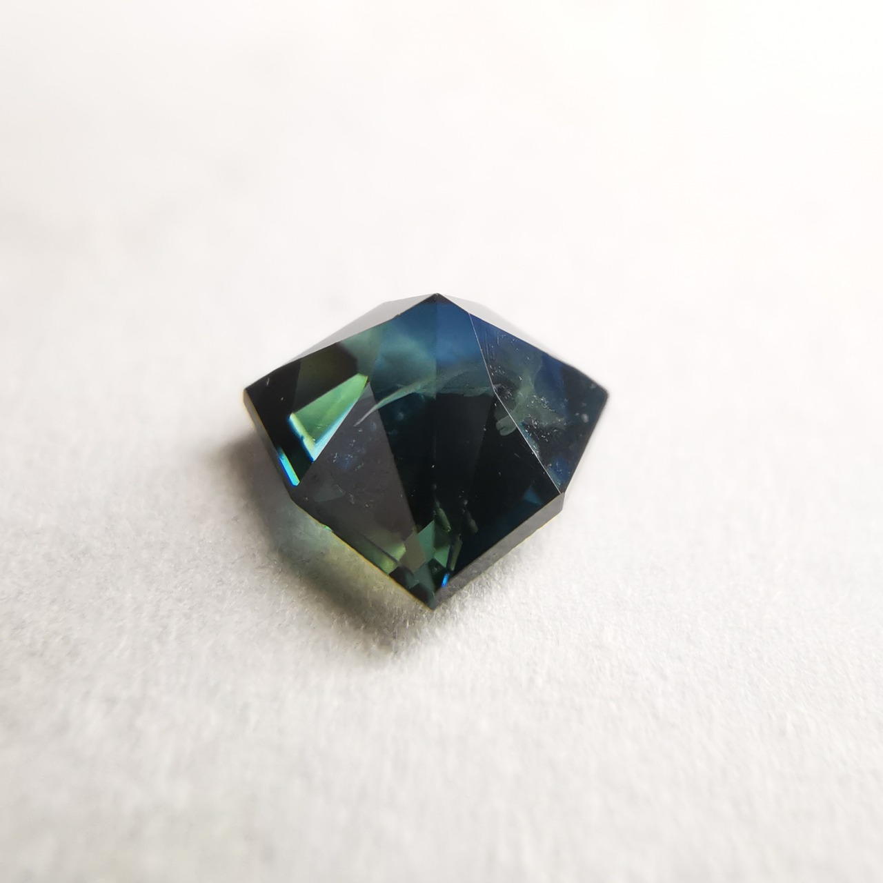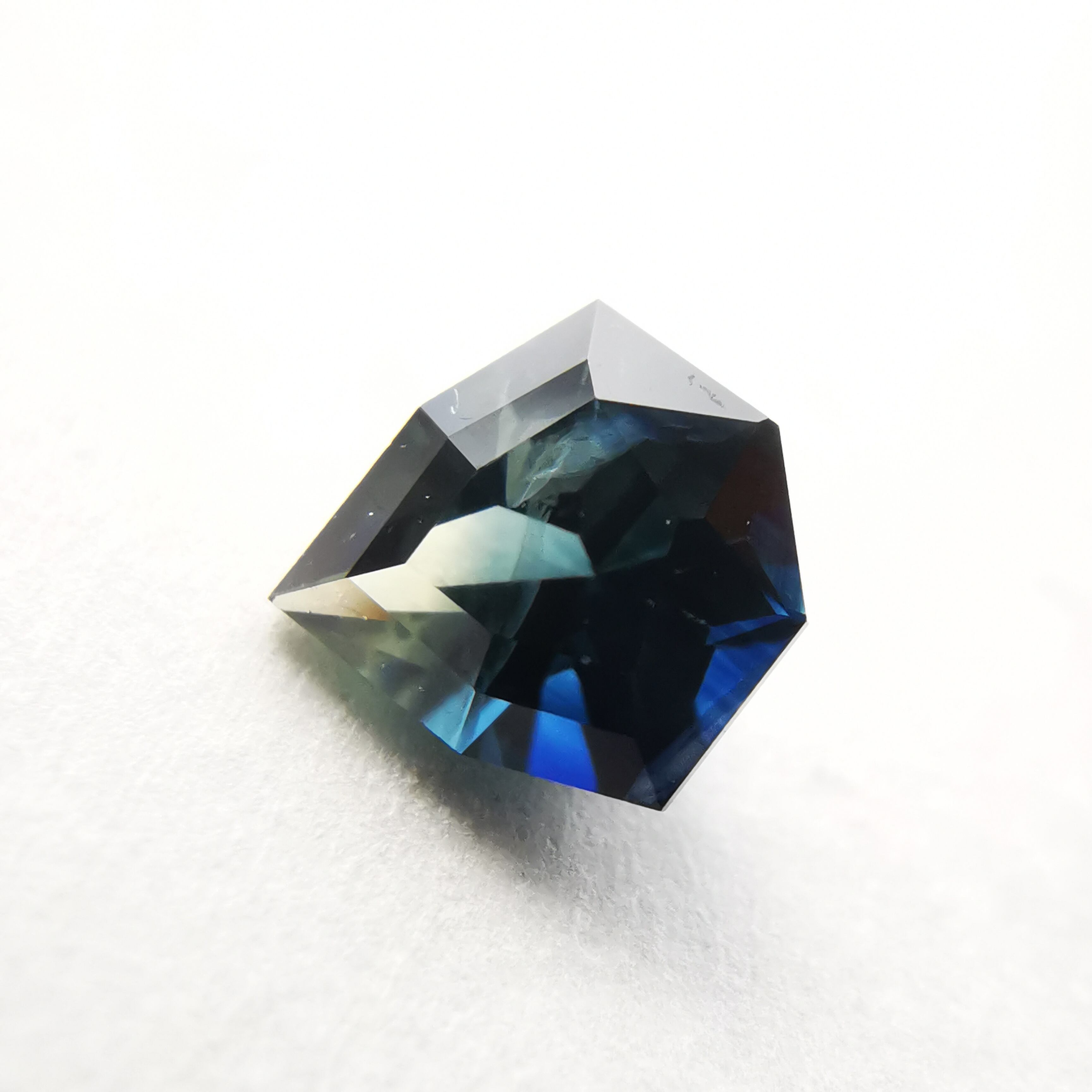 やや暗いティールカラーのサファイアですが、傾けると先端の方はクリアなイエロー、角度を変えるとブルーやグリーンがきらめきます。