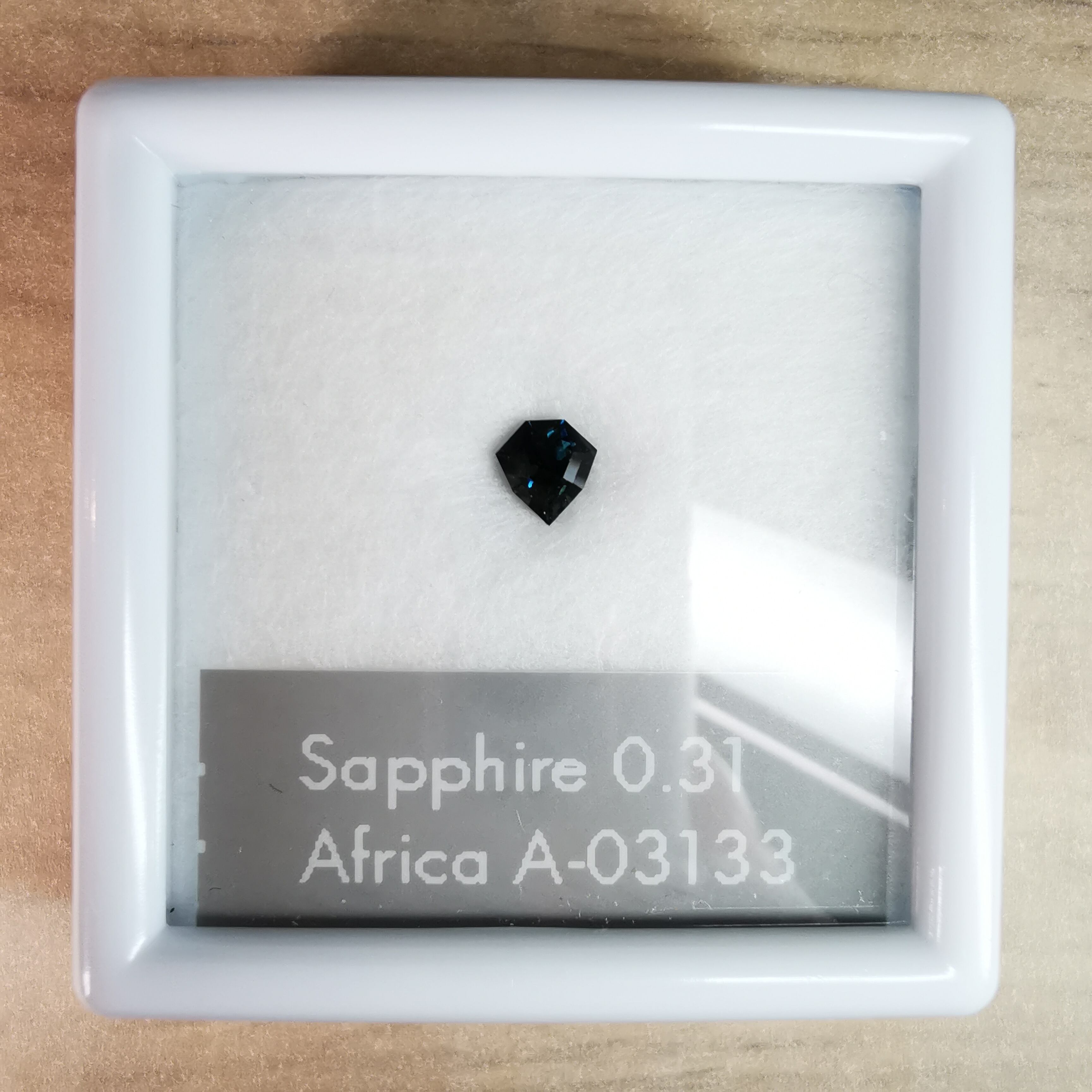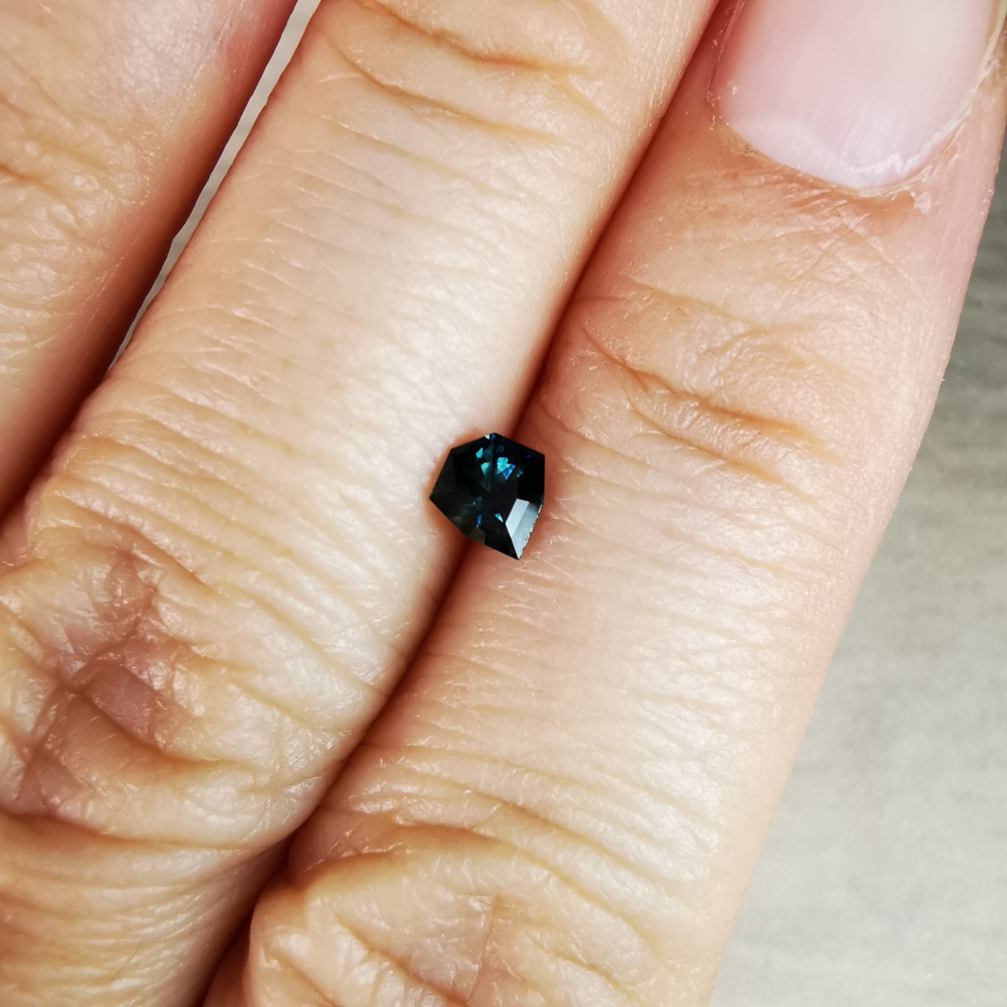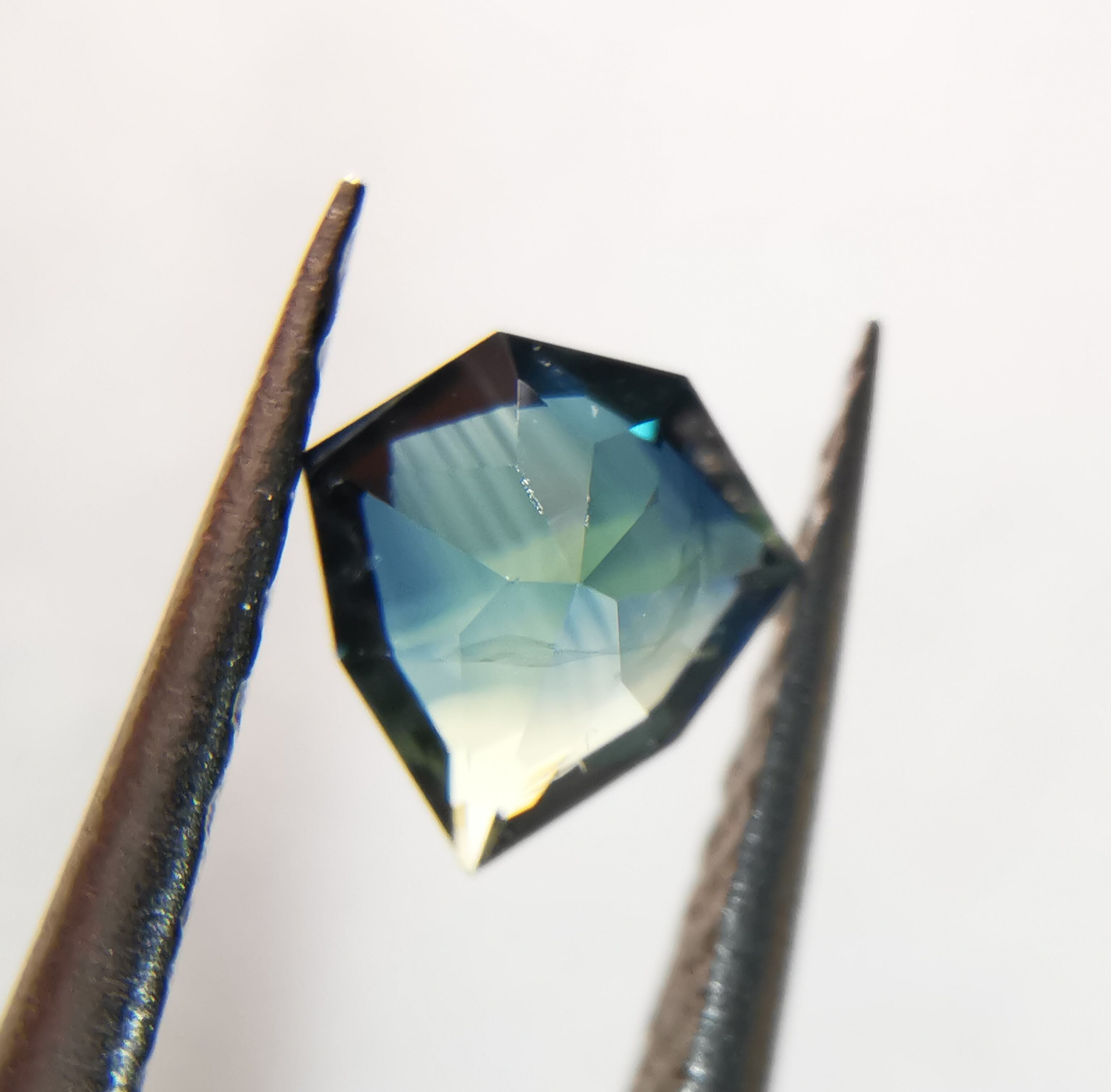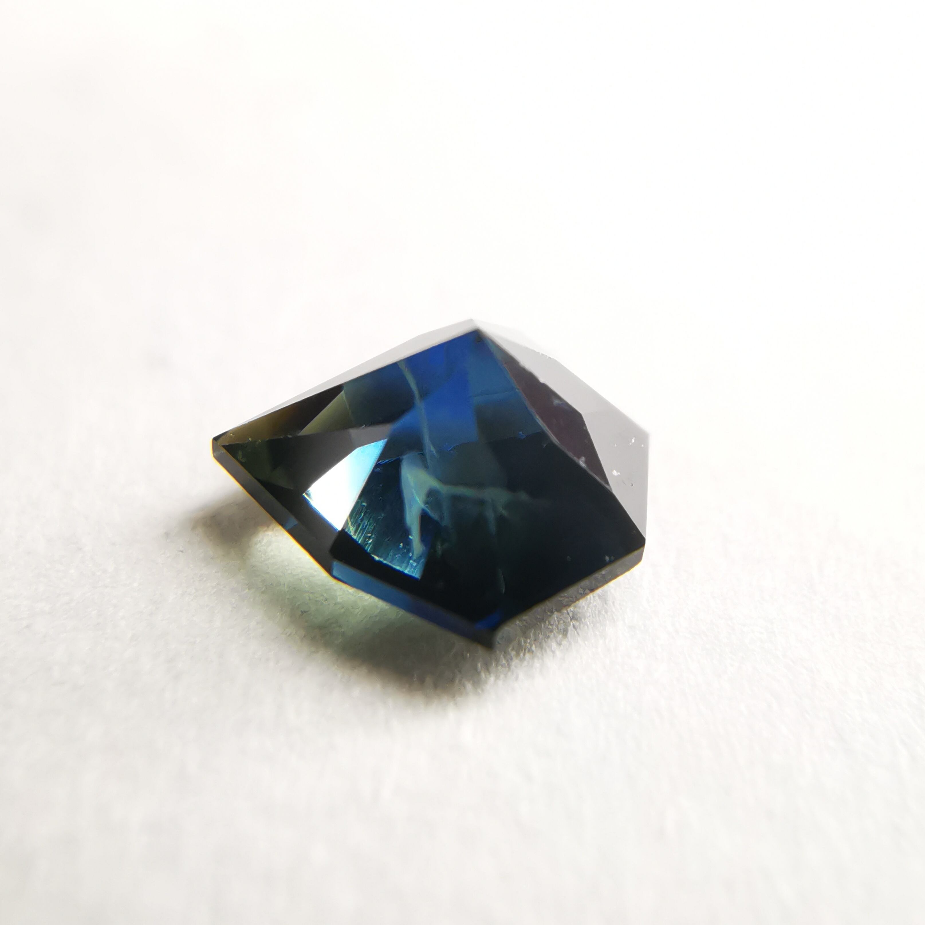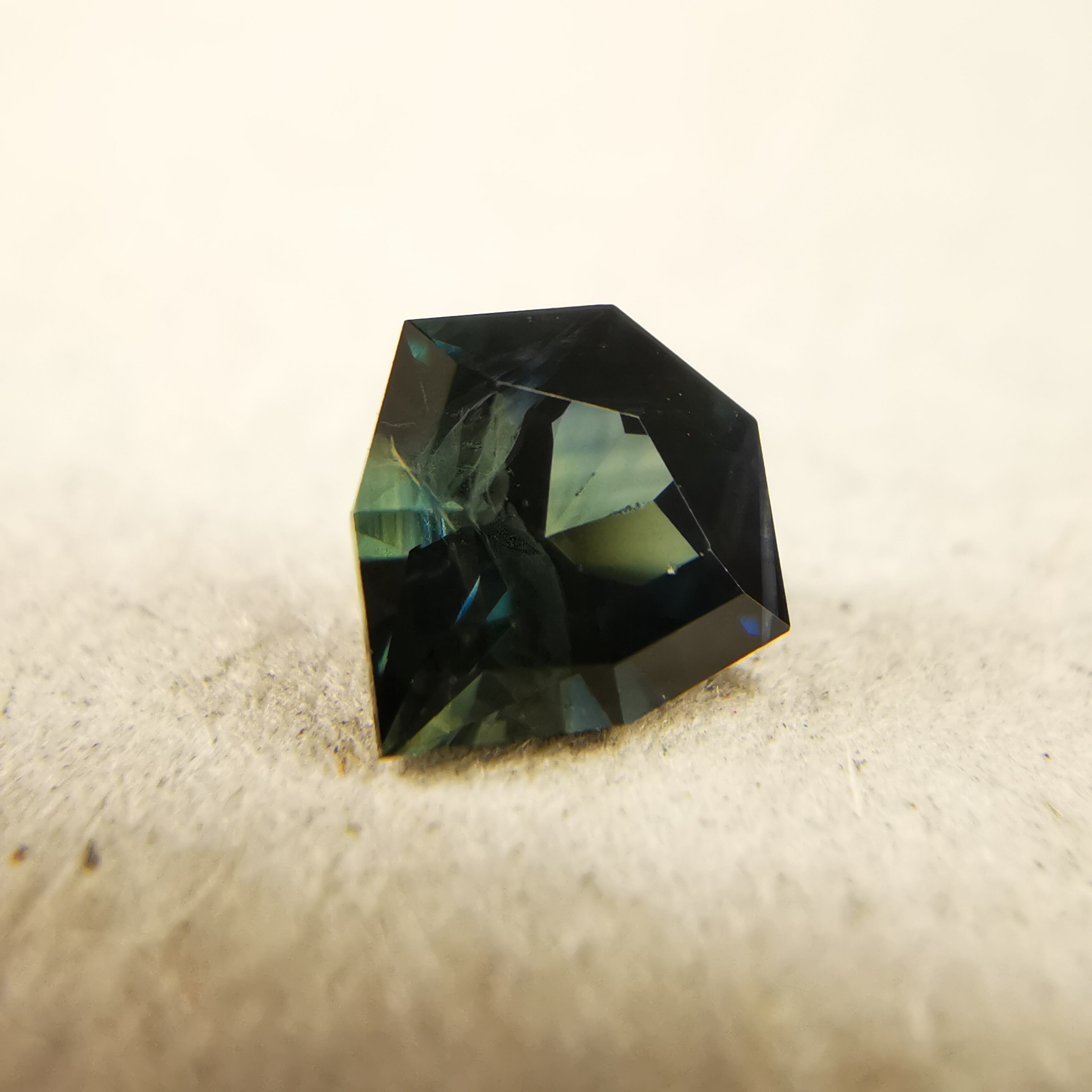 やや暗いティールカラーのサファイアですが、傾けると先端の方はクリアなイエロー、角度を変えるとブルーやグリーンがきらめきます。