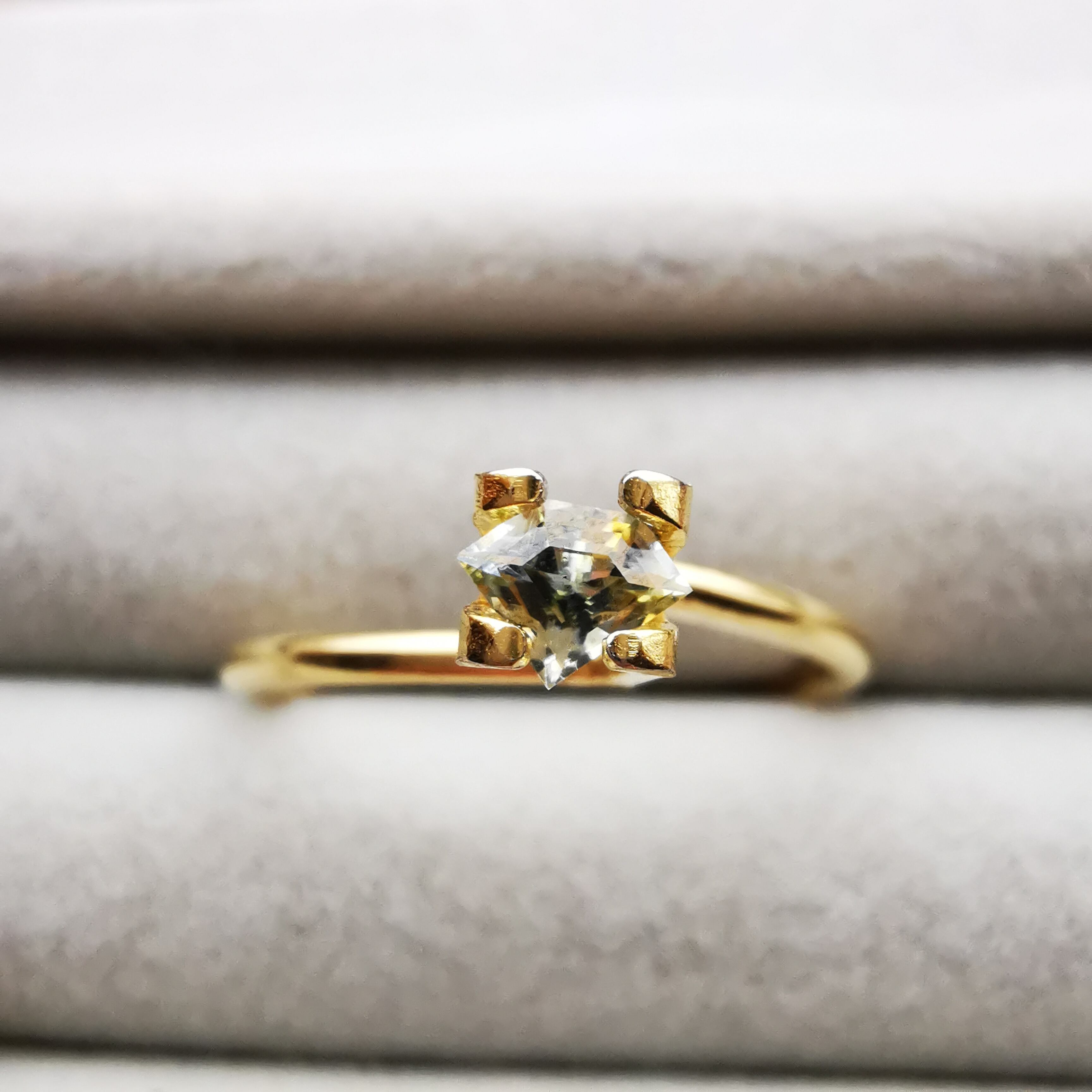 マーブルに入るイエローと宝石型のカットで、可愛らしい印象の一石です。