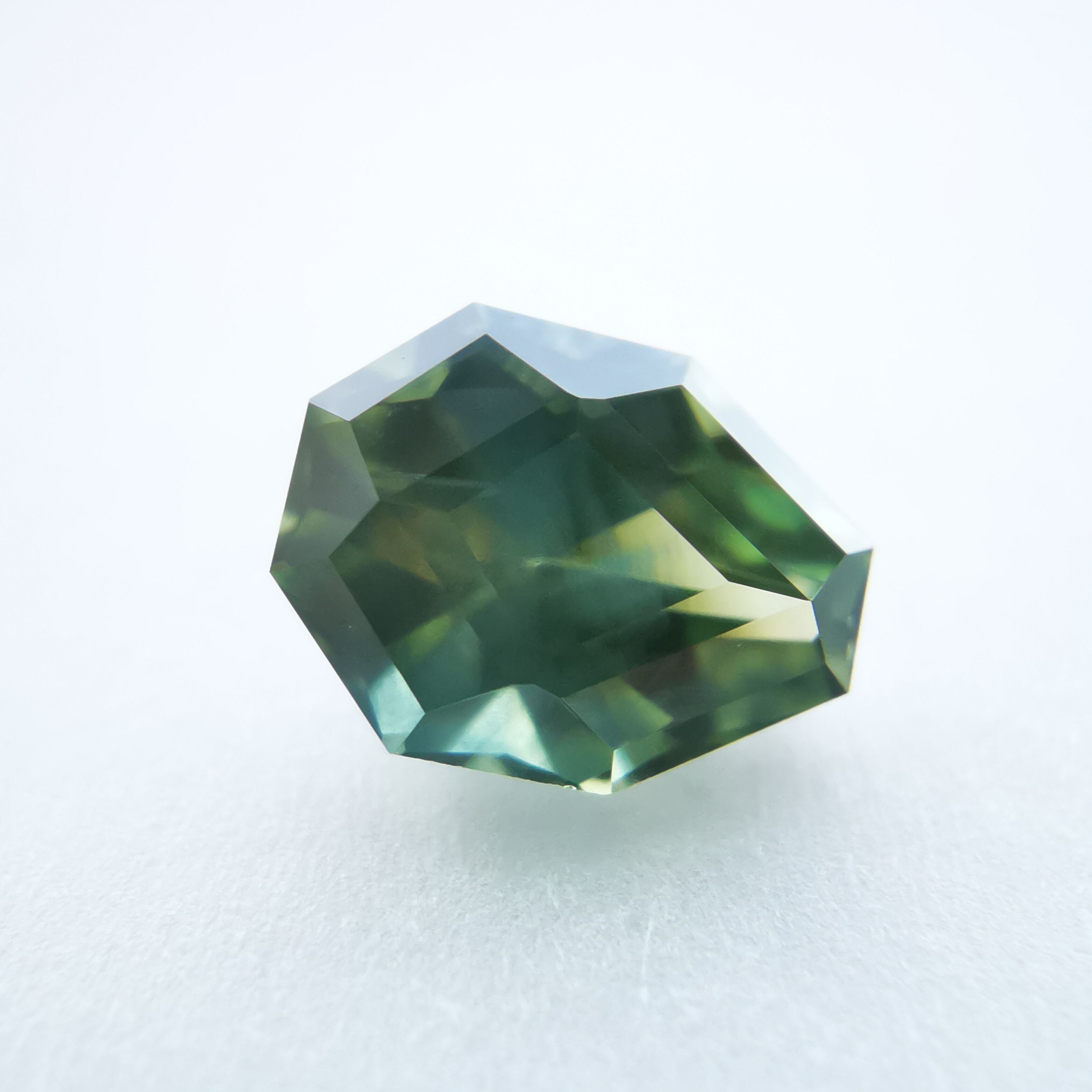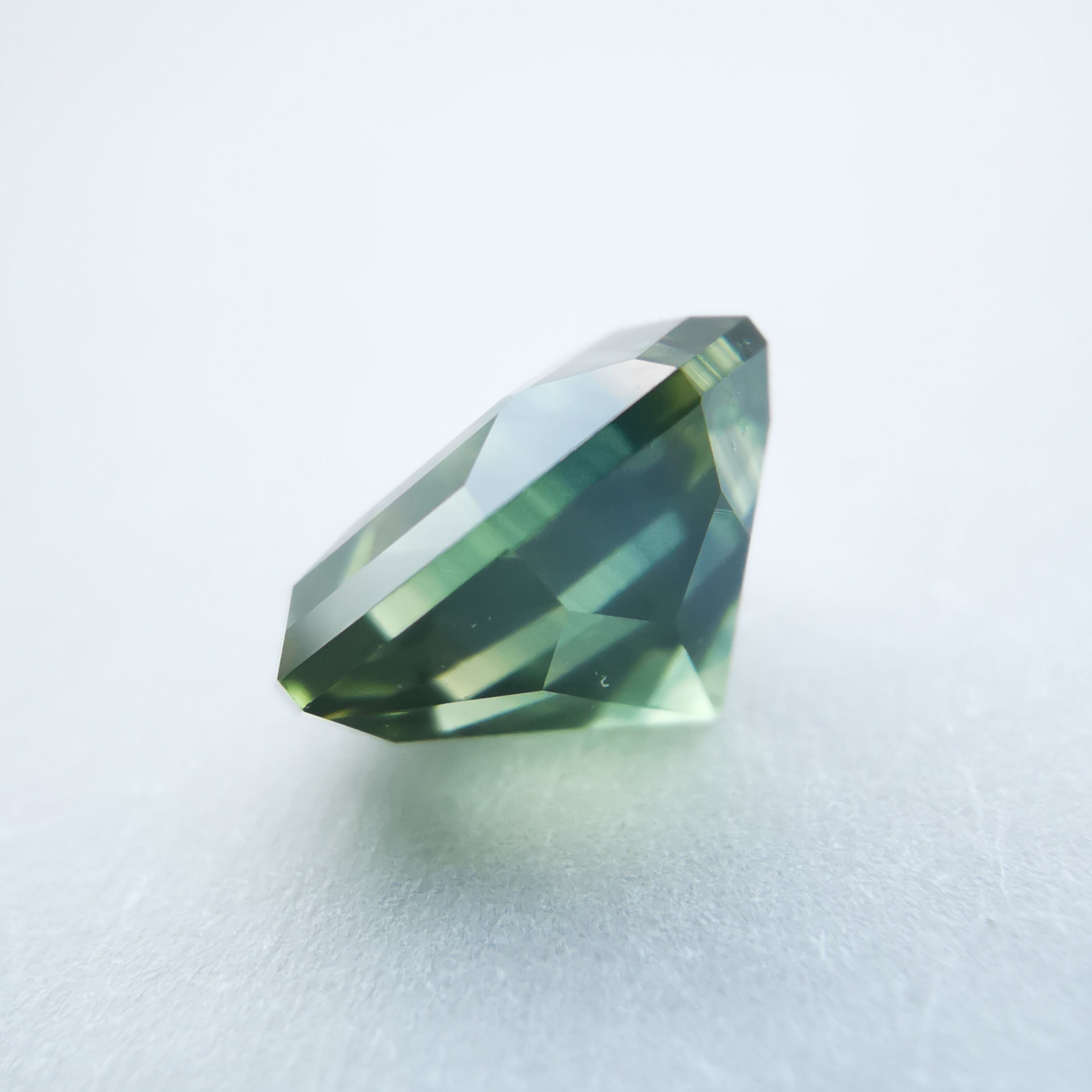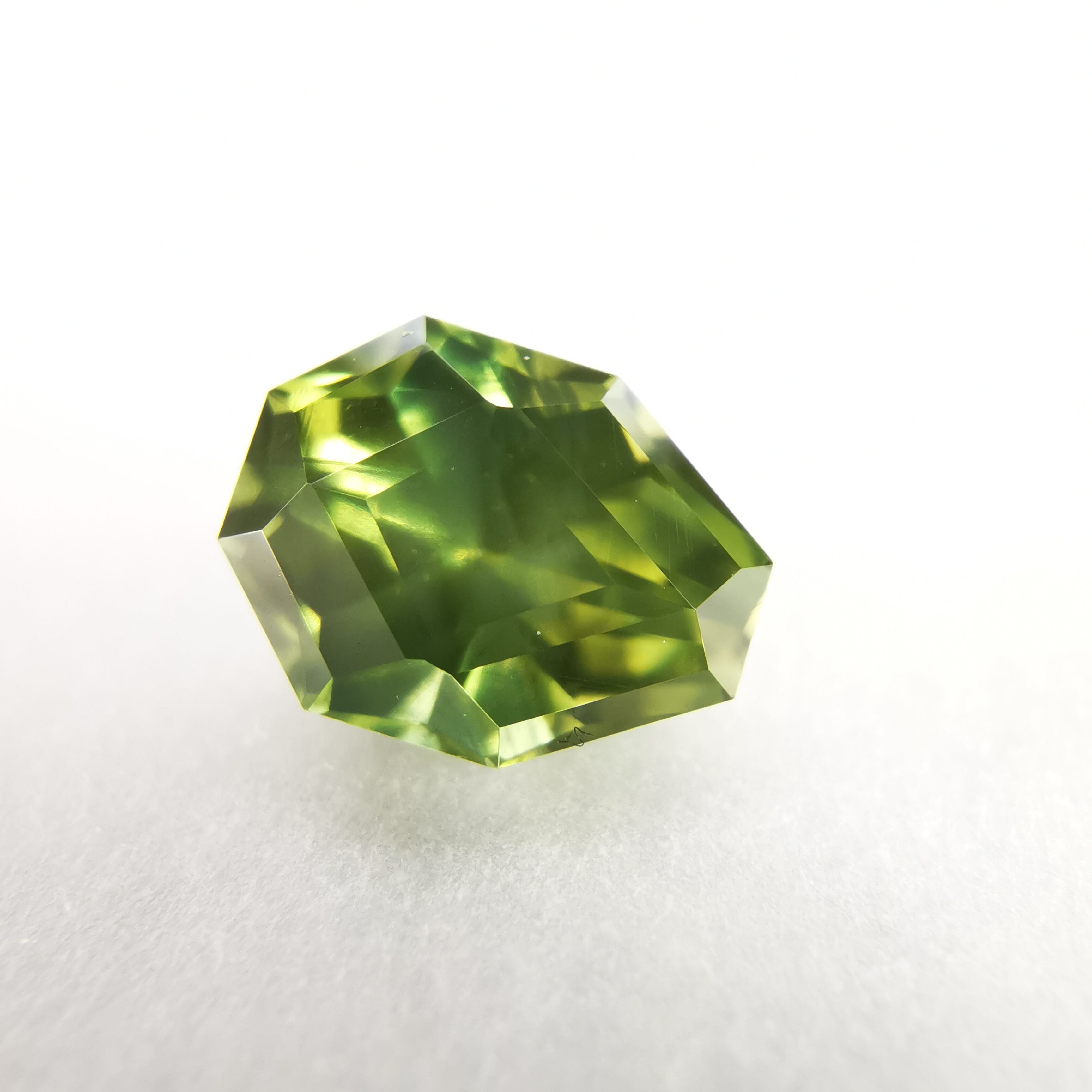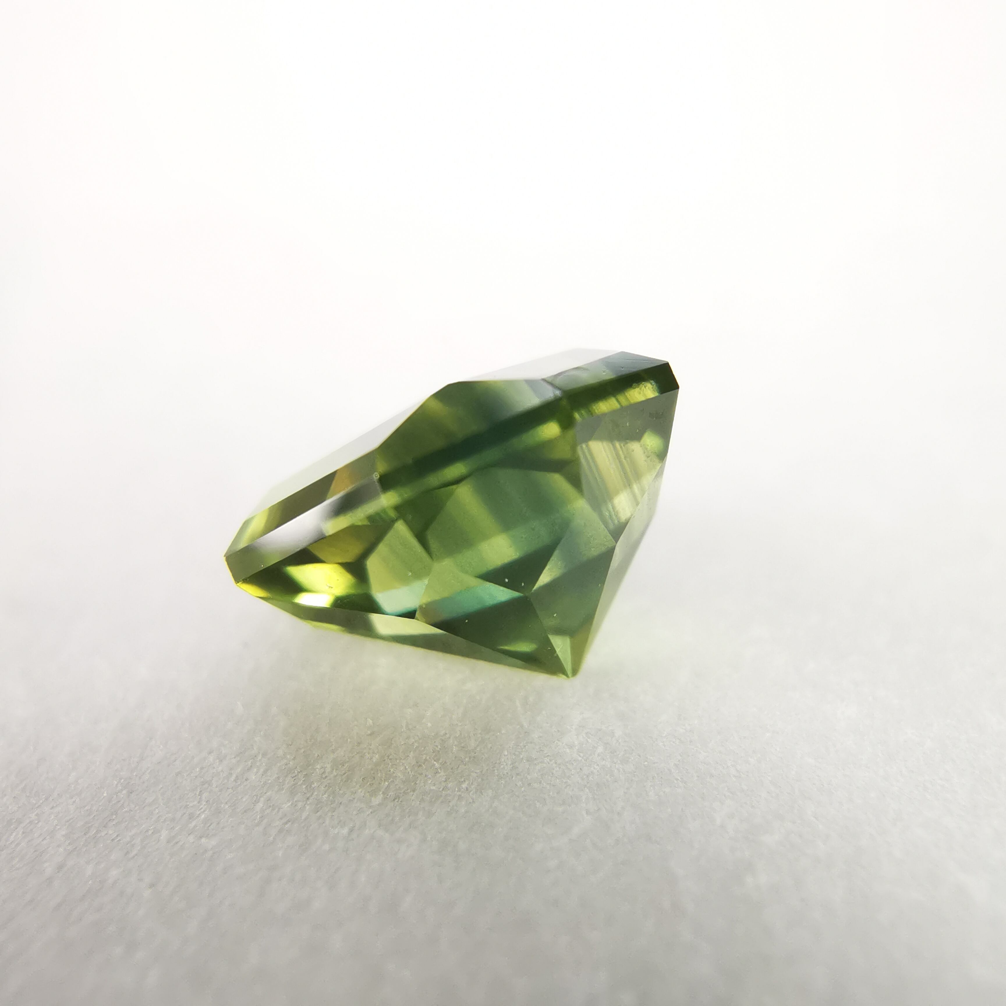 照明の元ではイエローにグリーンが混じるバイカラーに見え、自然光の下ではイエローにブルーグリーンが混じるように見えます。