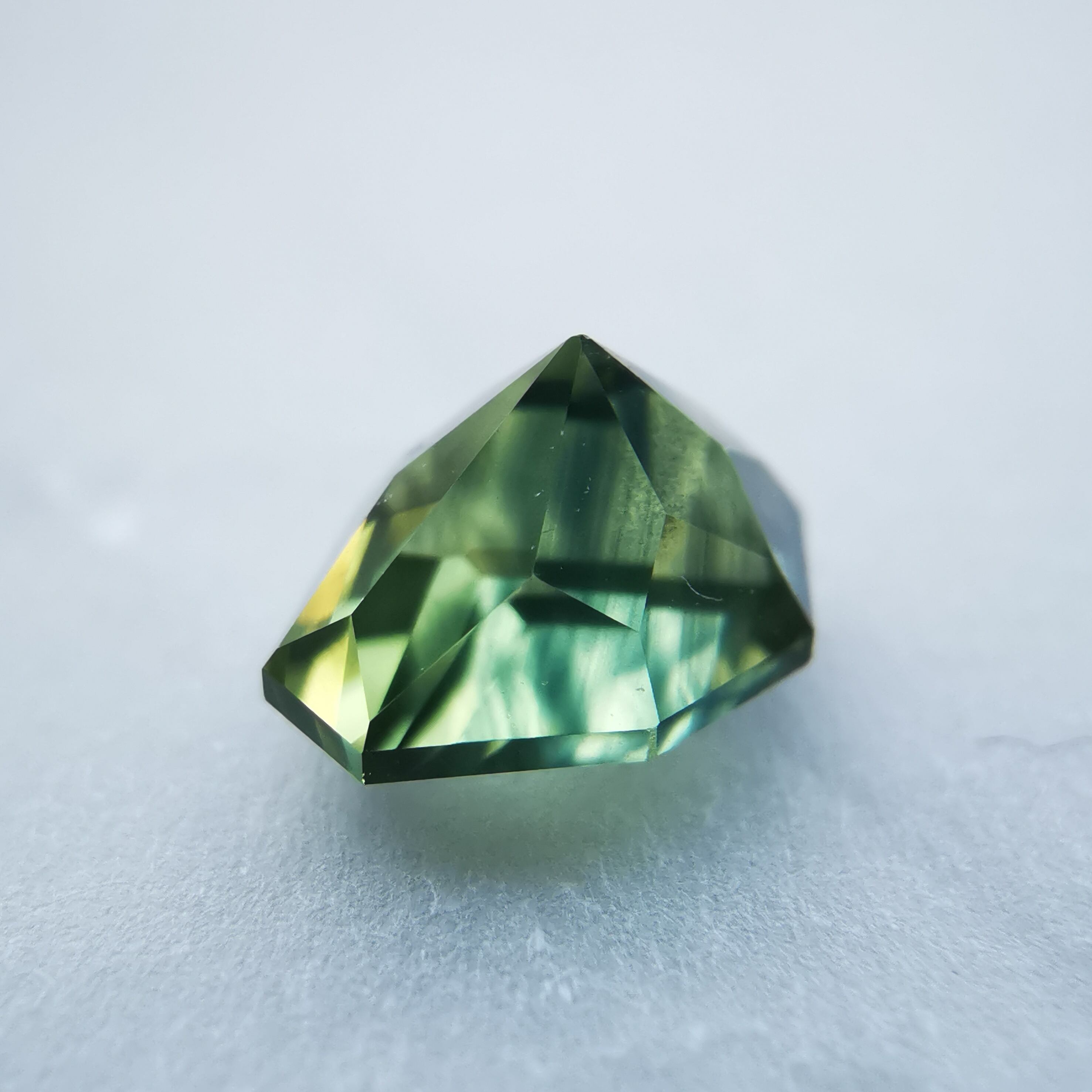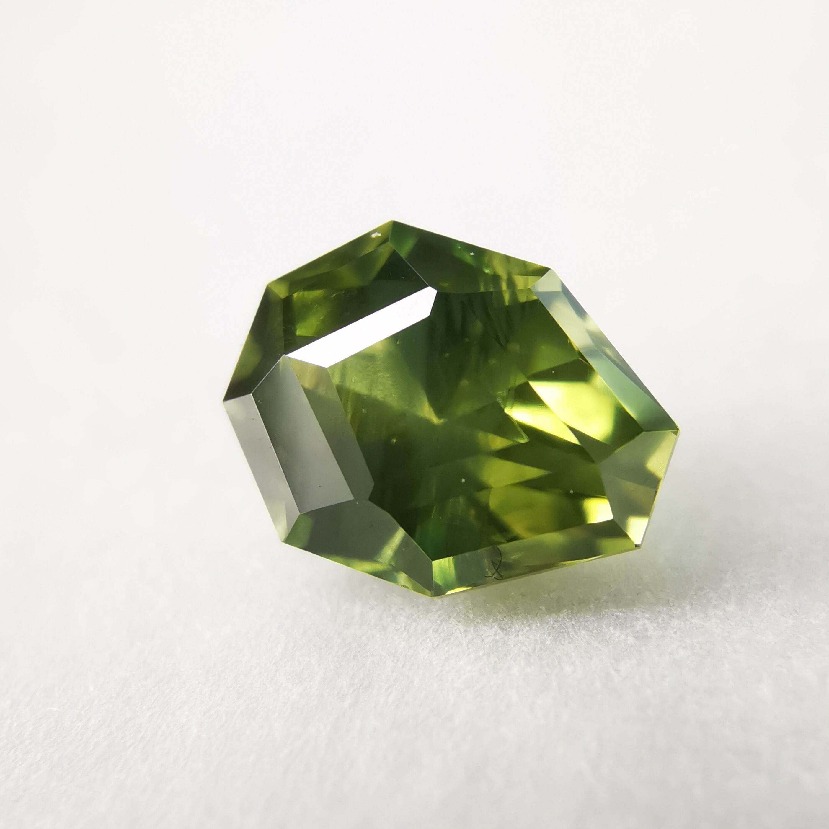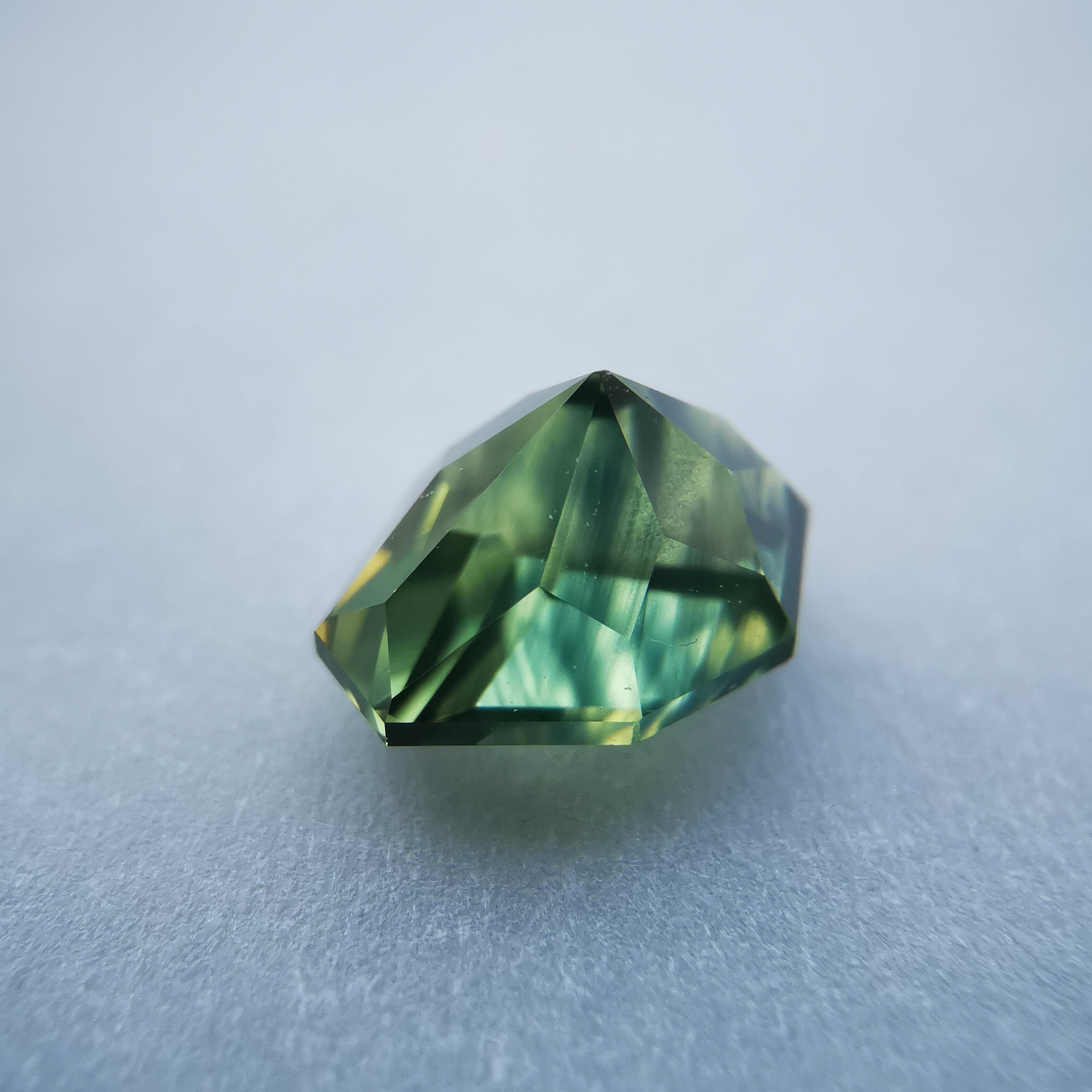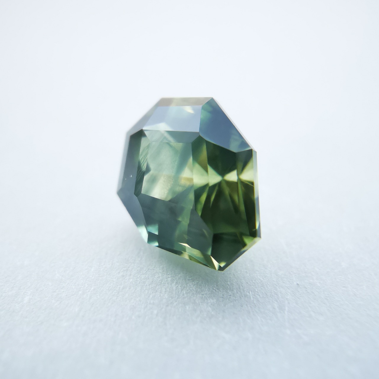 照明の元ではイエローにグリーンが混じるバイカラーに見え、自然光の下ではイエローにブルーグリーンが混じるように見えます。
