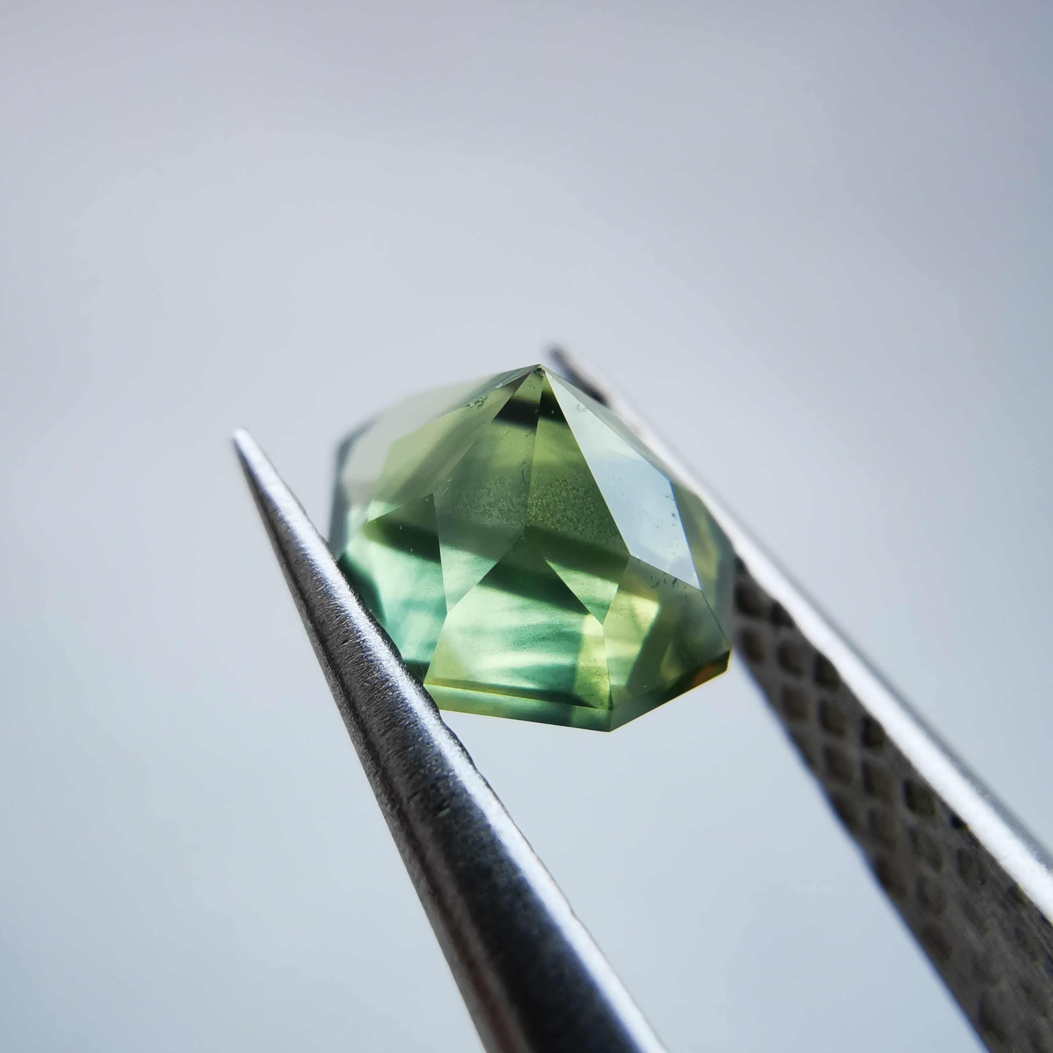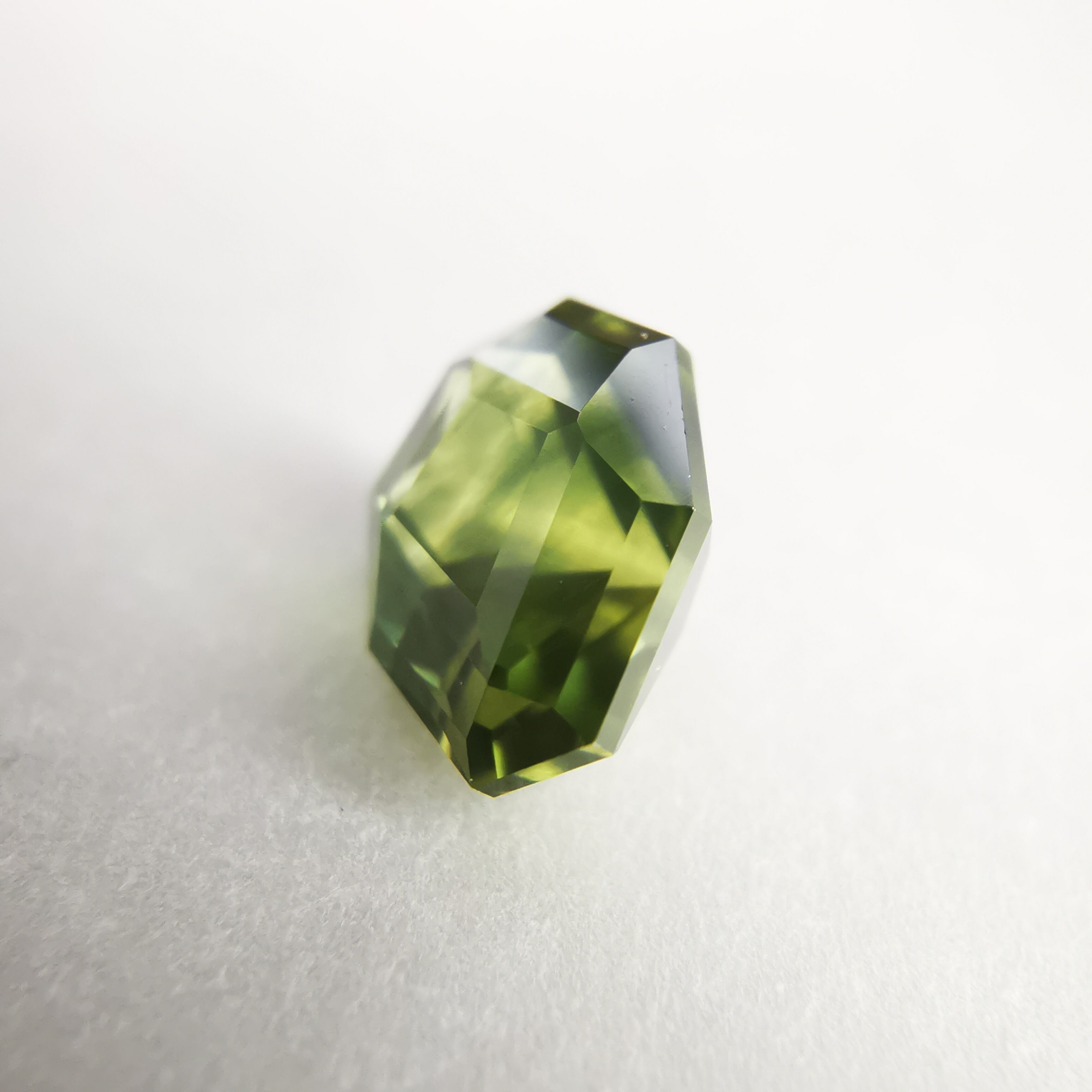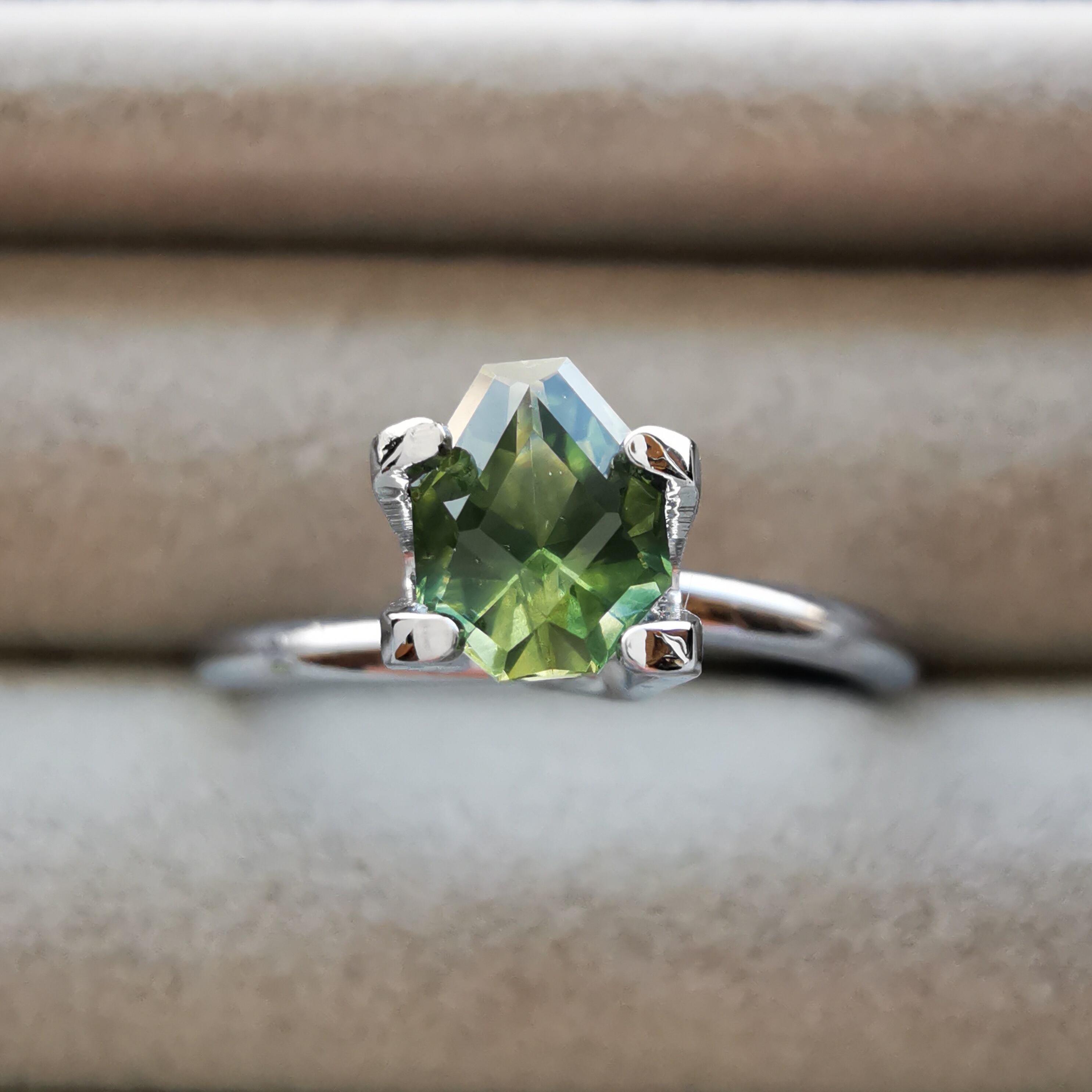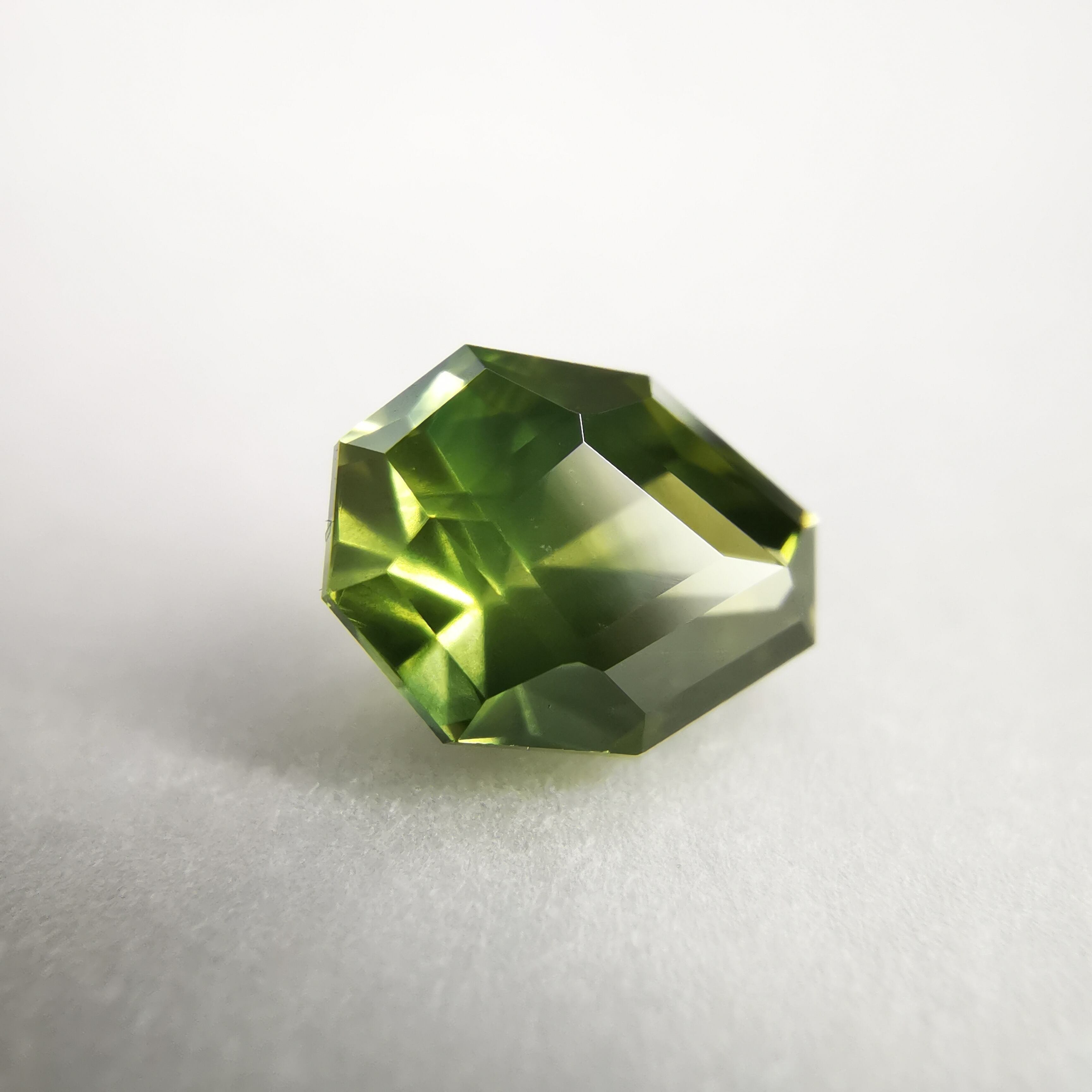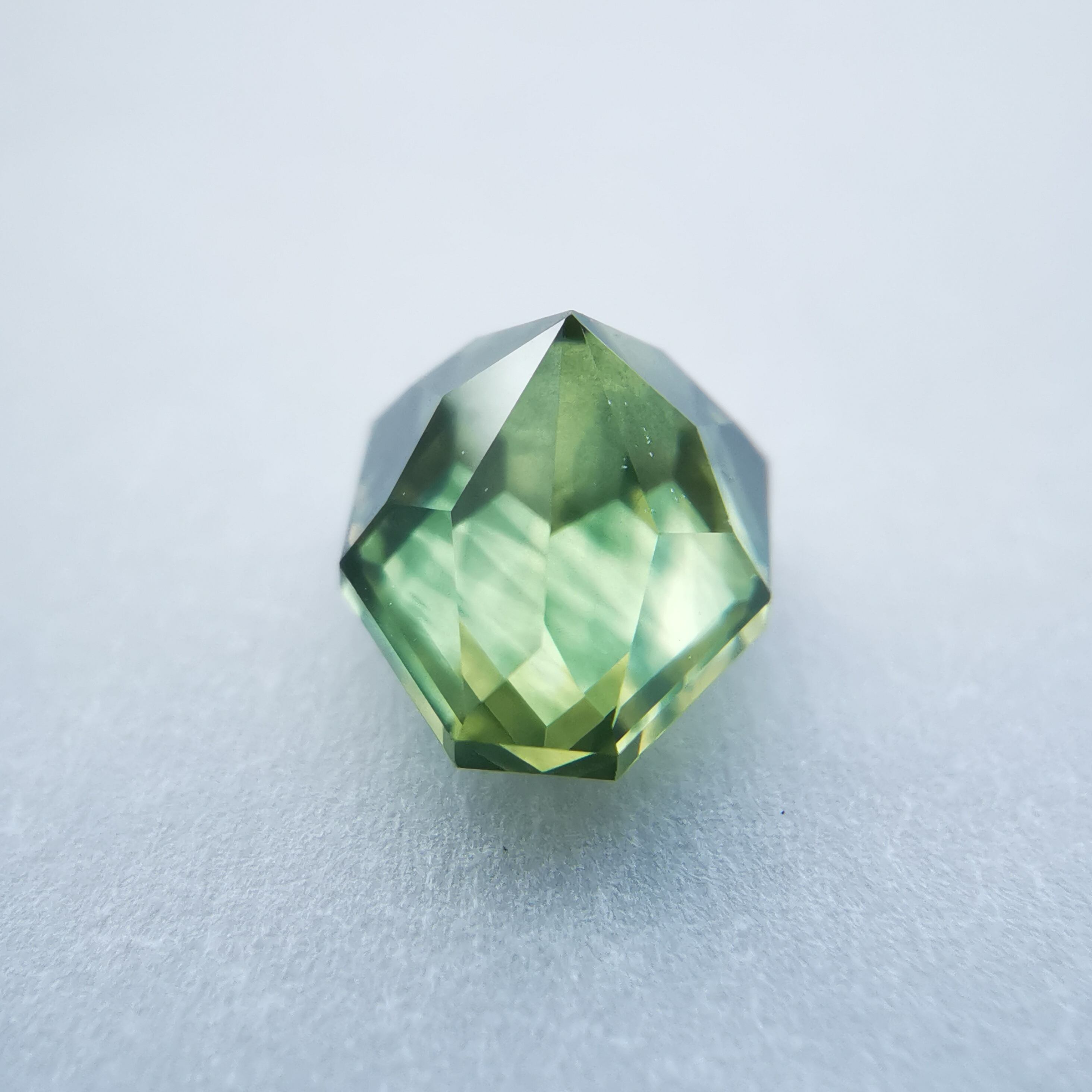照明の元ではイエローにグリーンが混じるバイカラーに見え、自然光の下ではイエローにブルーグリーンが混じるように見えます。