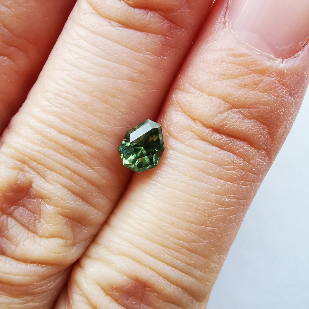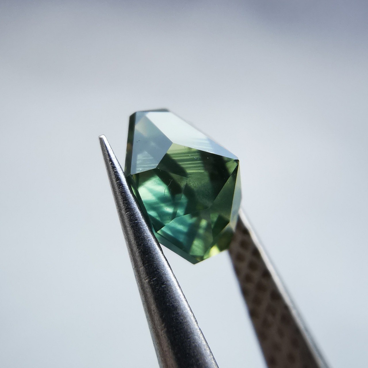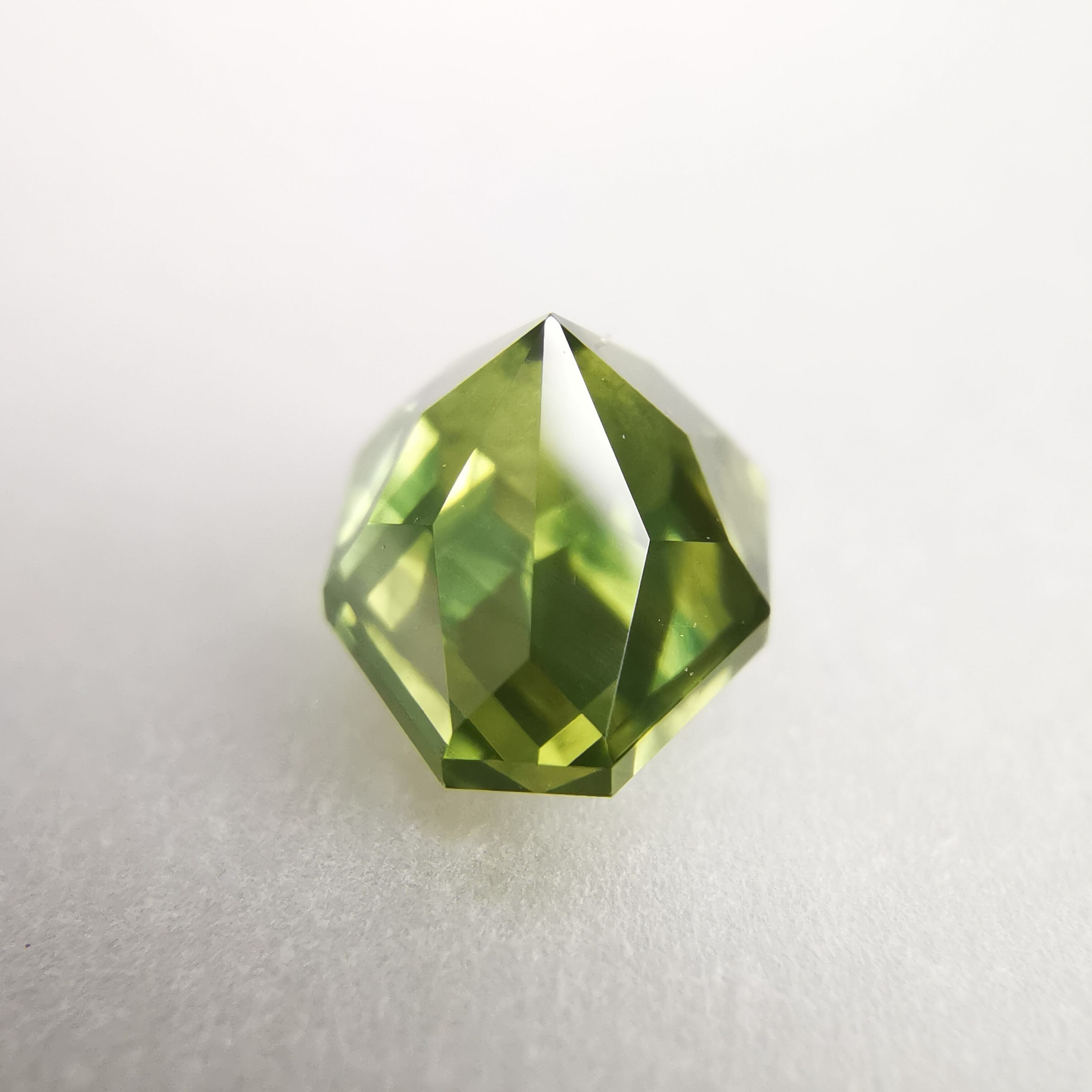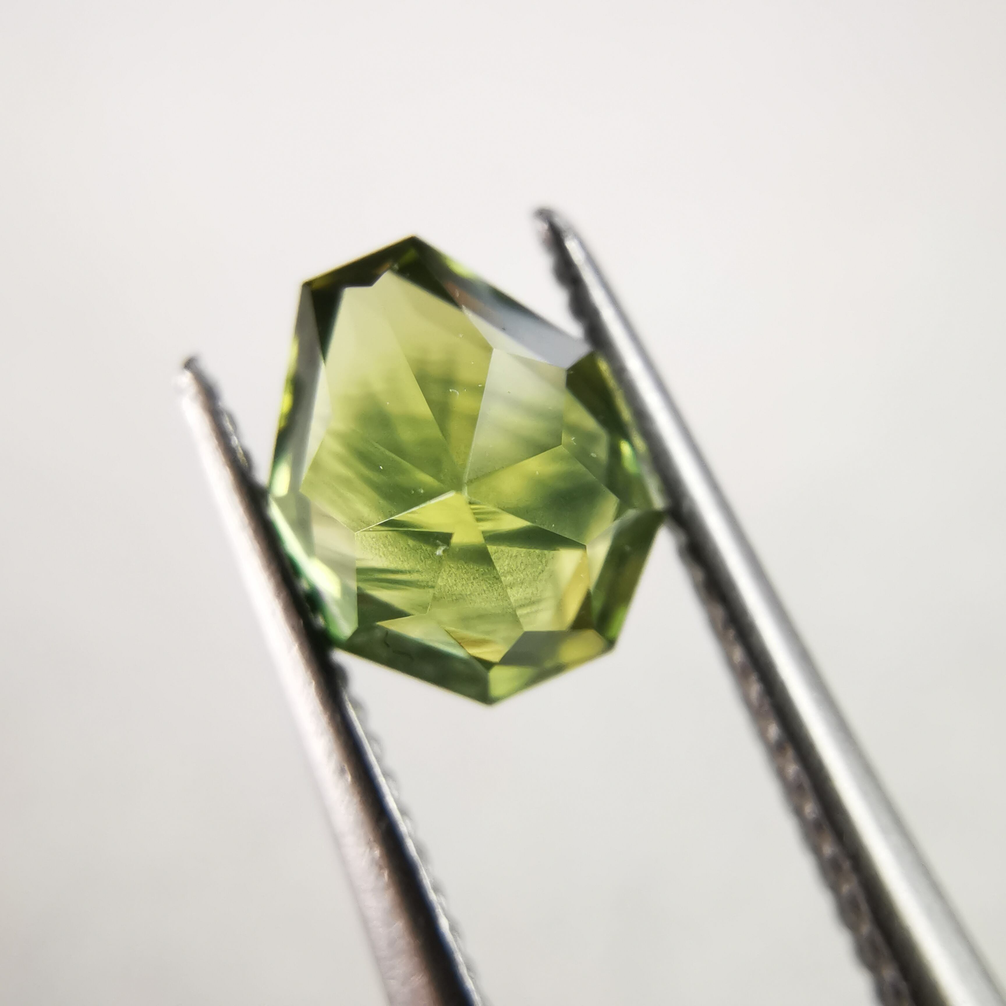照明の元ではイエローにグリーンが混じるバイカラーに見え、自然光の下ではイエローにブルーグリーンが混じるように見えます。