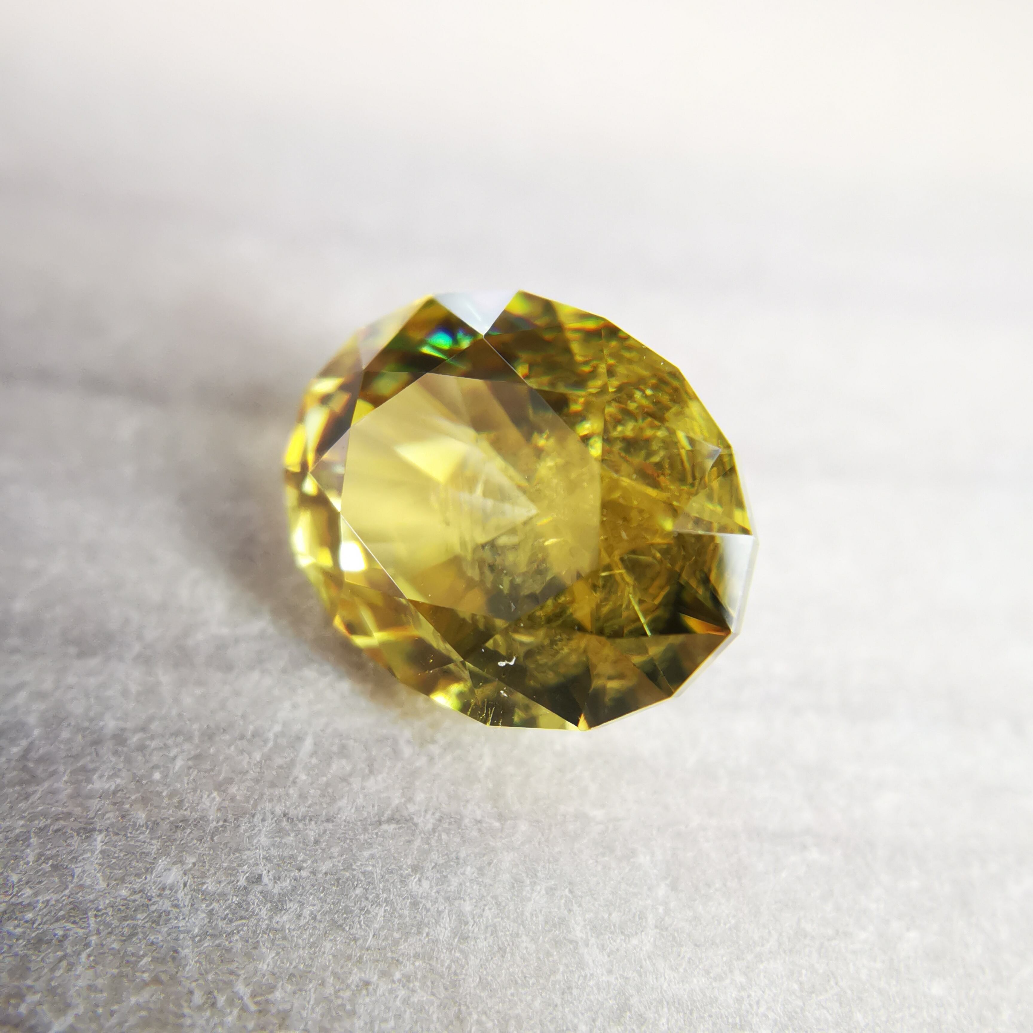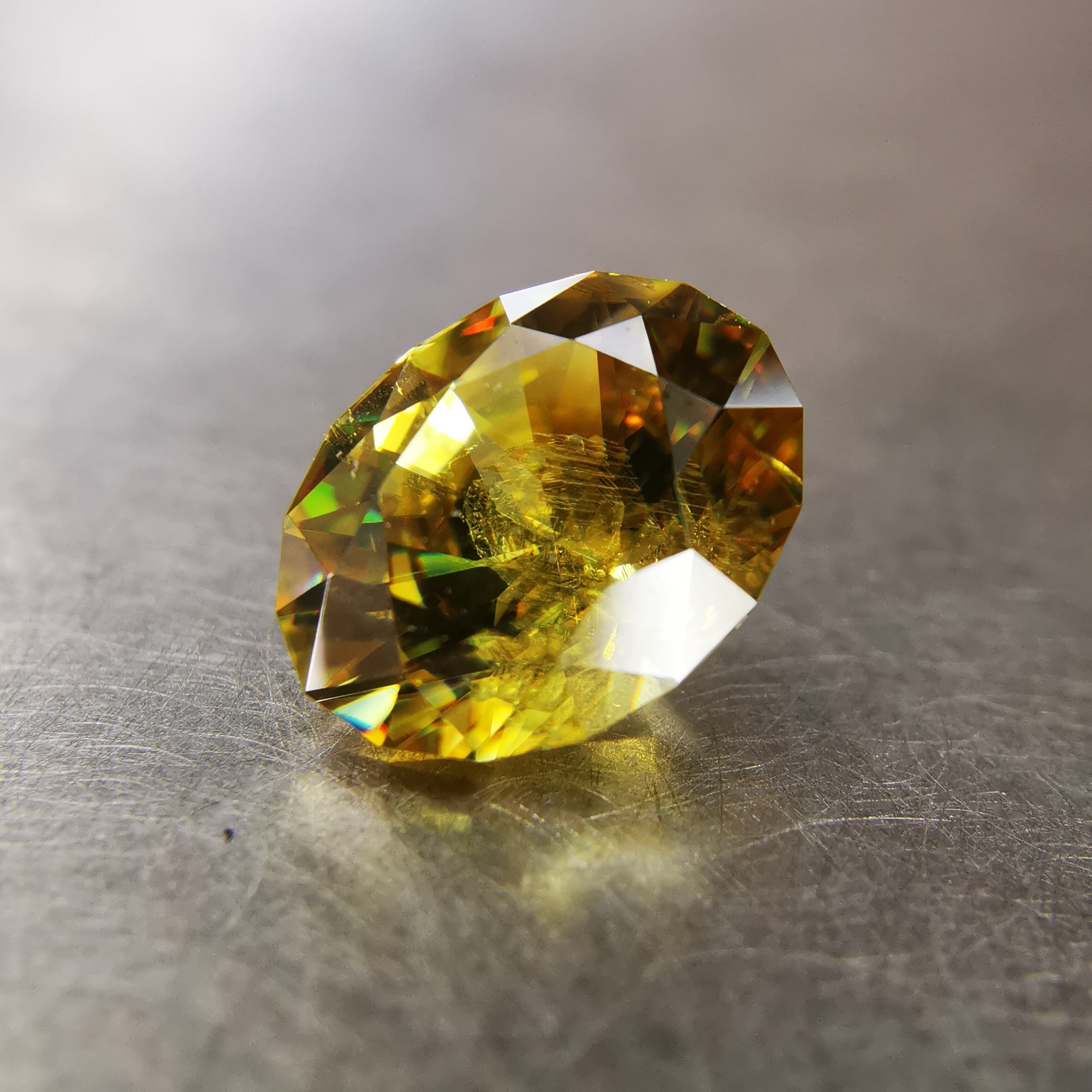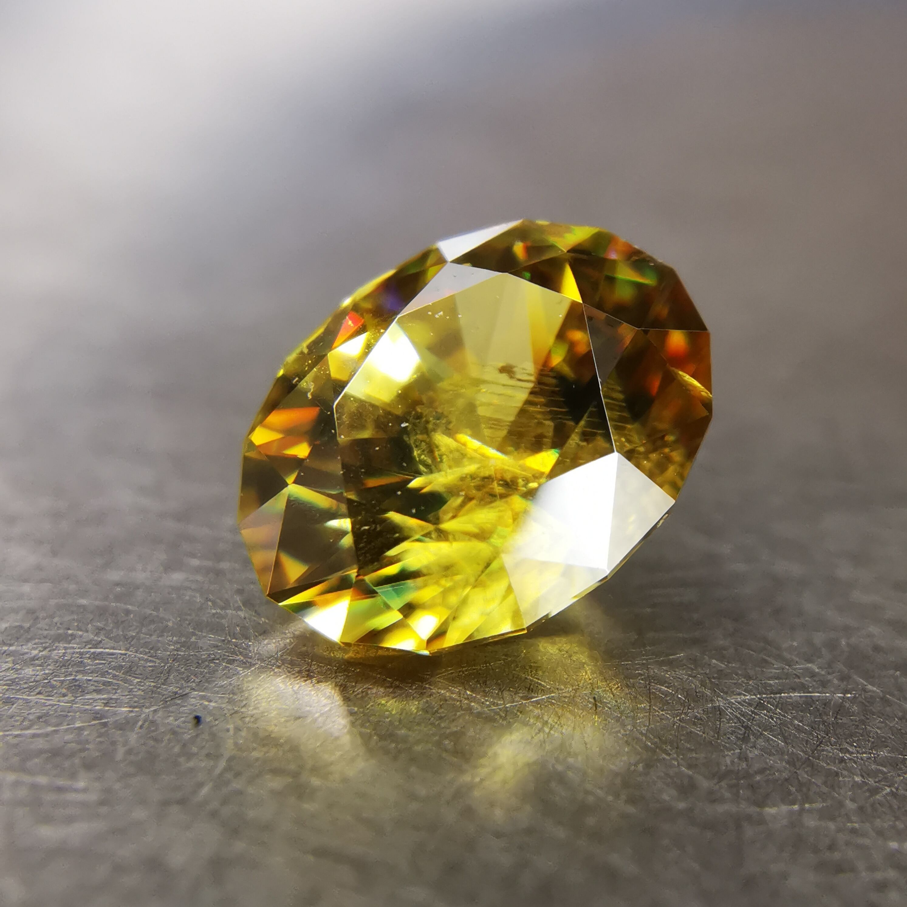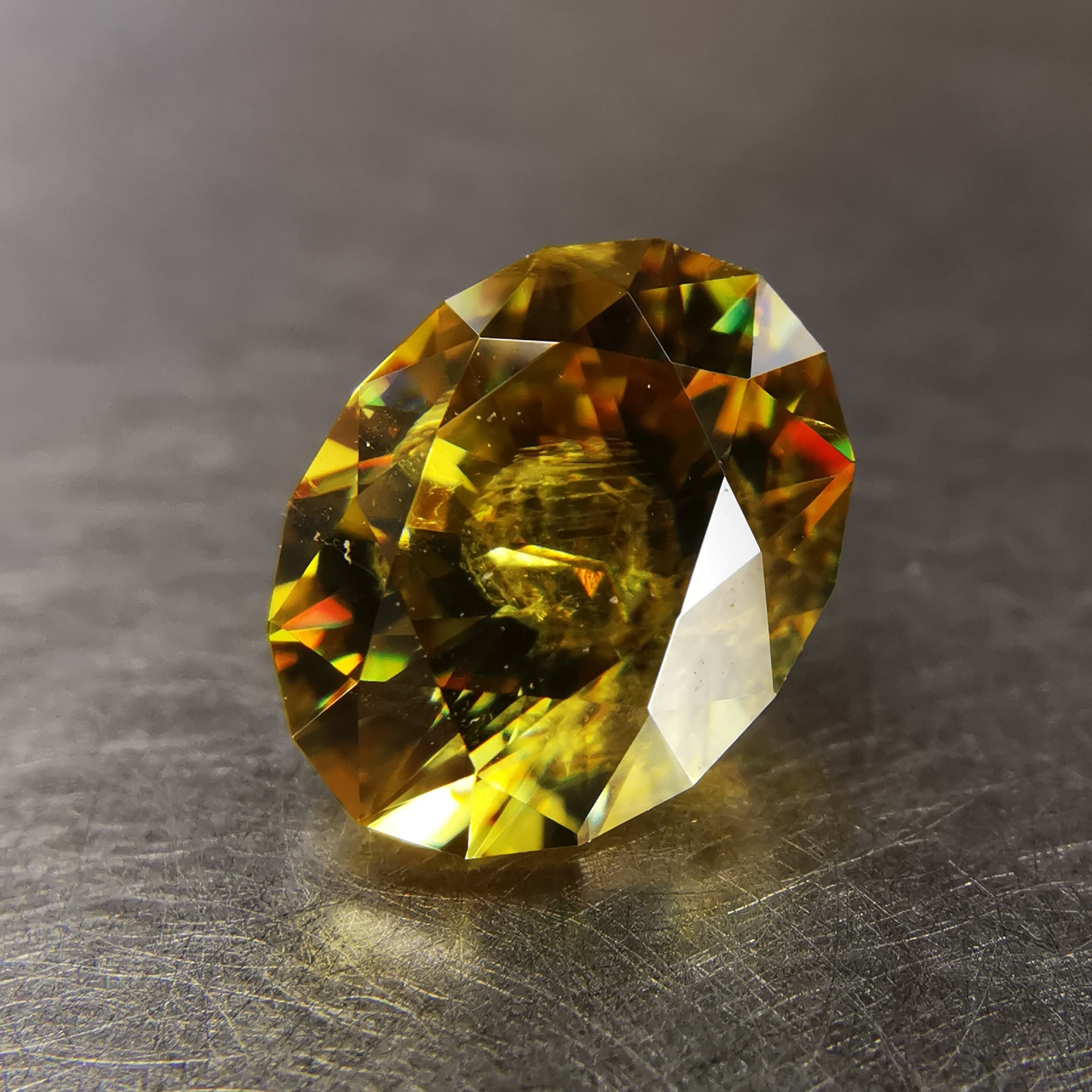 中心にあるもやもやとした内包物を取り巻くように、虹色のファイアが非常に強く輝きます。