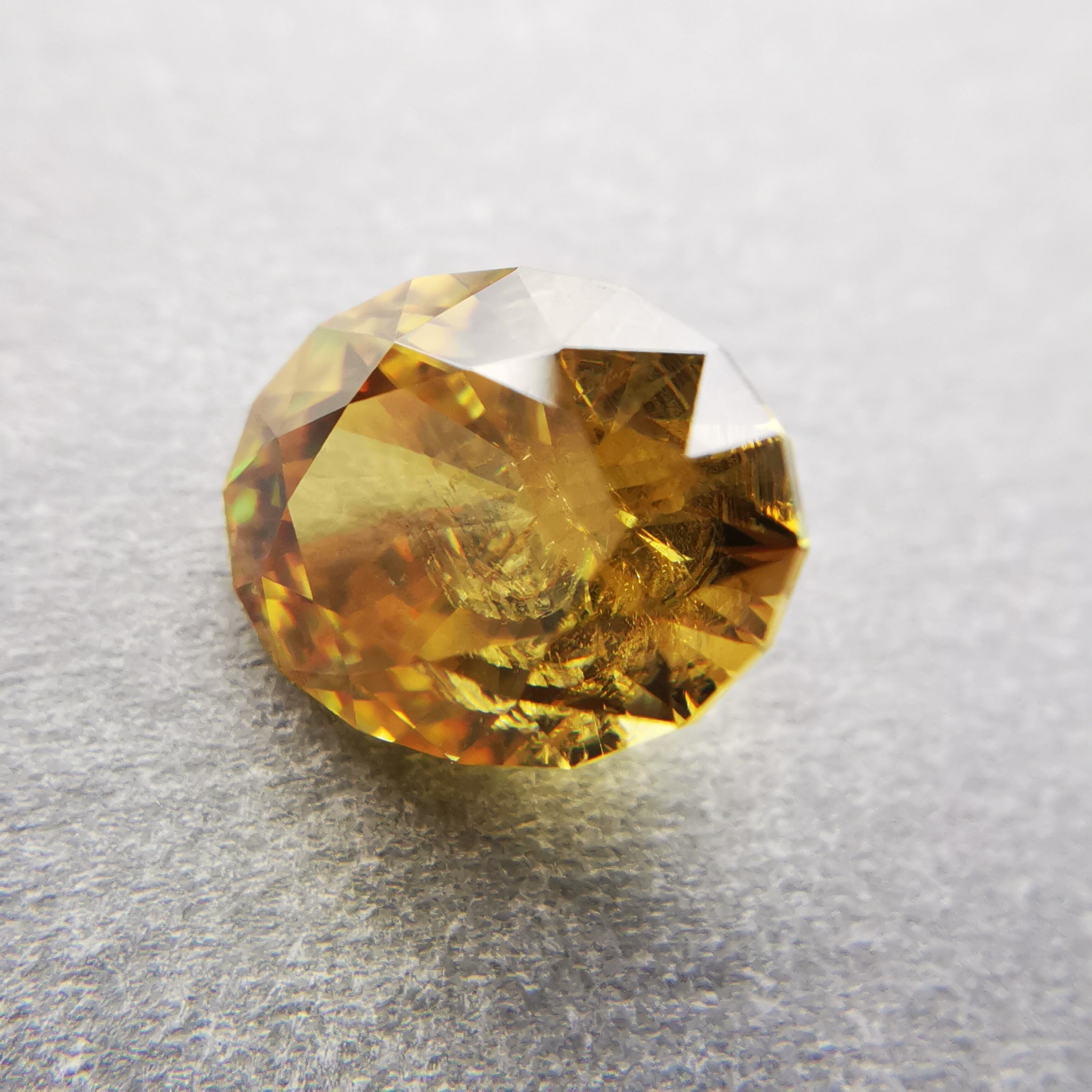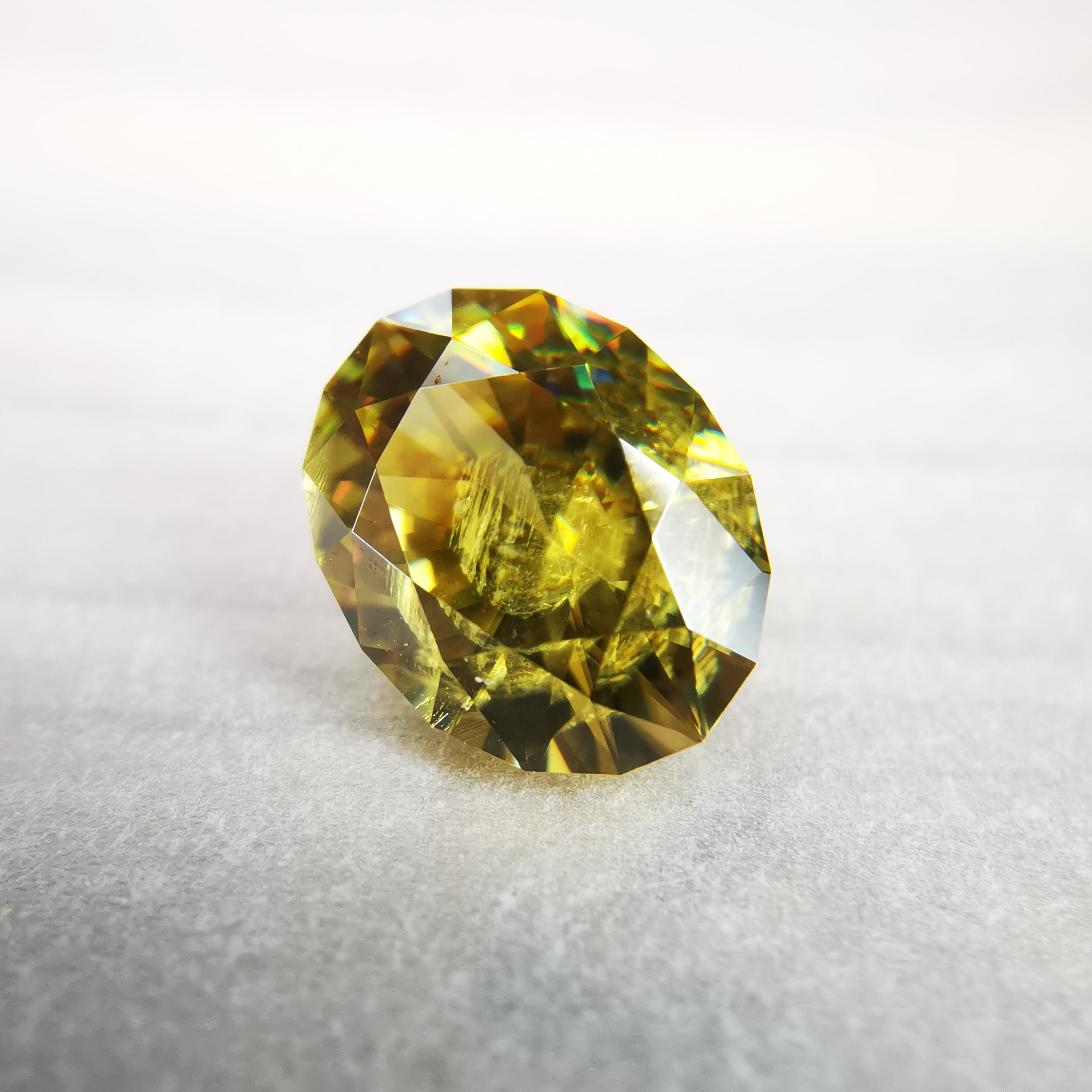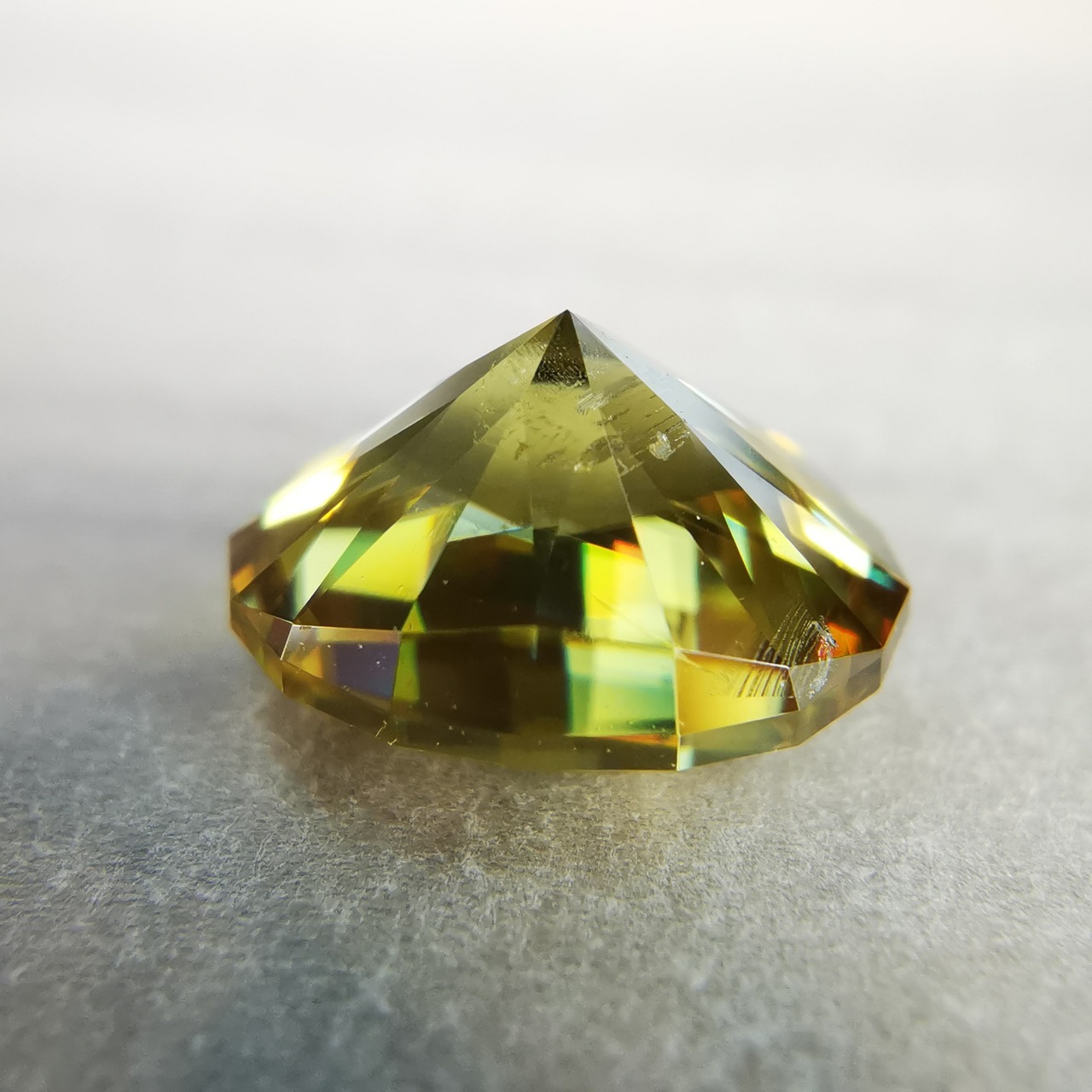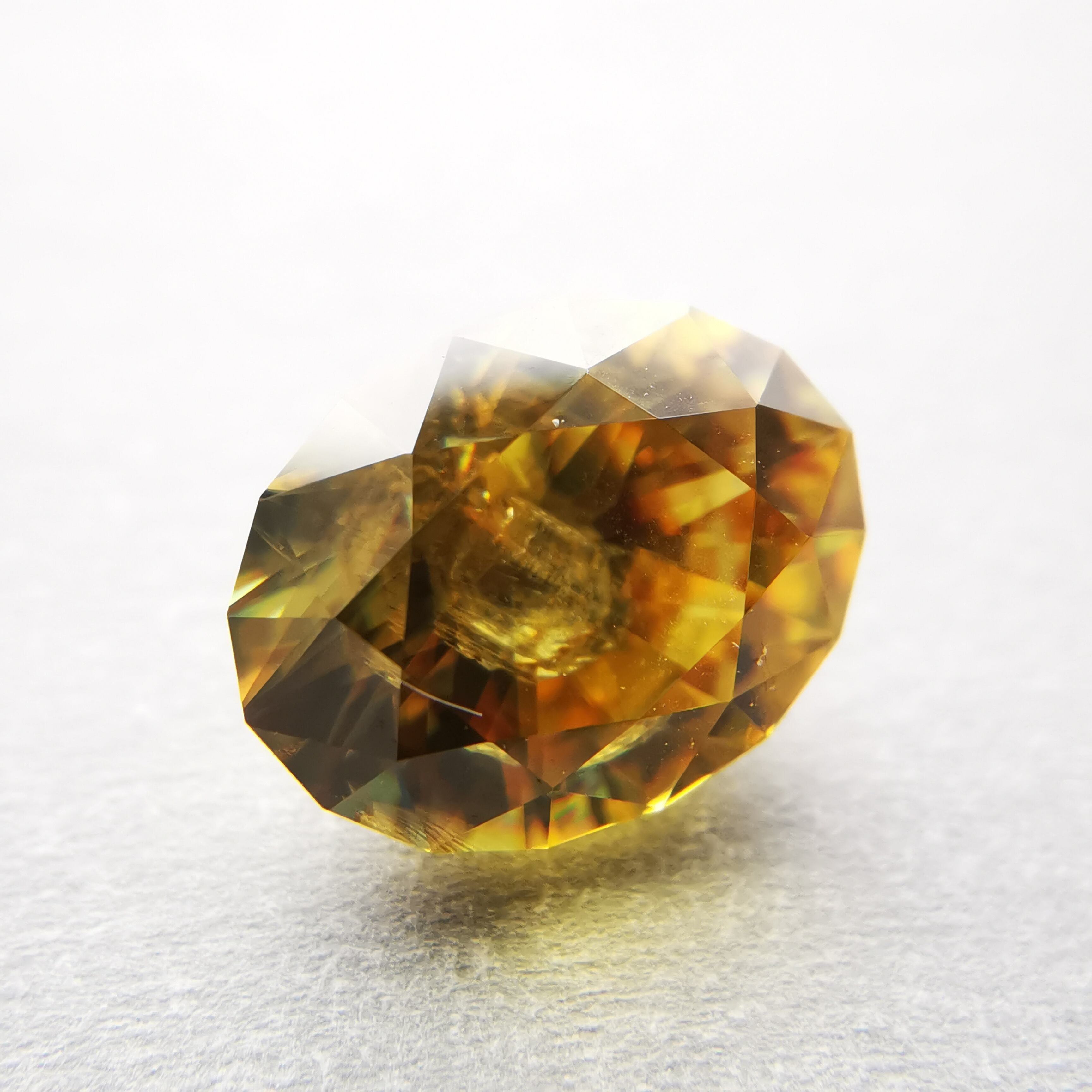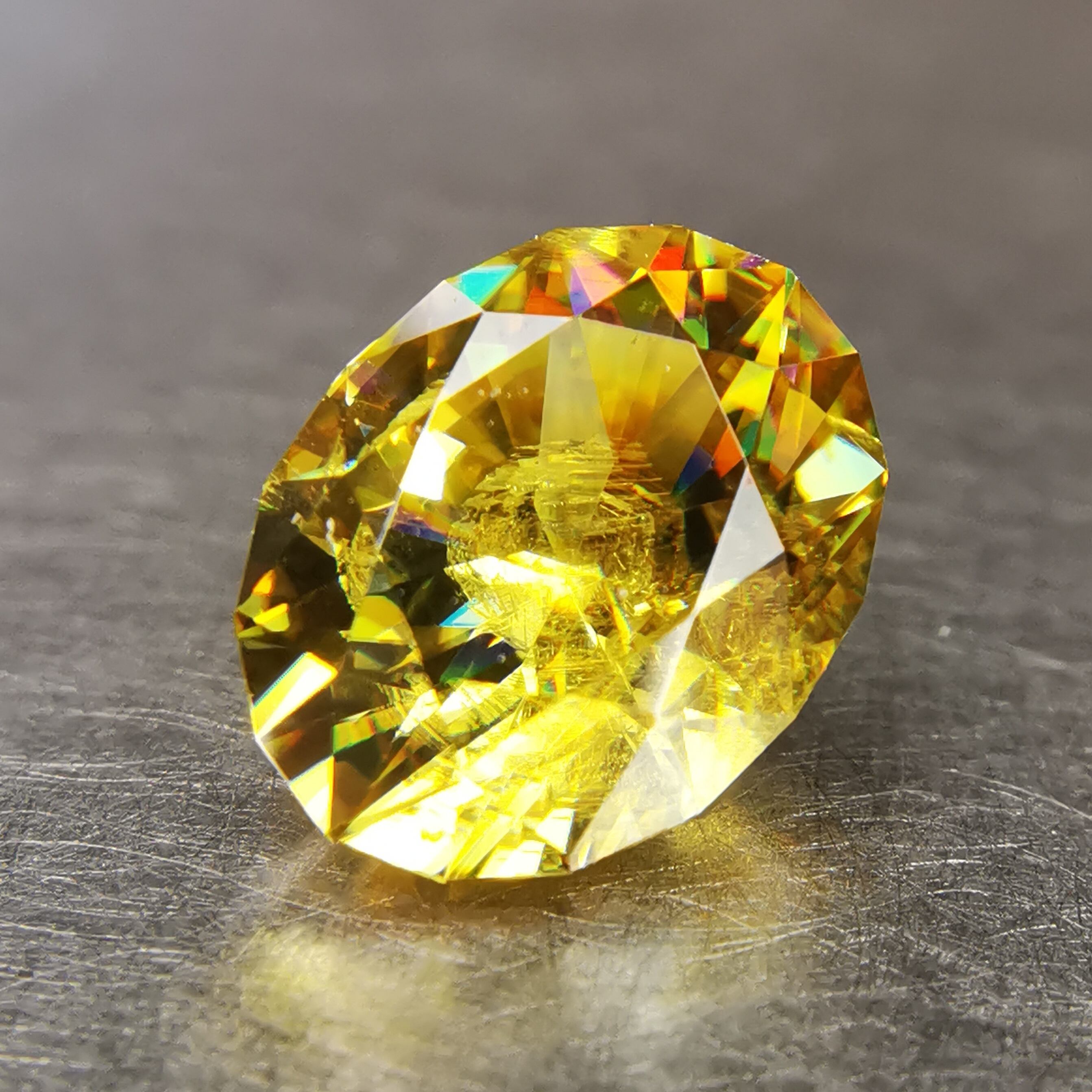中心にあるもやもやとした内包物を取り巻くように、虹色のファイアが非常に強く輝きます。