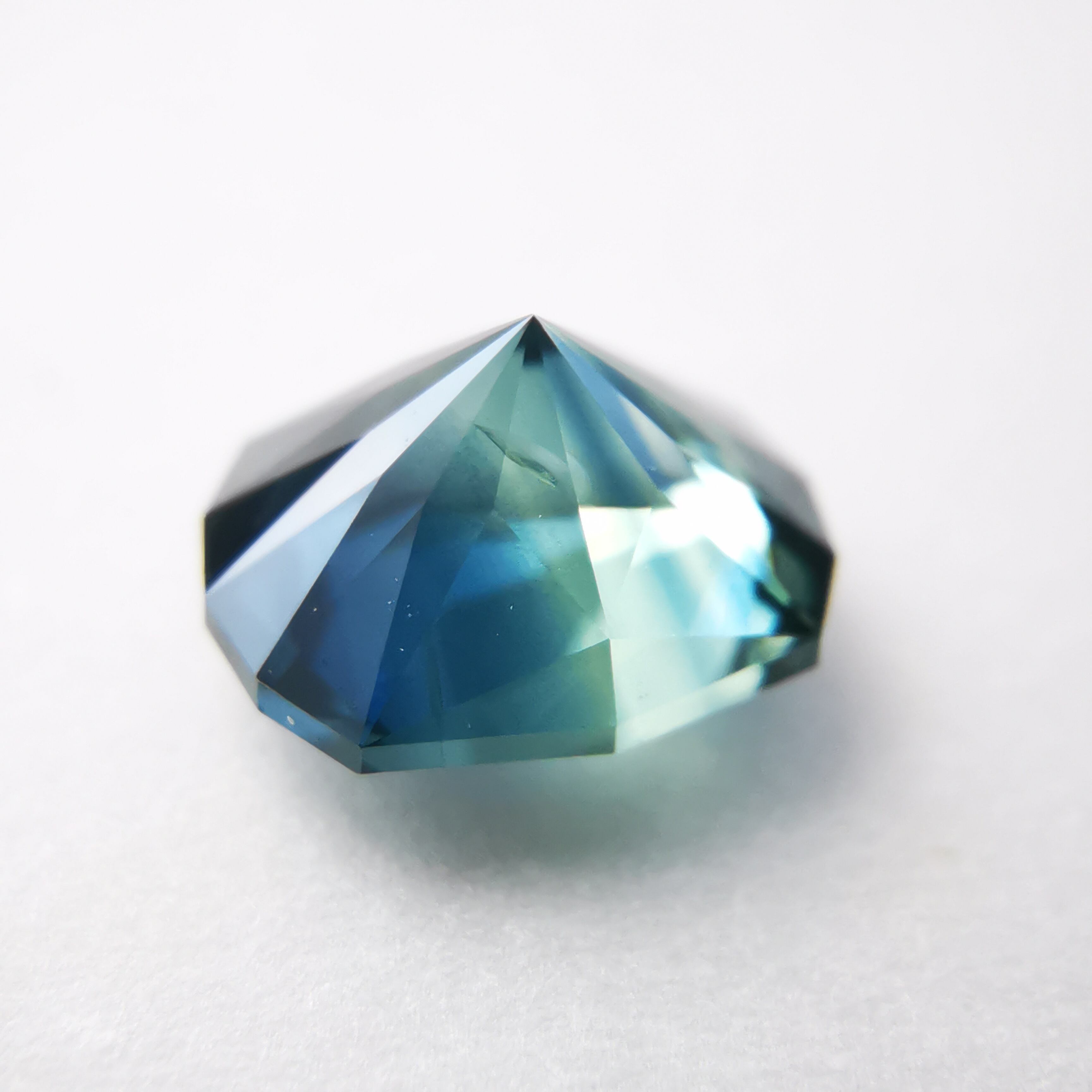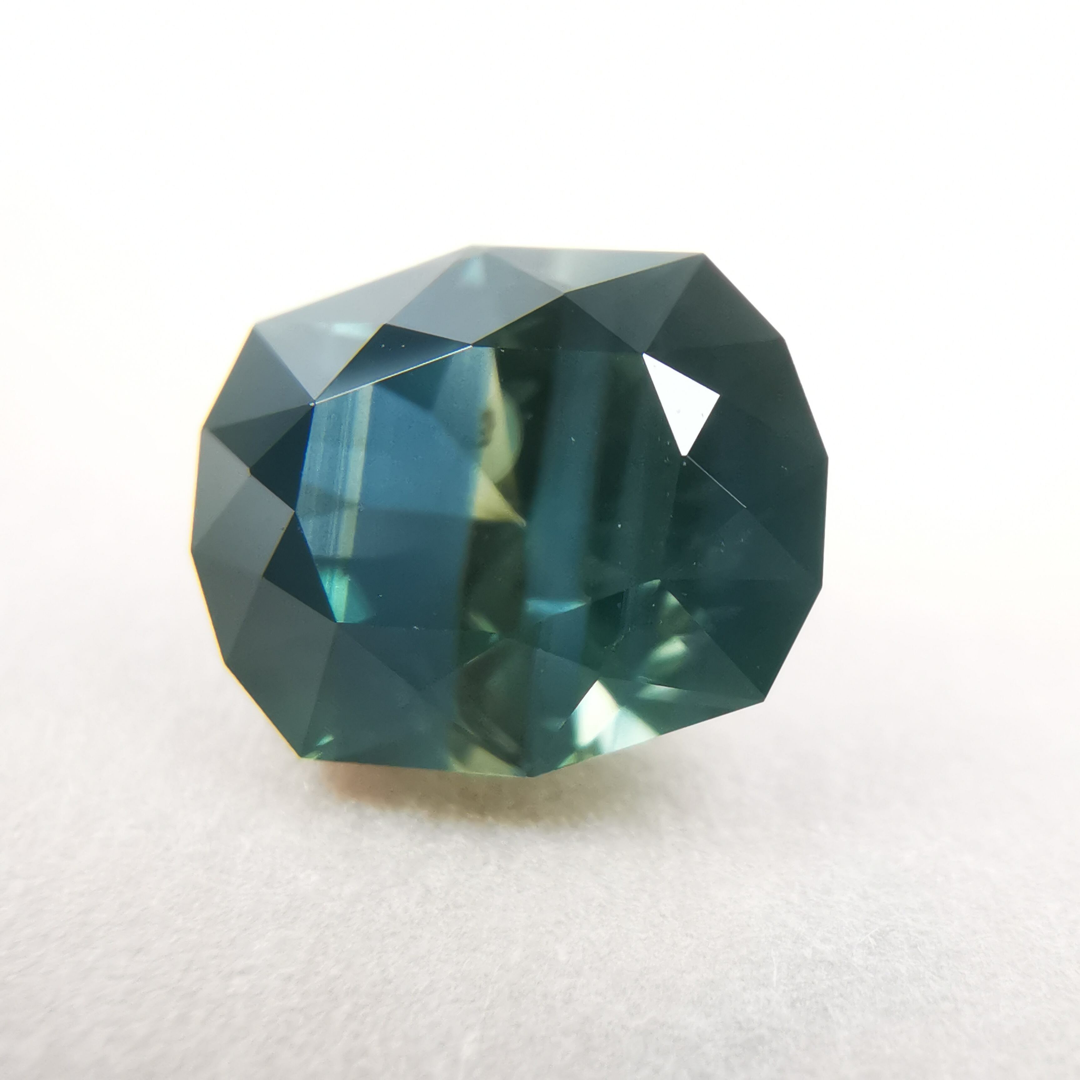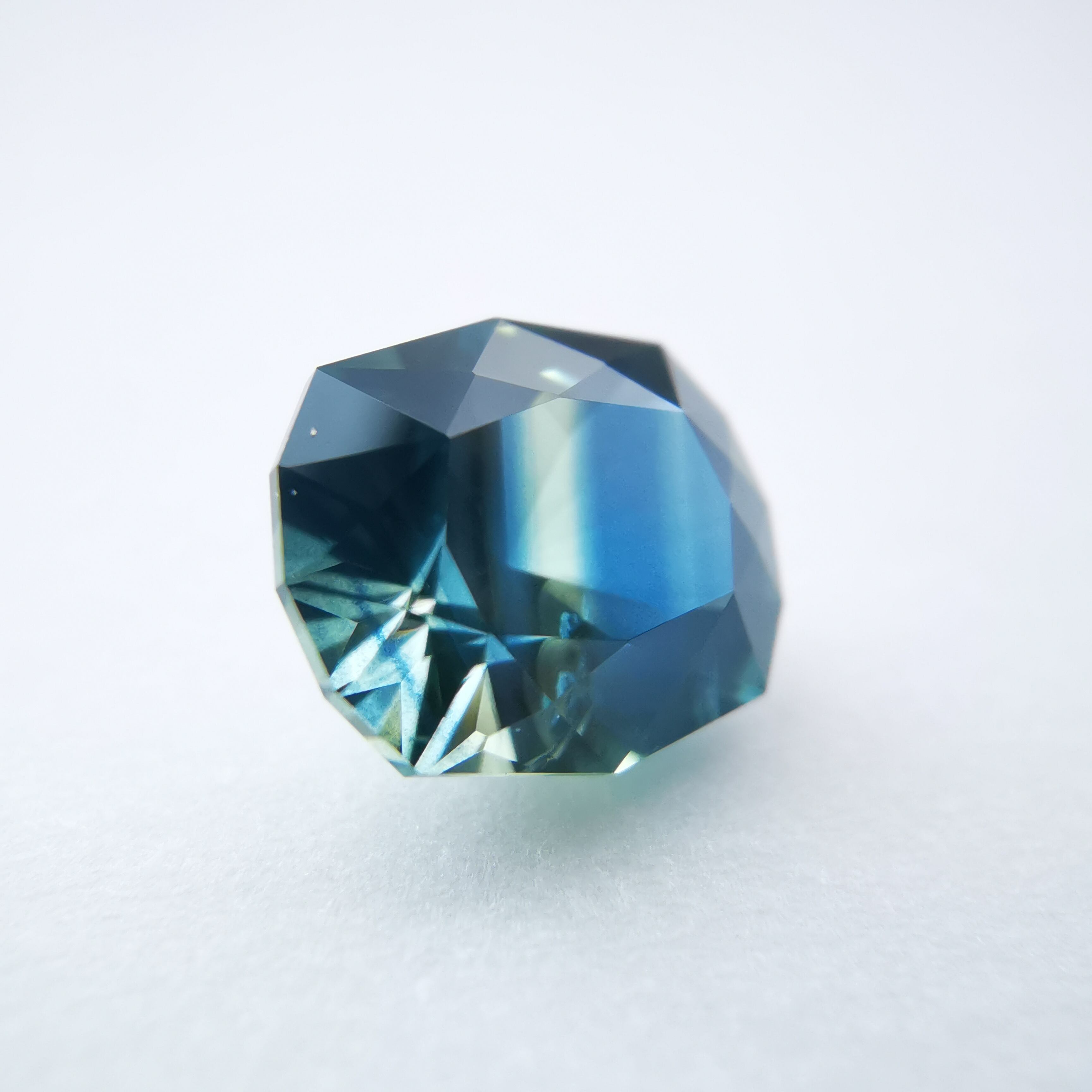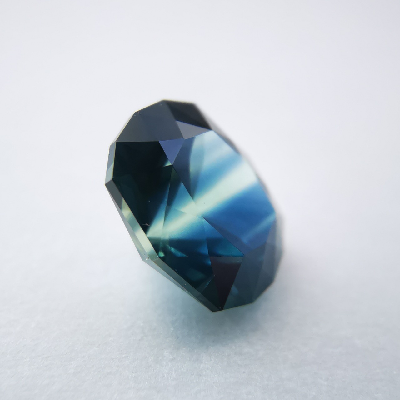 ブルーグリーンのカラーバンドが、幾筋か斜めに走るサファイアです。