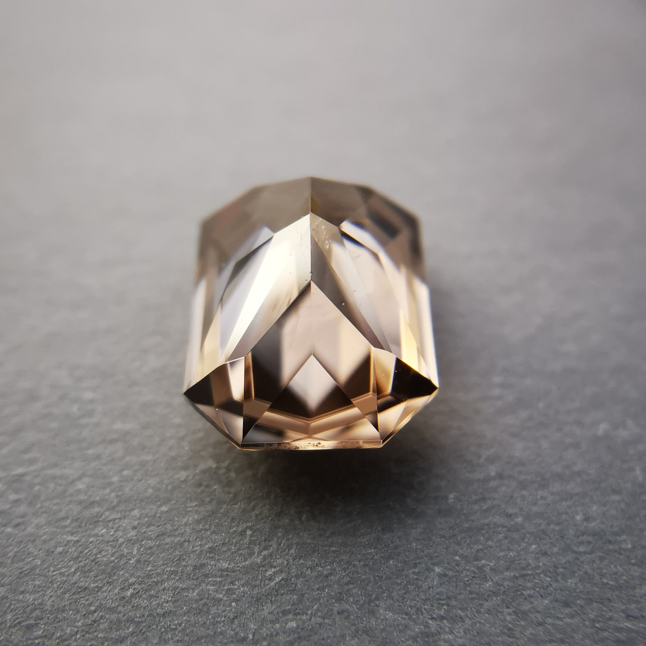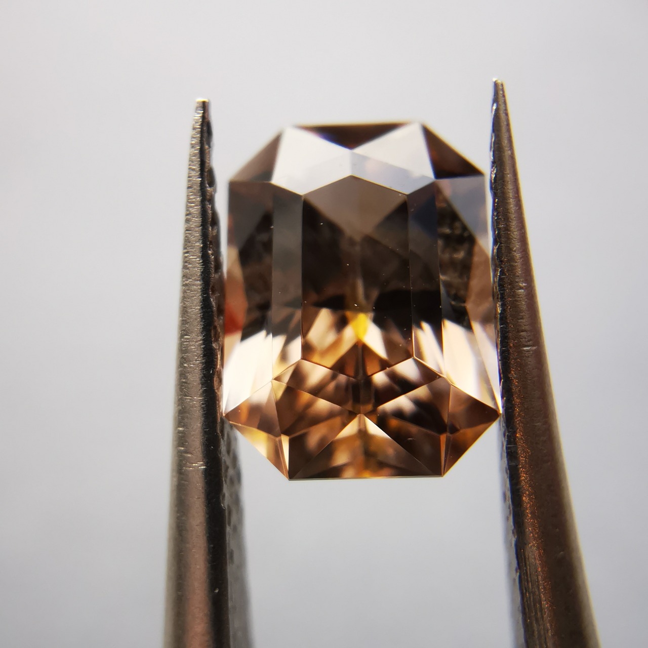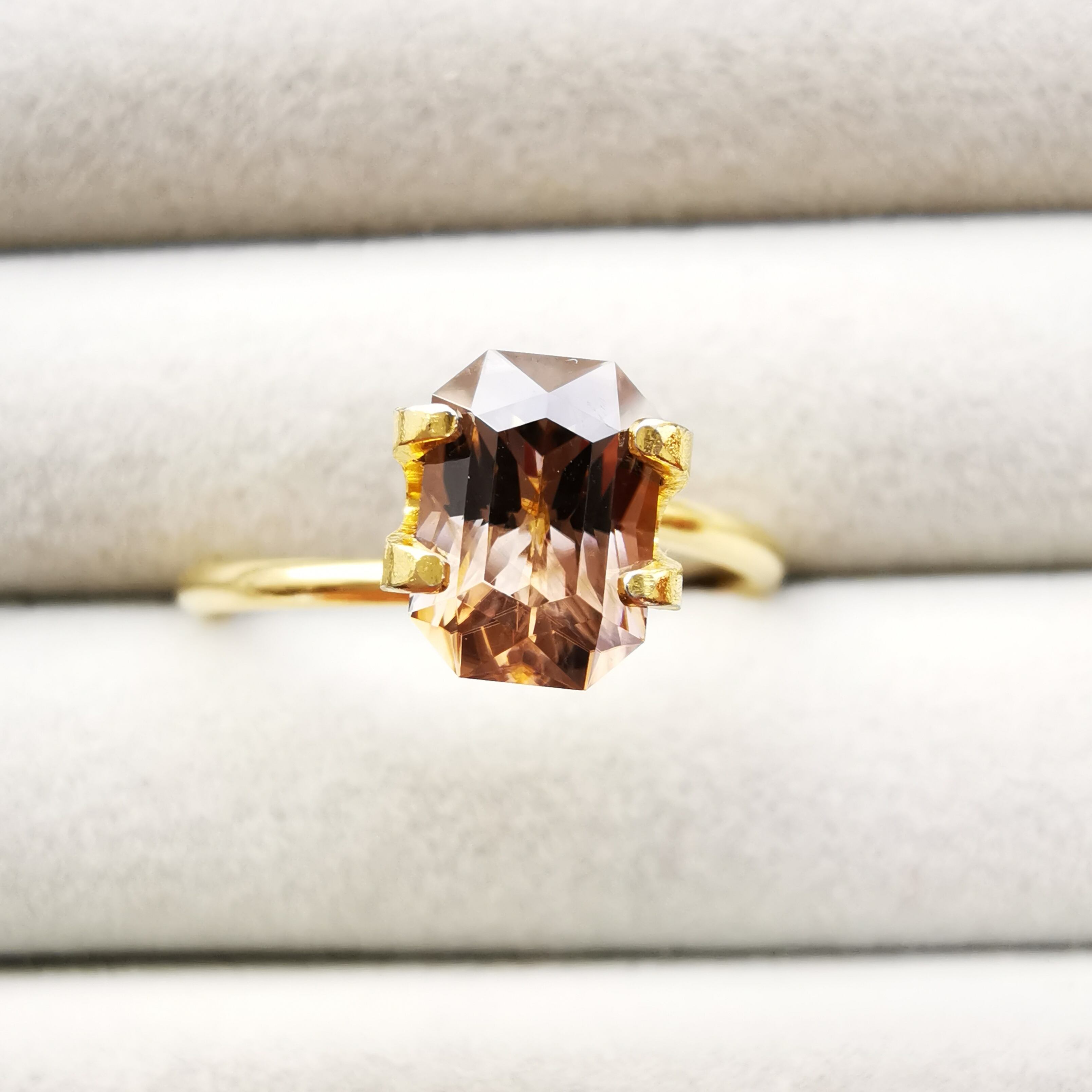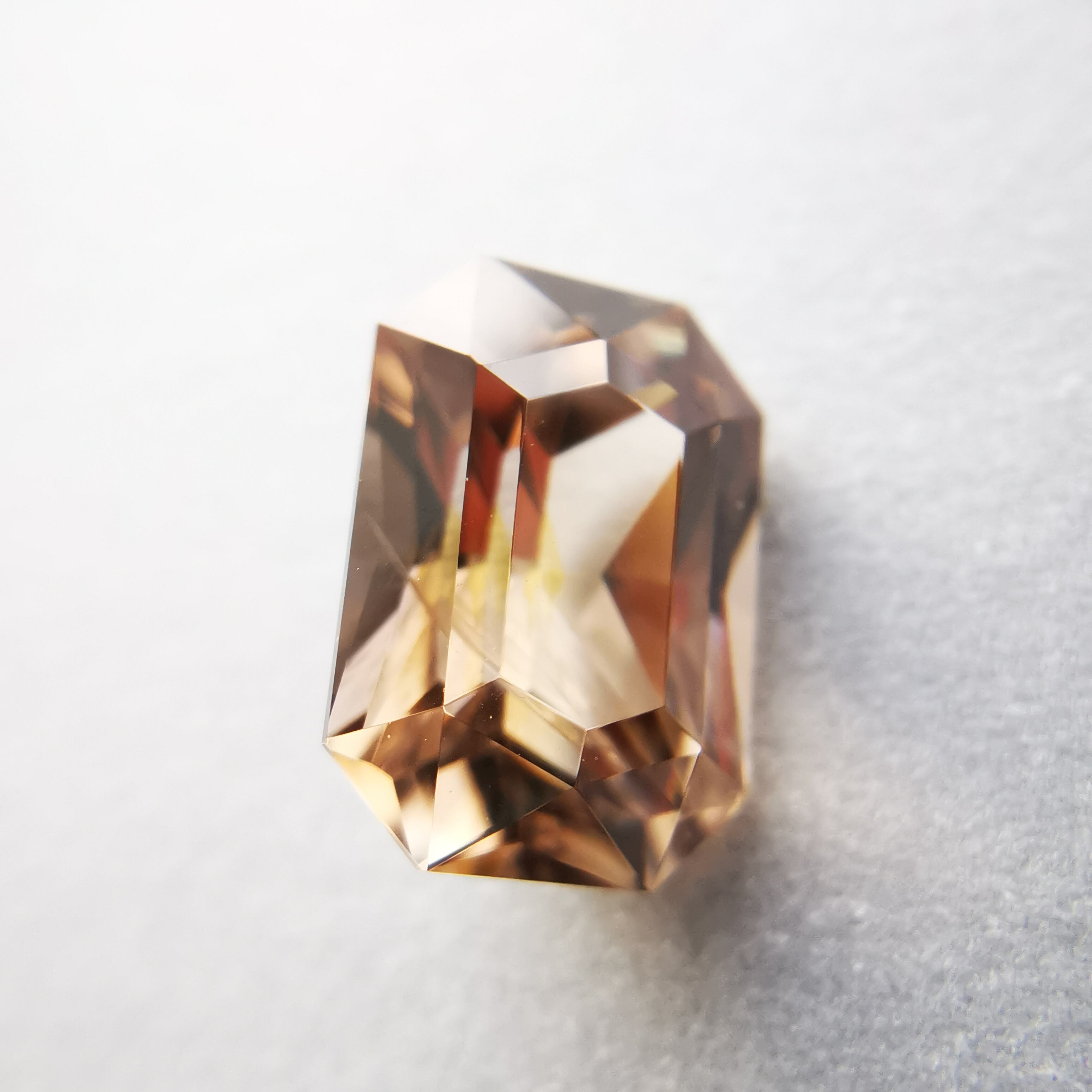 キュレットにわずかに入ったイエローの内包物が影響して、フェイスからもイエローを感じる瞬間があり、複雑な色を見せます。