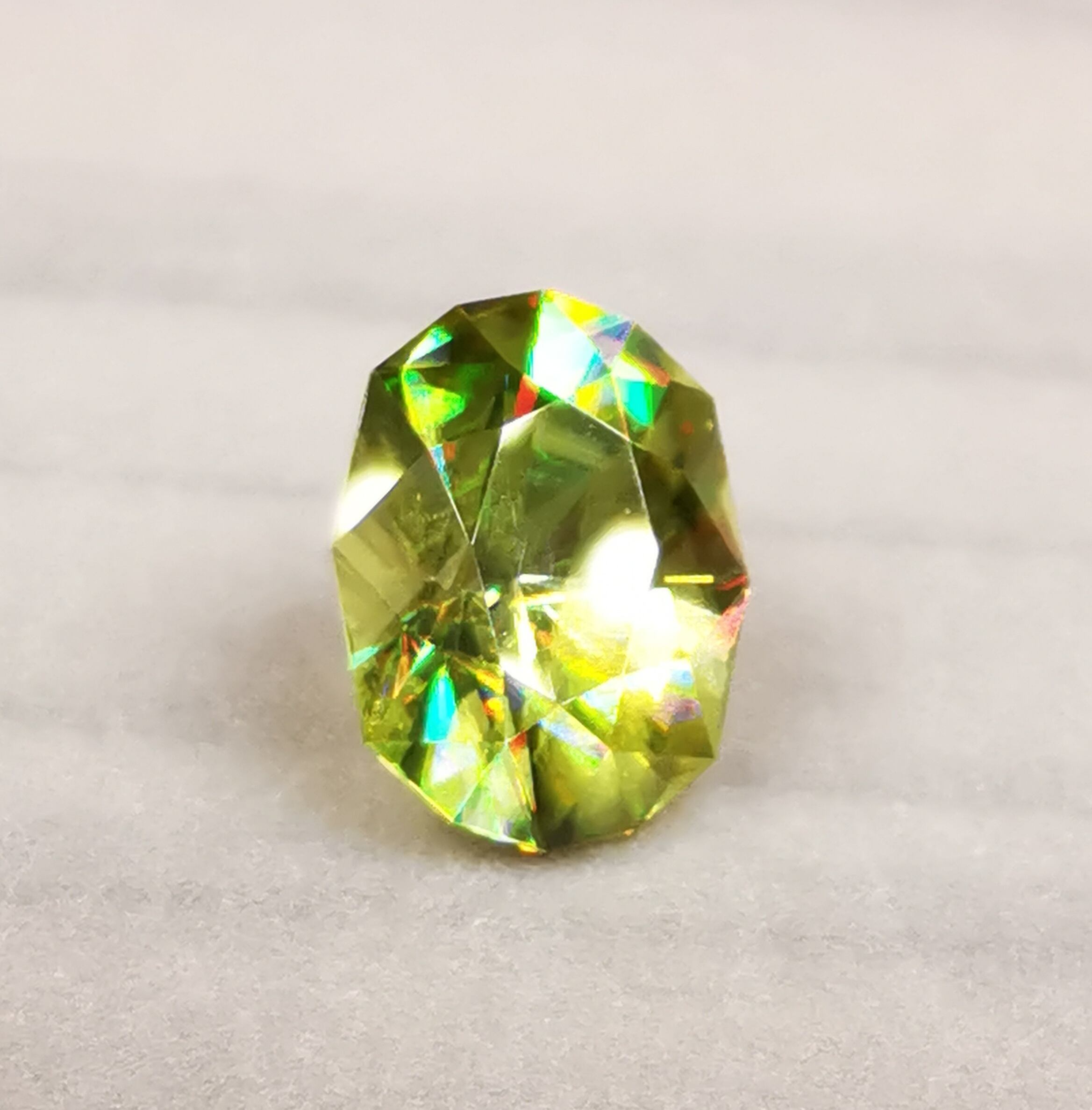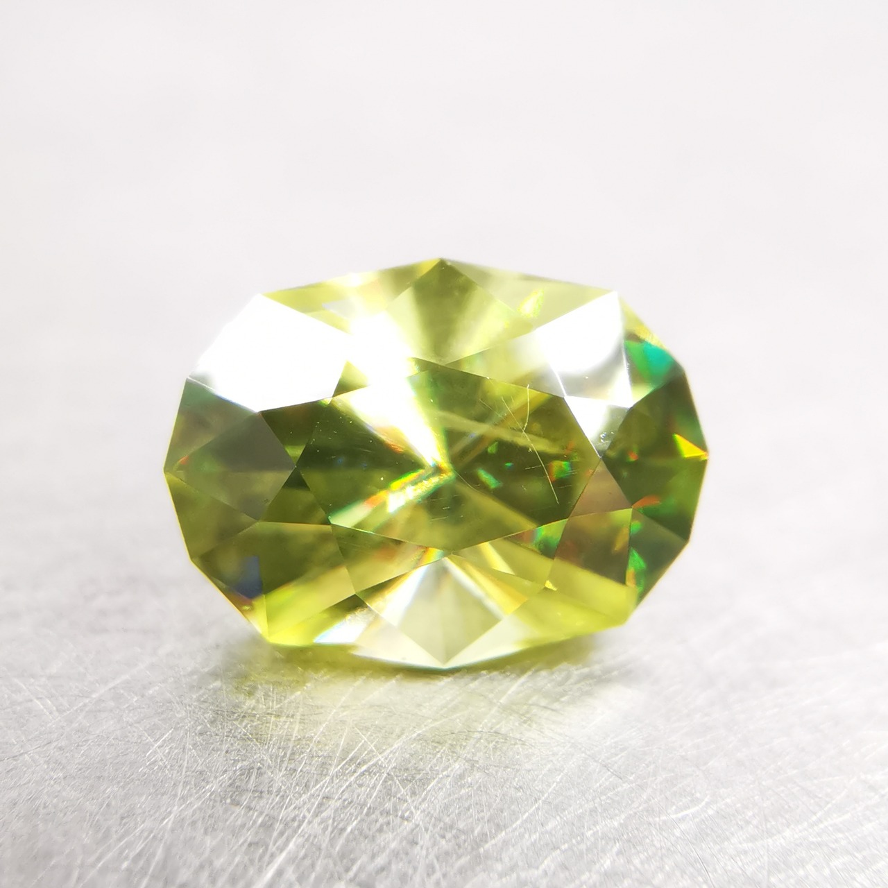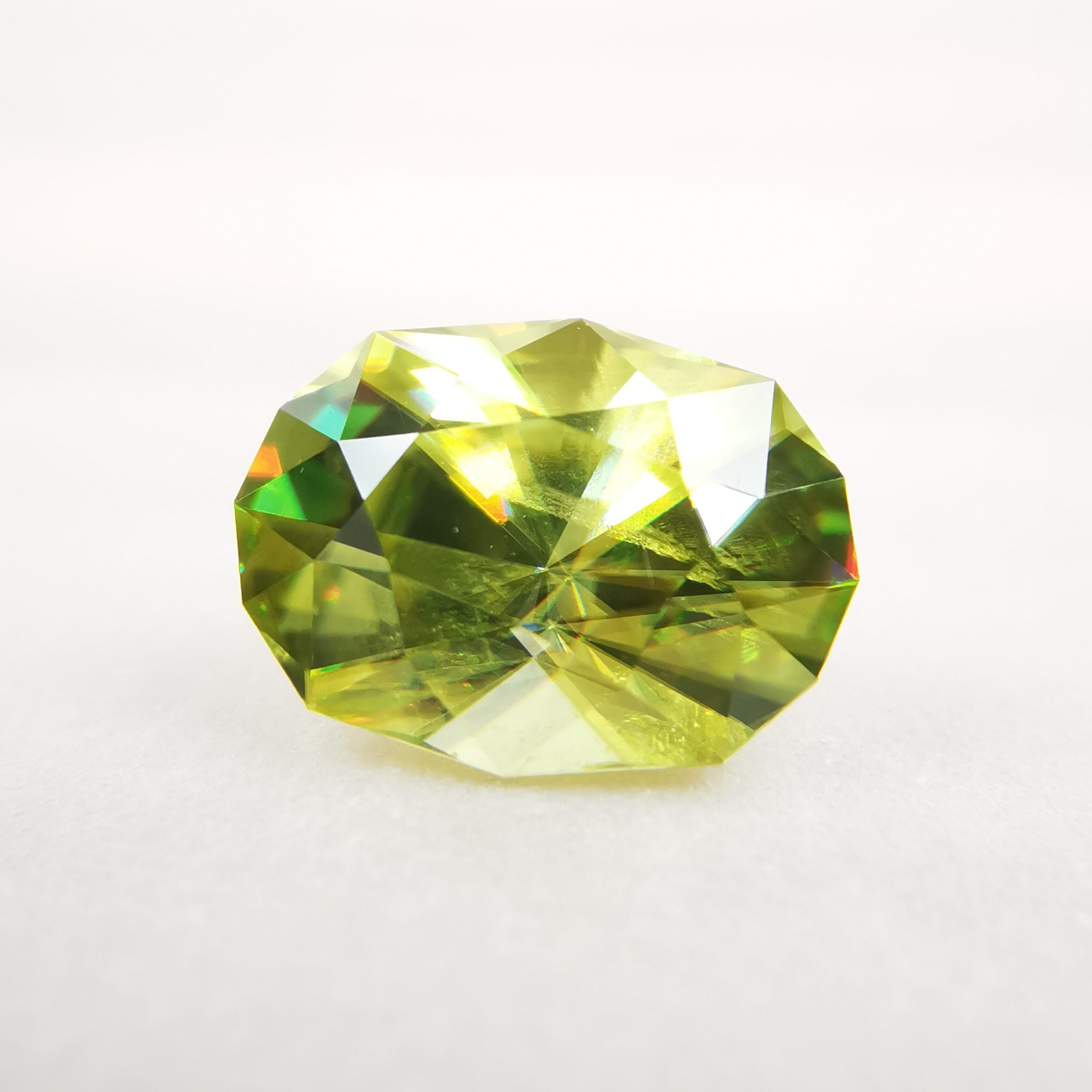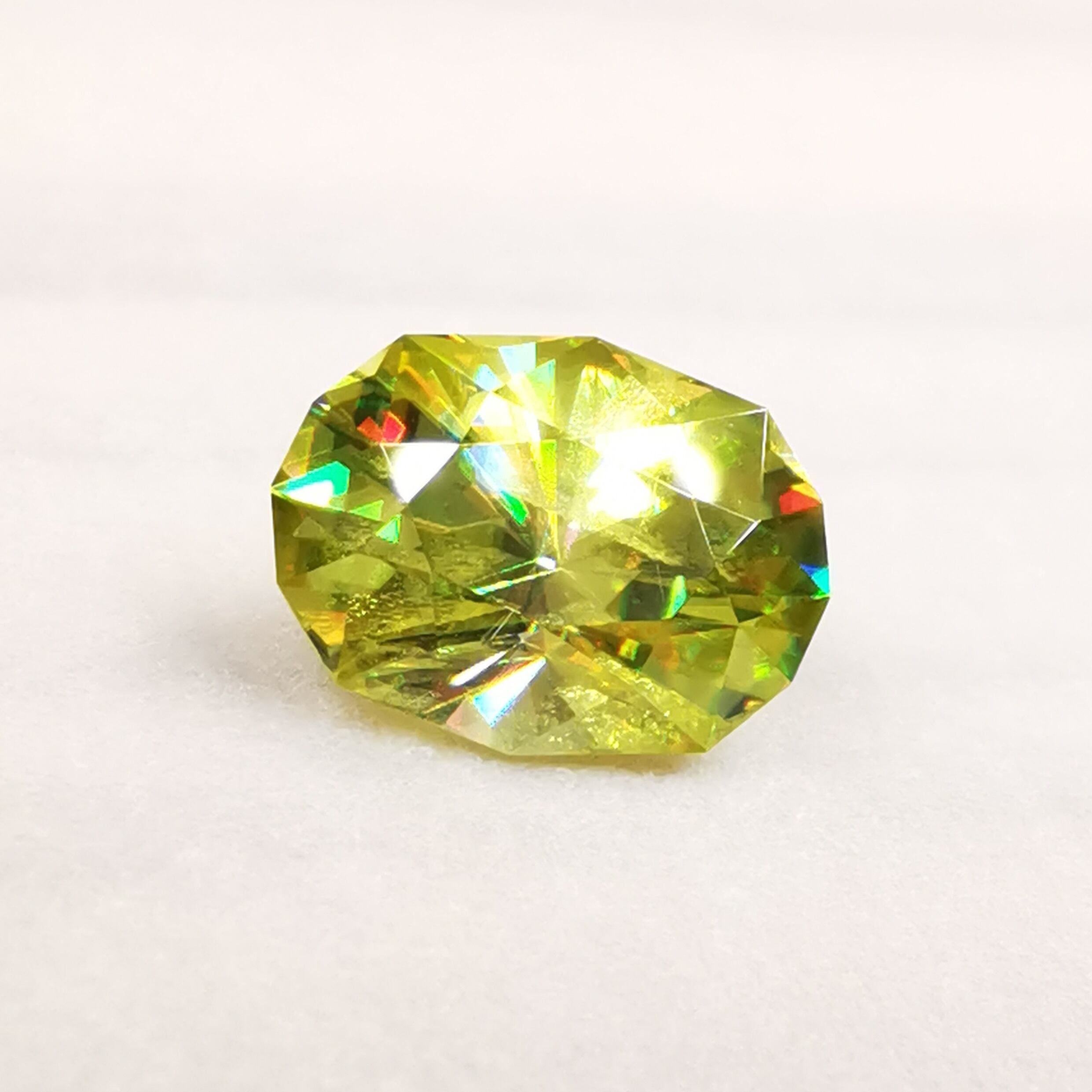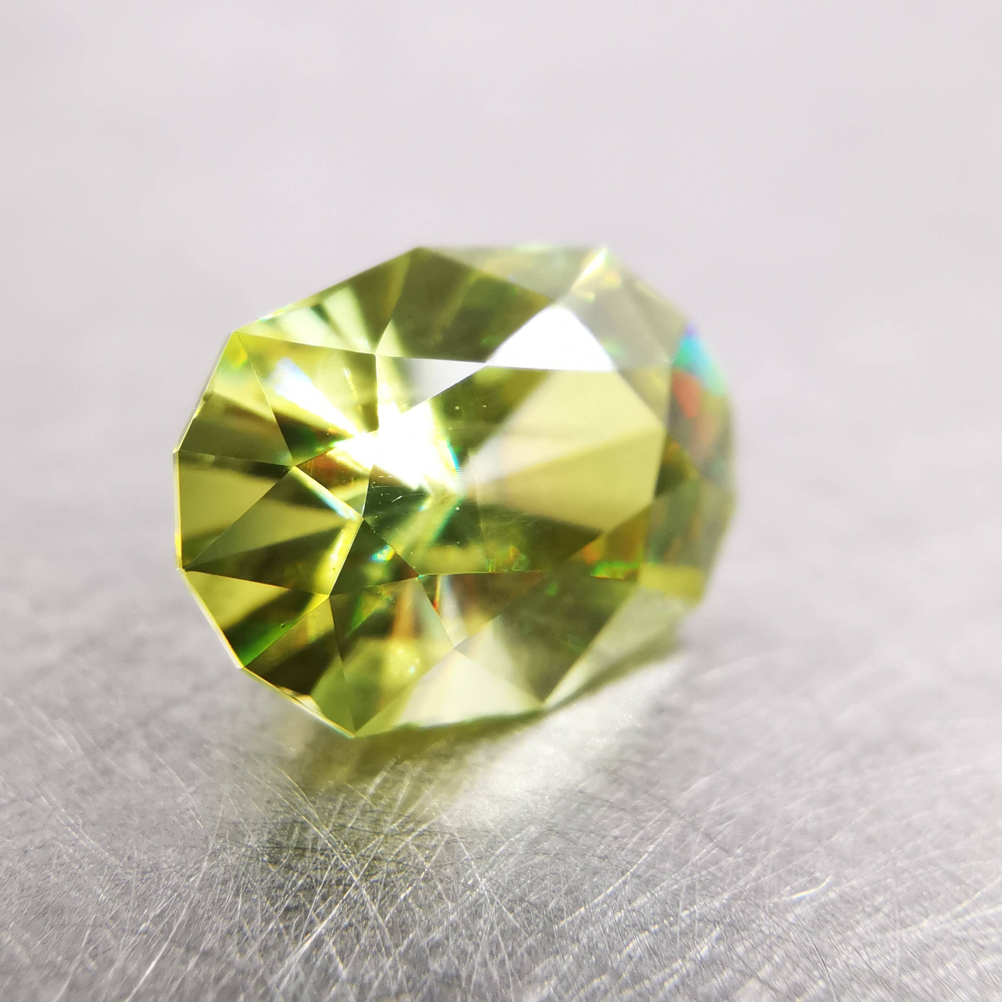 イエローグリーンの石から大きなファイアがビカビカと輝きます。