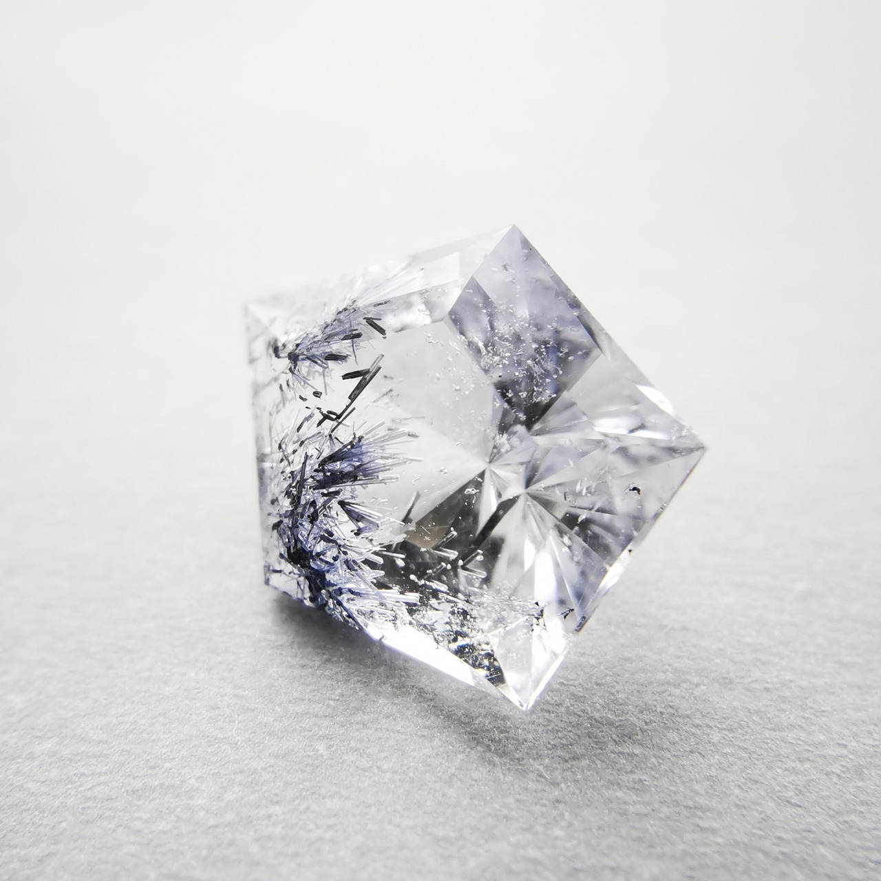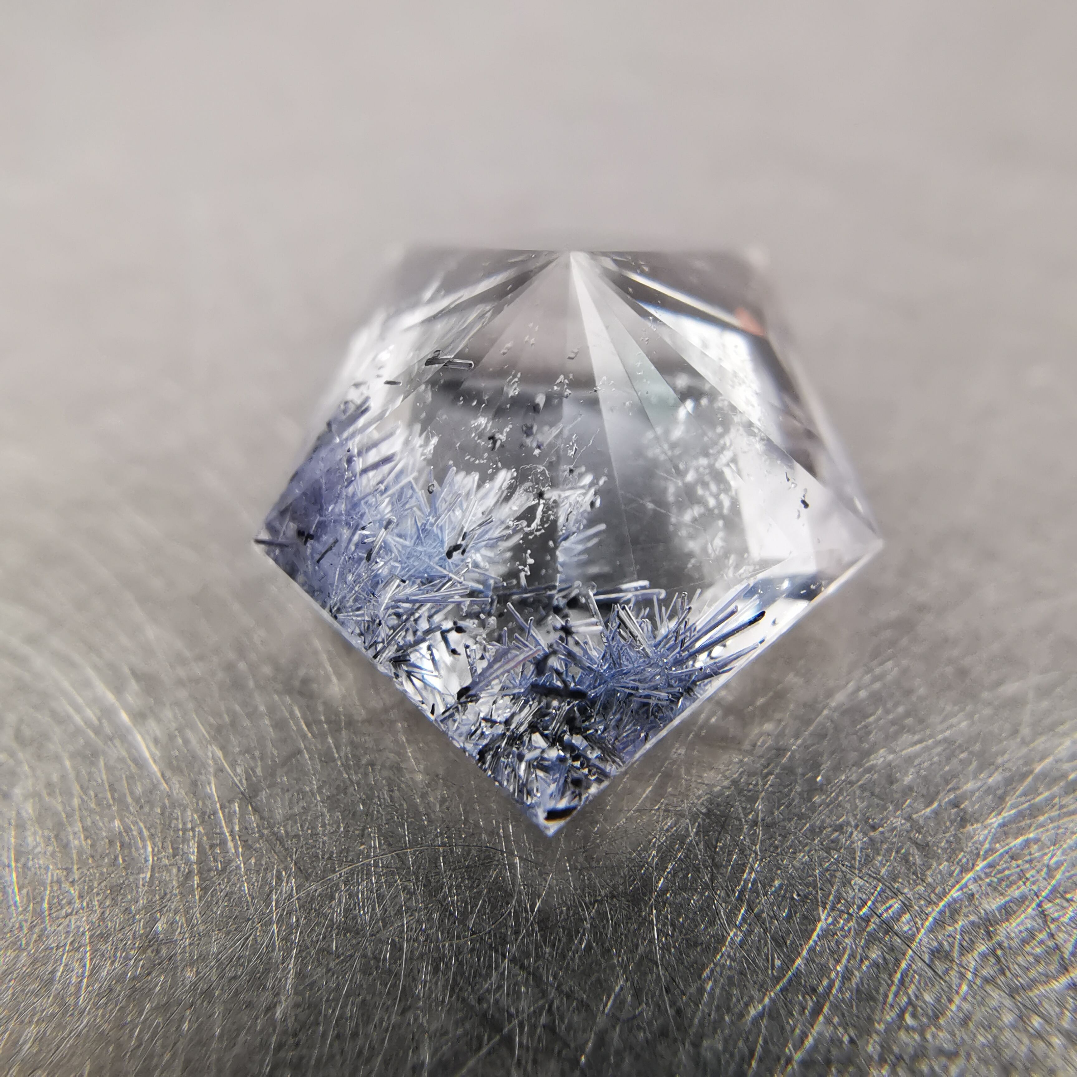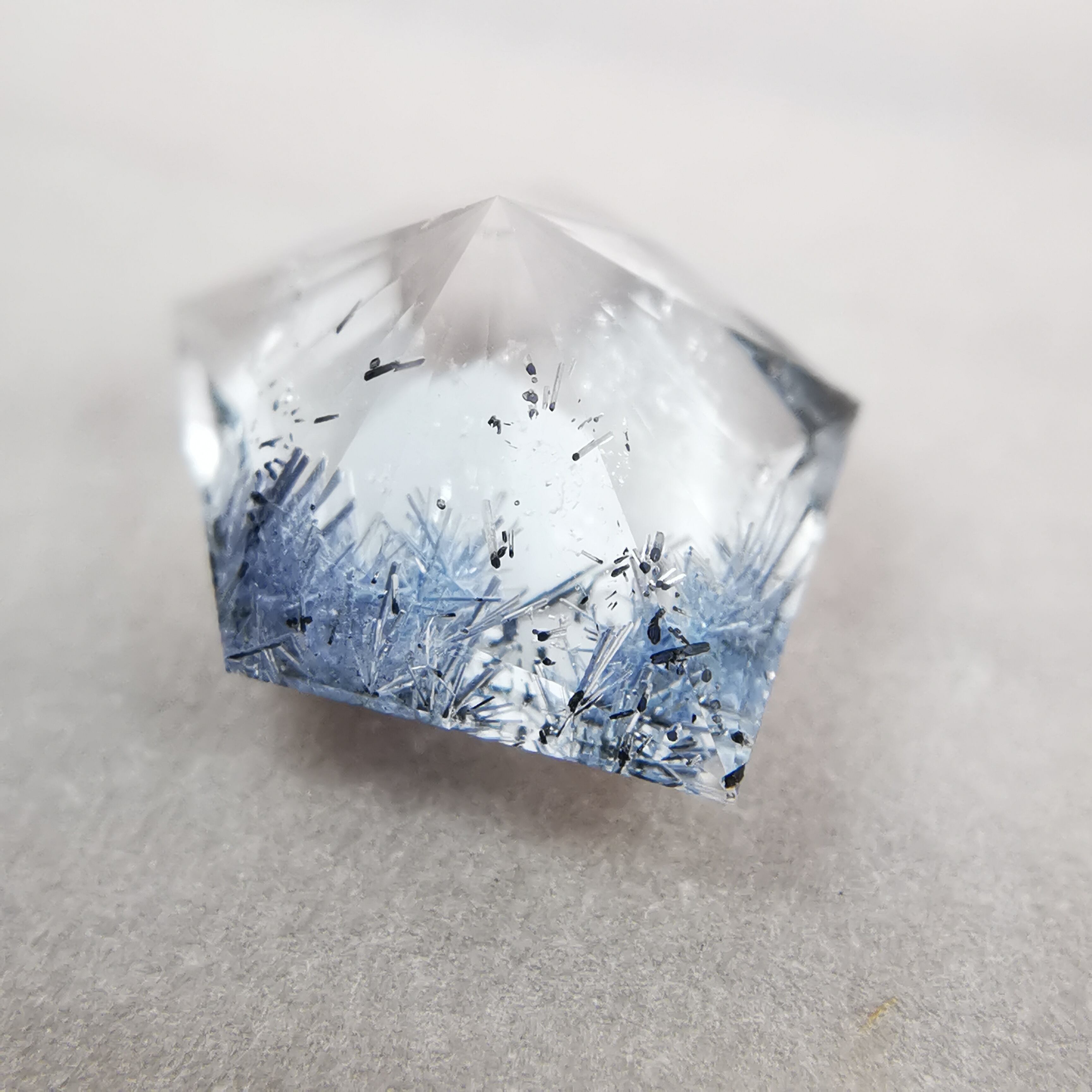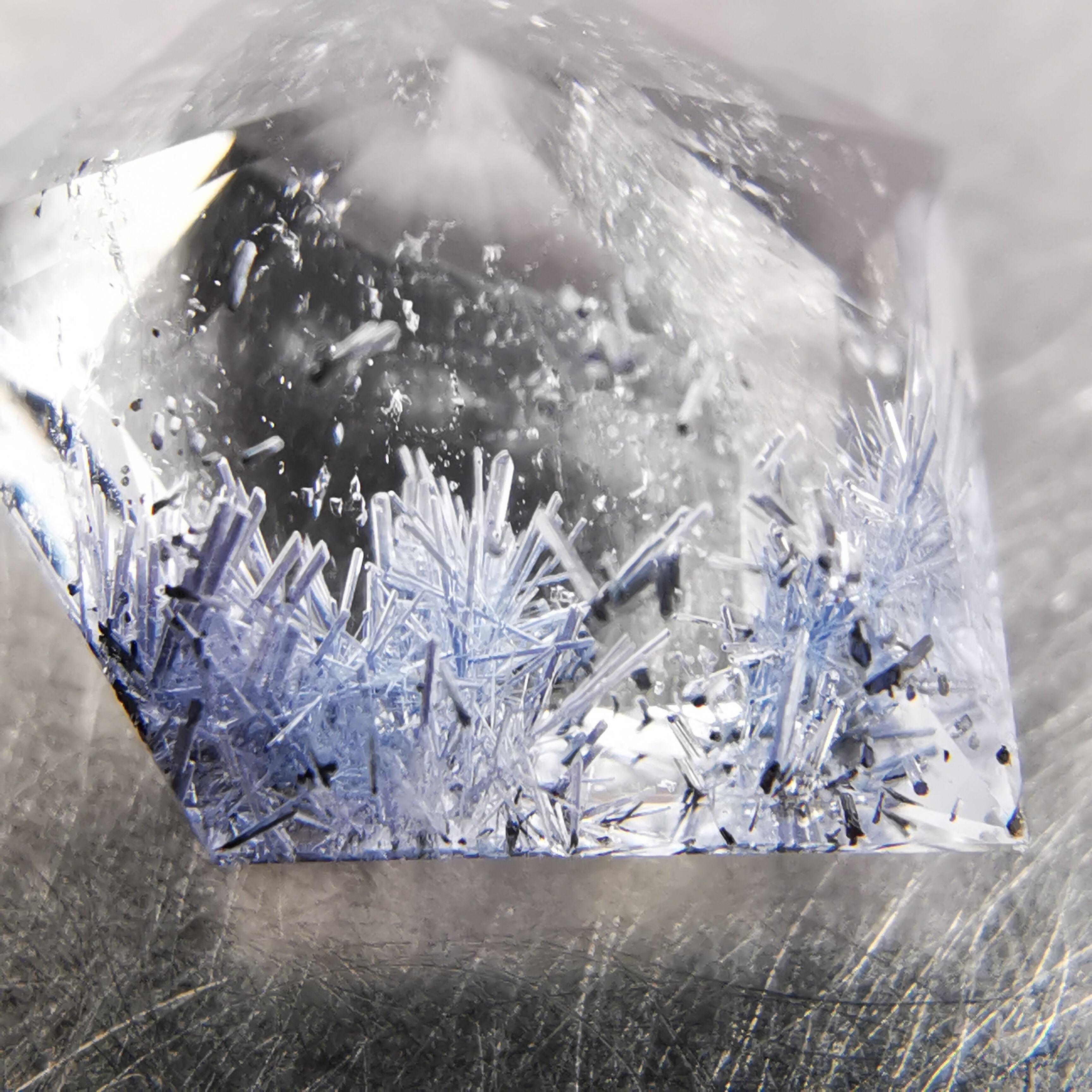 内包物でシャラシャラと優しく輝く水晶にアクセントのように入るブルー、雪景色を思わせる美しい一石となりました。