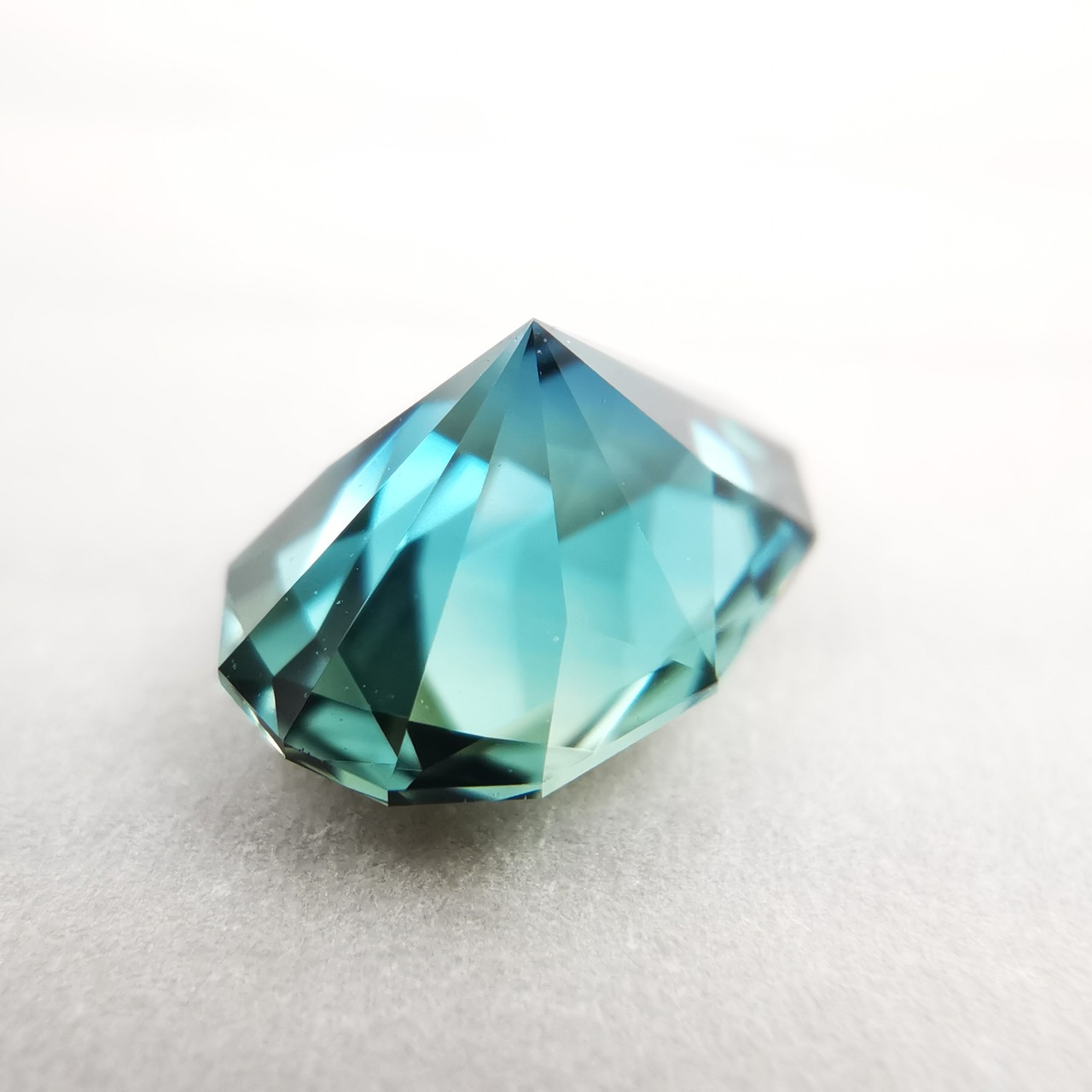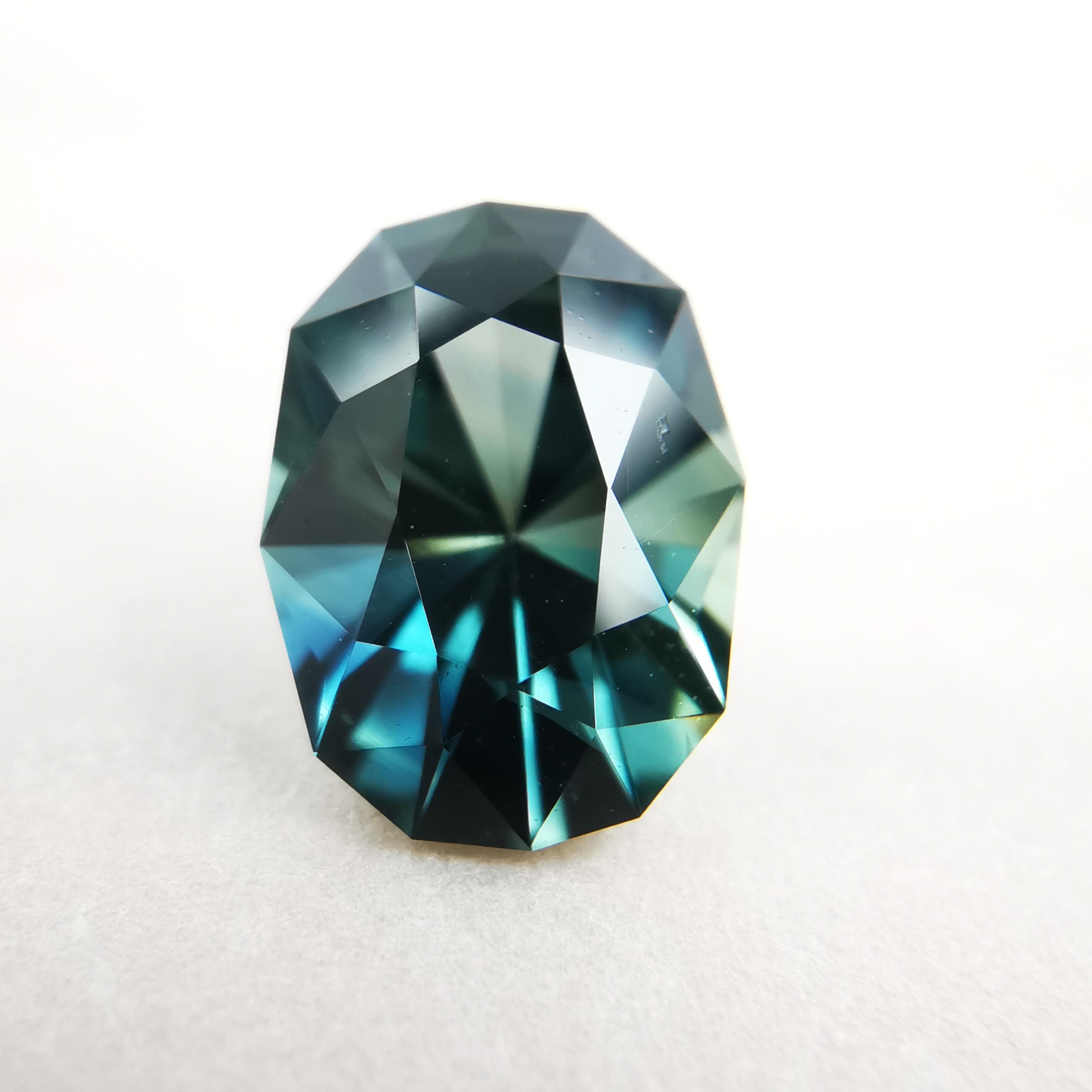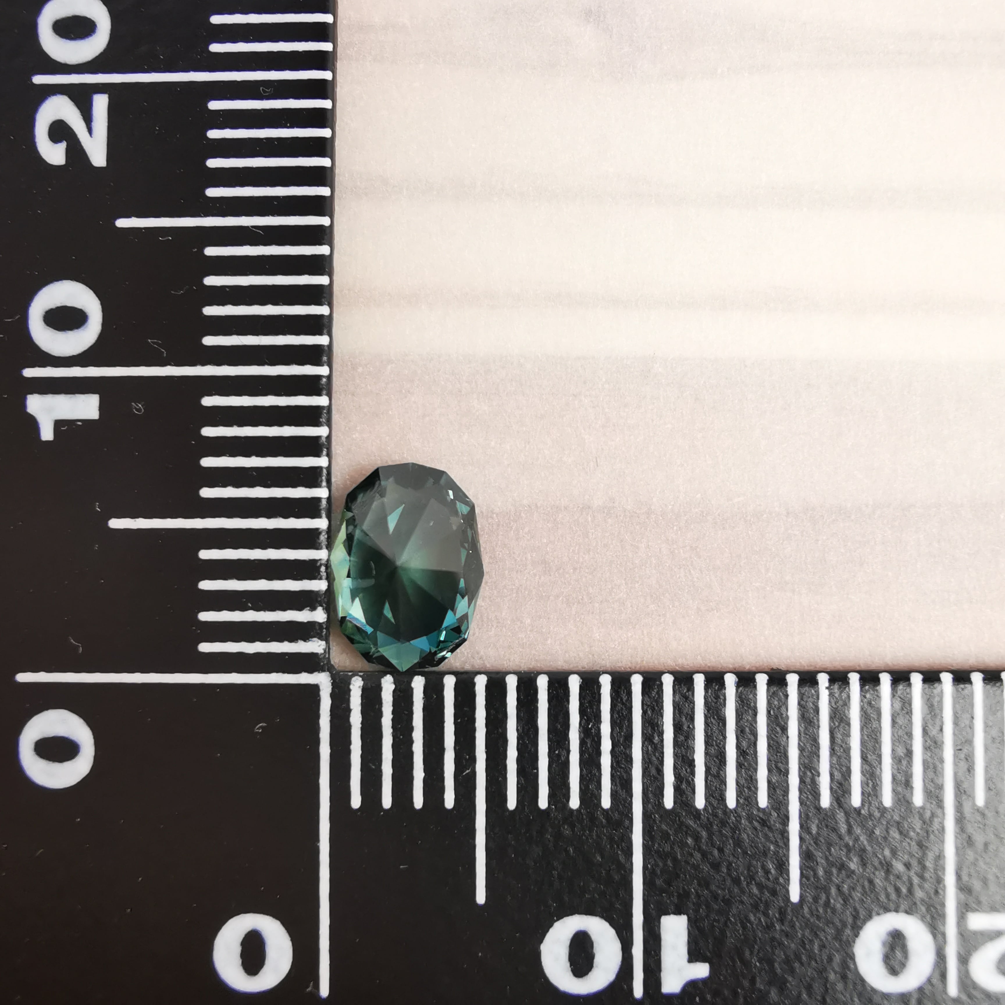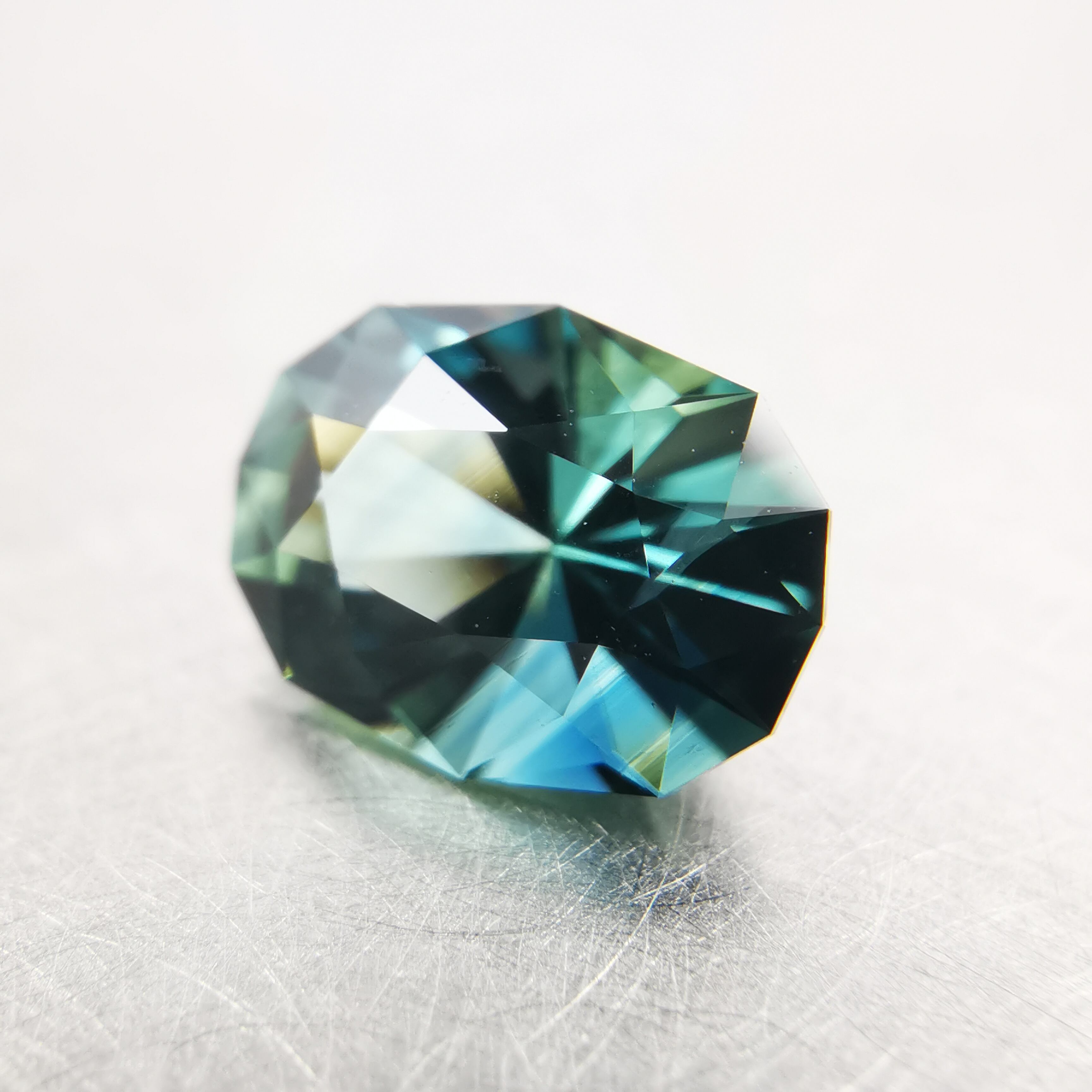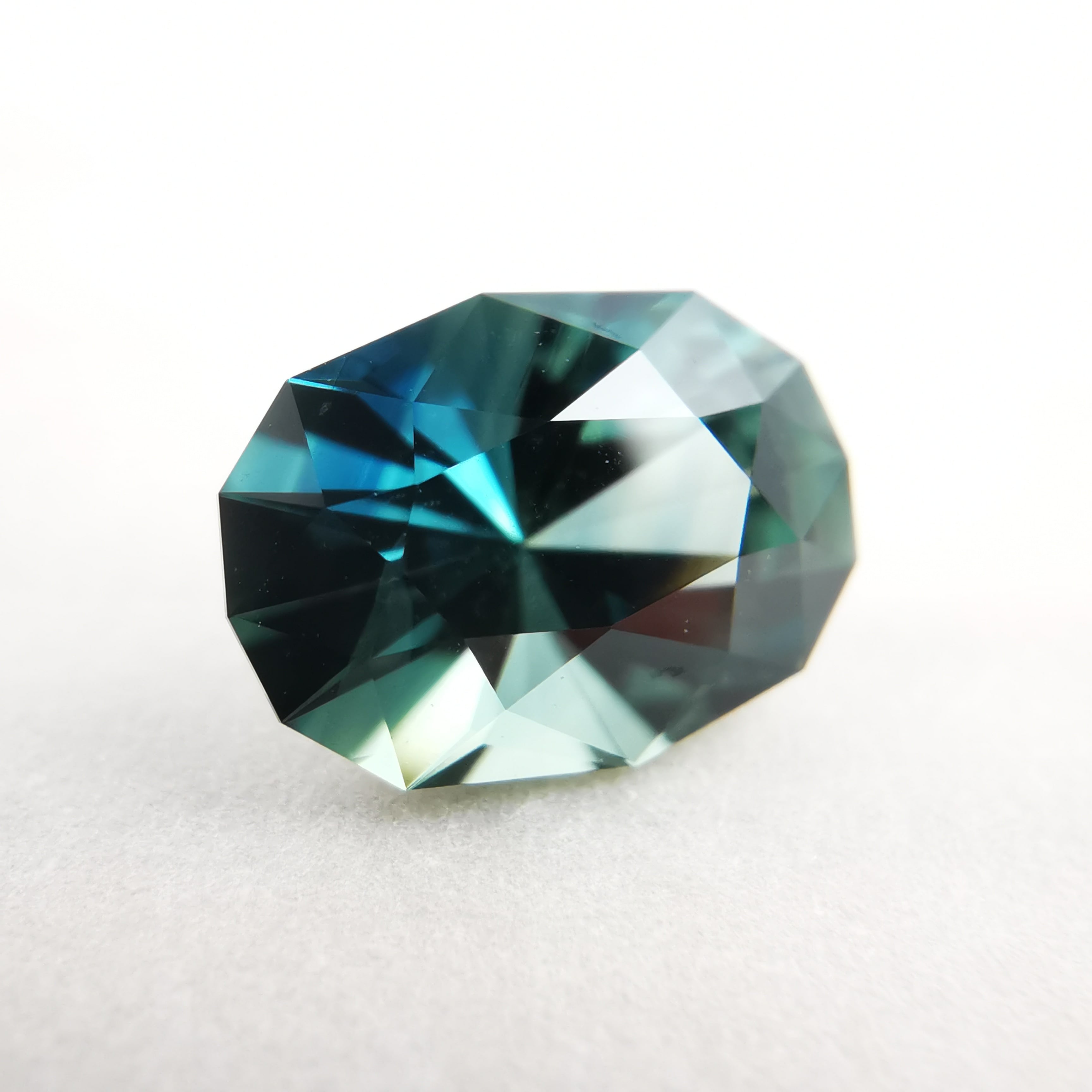 照明の元ではグリーン系、自然光ではブルー系のティールカラーのサファイアです。