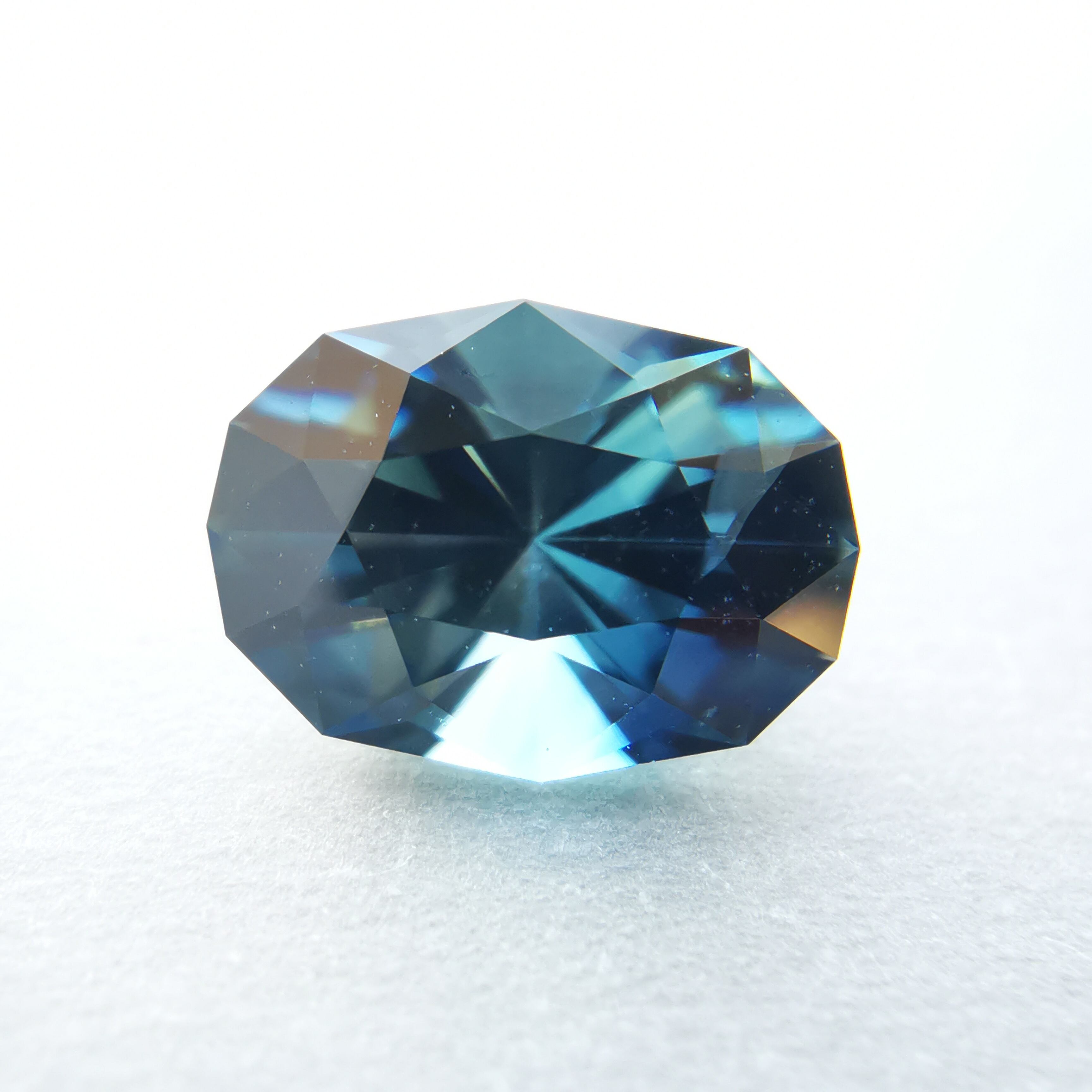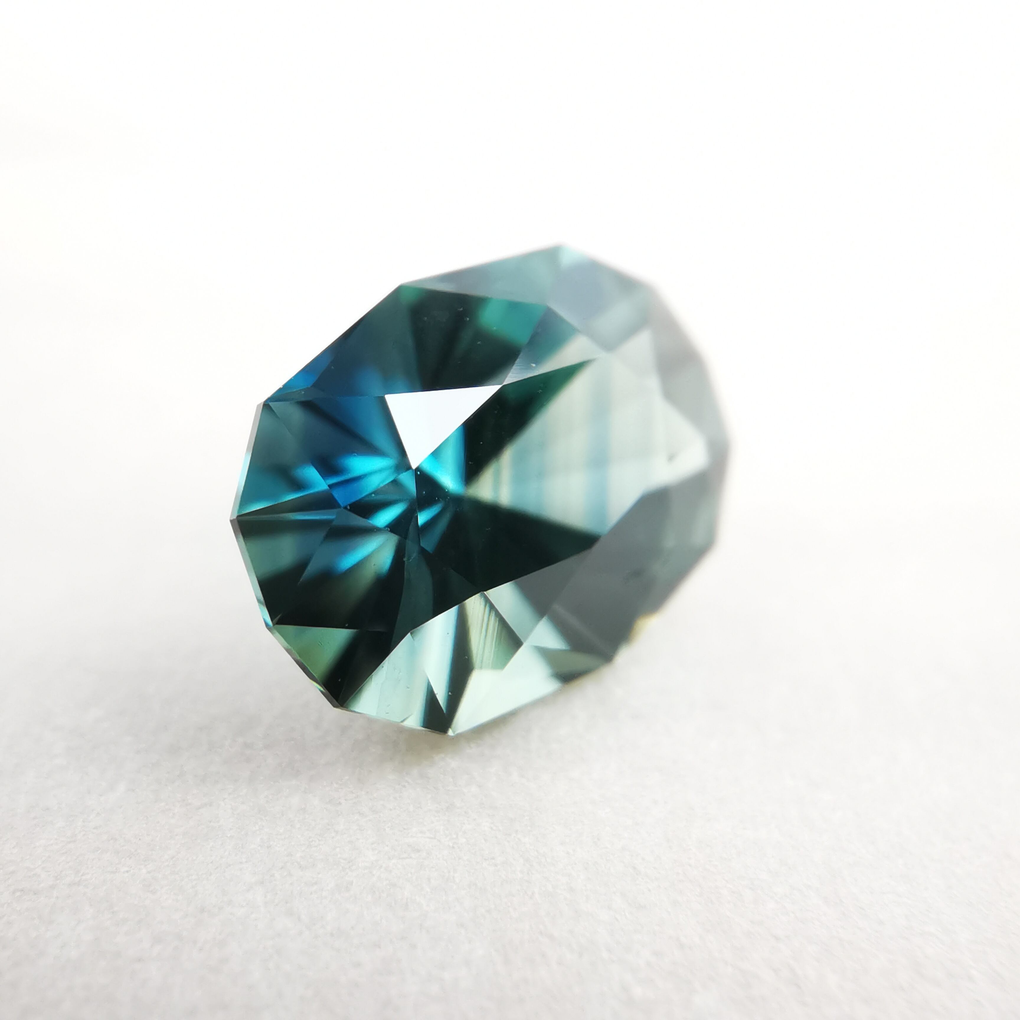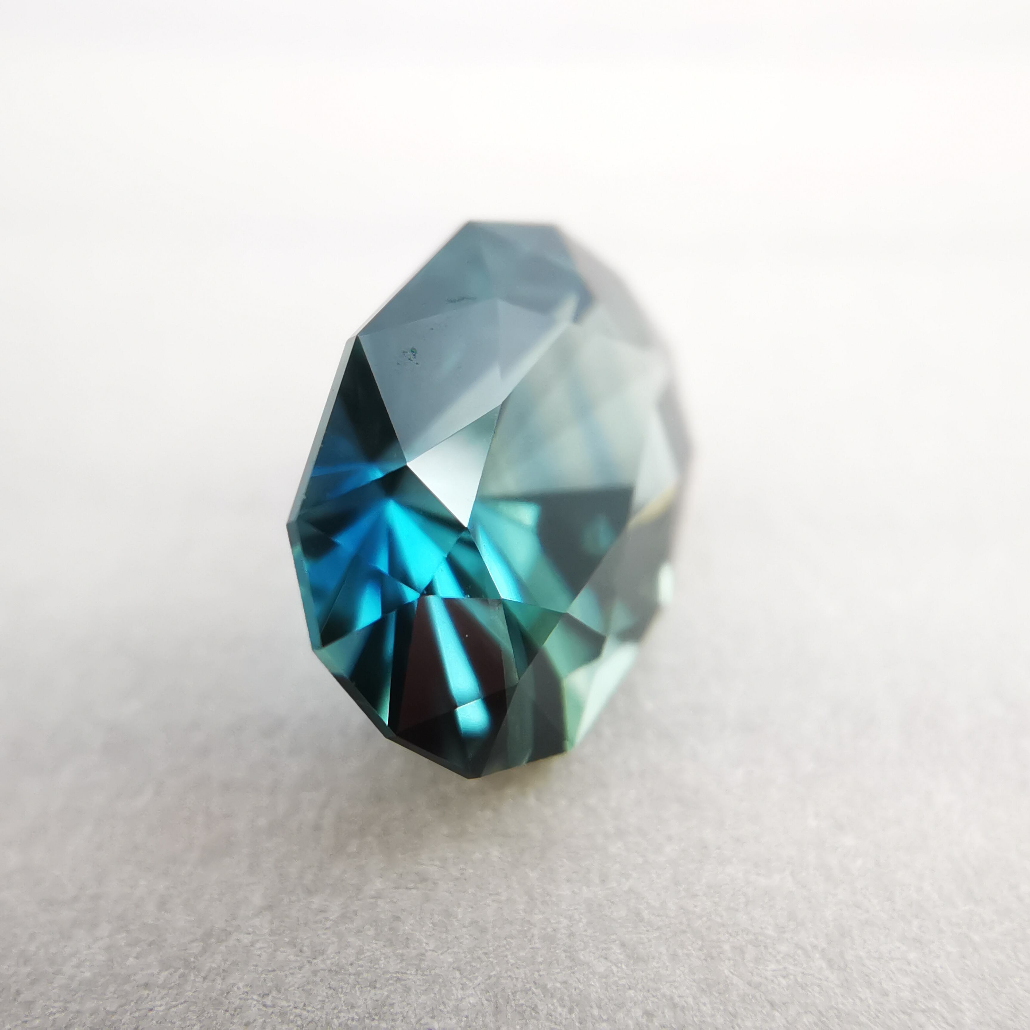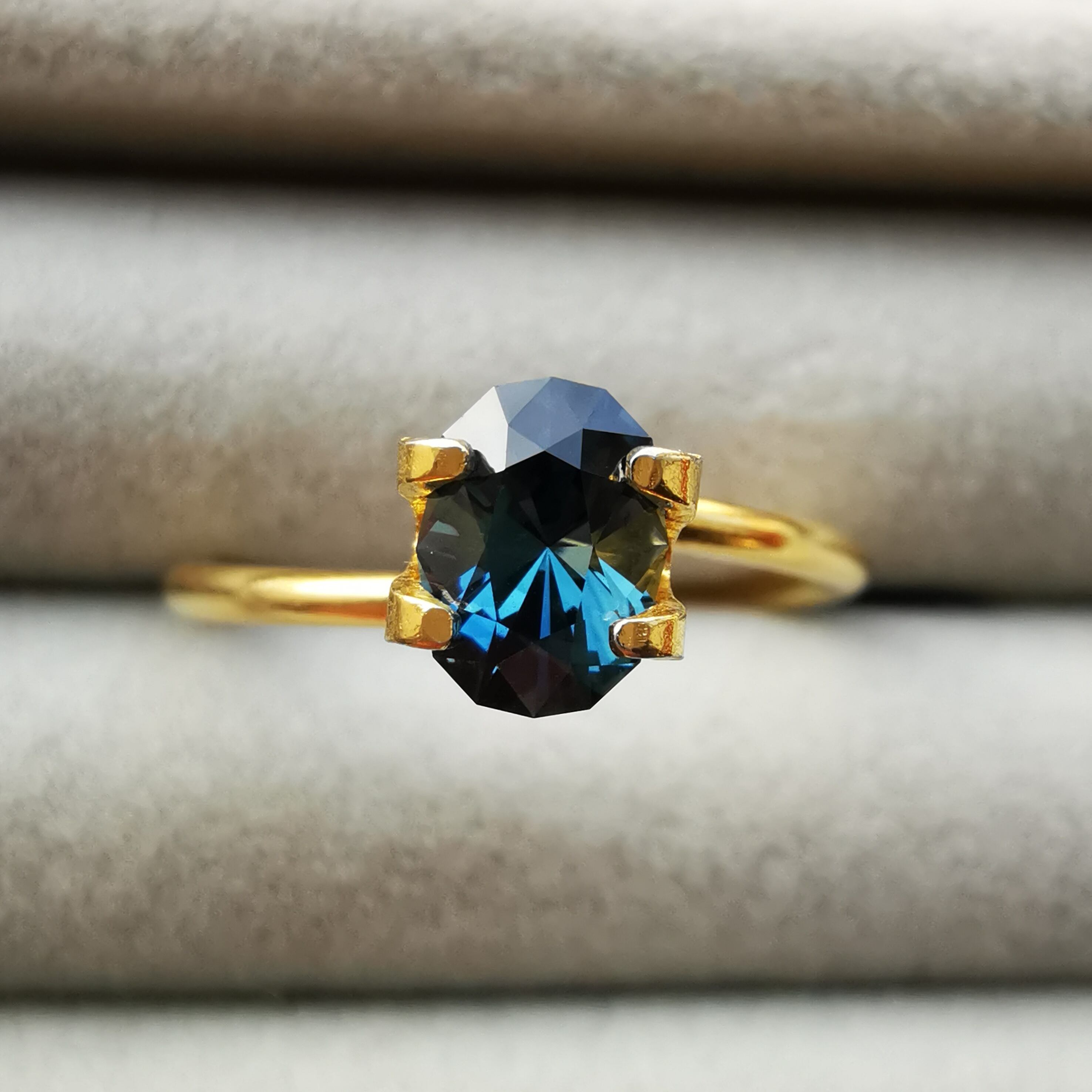 照明の元ではグリーン系、自然光ではブルー系のティールカラーのサファイアです。