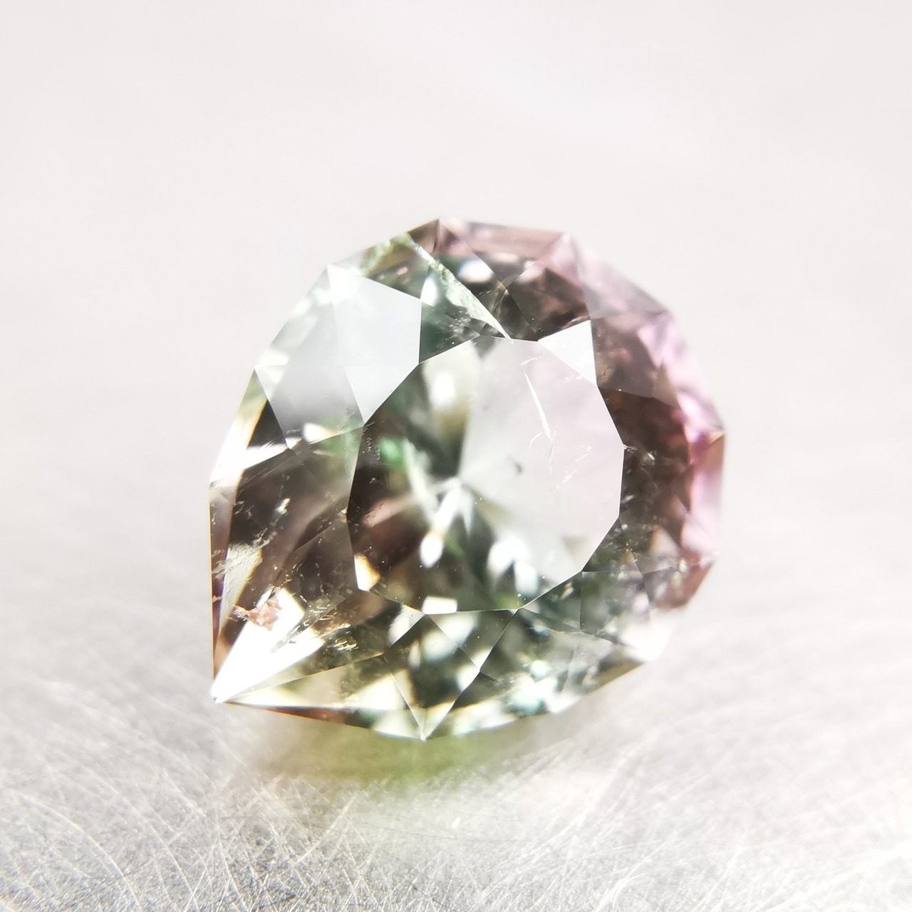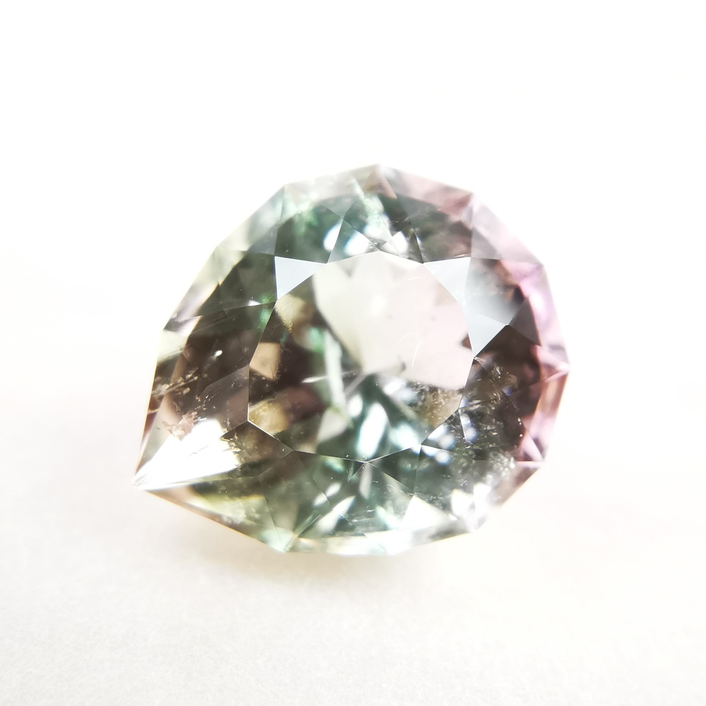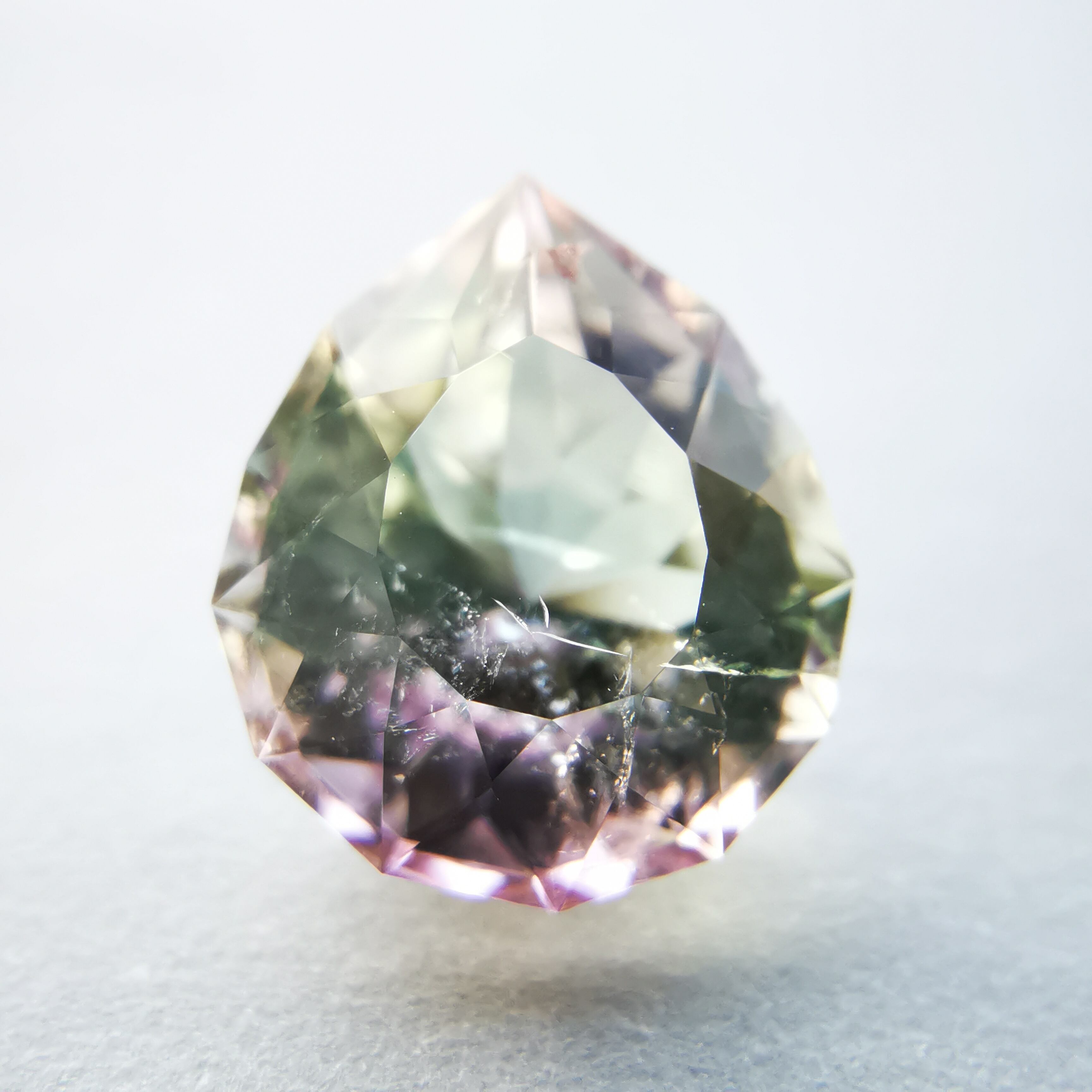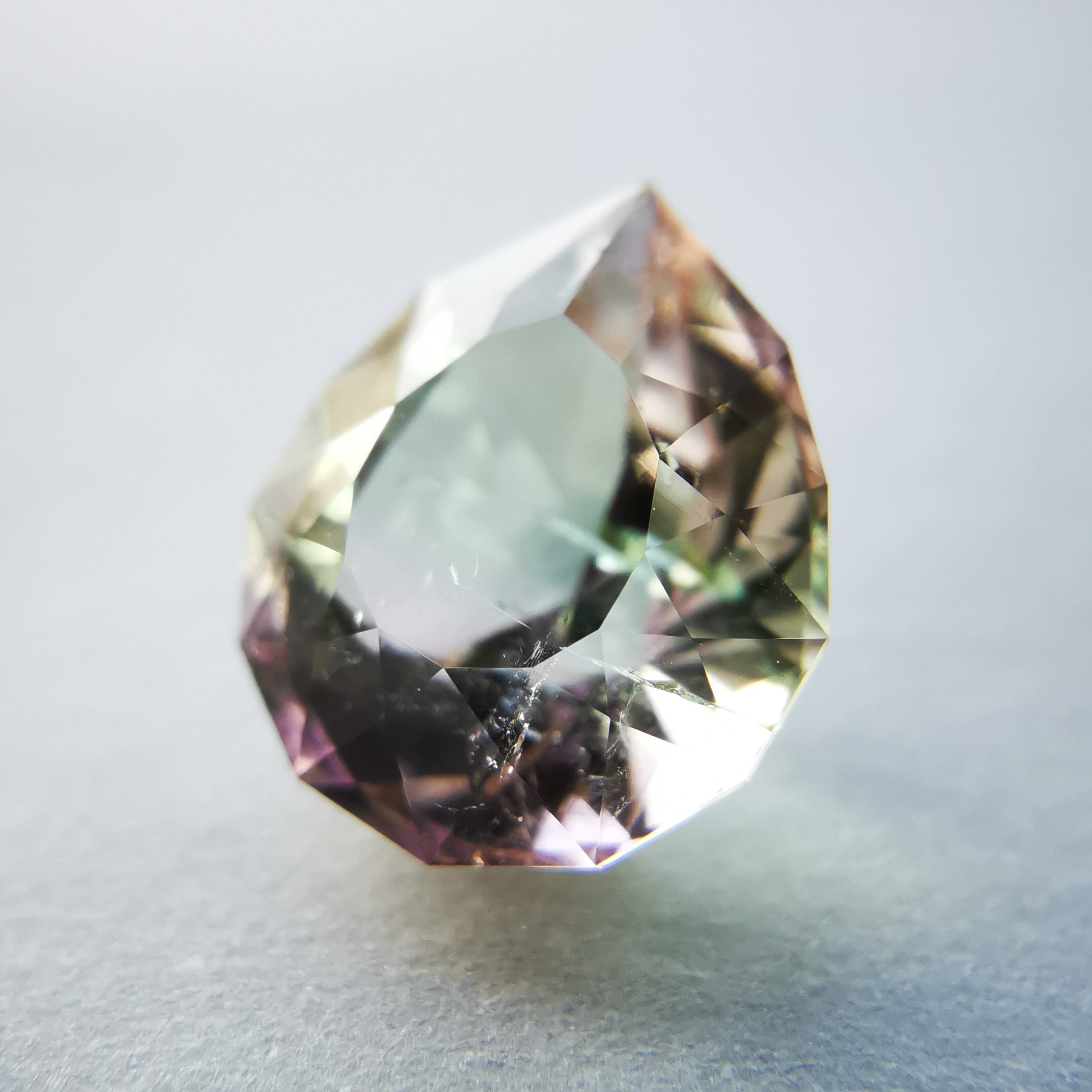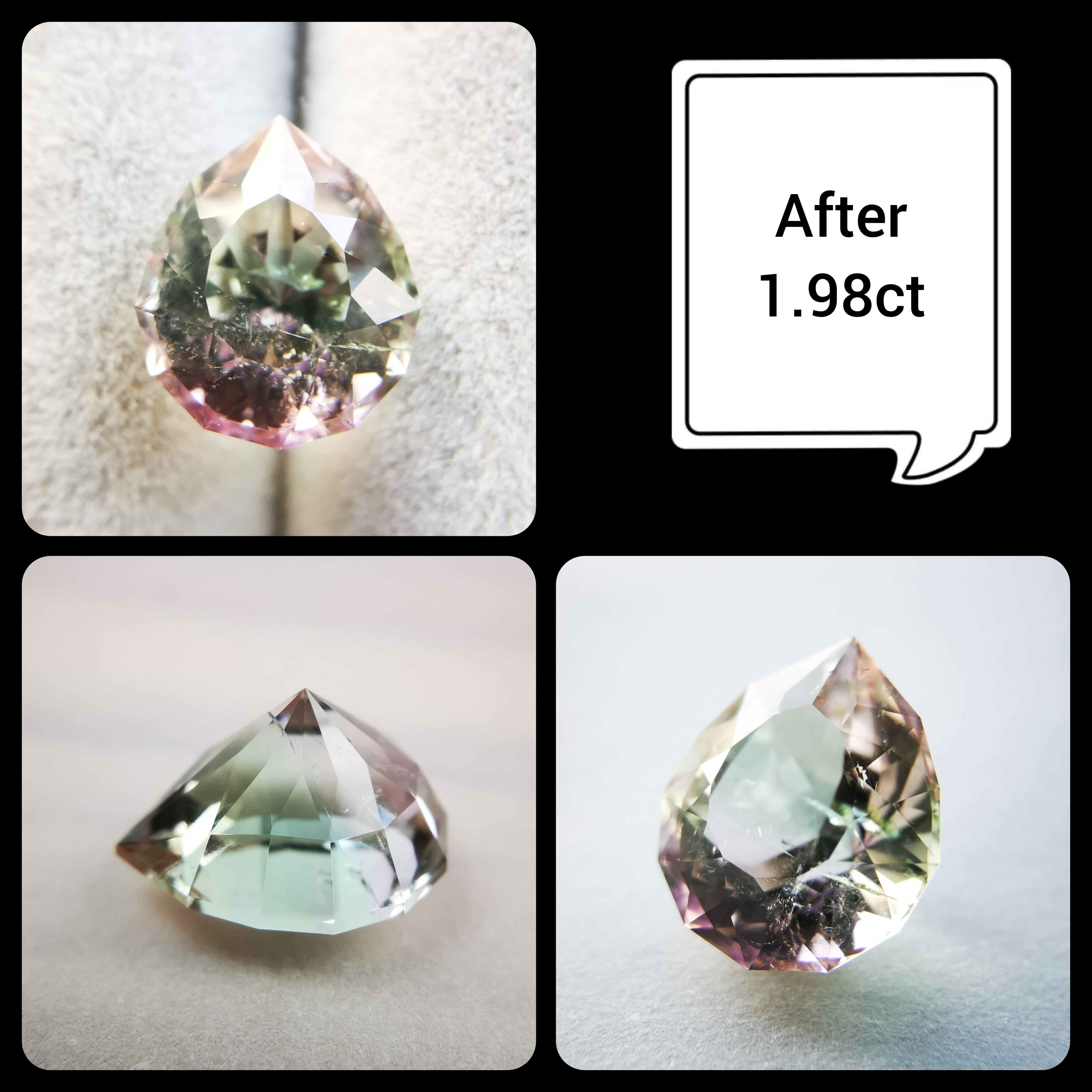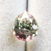 カッターE氏のふっくらとしたペアシェイプにほれ込み、一旦は他の石でリカットを依頼しましたが、普通のペアシェイプからは取れない形とのことで、とっておきのこちらのトルマリンにカットを施してもらいました。