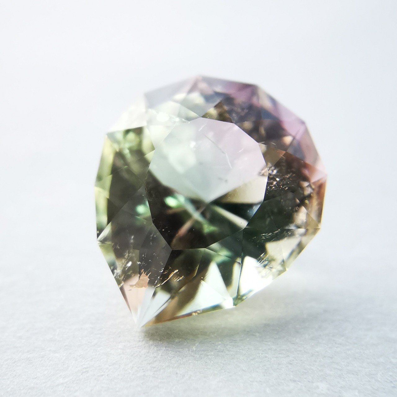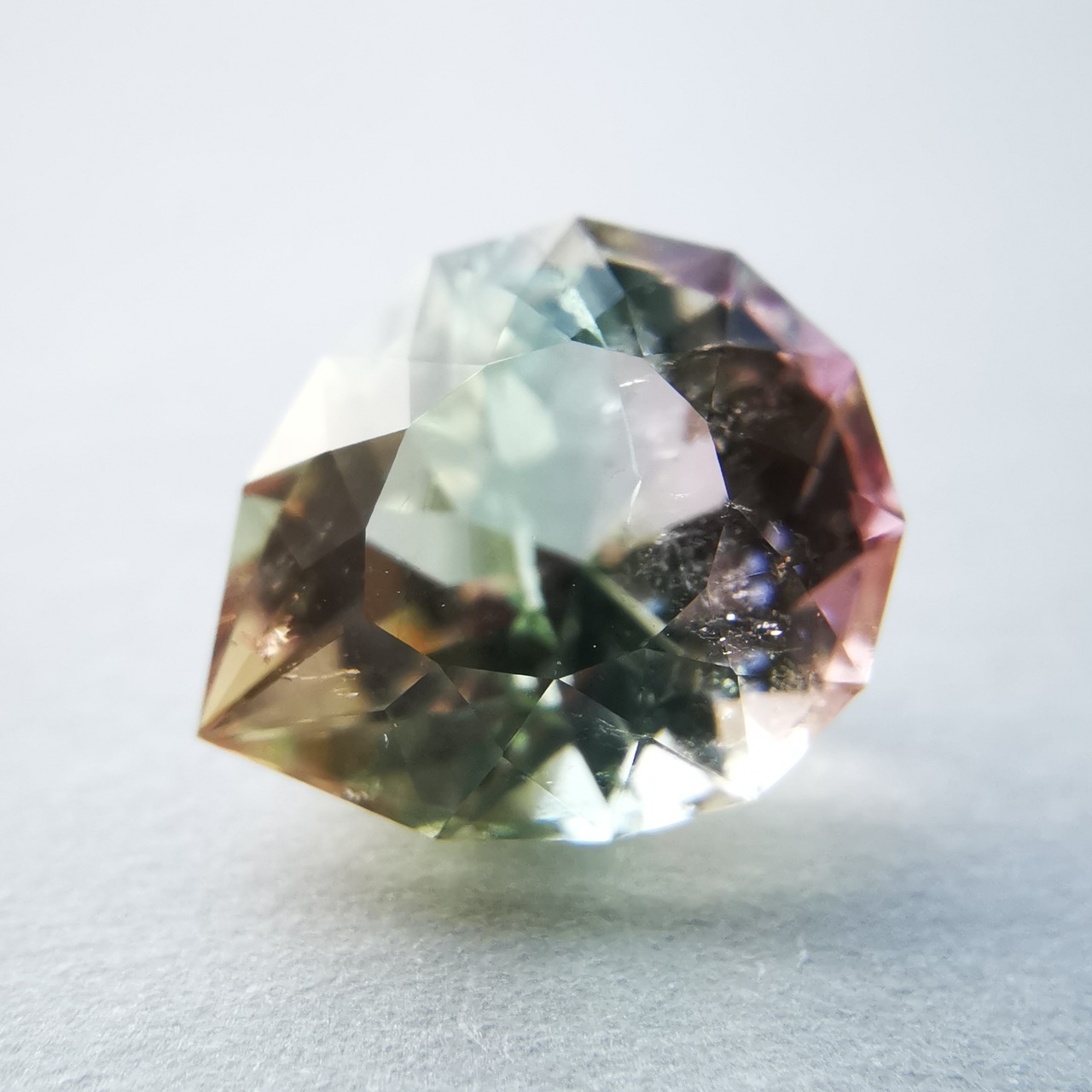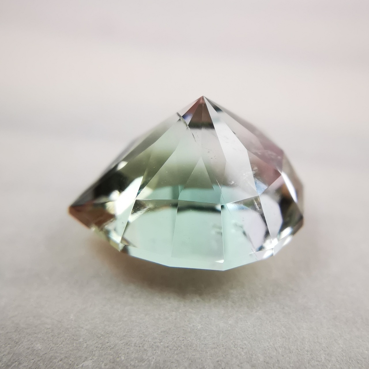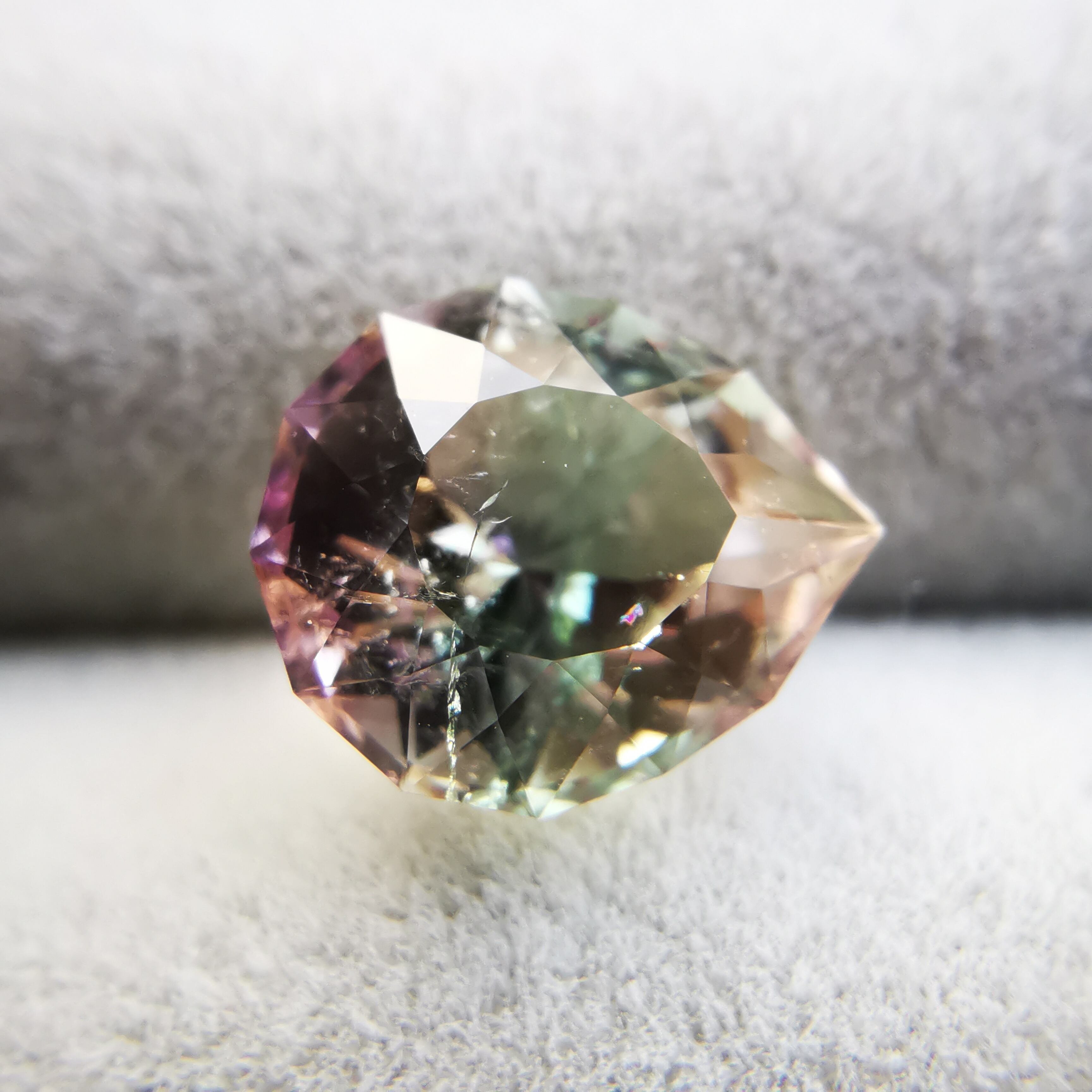 カッターE氏のふっくらとしたペアシェイプにほれ込み、一旦は他の石でリカットを依頼しましたが、普通のペアシェイプからは取れない形とのことで、とっておきのこちらのトルマリンにカットを施してもらいました。