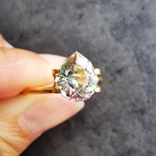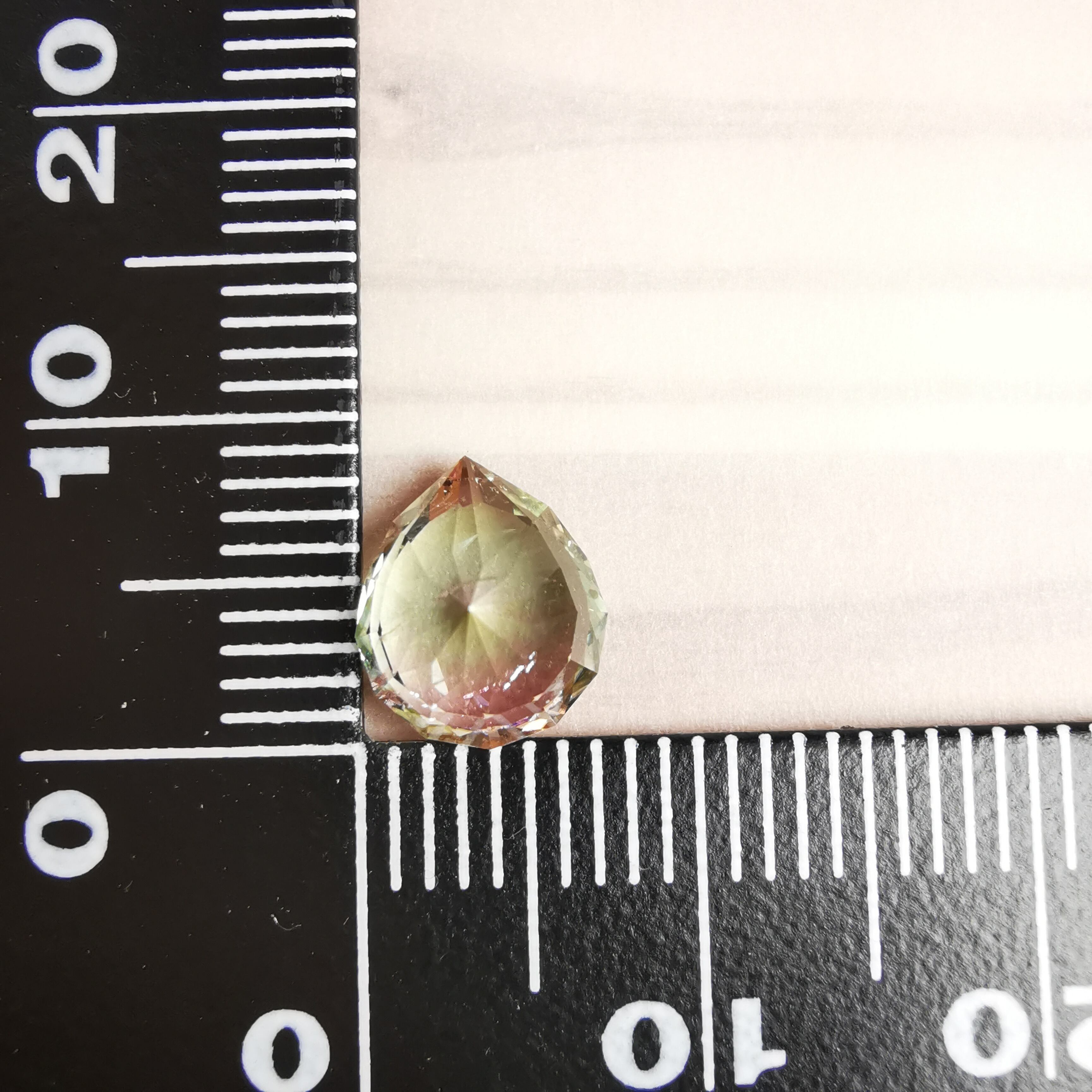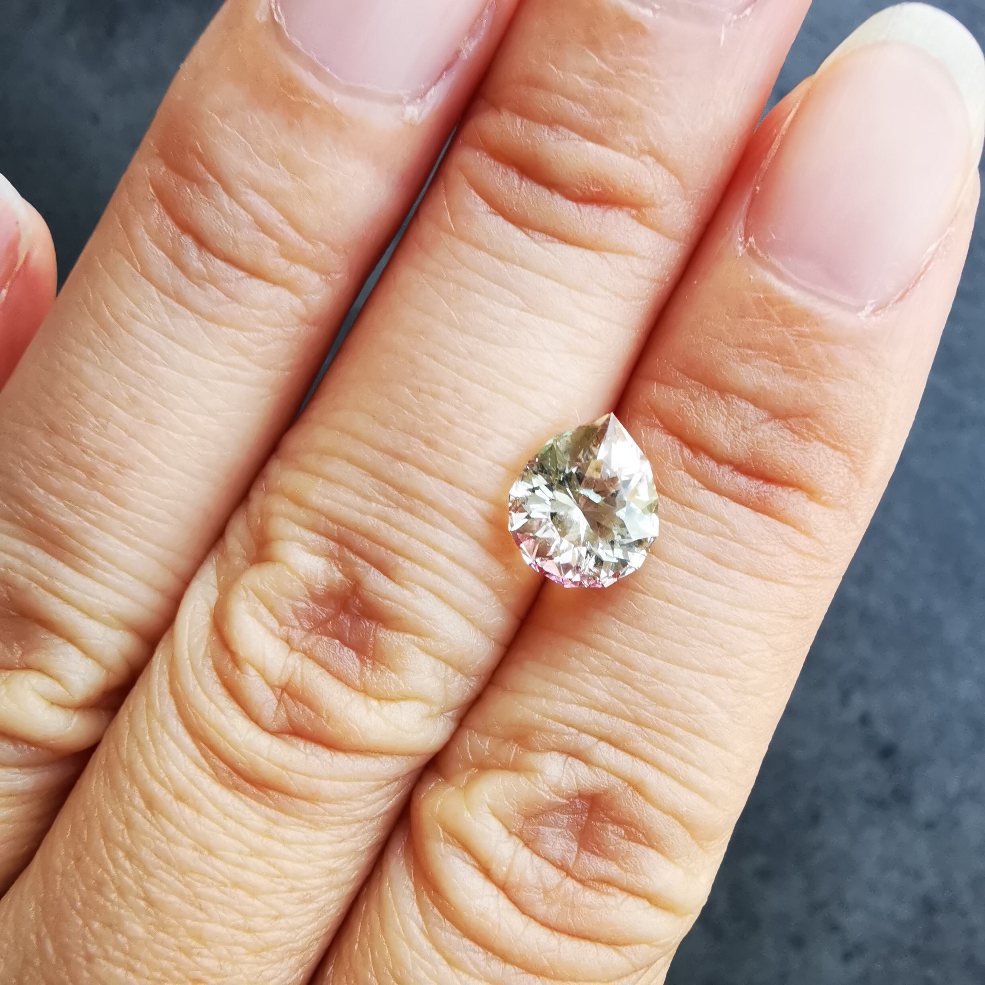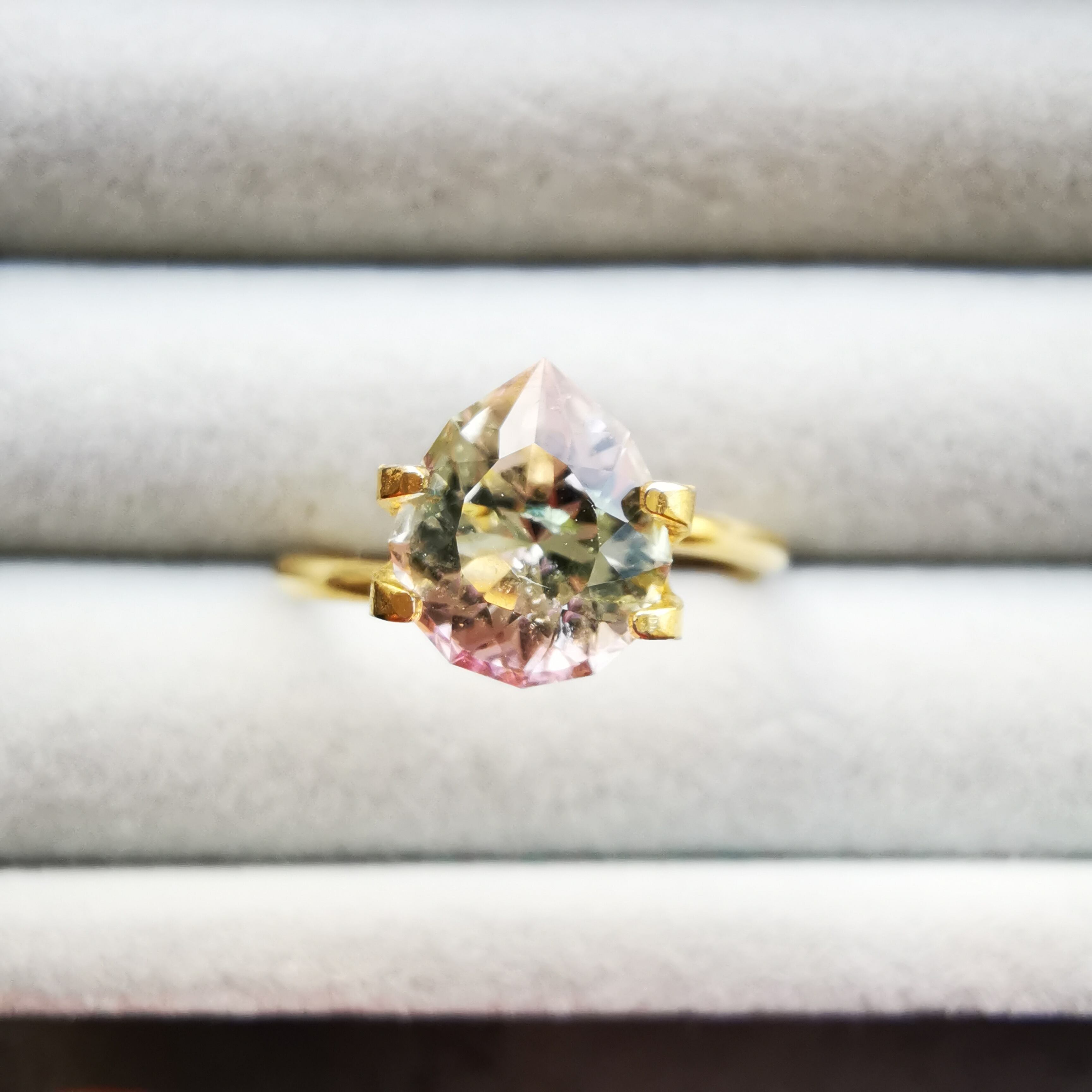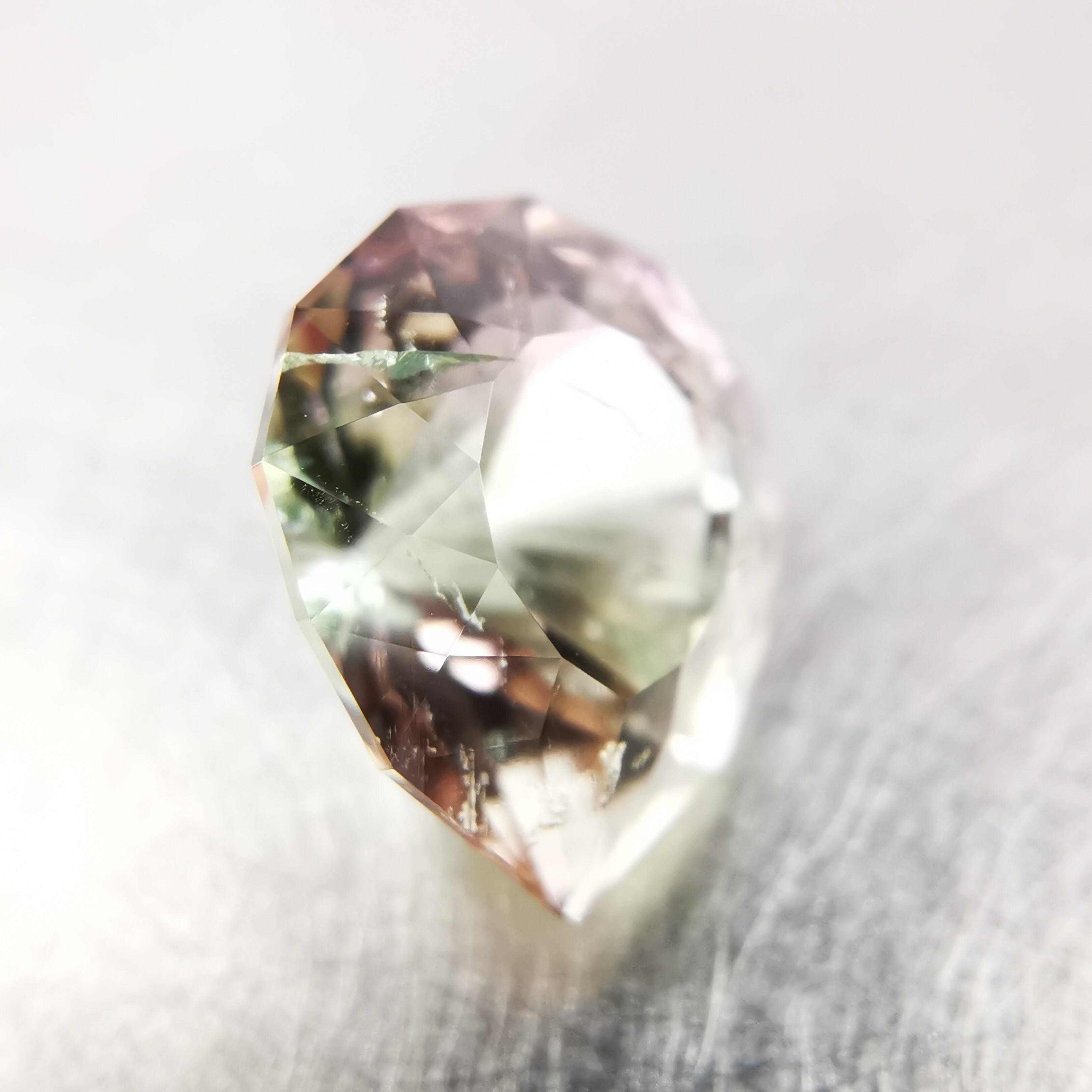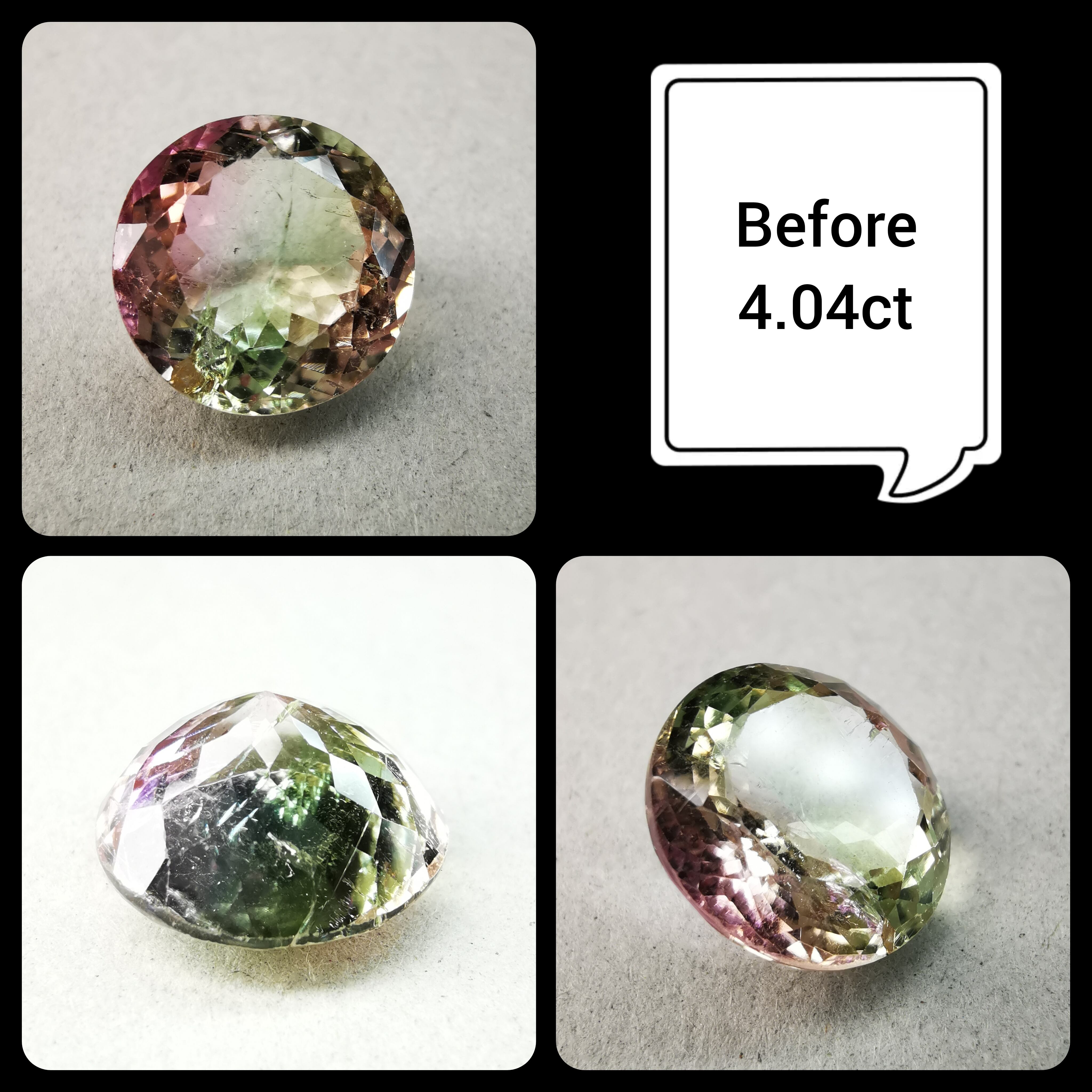 カッターE氏のふっくらとしたペアシェイプにほれ込み、一旦は他の石でリカットを依頼しましたが、普通のペアシェイプからは取れない形とのことで、とっておきのこちらのトルマリンにカットを施してもらいました。