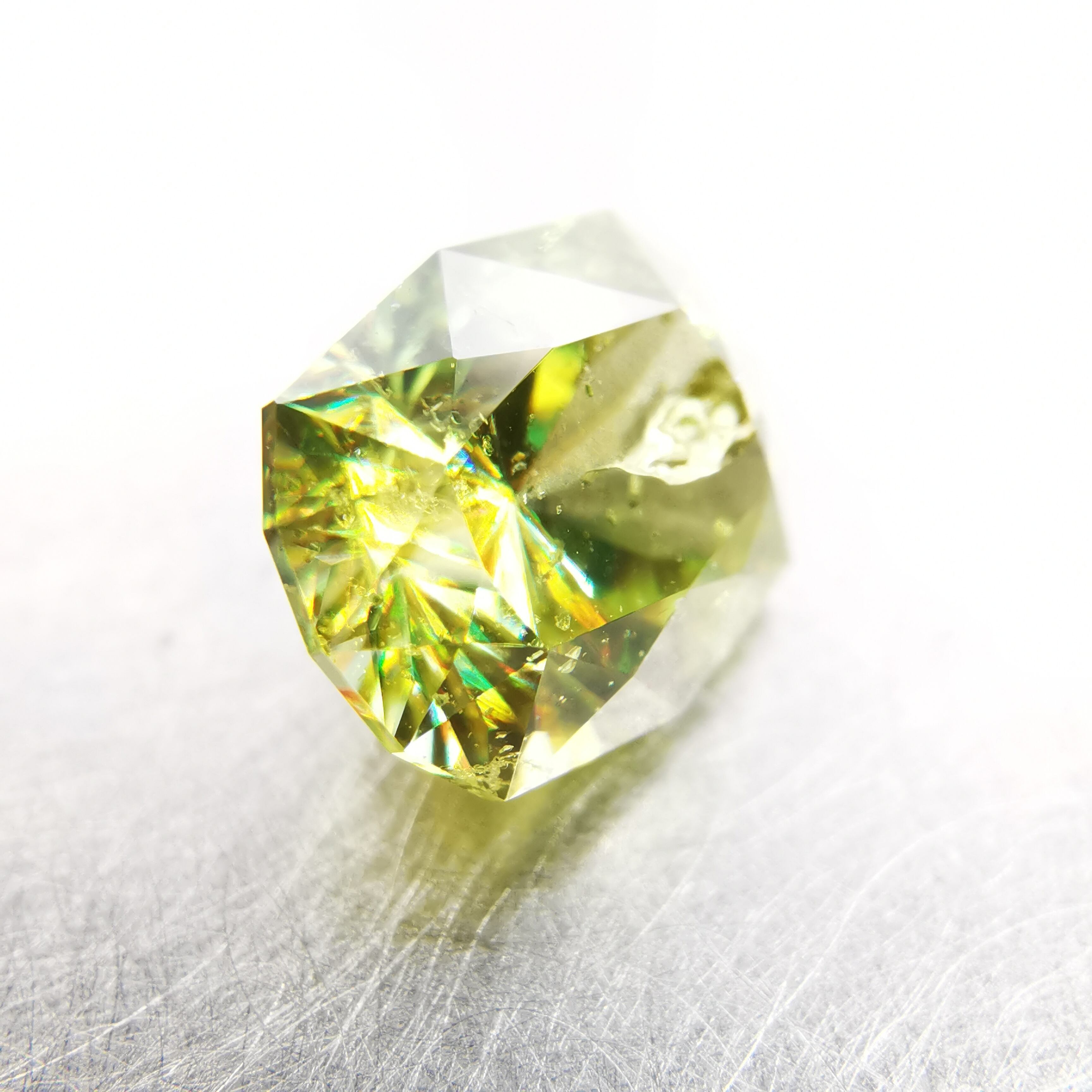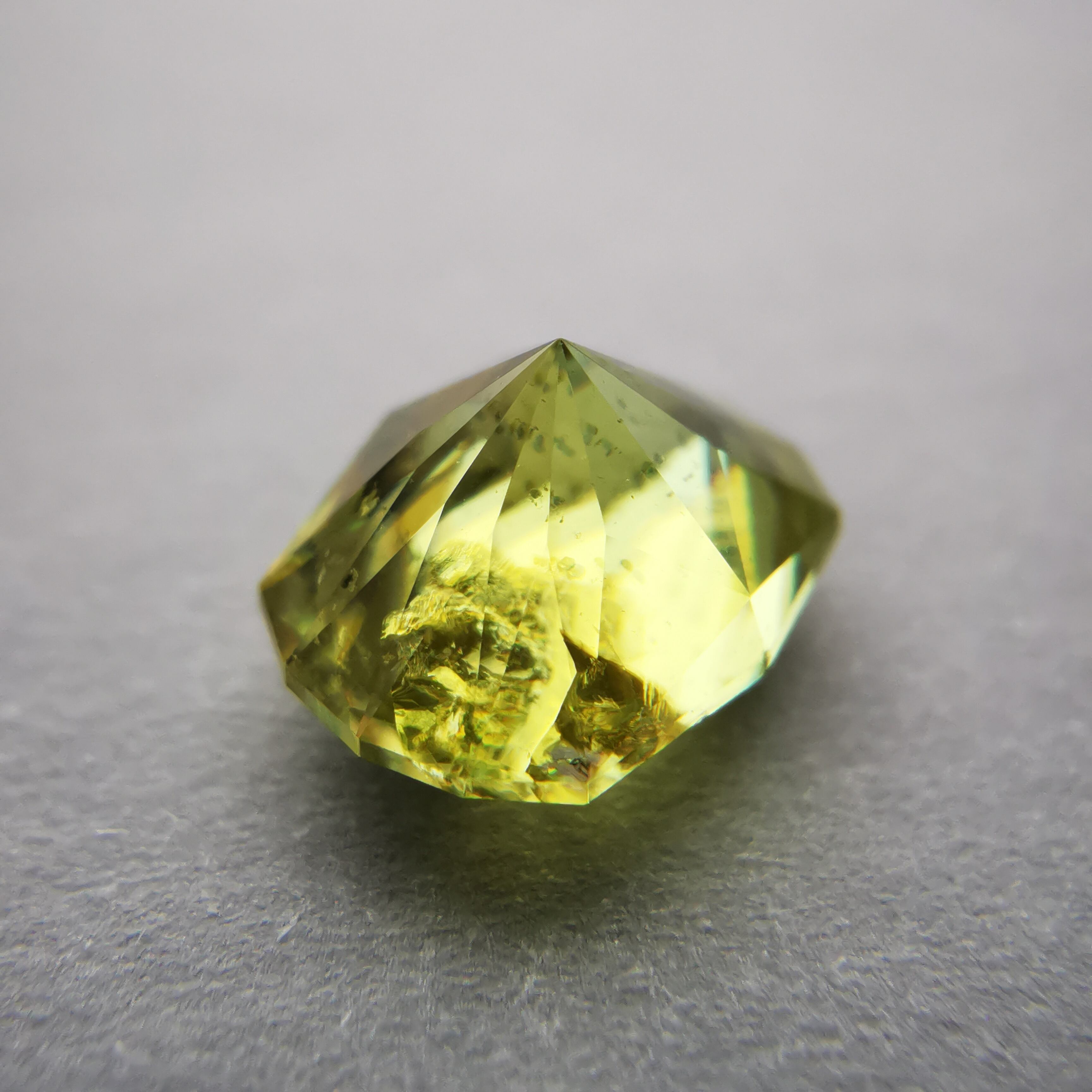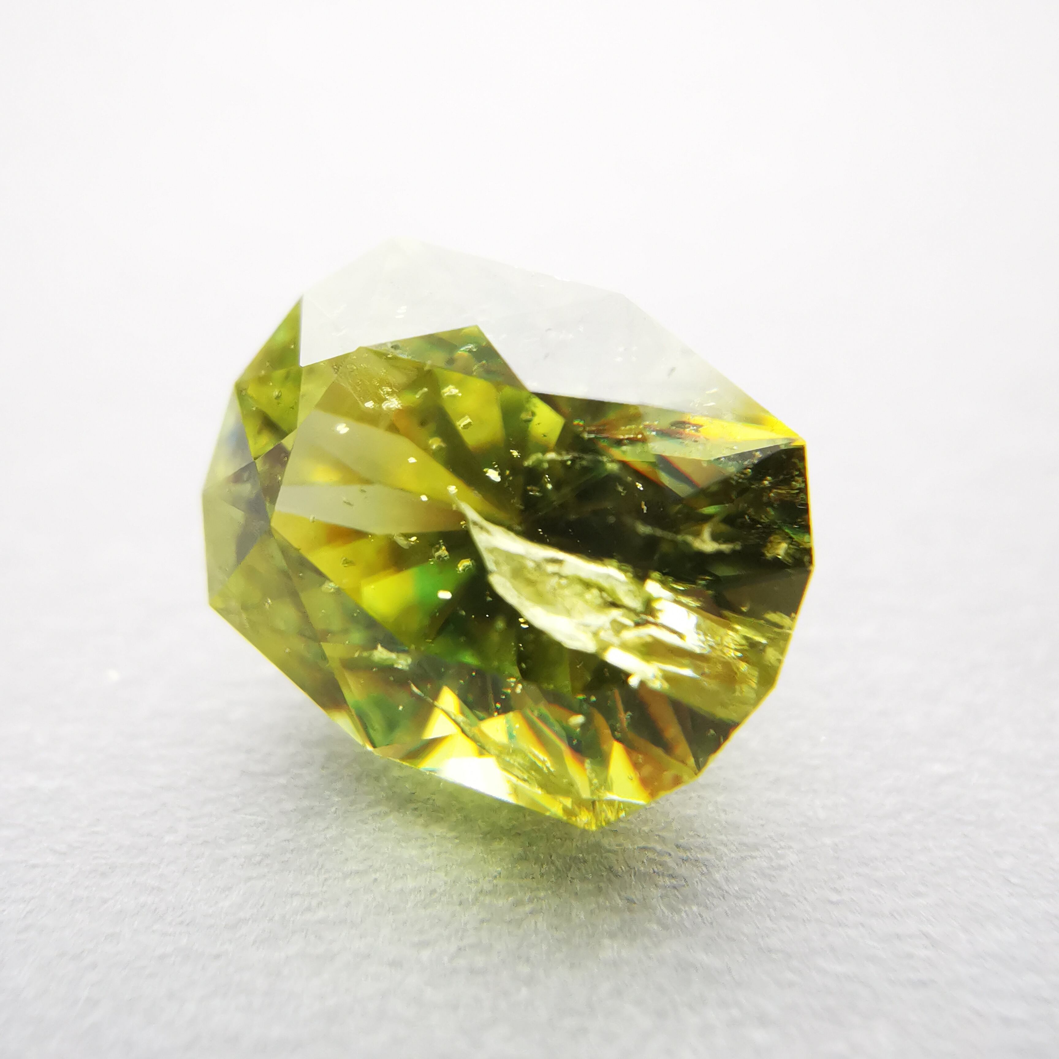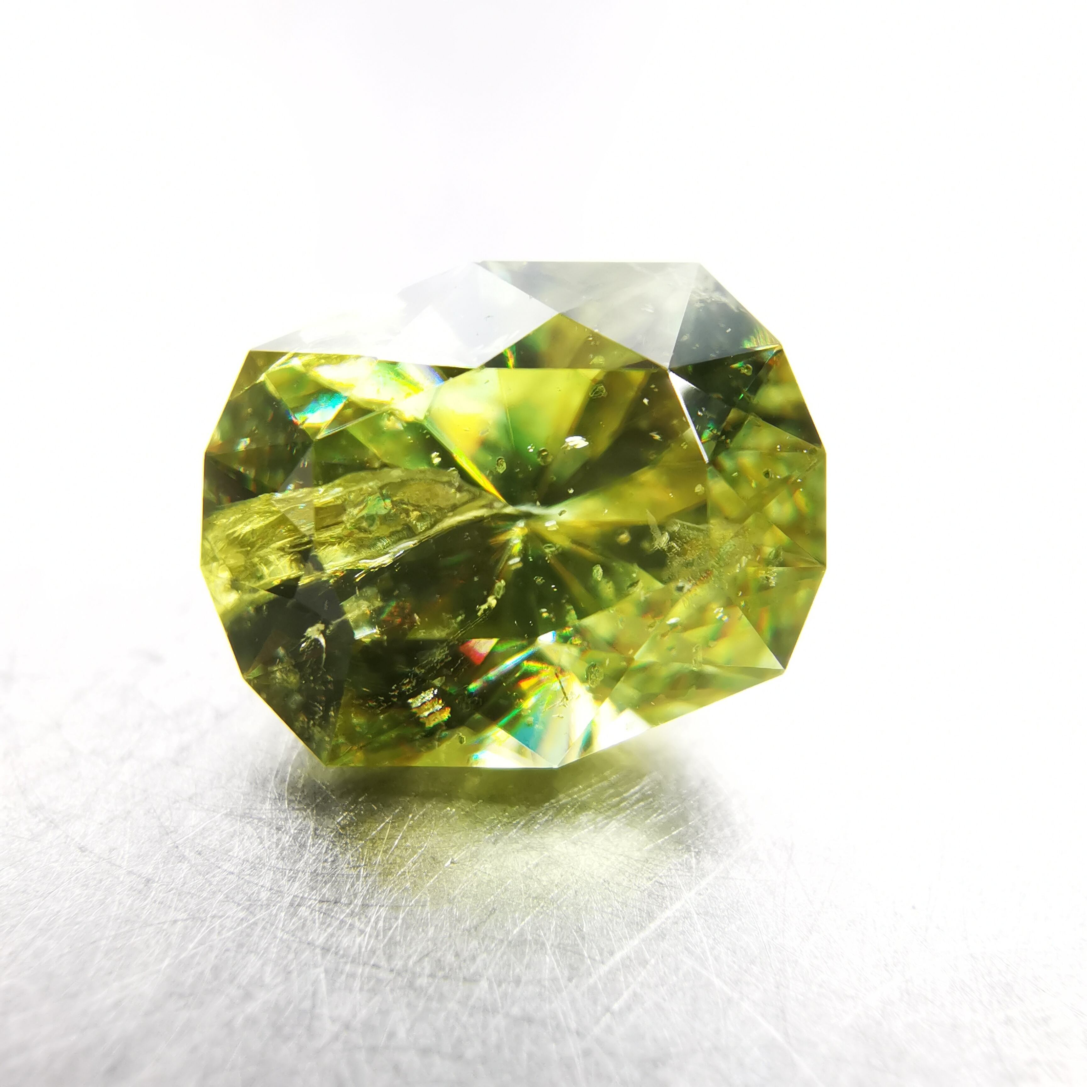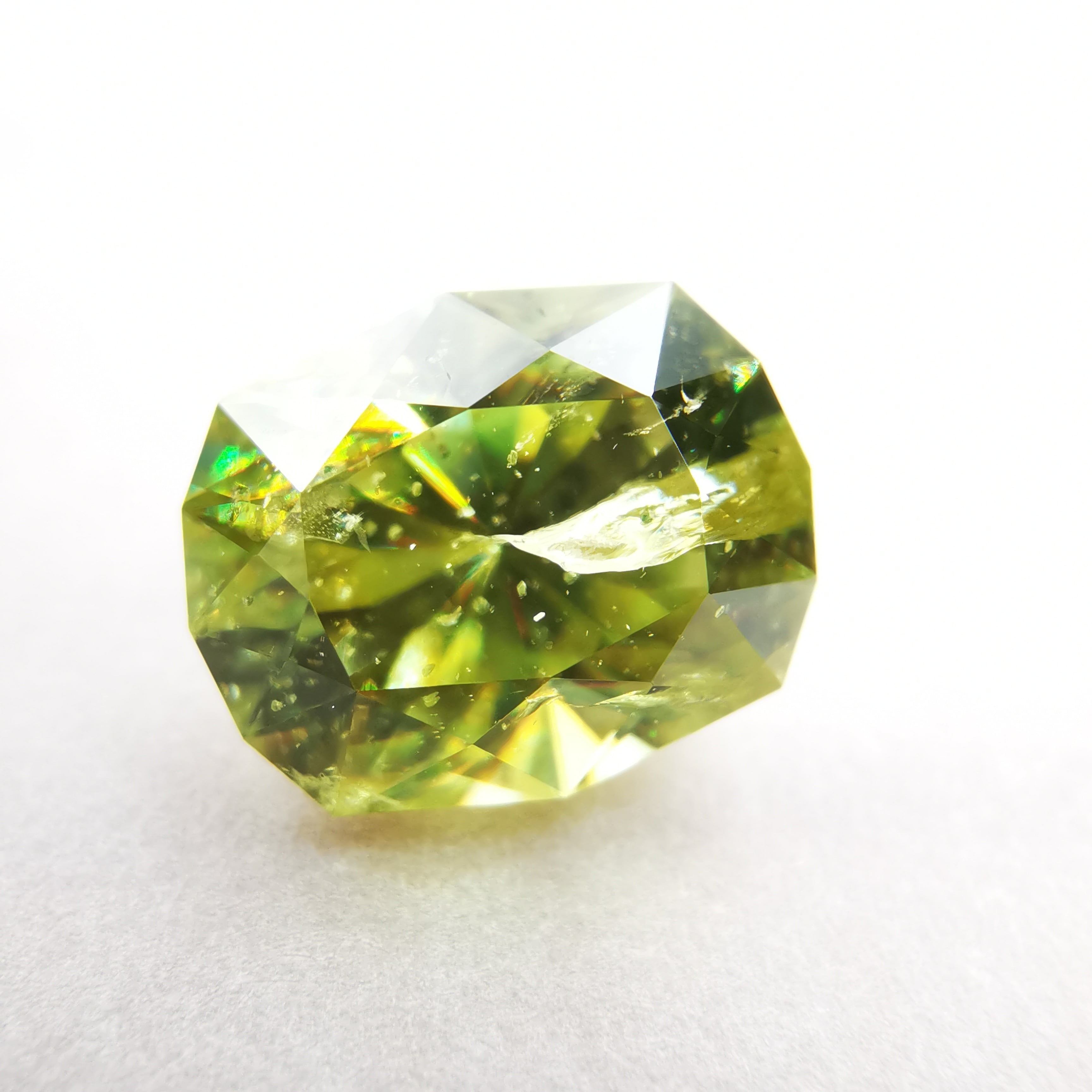 イエローグリーンの中に、舞い散る花びらのようなインクルージョンと風にたなびくようなクラックが入っています。