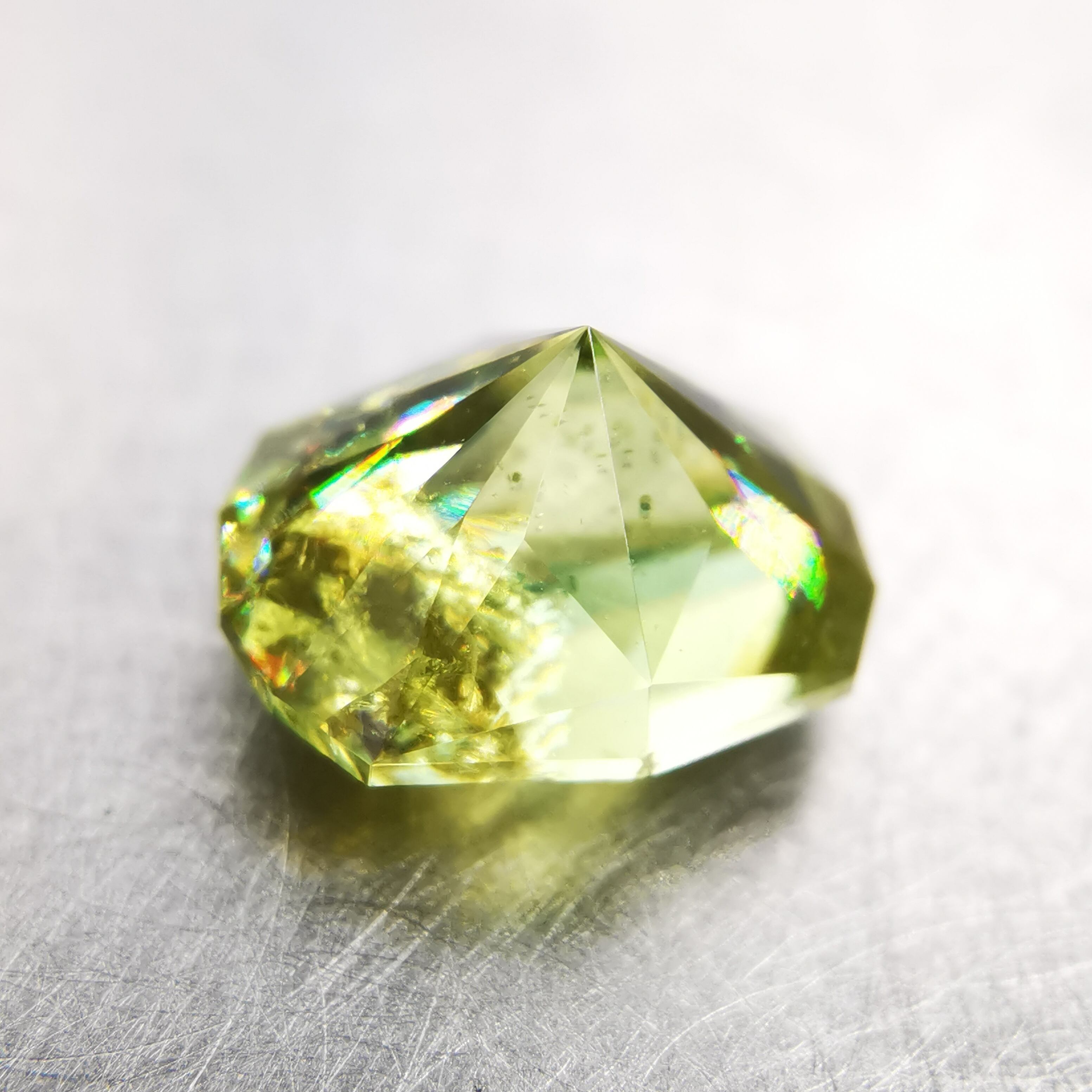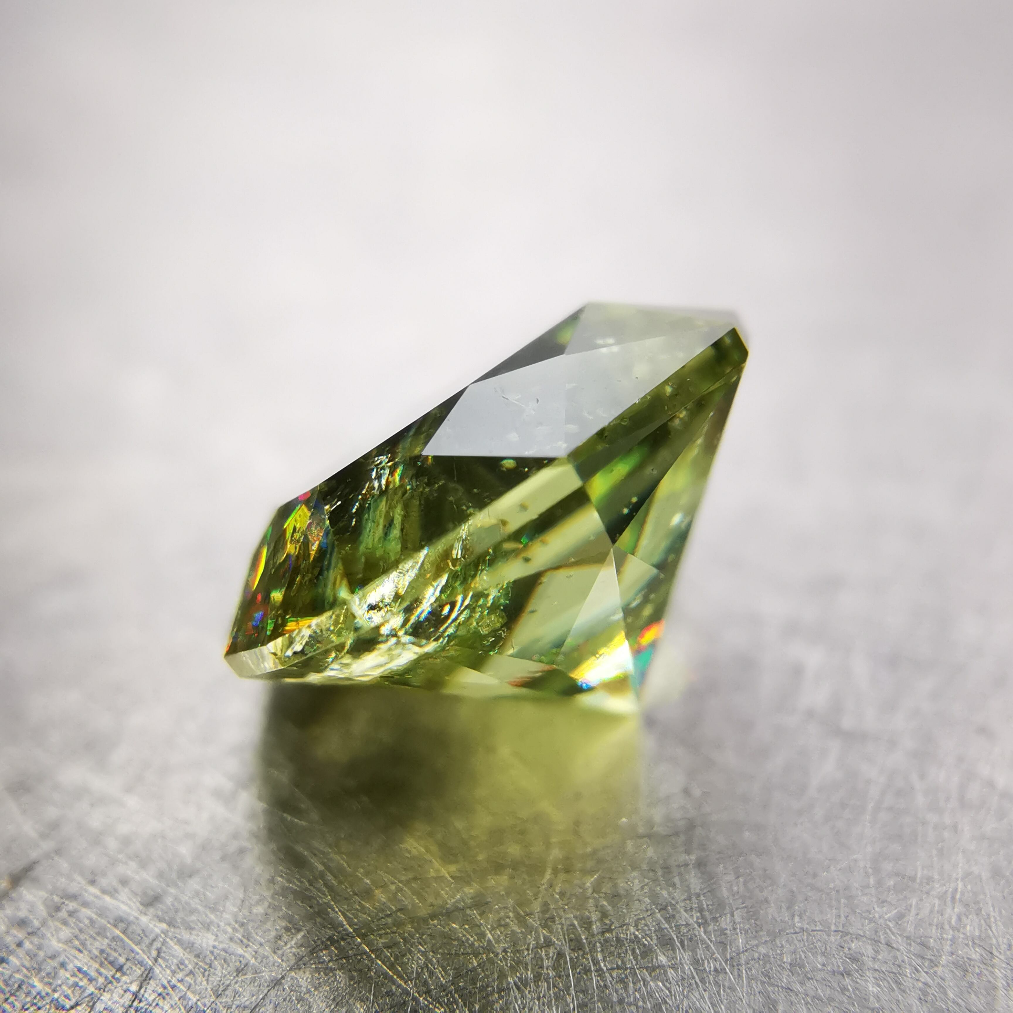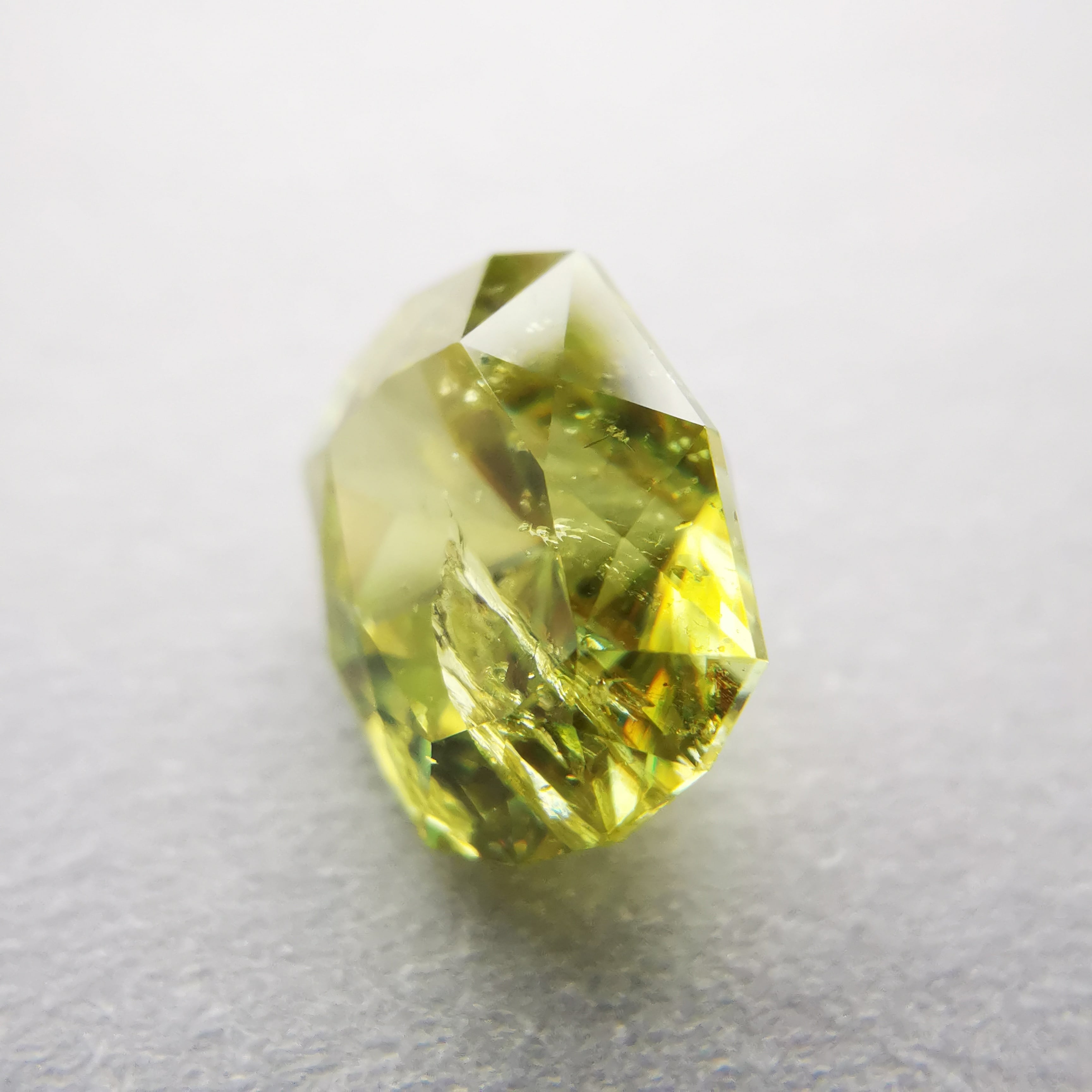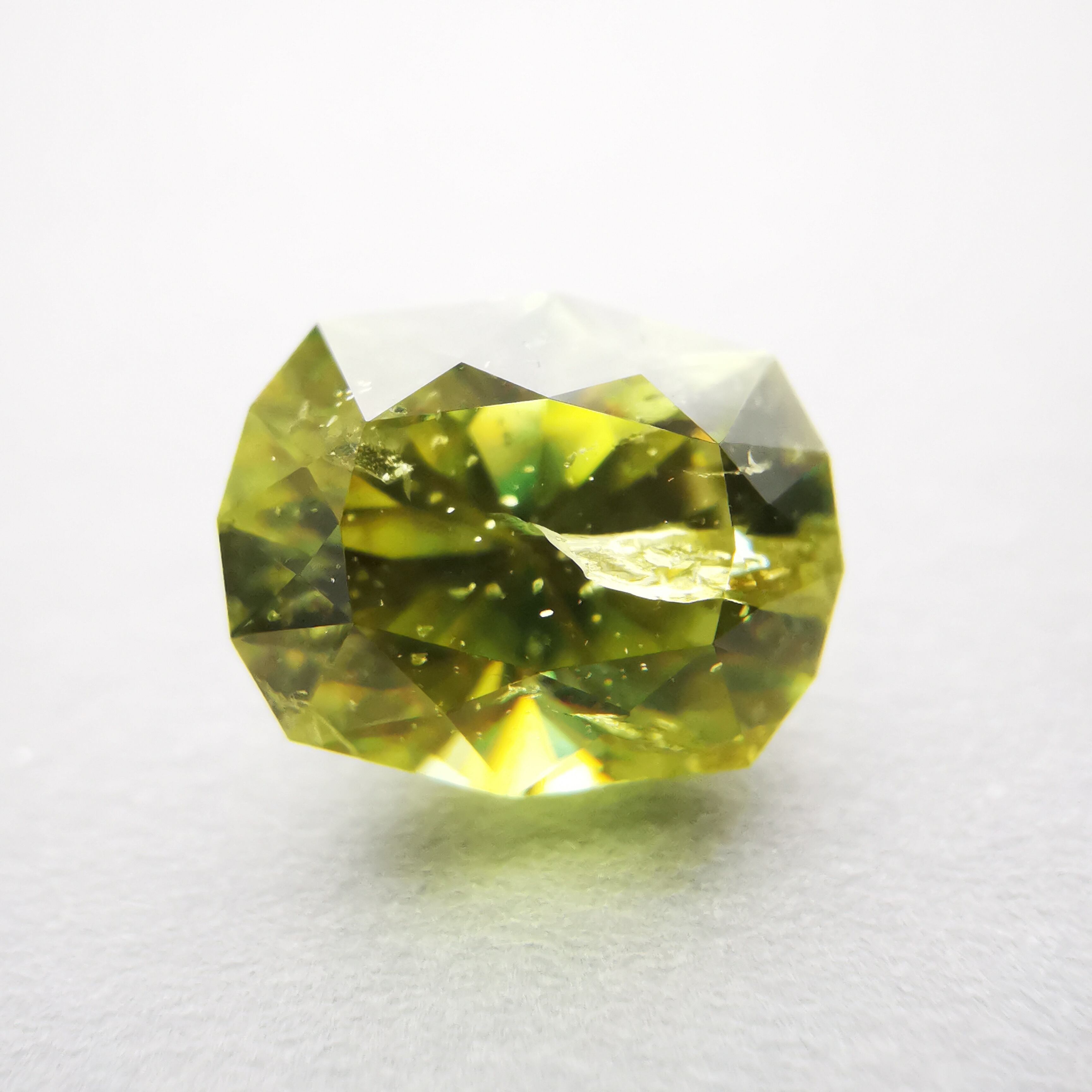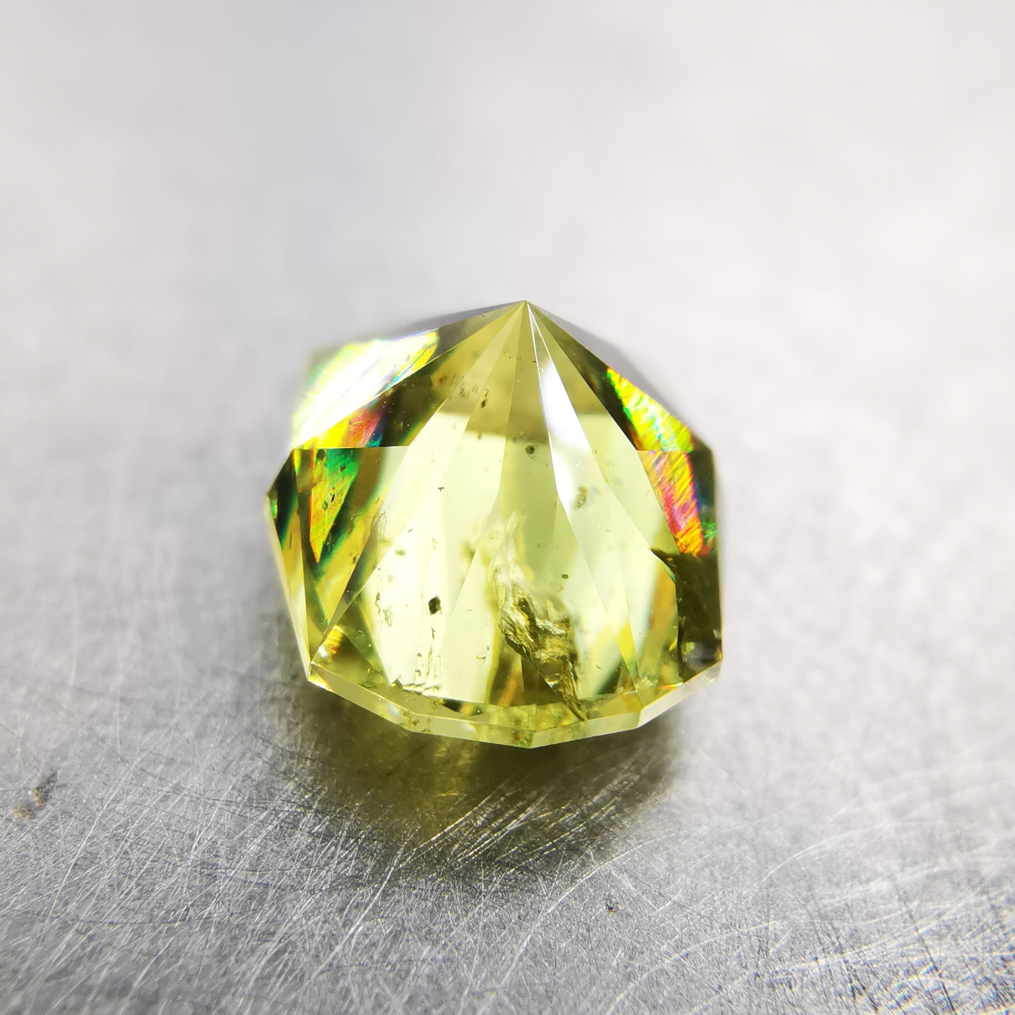 イエローグリーンの中に、舞い散る花びらのようなインクルージョンと風にたなびくようなクラックが入っています。
