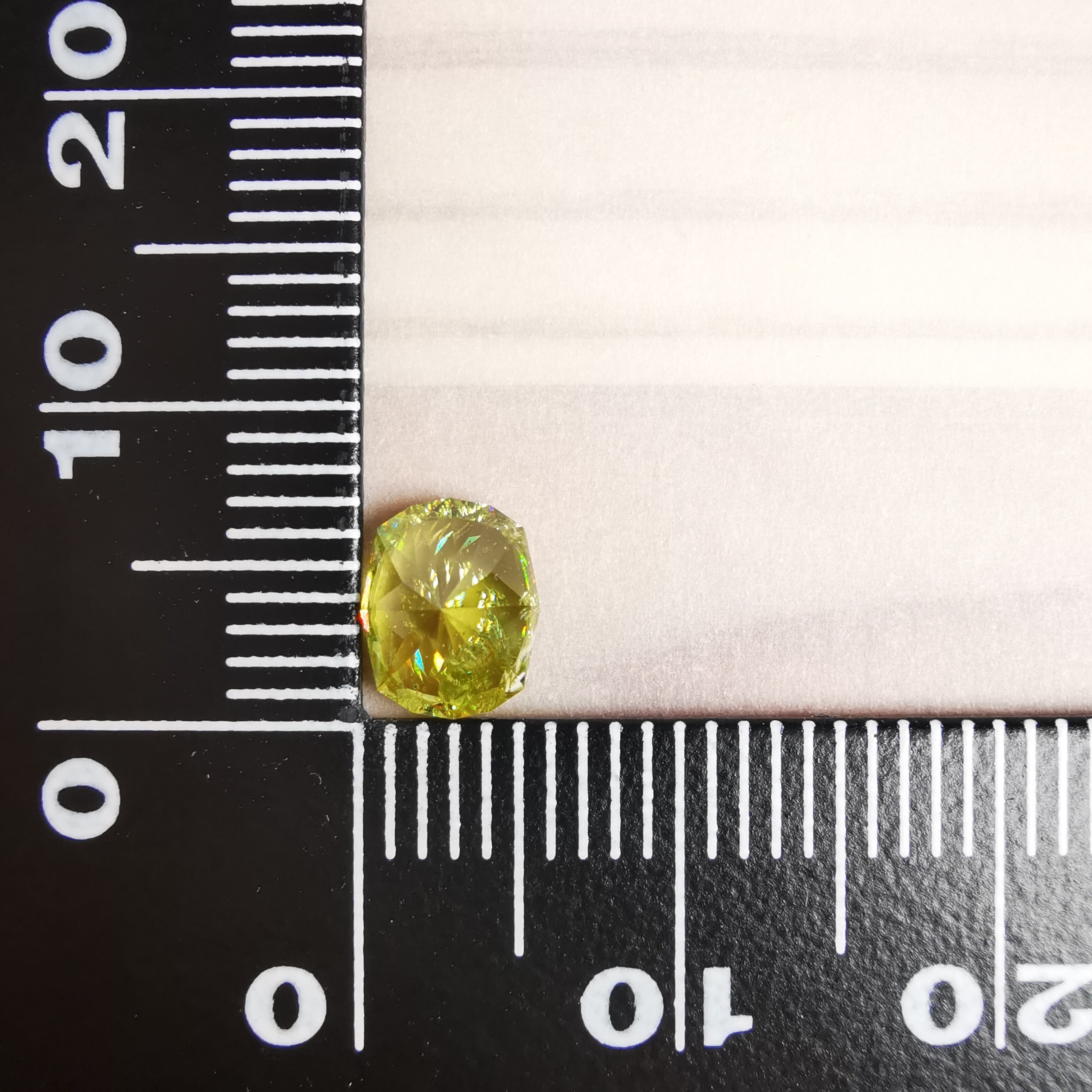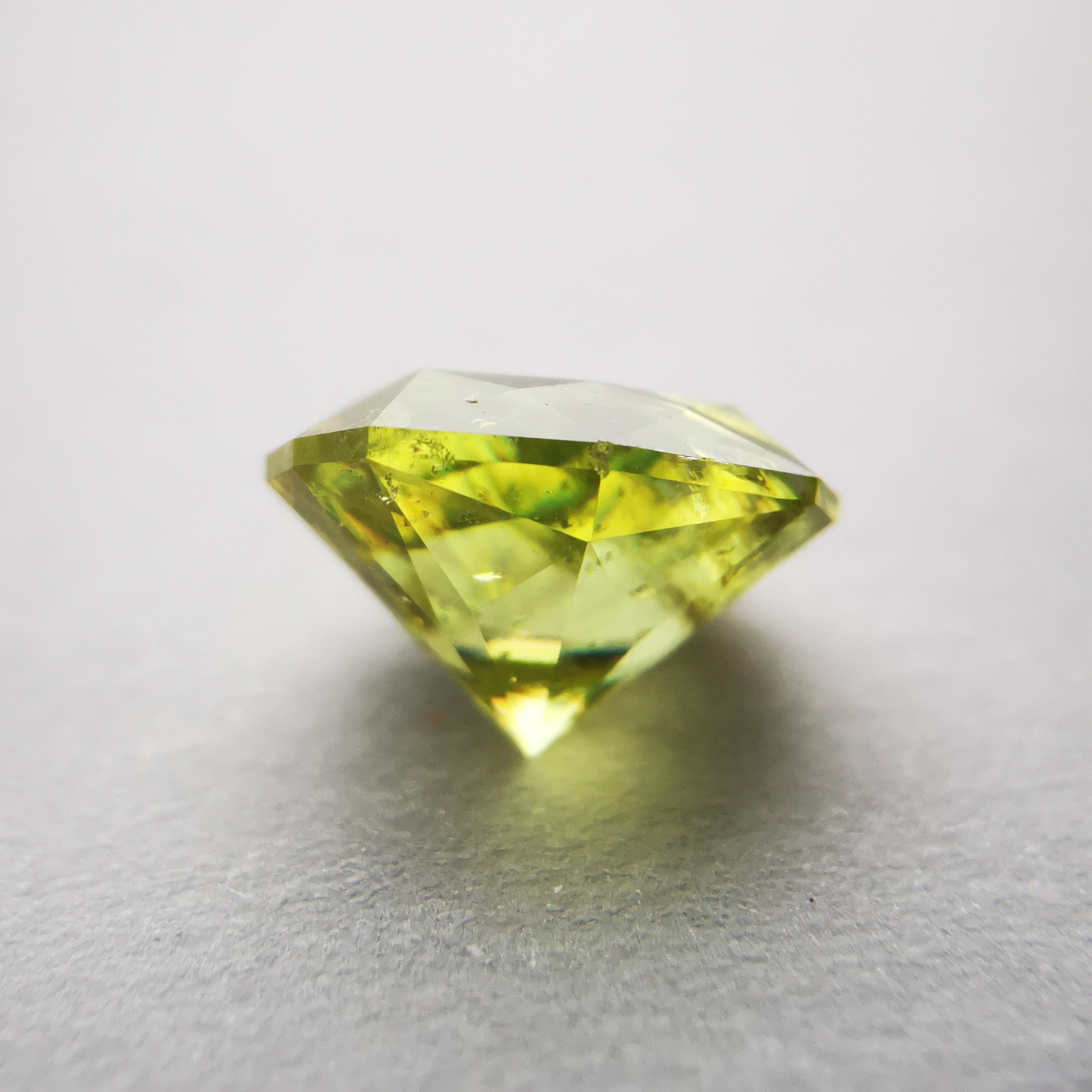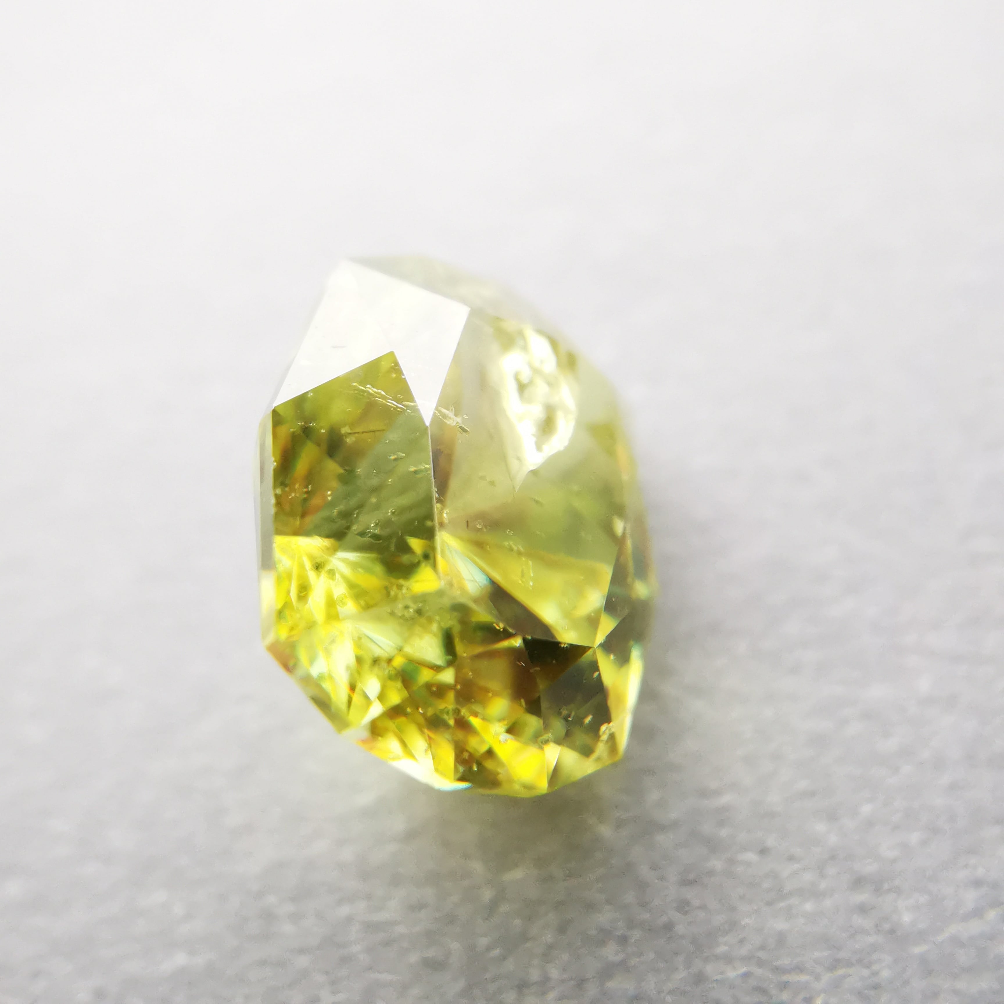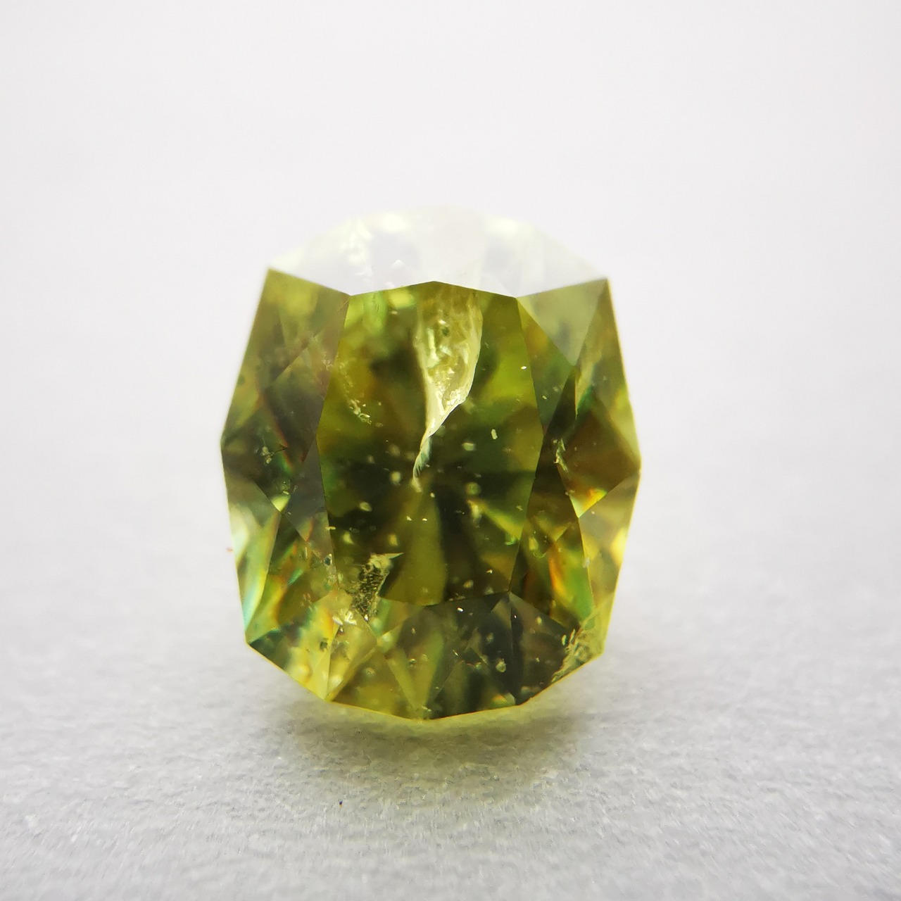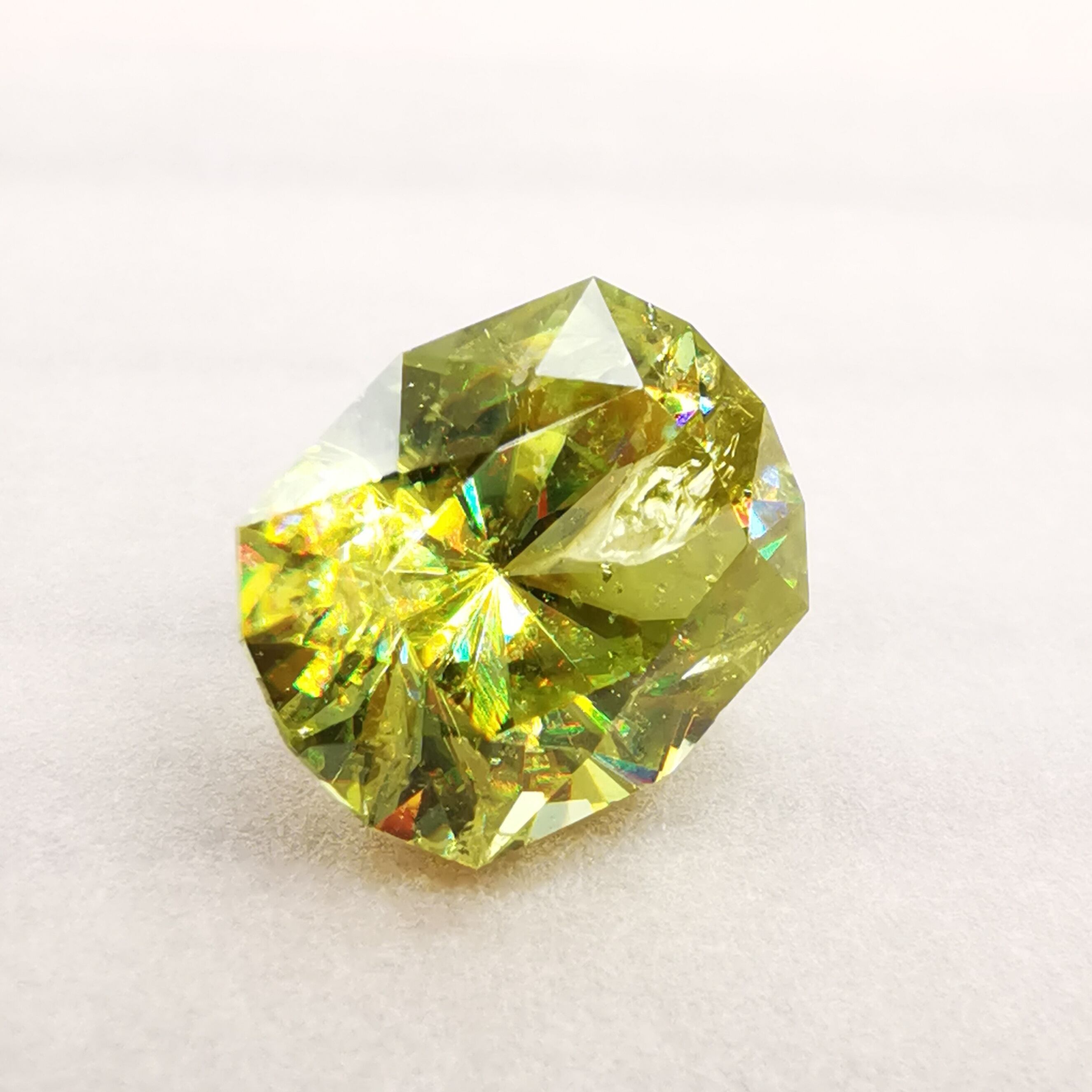 イエローグリーンの中に、舞い散る花びらのようなインクルージョンと風にたなびくようなクラックが入っています。