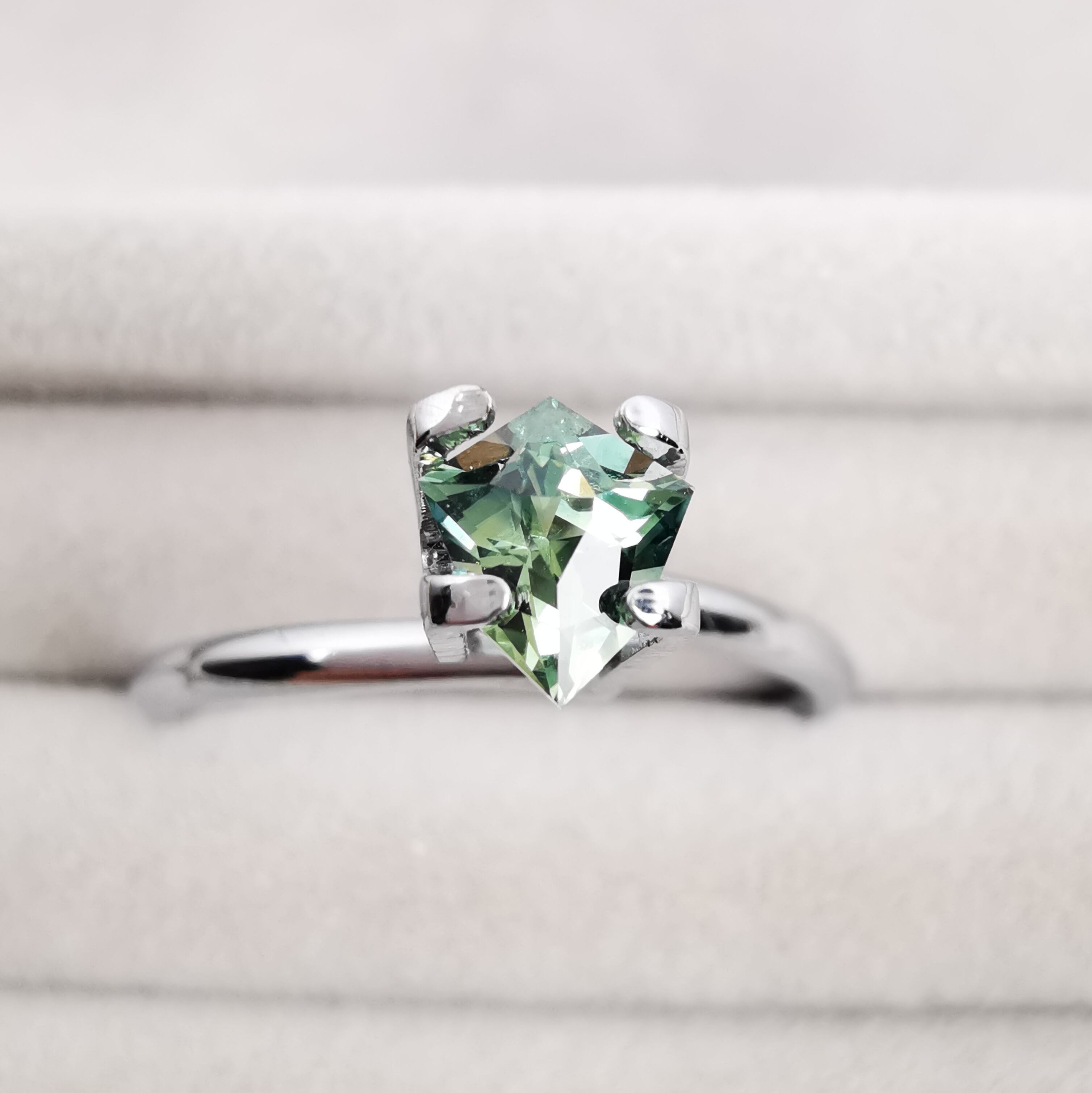 クールなシールドカットに、よくきらめくクリアなカラーが調和する一石です。