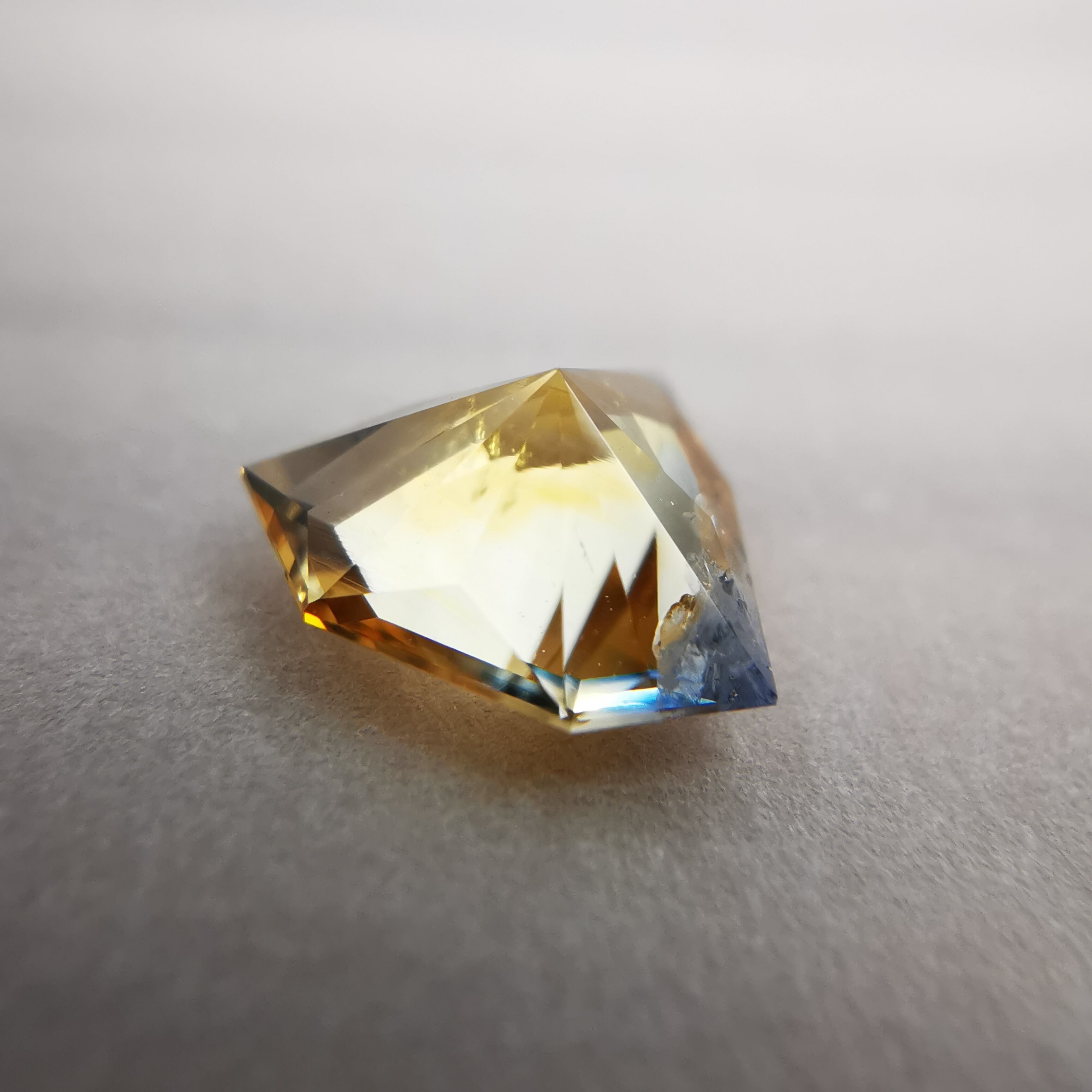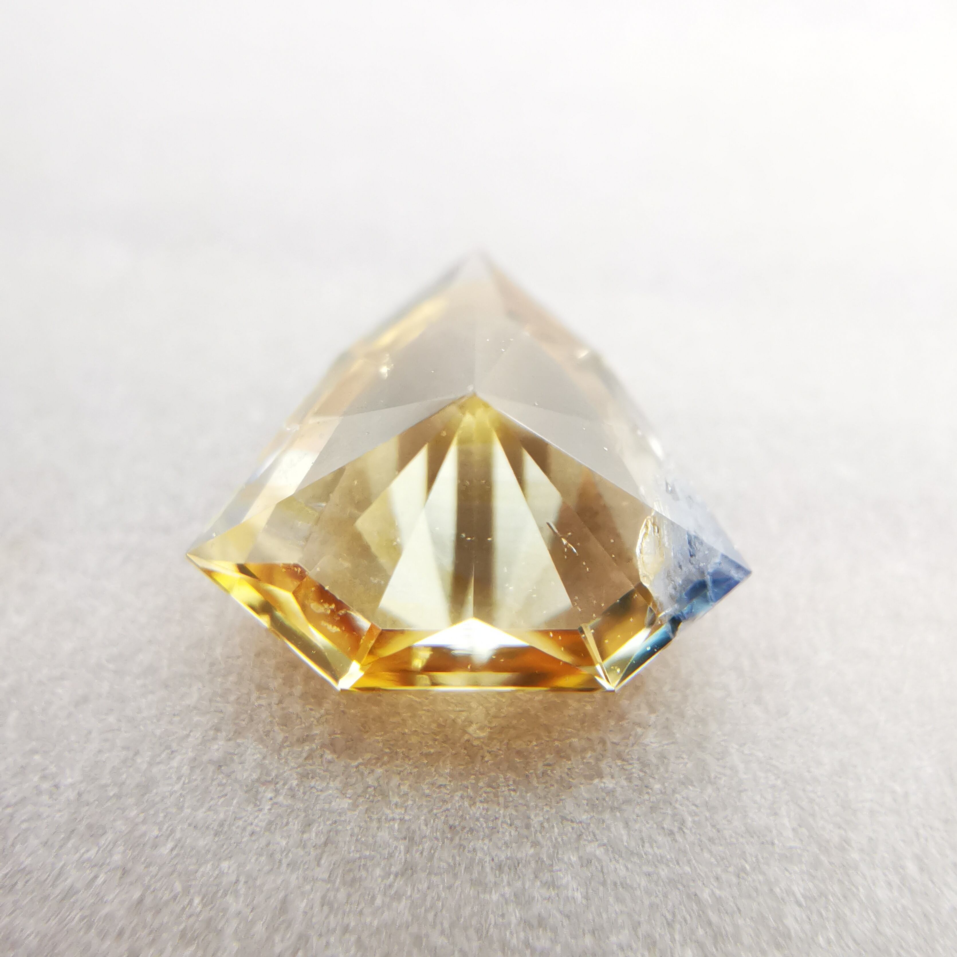 明るく温かみのあるイエローに、片方の肩の部分にブルーが入るバイカラーのサファイアです。