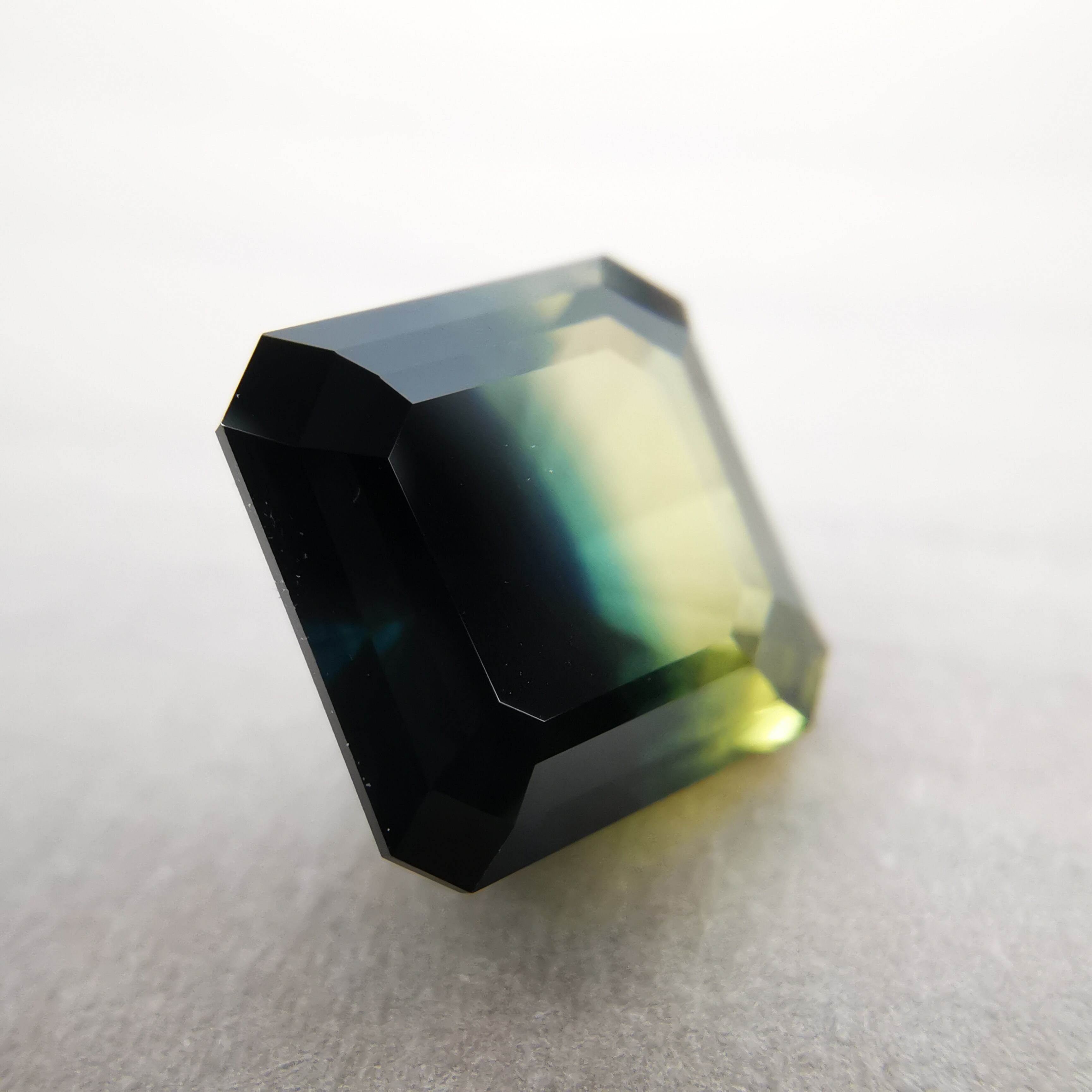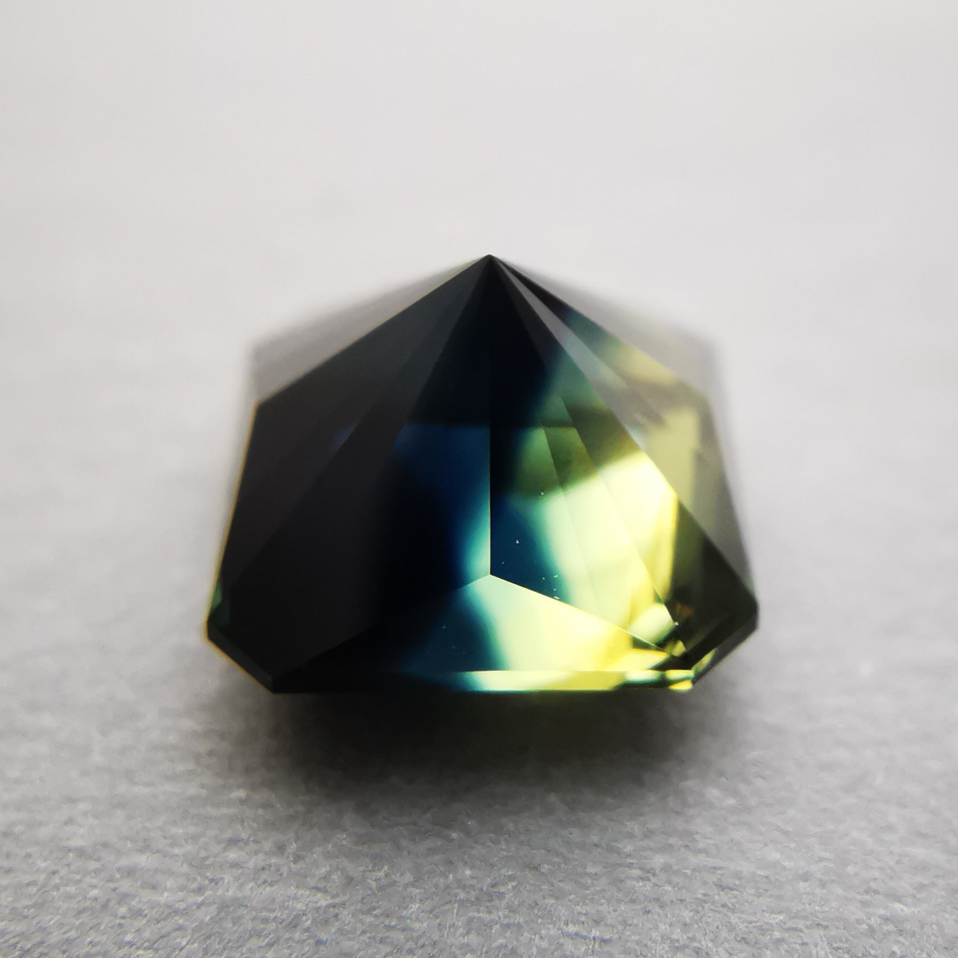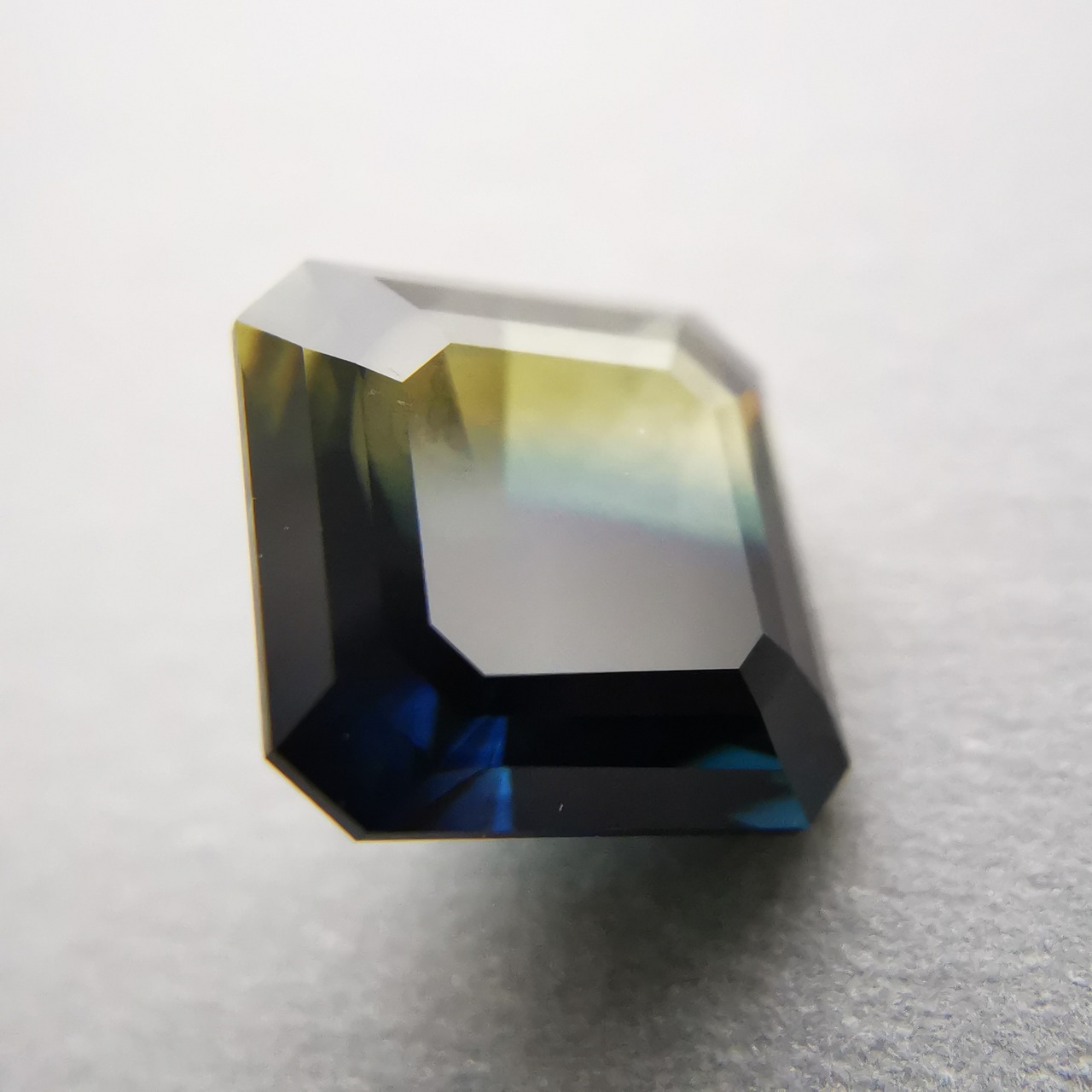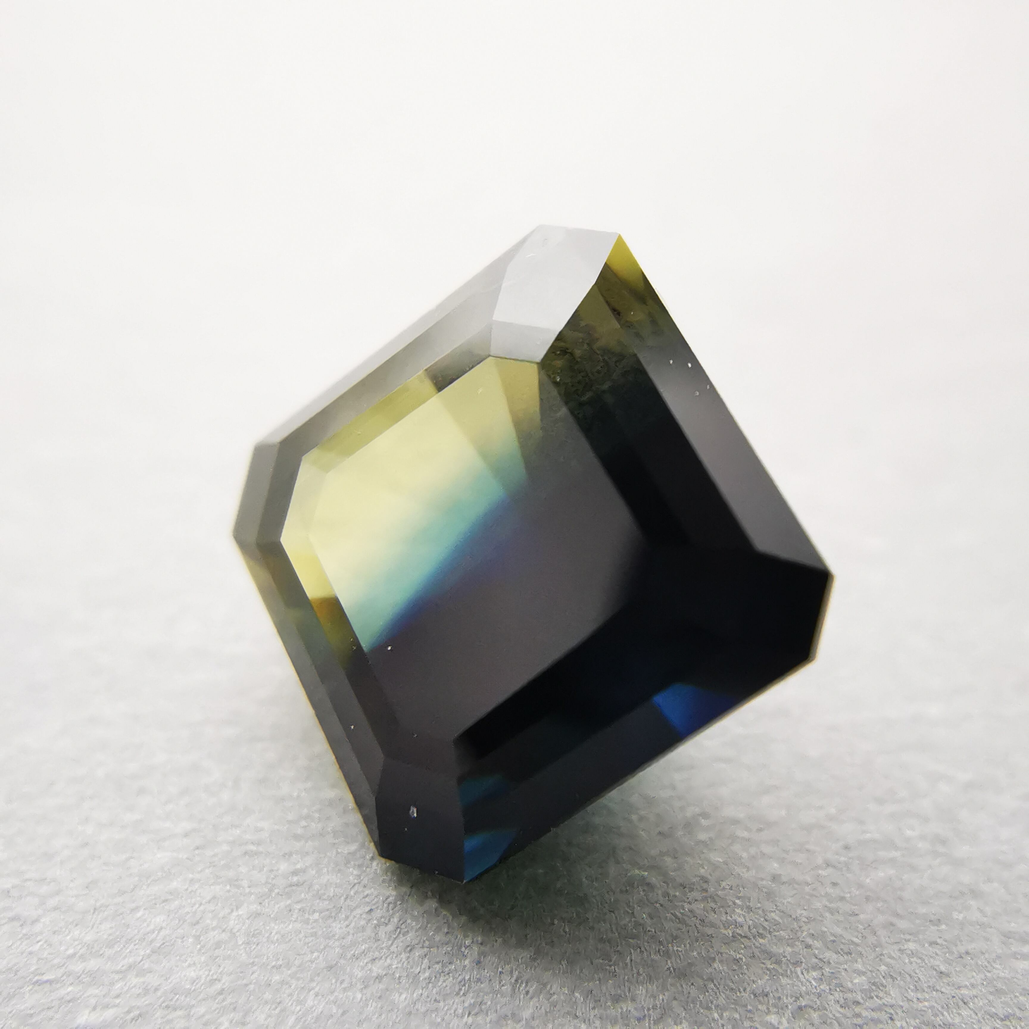 ルースケースの中では全体がほぼ黒く見えますが、取り出してみると印象ががらりと変わり、黒に近いブルーと、イエローがはっきりと分かれたバイカラーサファイアです。