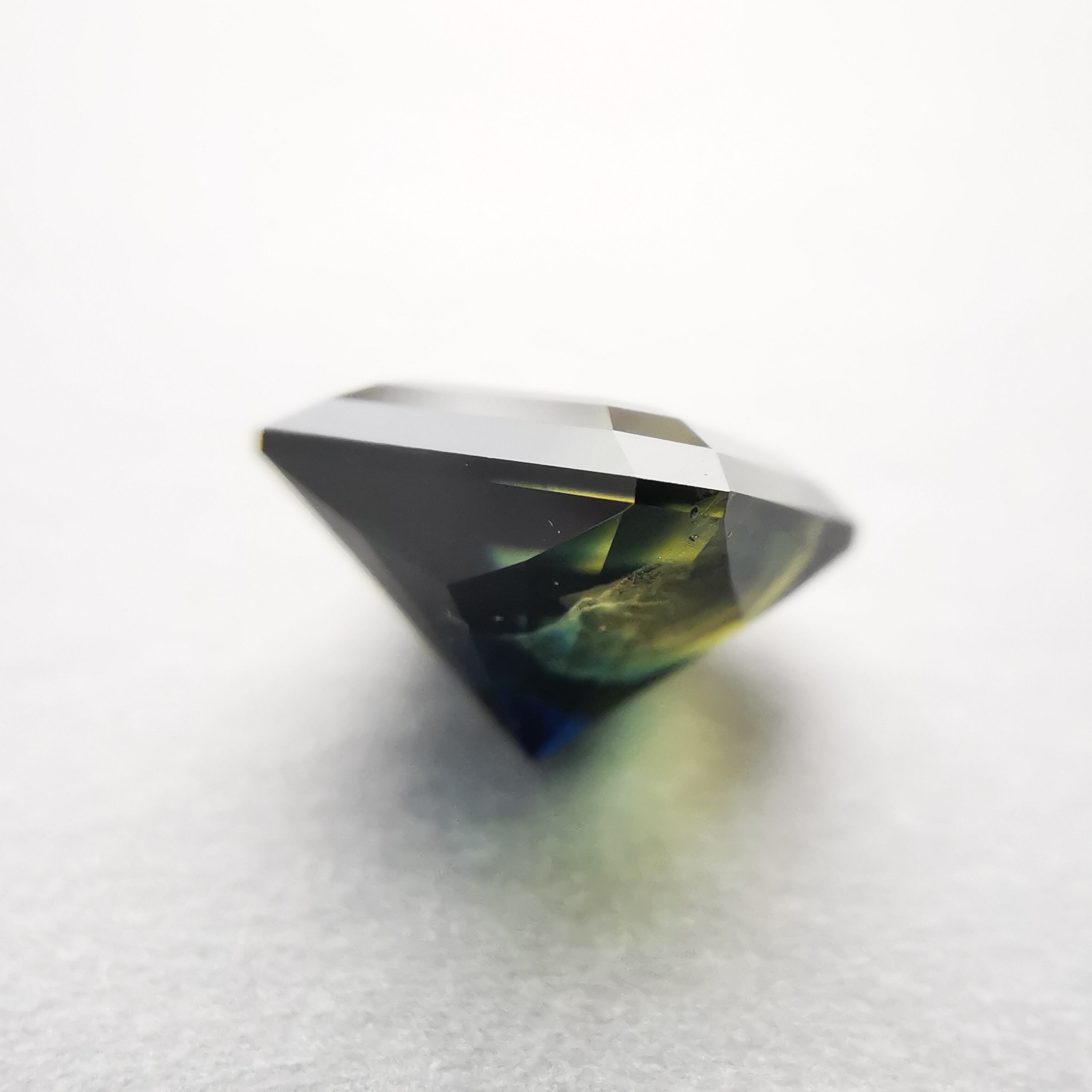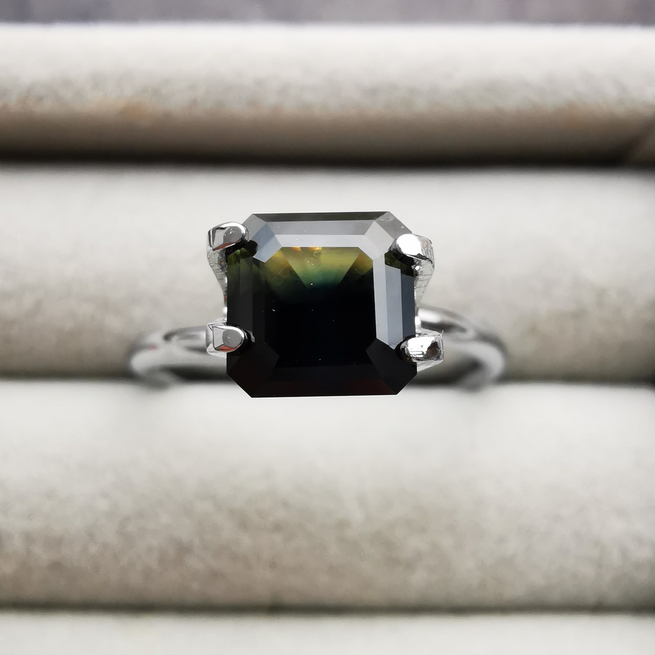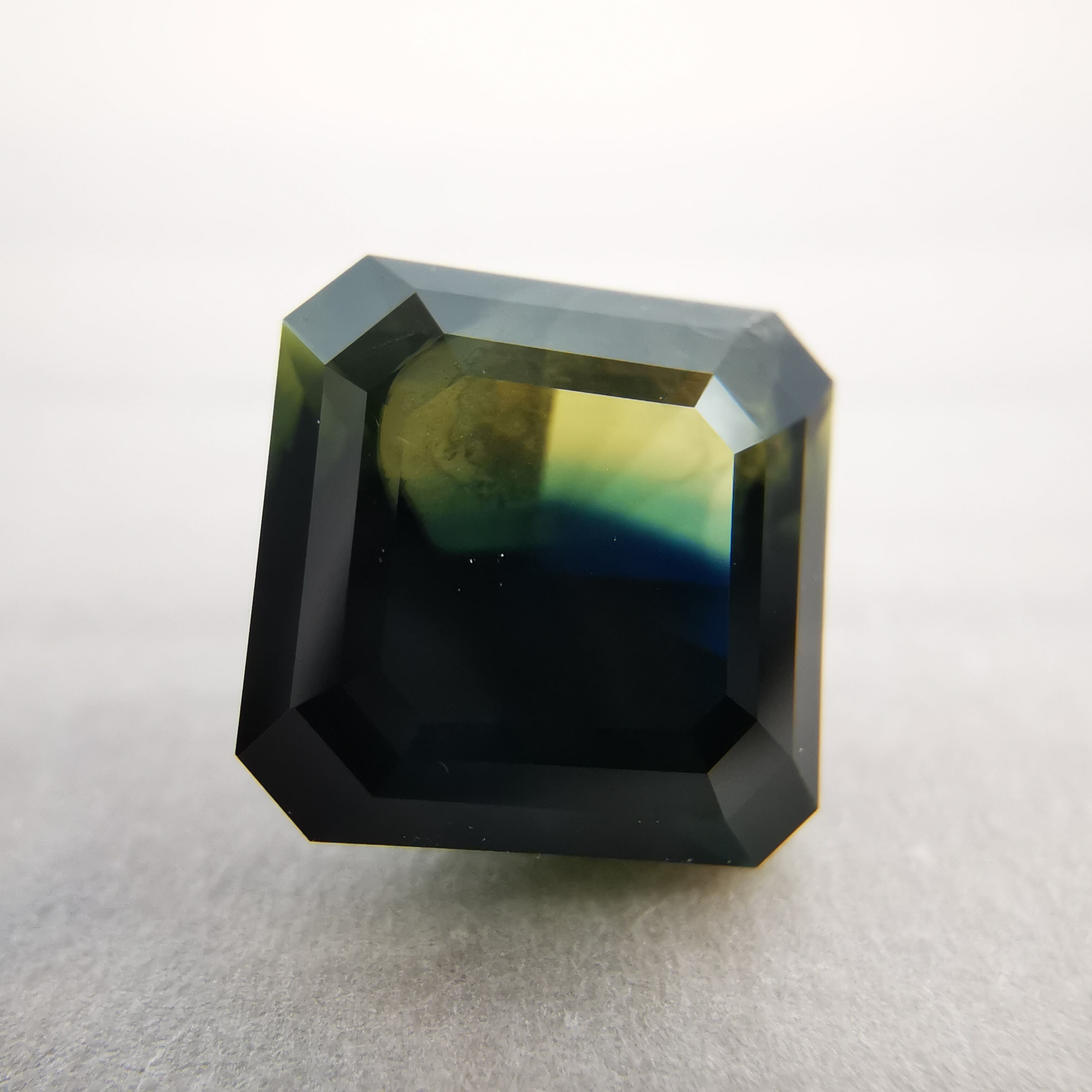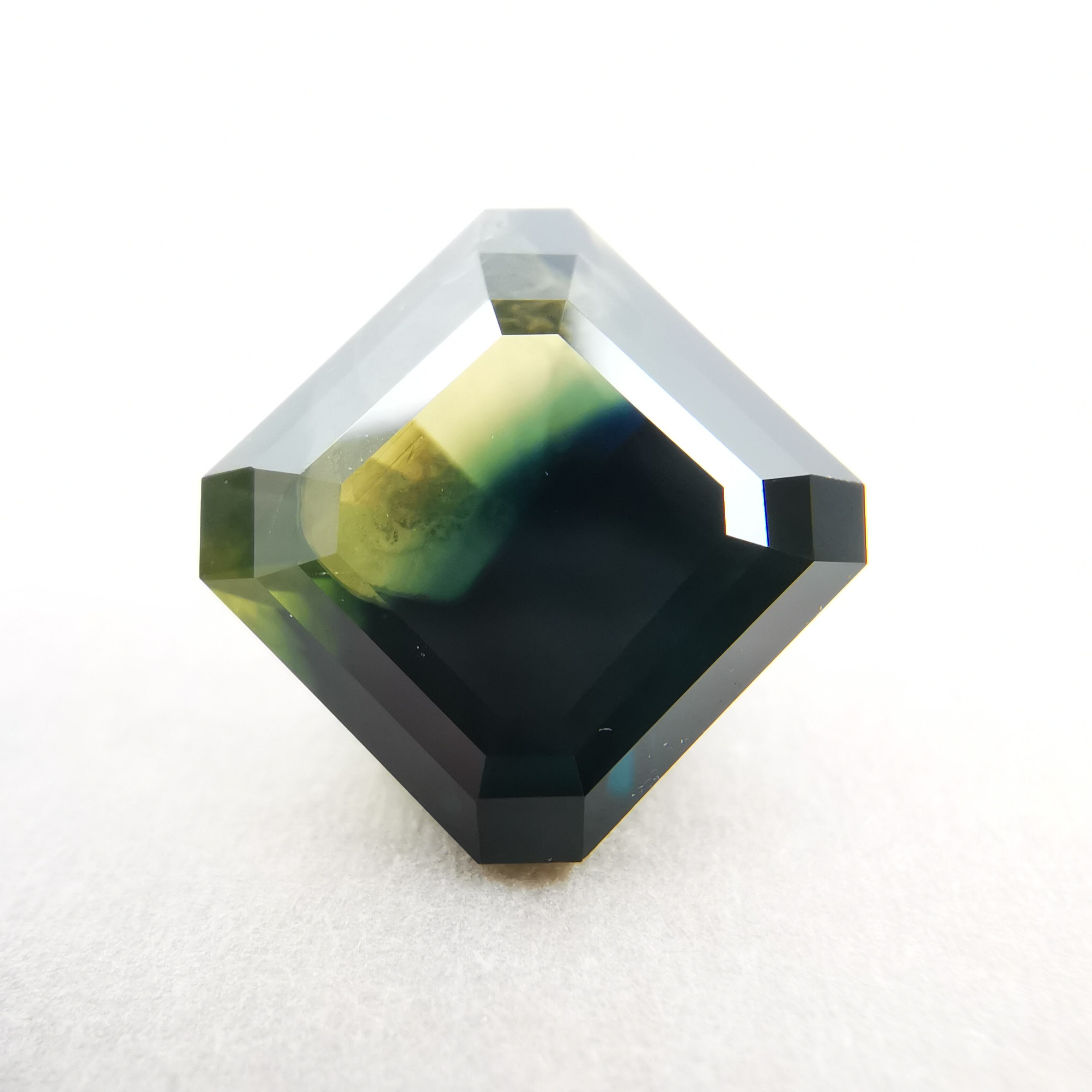 ルースケースの中では全体がほぼ黒く見えますが、取り出してみると印象ががらりと変わり、黒に近いブルーと、イエローがはっきりと分かれたバイカラーサファイアです。