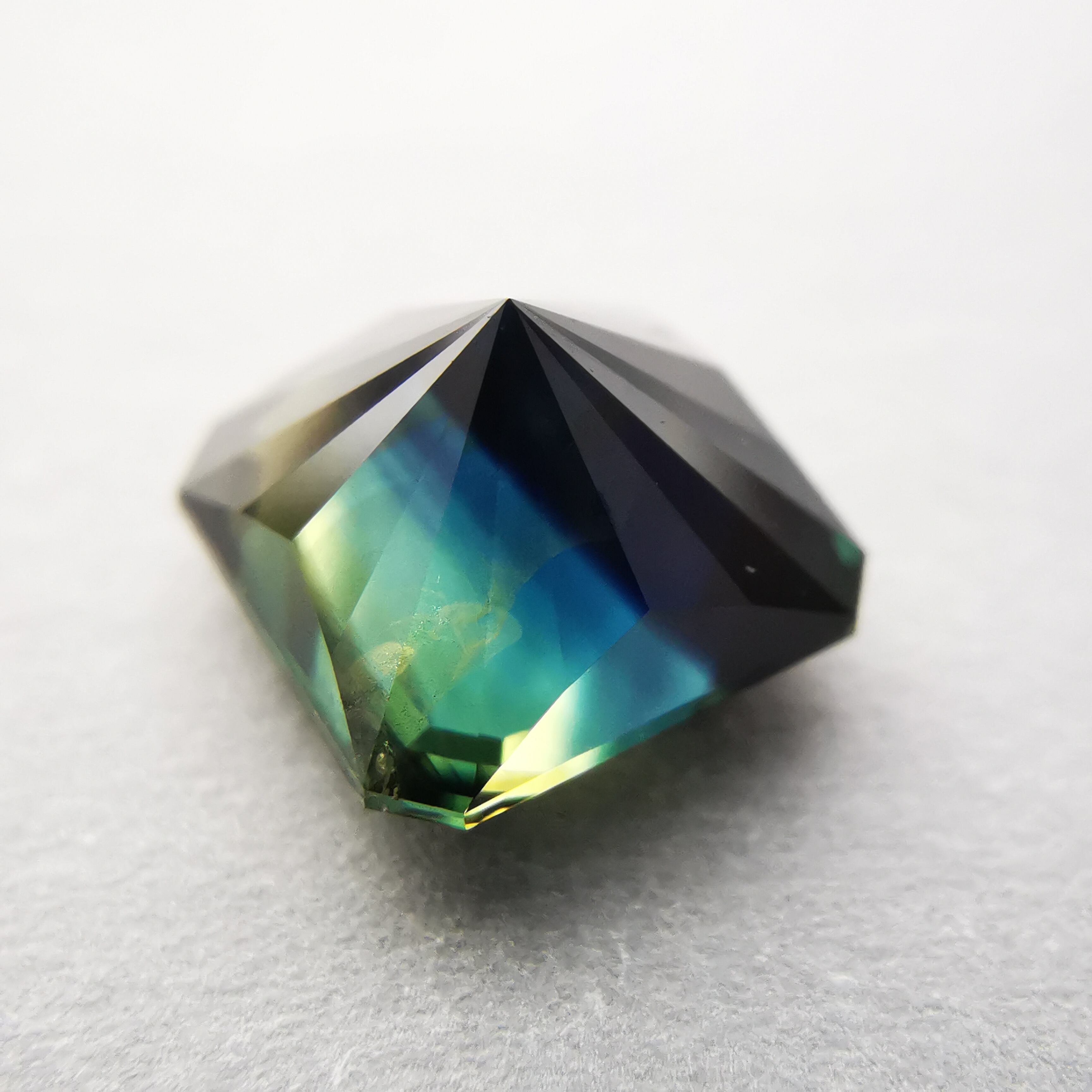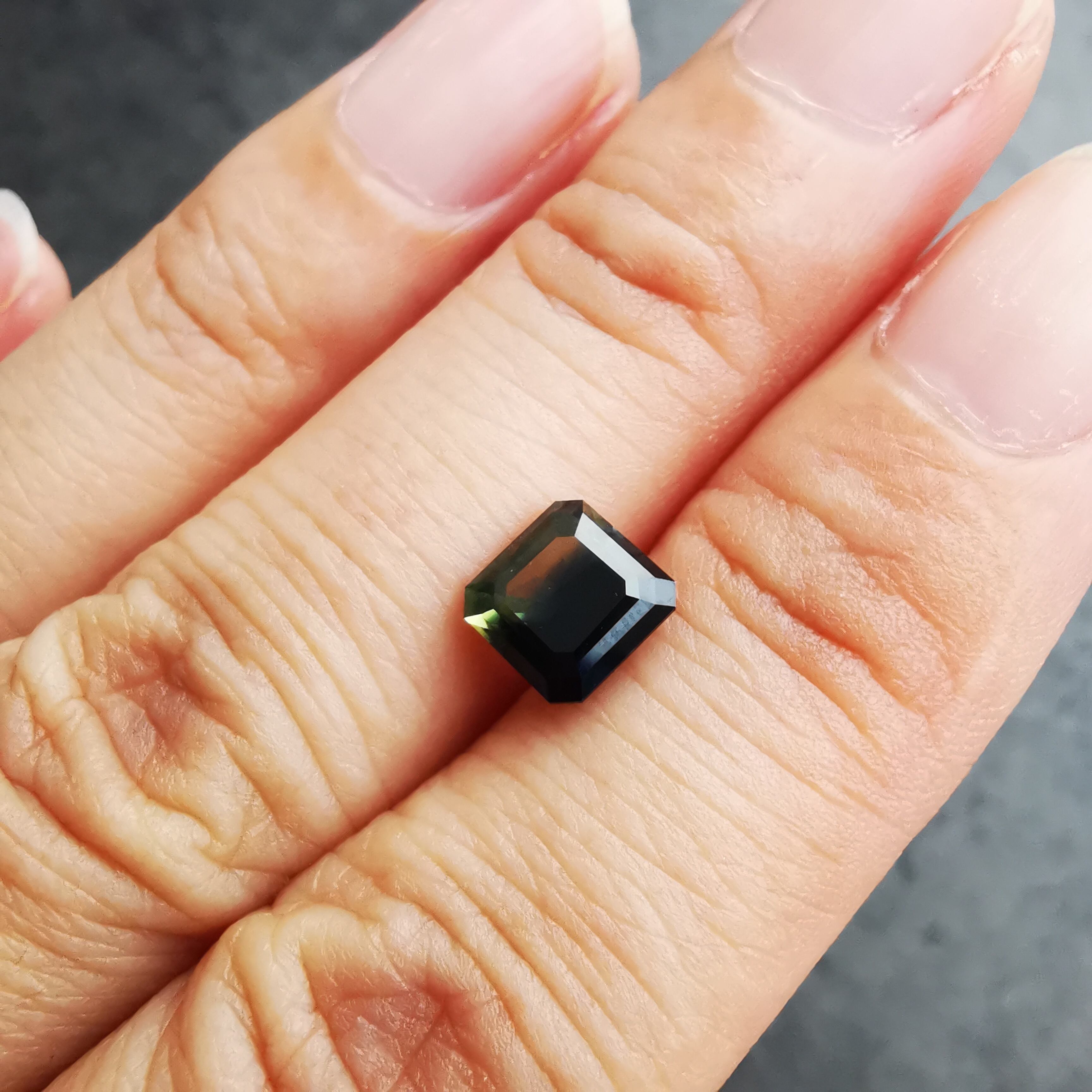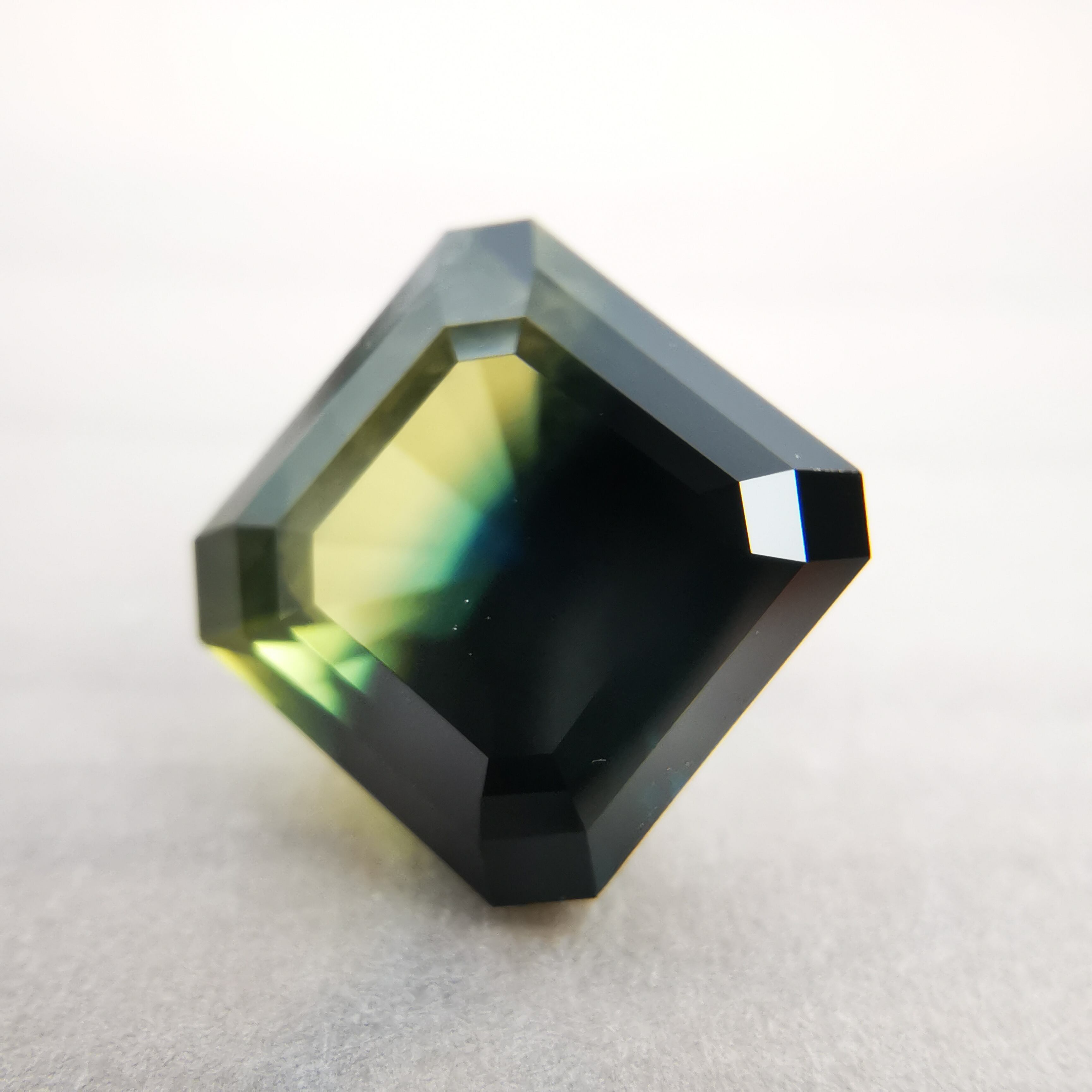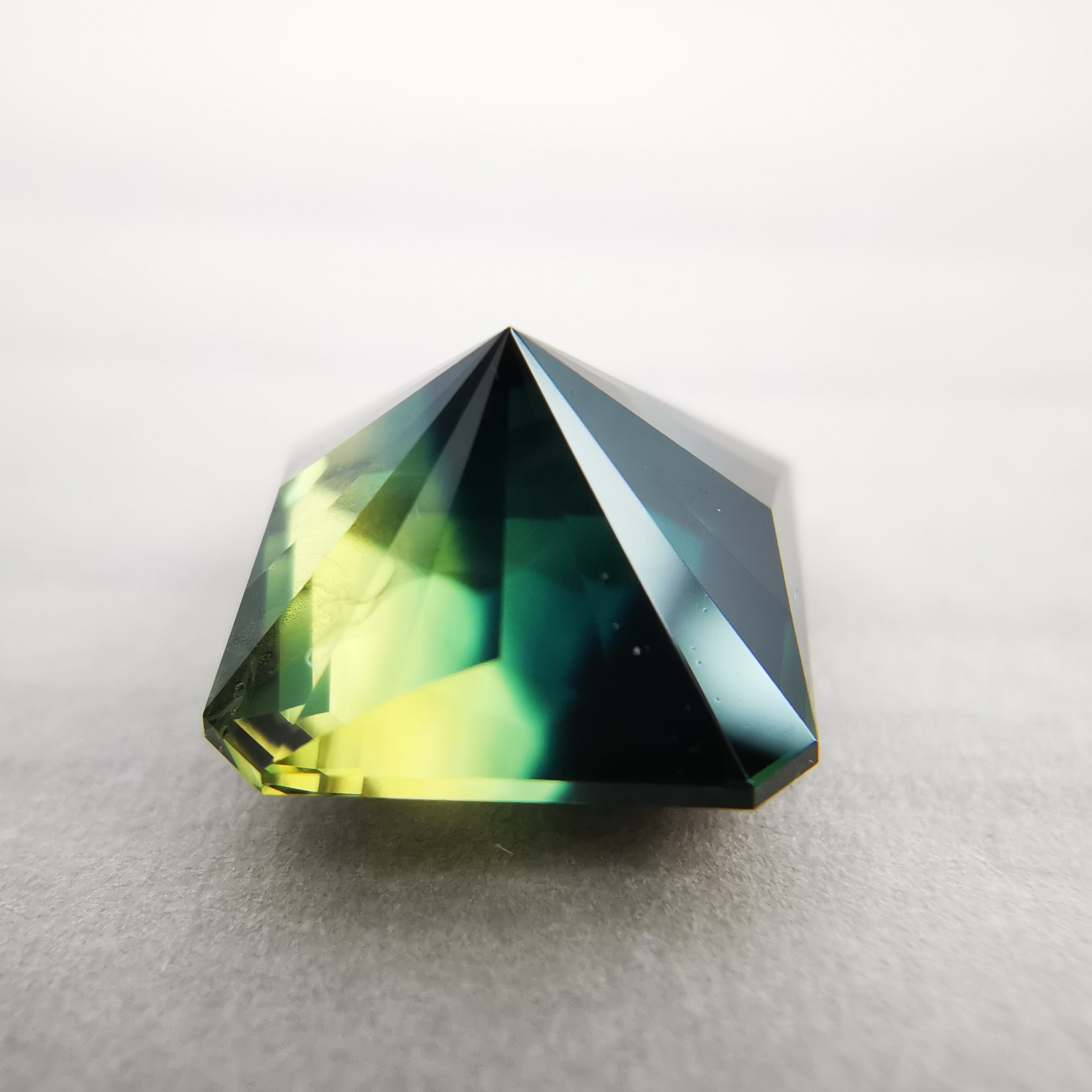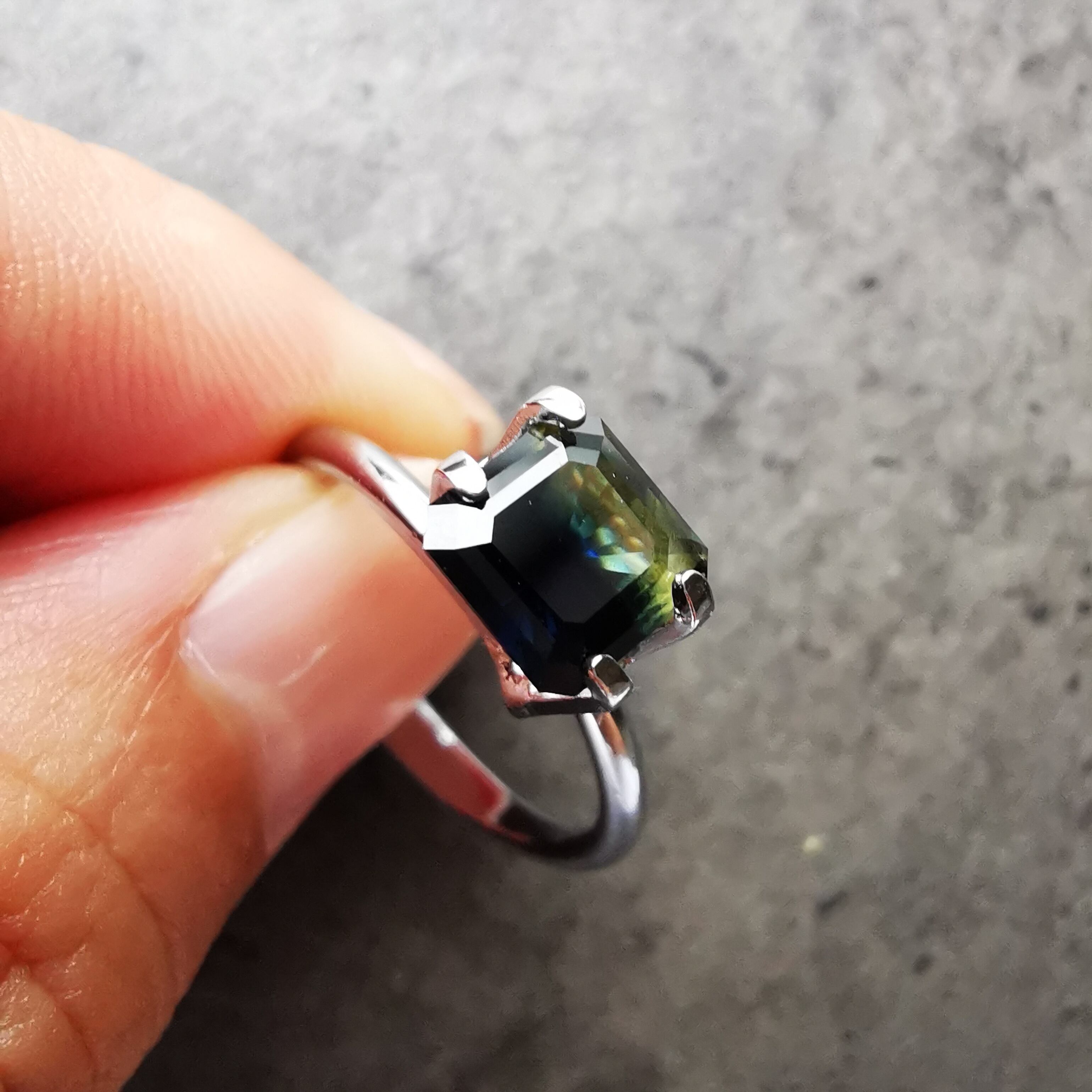 ルースケースの中では全体がほぼ黒く見えますが、取り出してみると印象ががらりと変わり、黒に近いブルーと、イエローがはっきりと分かれたバイカラーサファイアです。