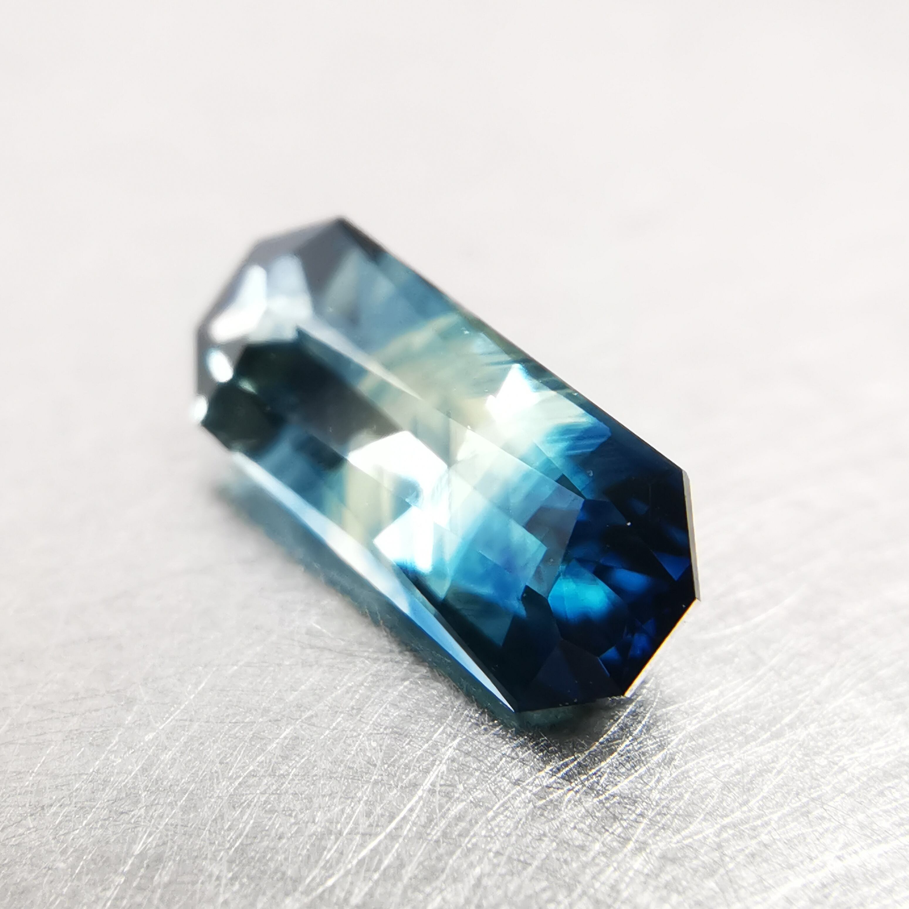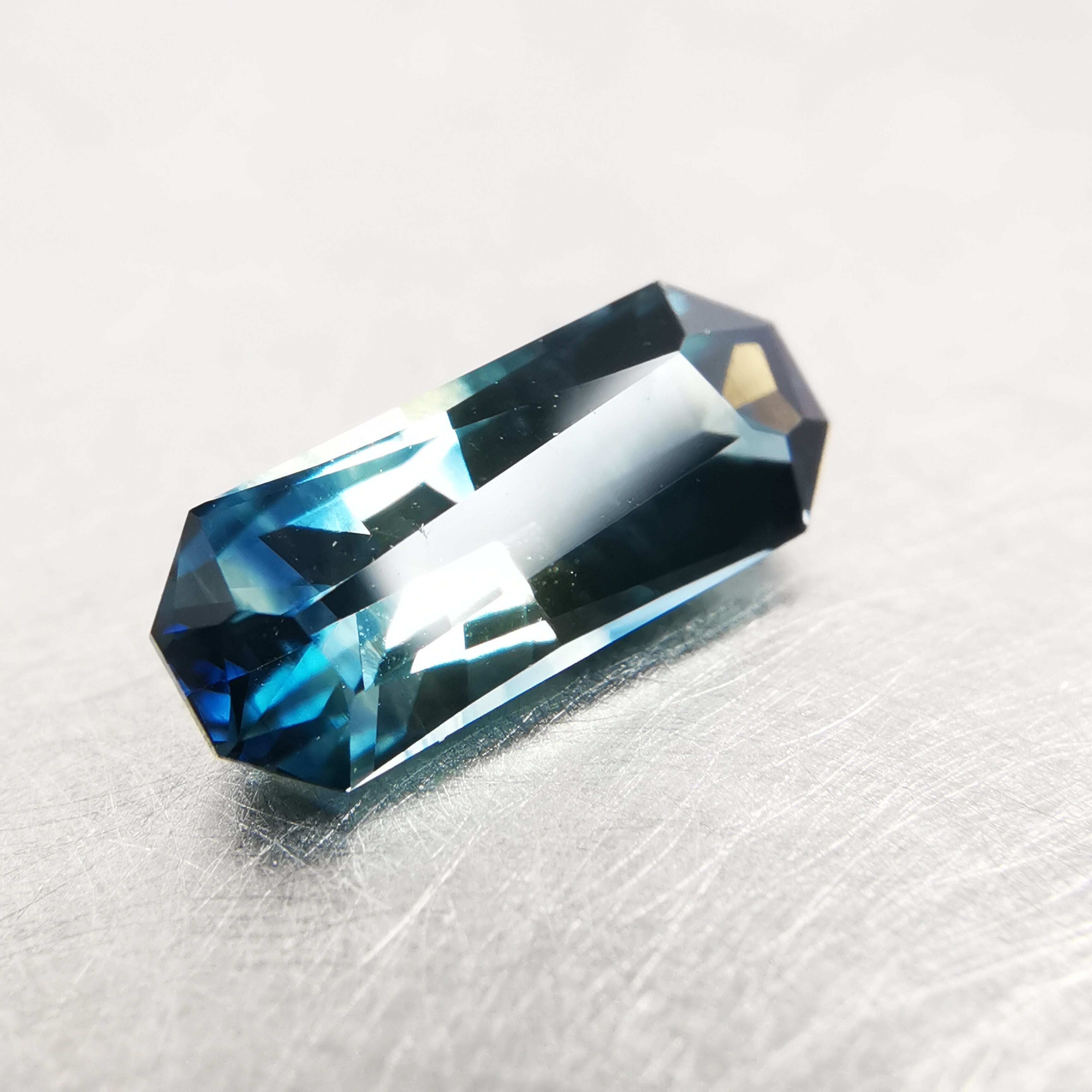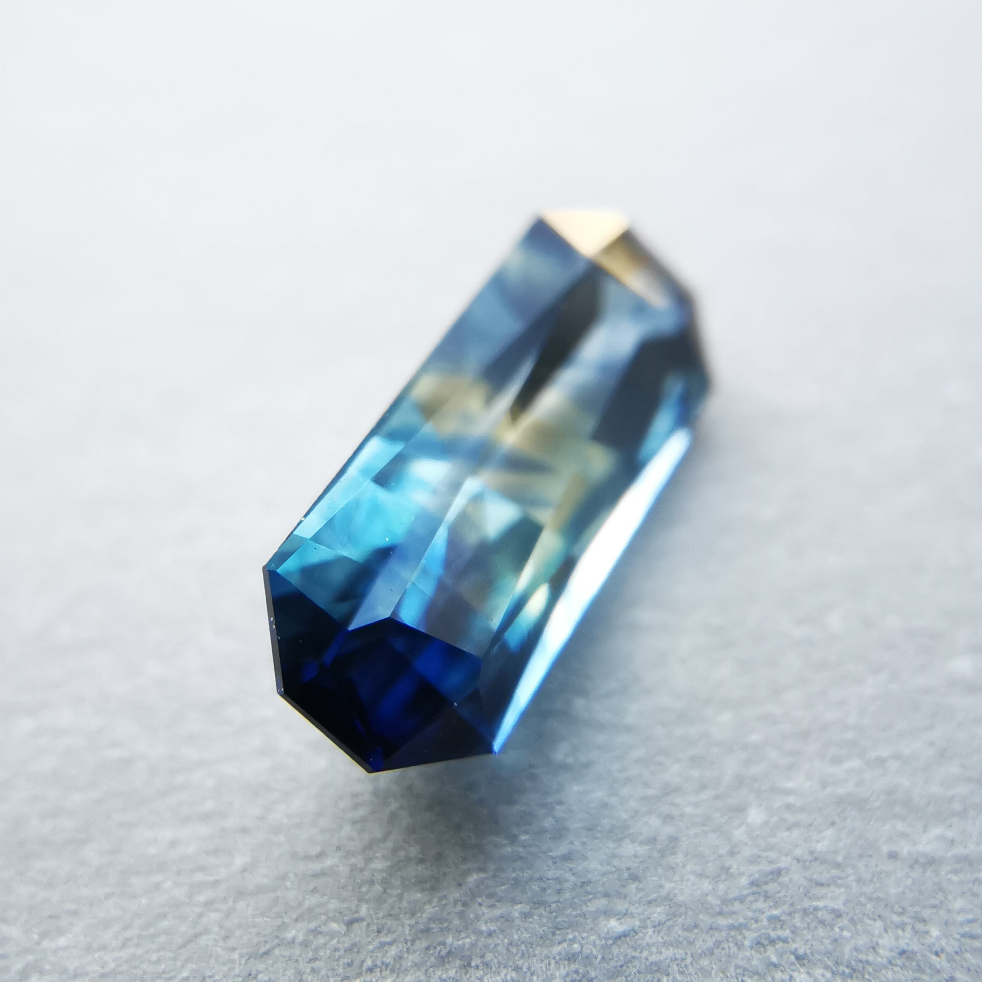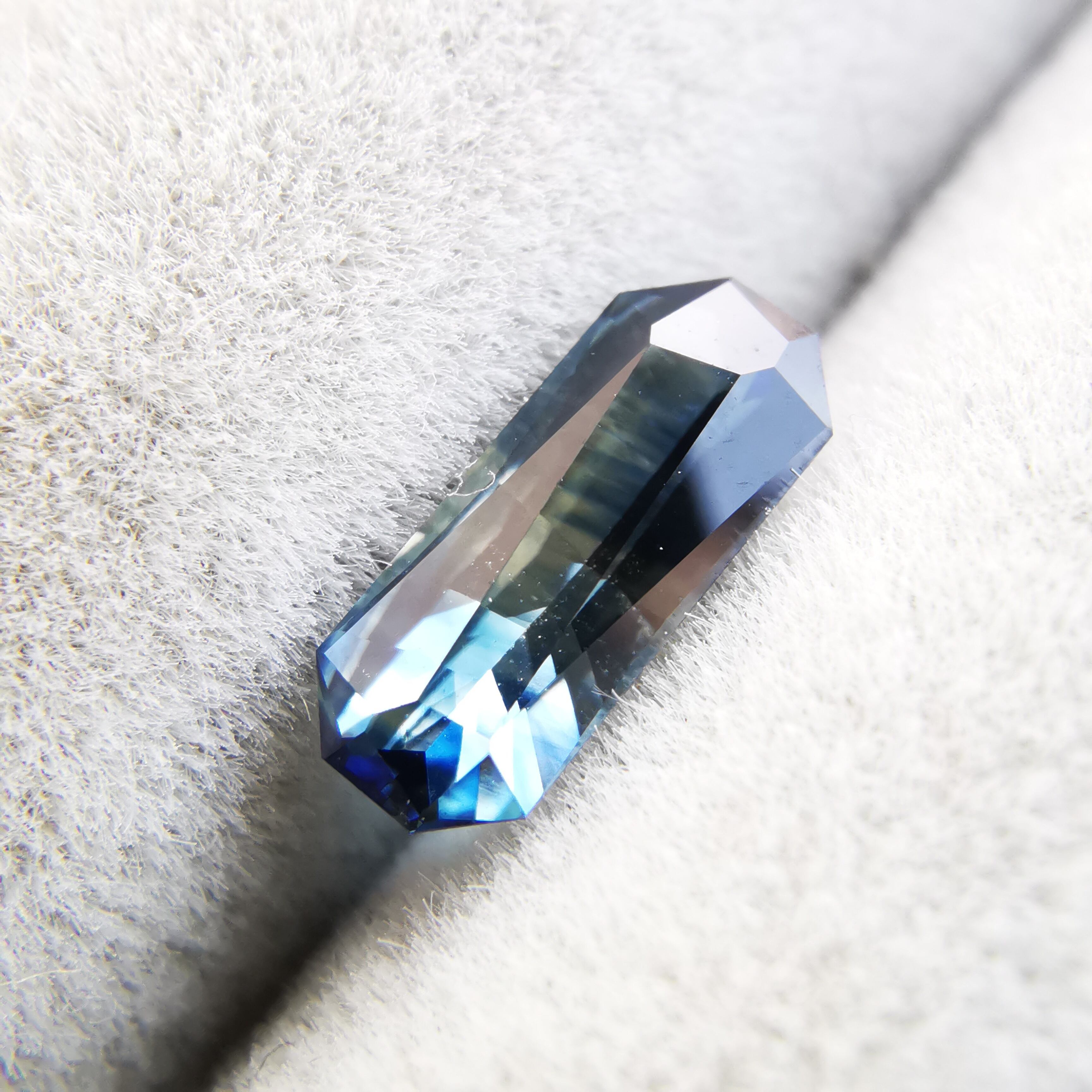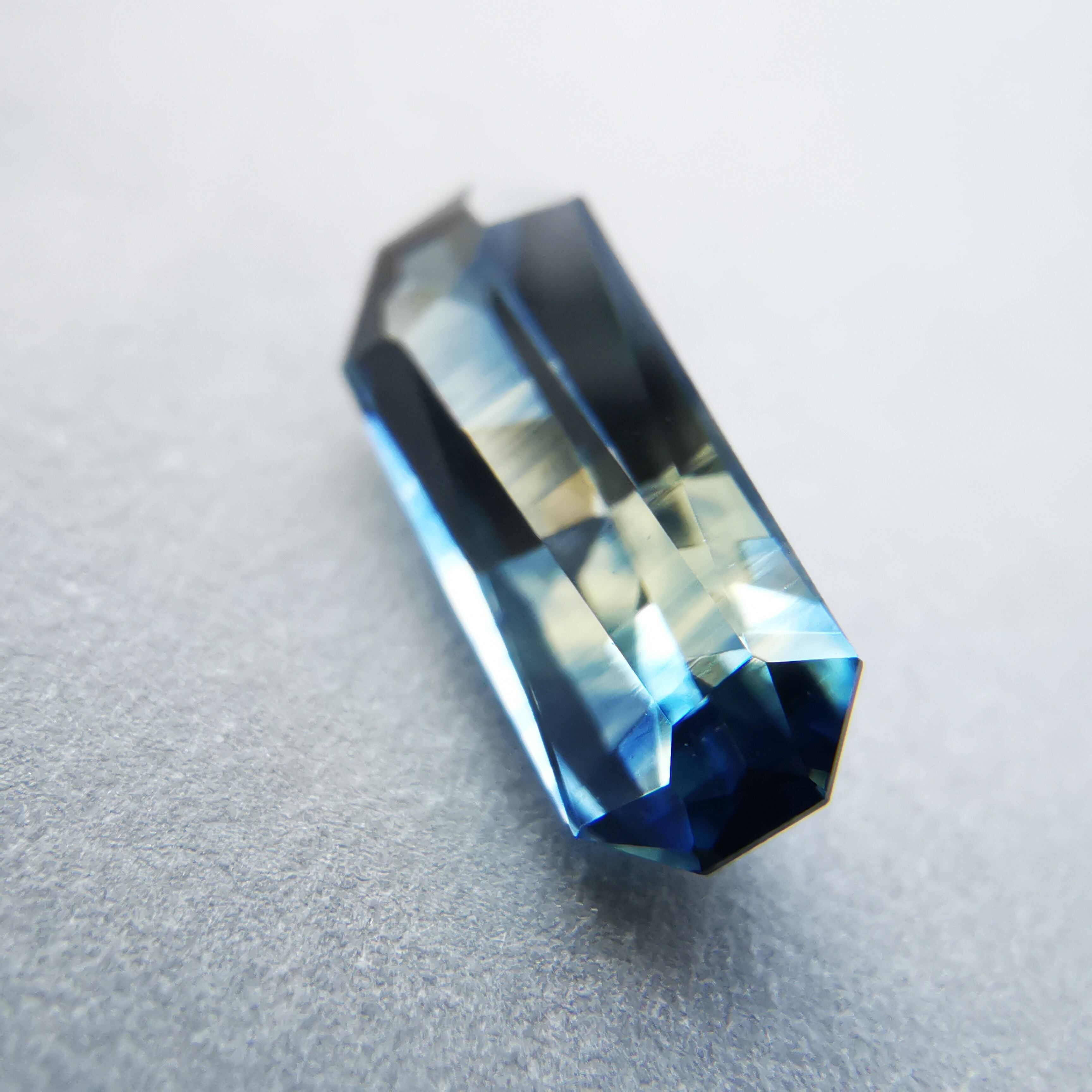 テーブル面にひねりのあるデザインのカットが施られており、掴みどころのない複雑な色とカットが魅力のバイカラーサファイアです。