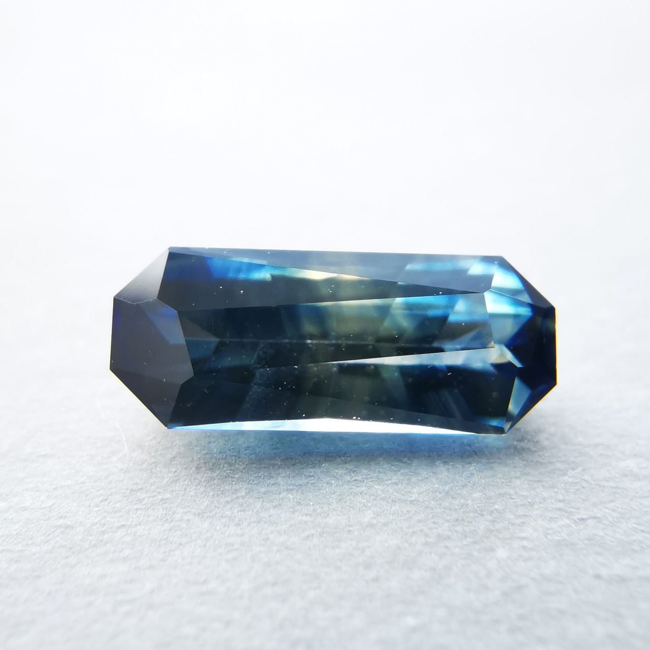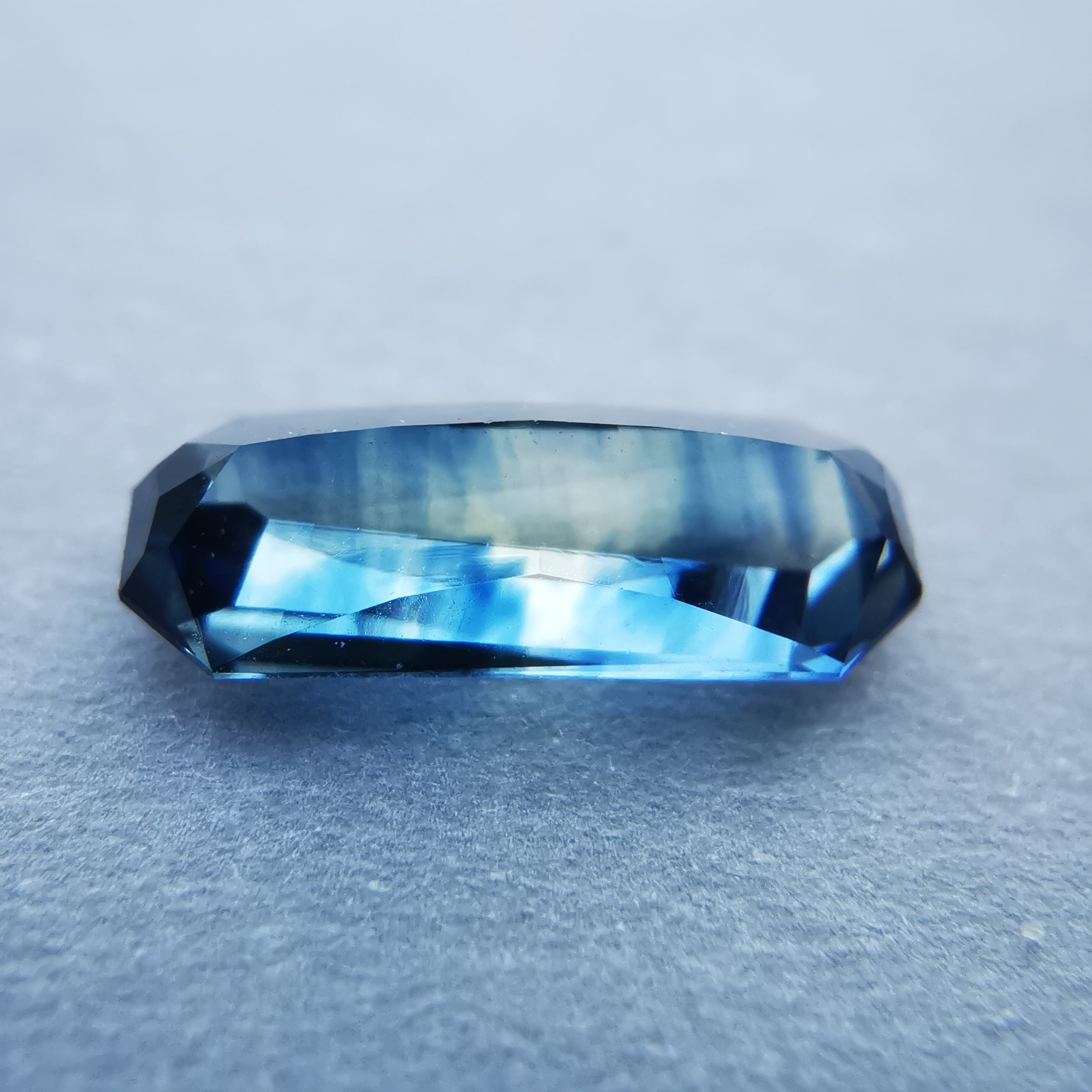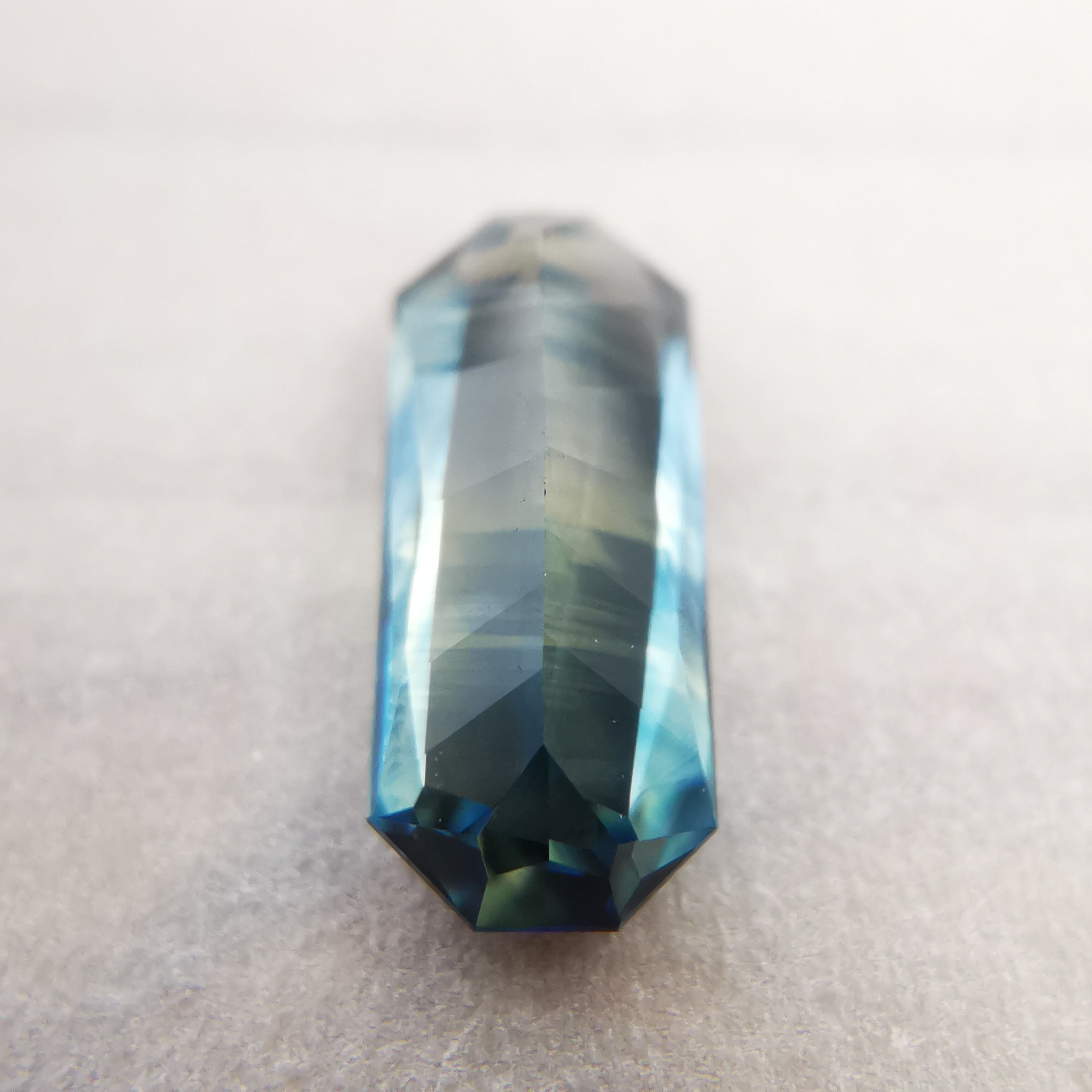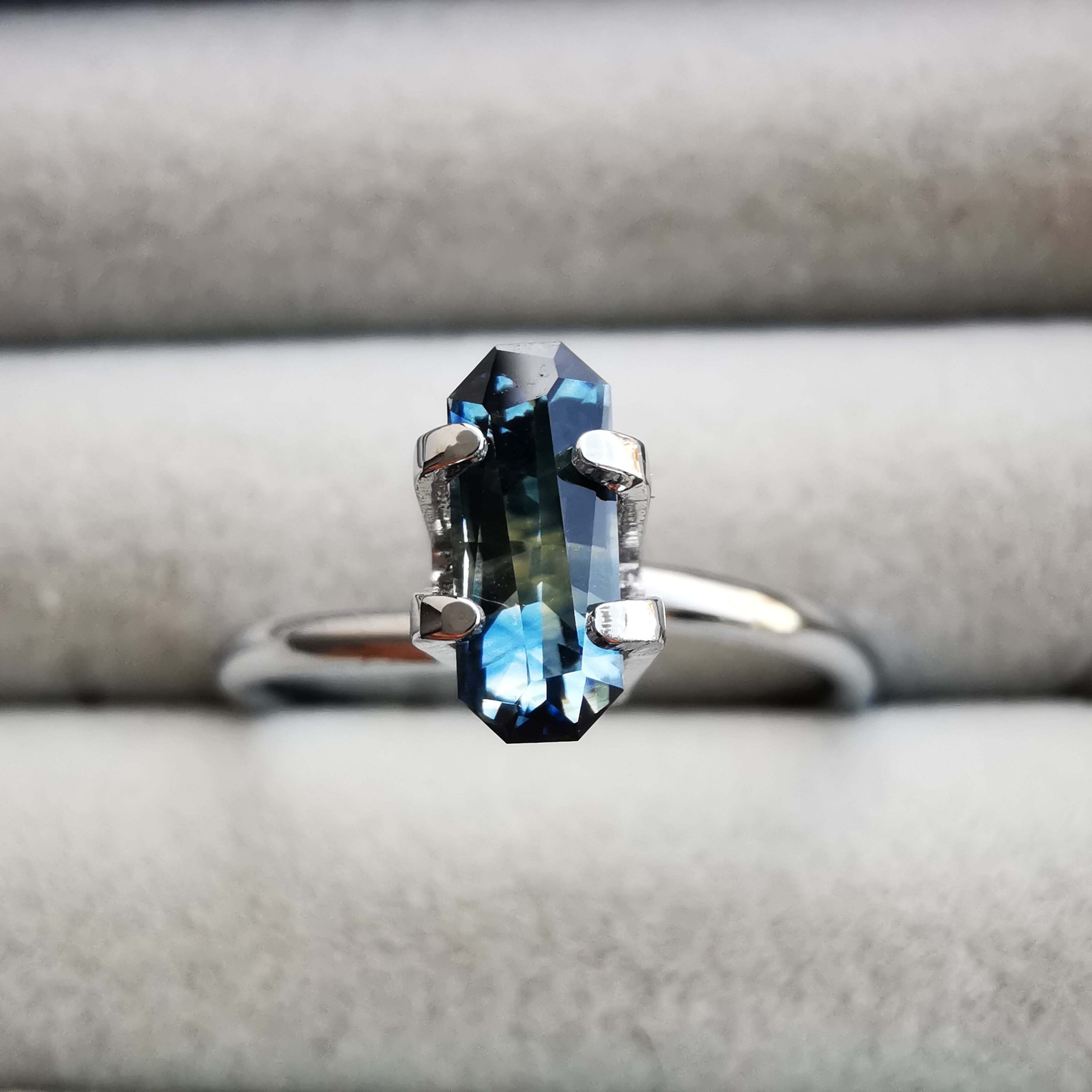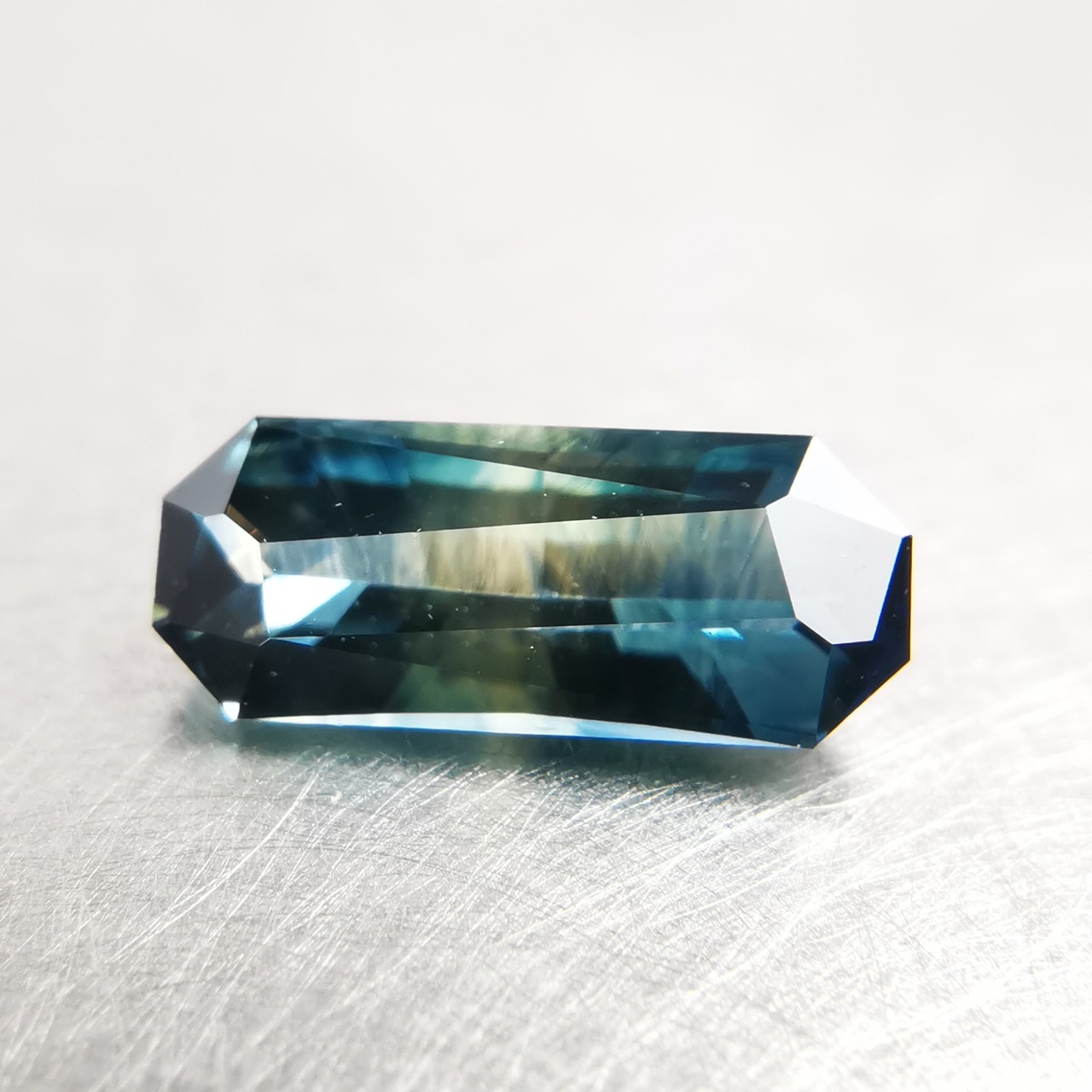テーブル面にひねりのあるデザインのカットが施られており、掴みどころのない複雑な色とカットが魅力のバイカラーサファイアです。