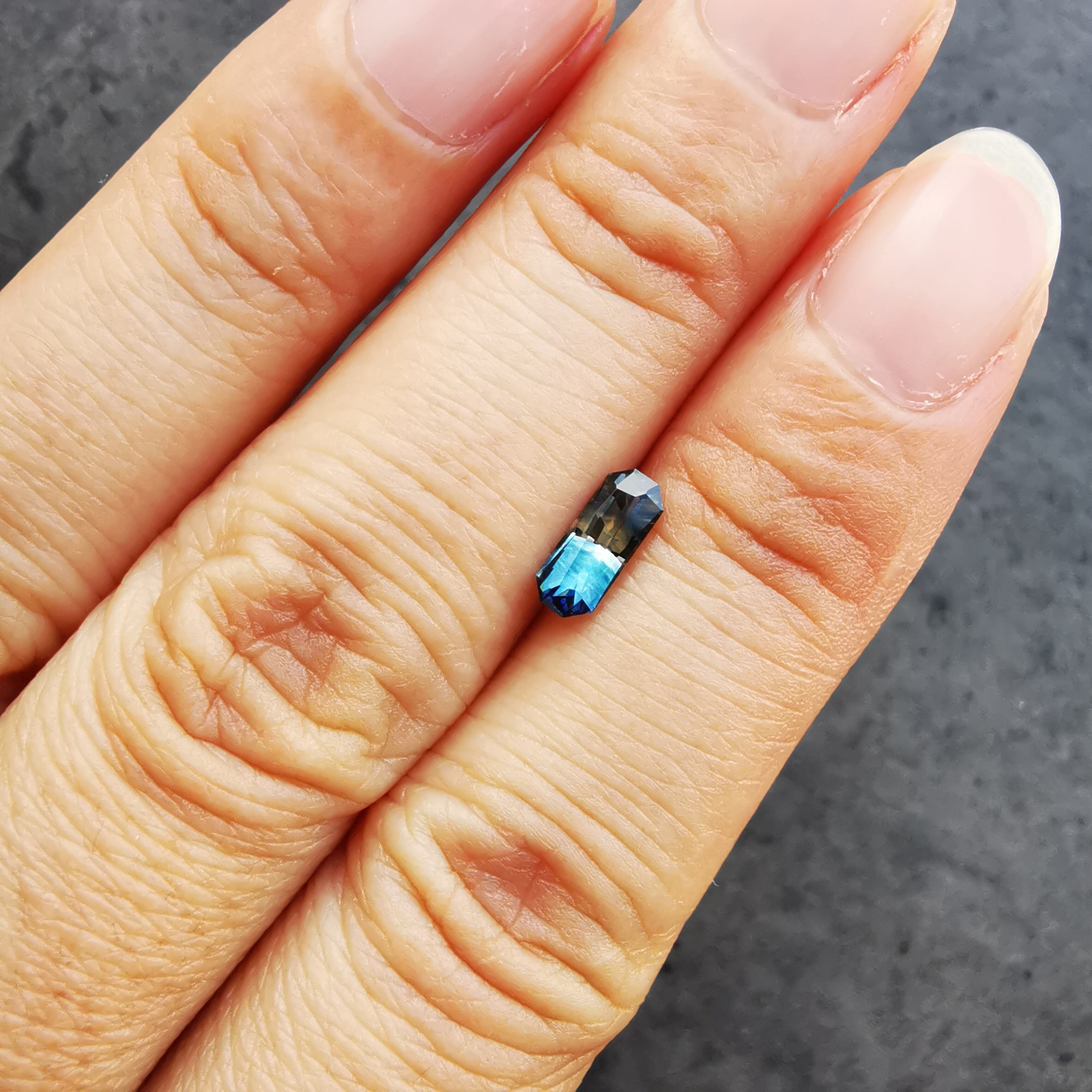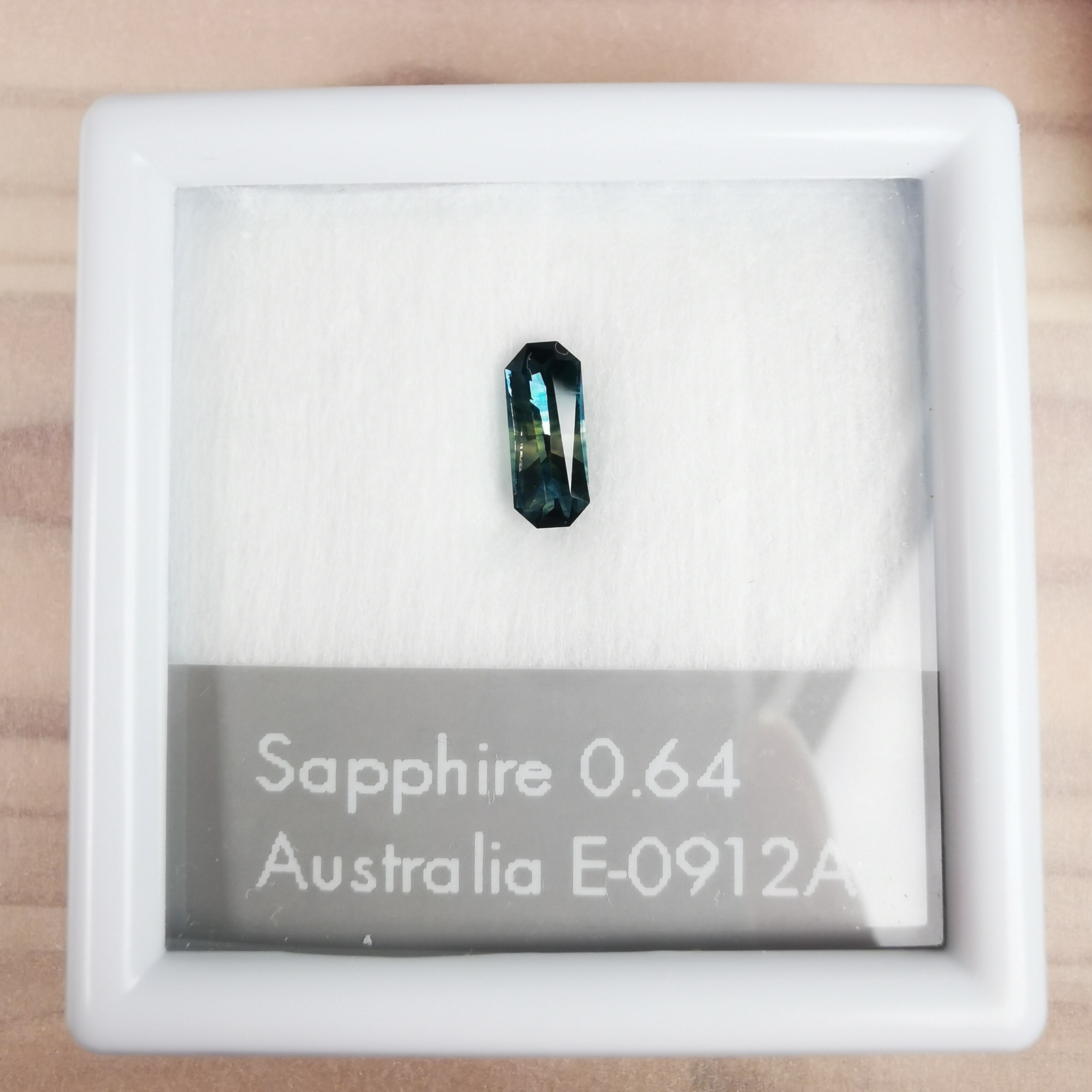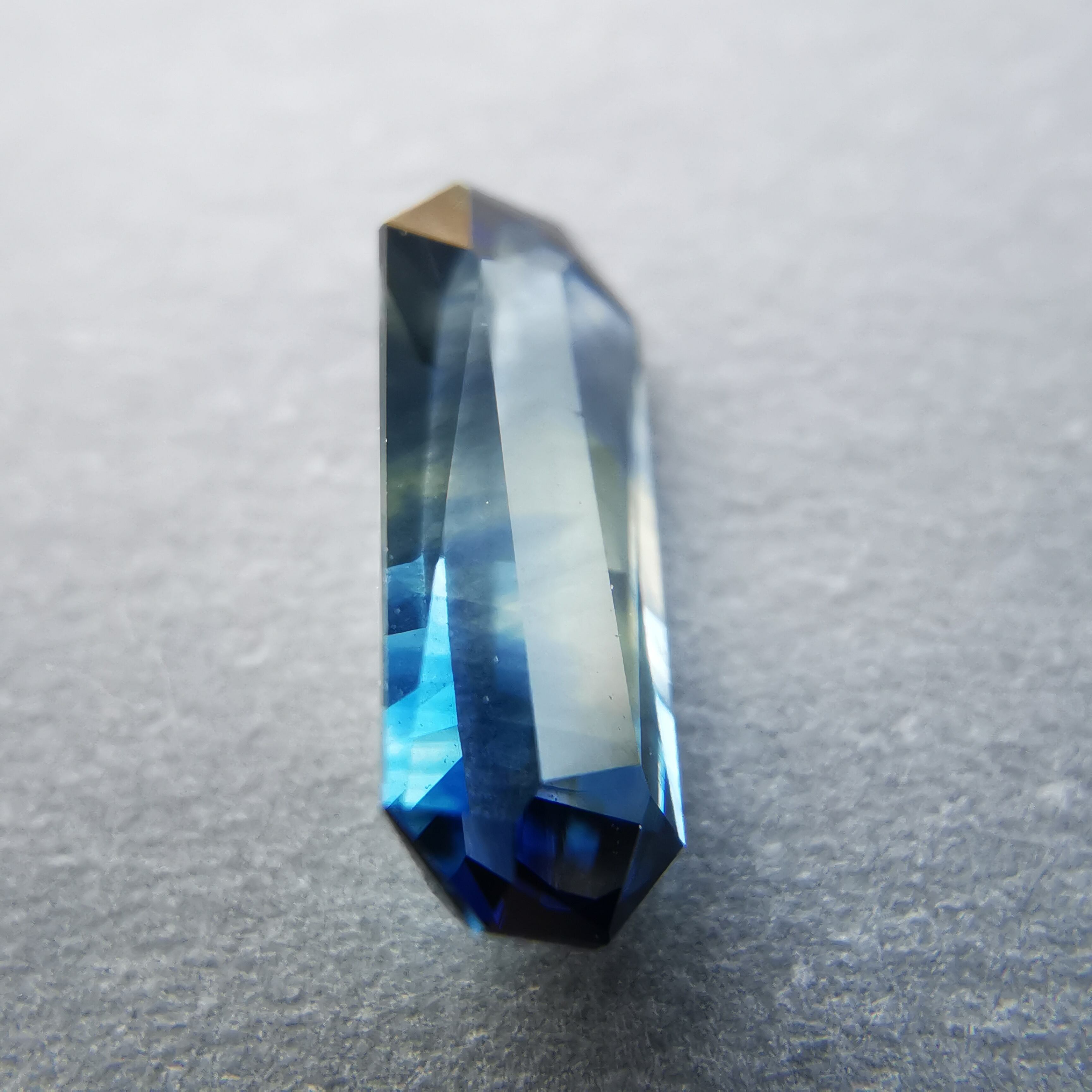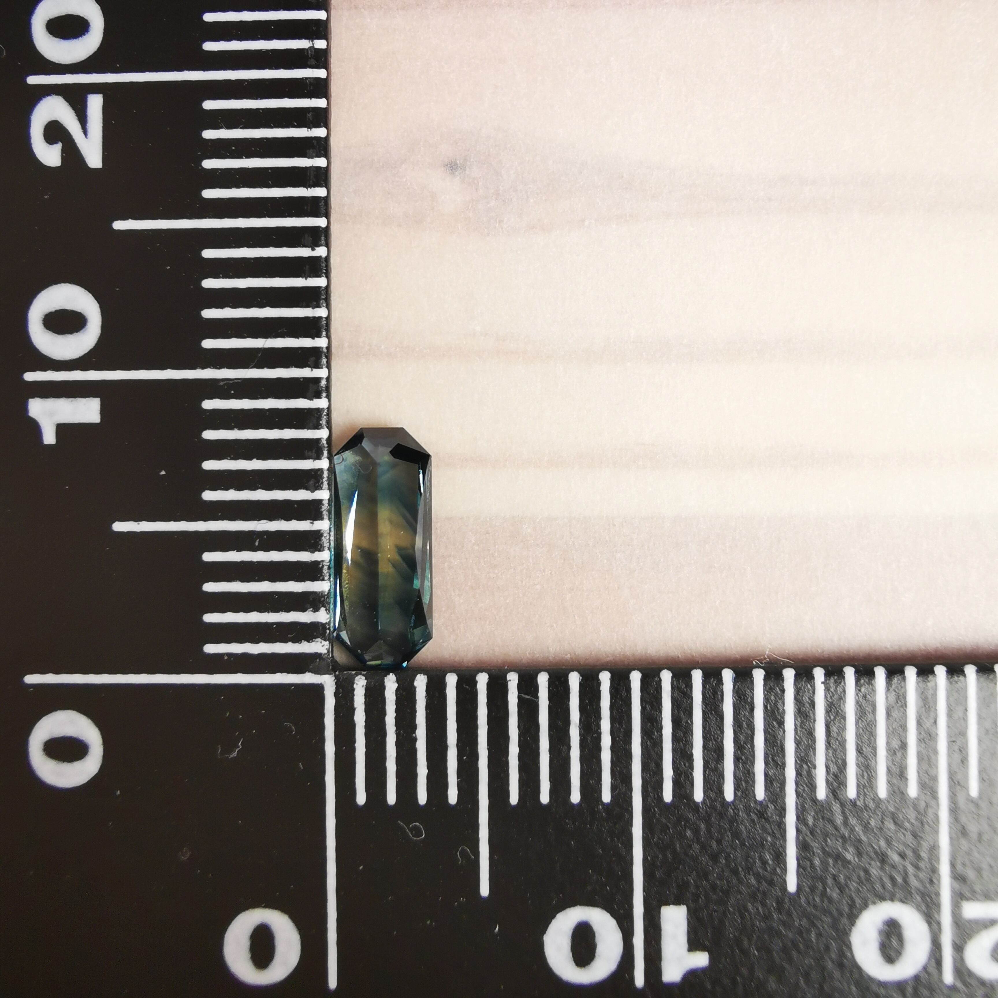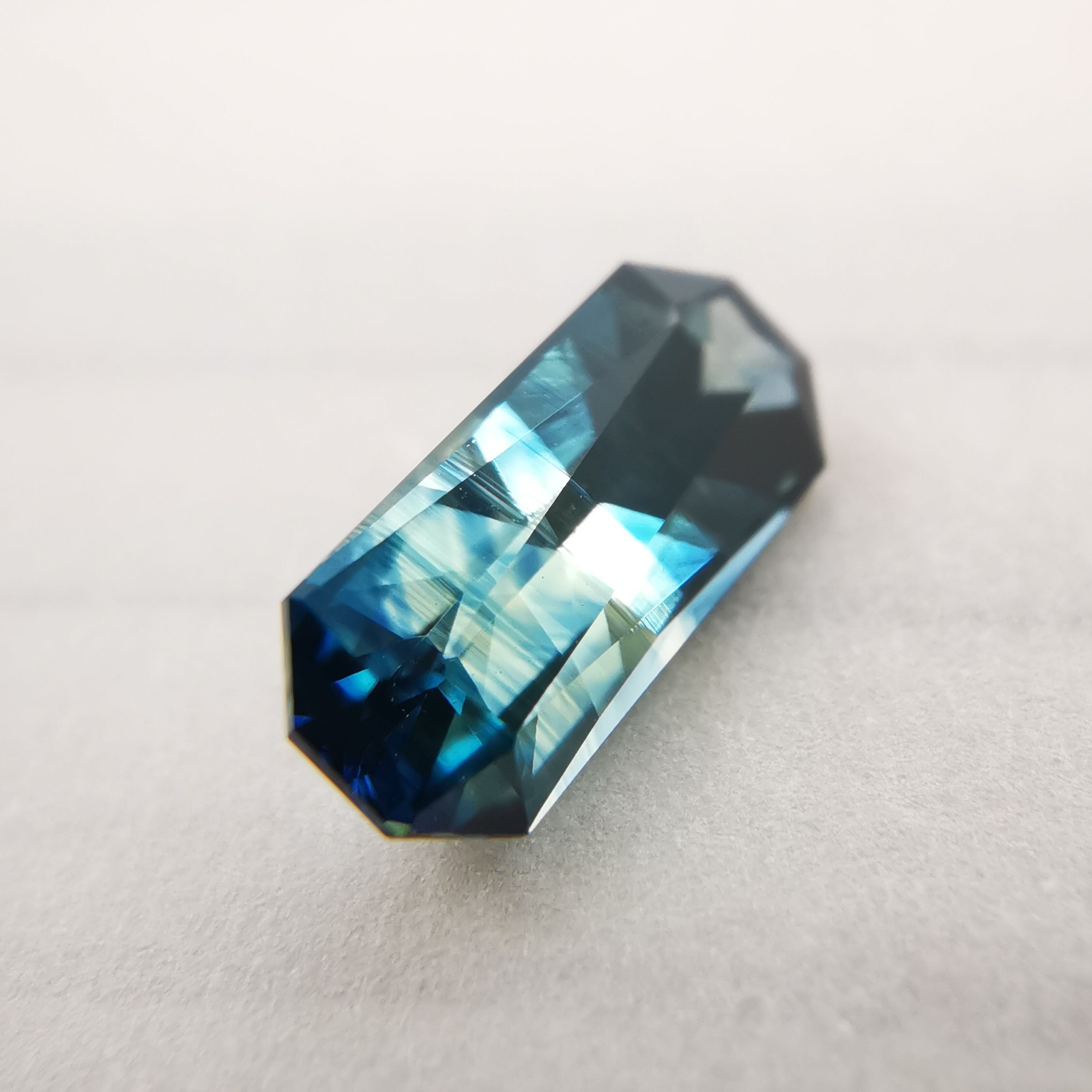 テーブル面にひねりのあるデザインのカットが施られており、掴みどころのない複雑な色とカットが魅力のバイカラーサファイアです。