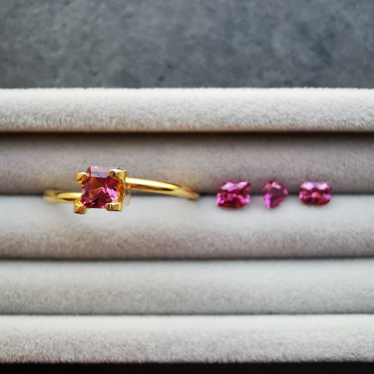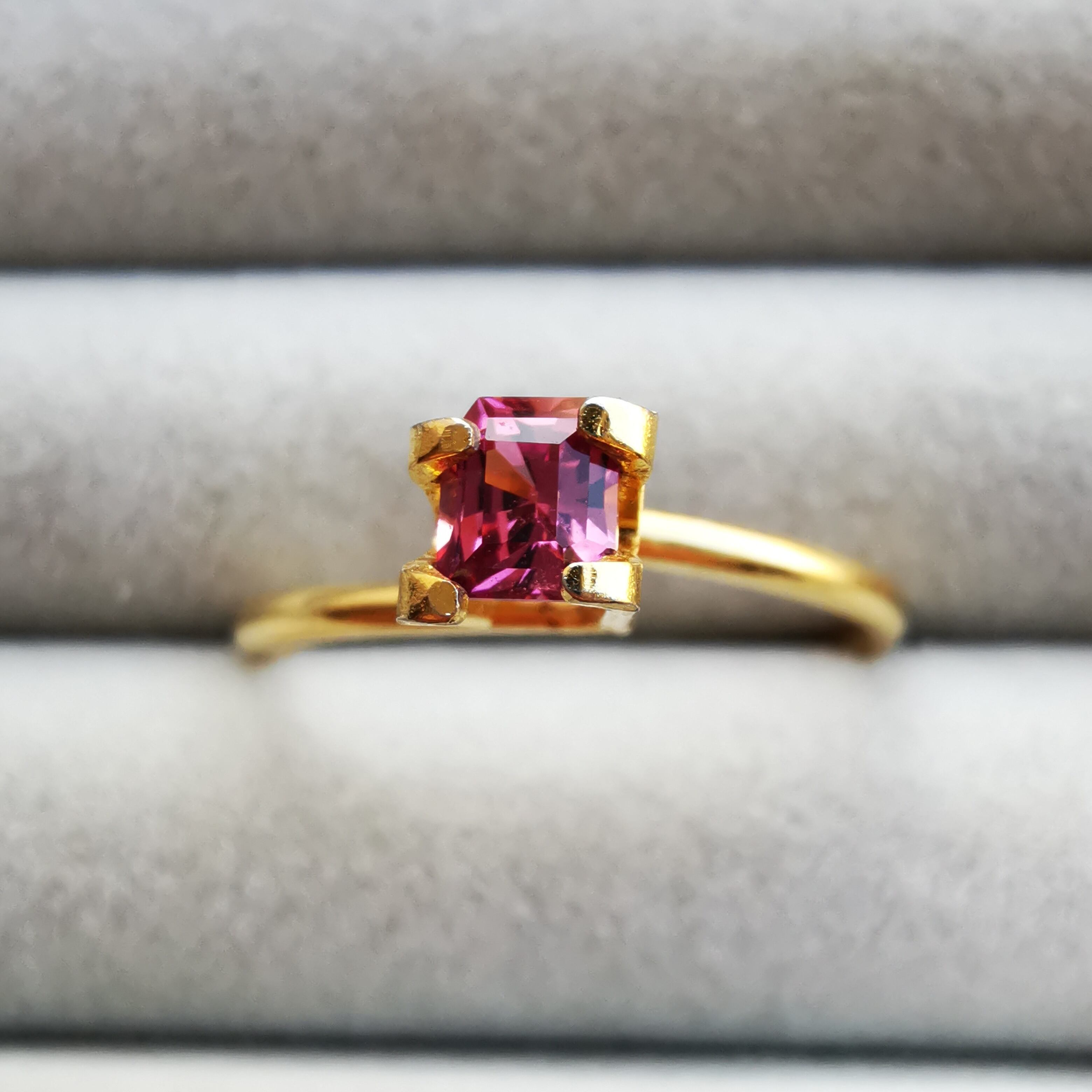 ブーゲンビリアのような華やかなカラーで、4石あると更に目を惹きます。
