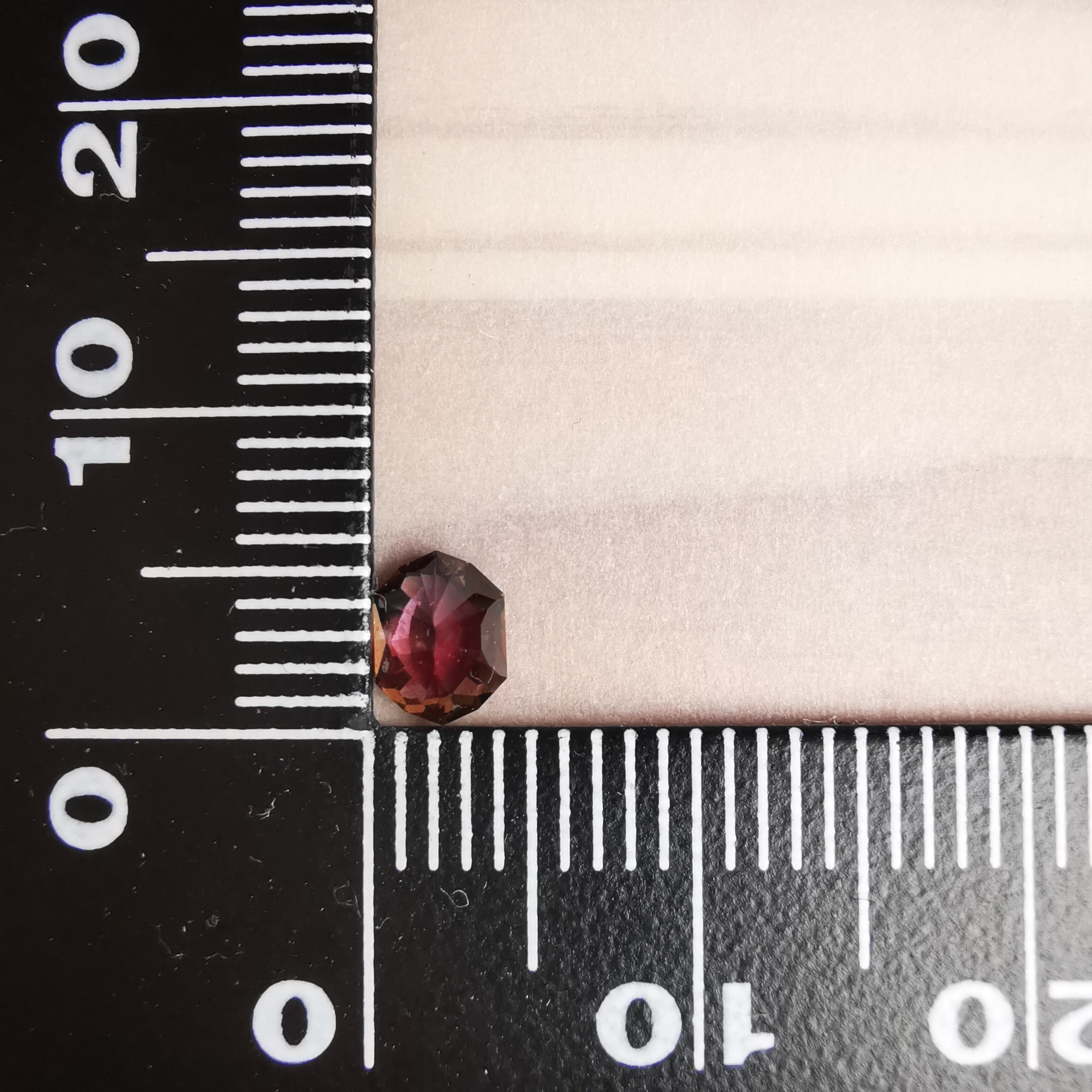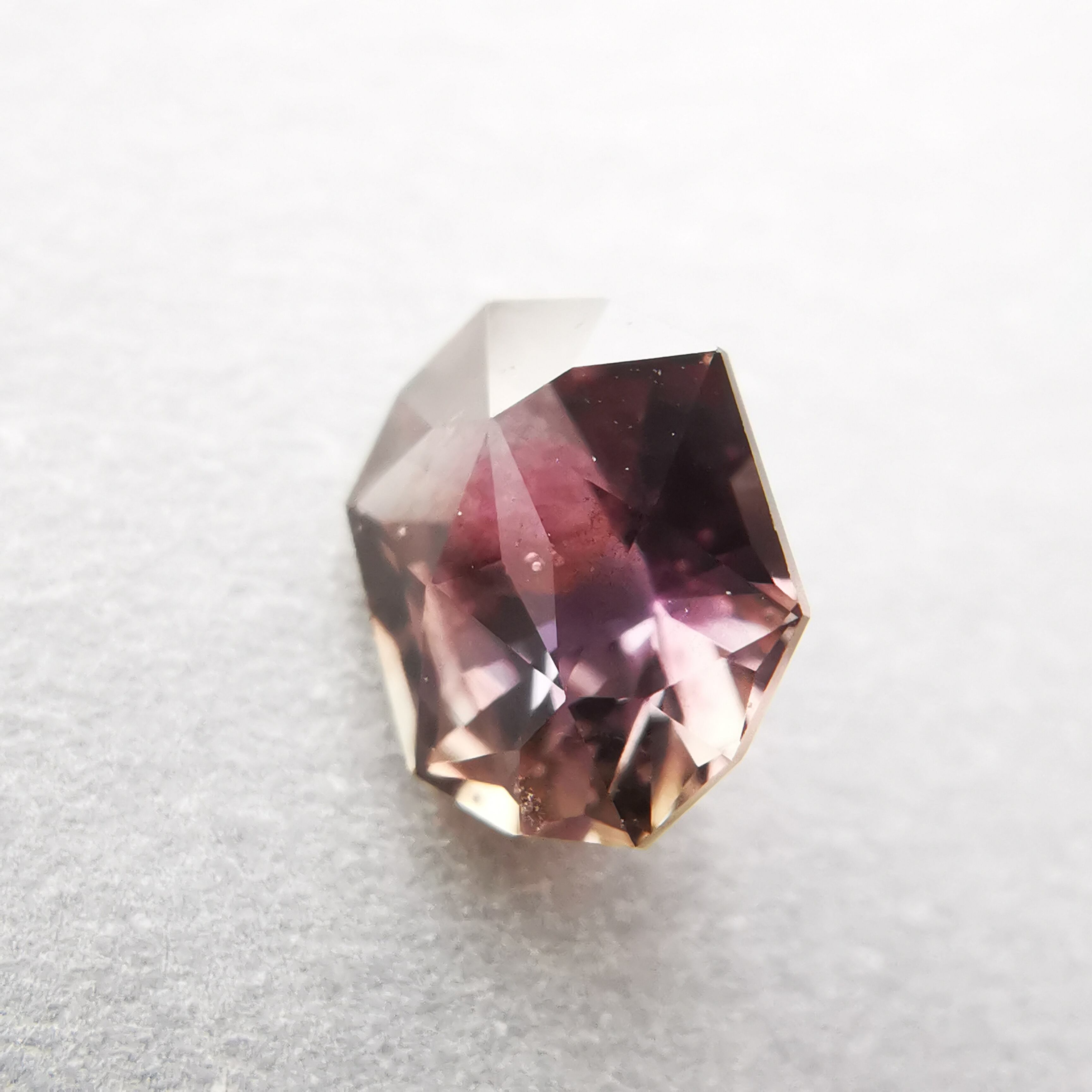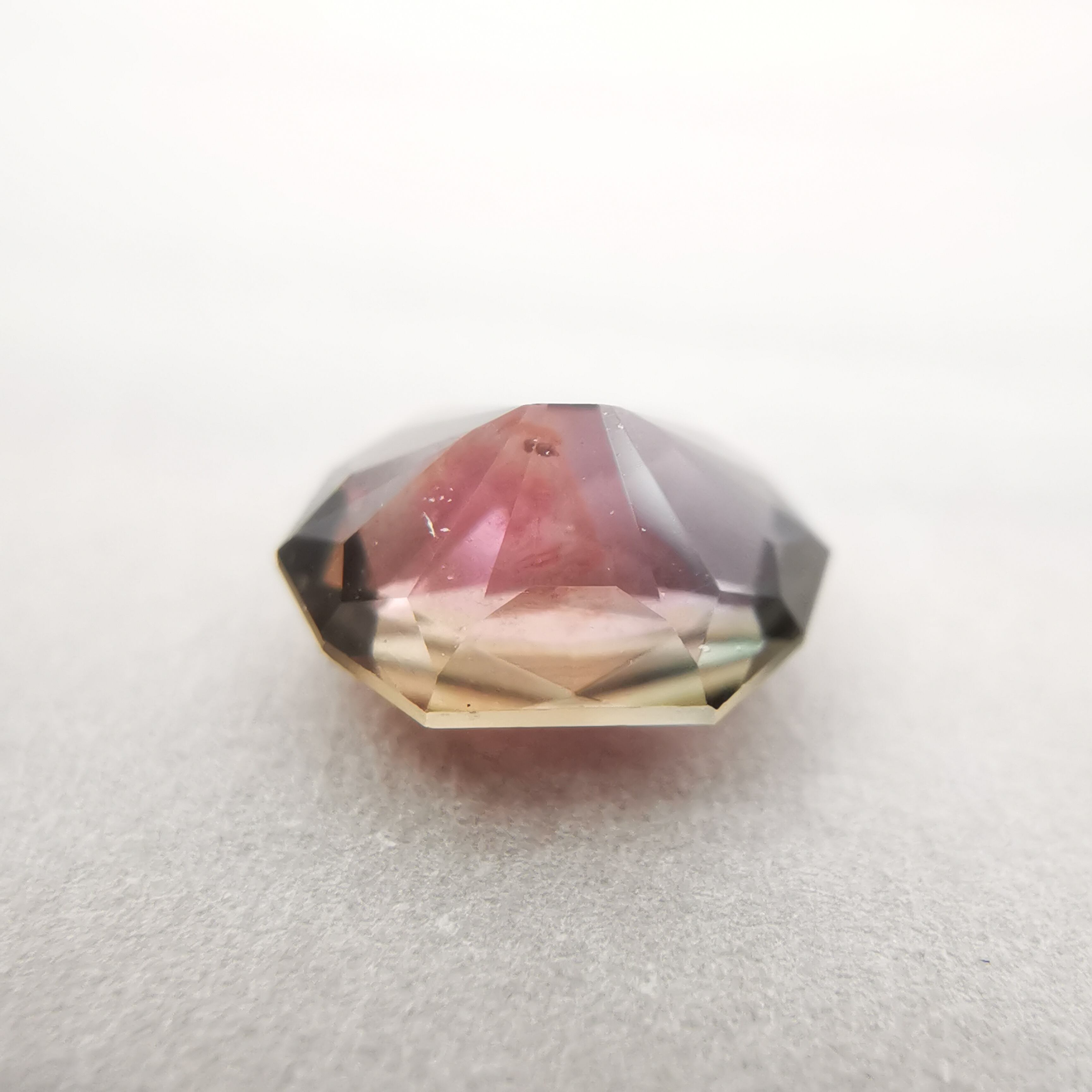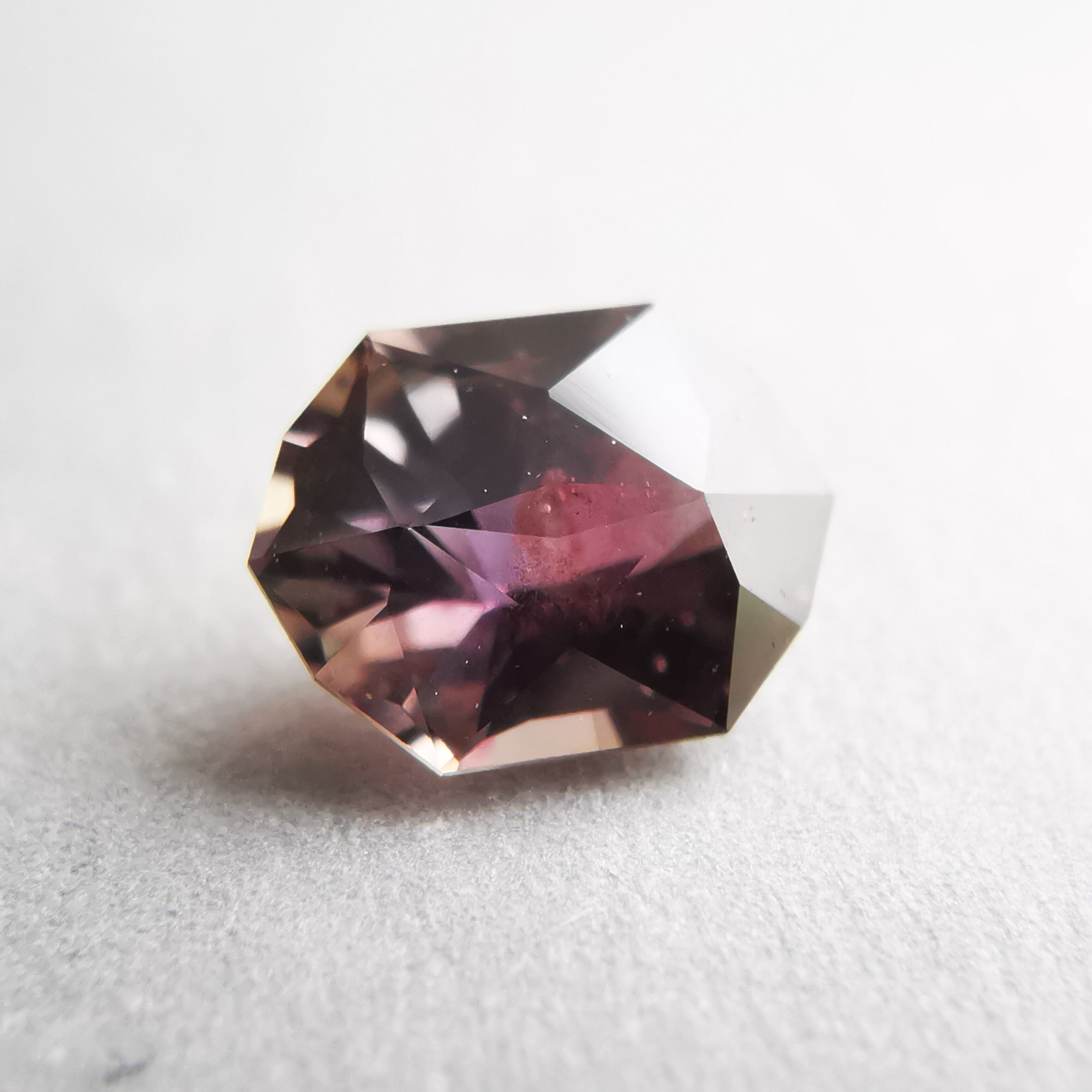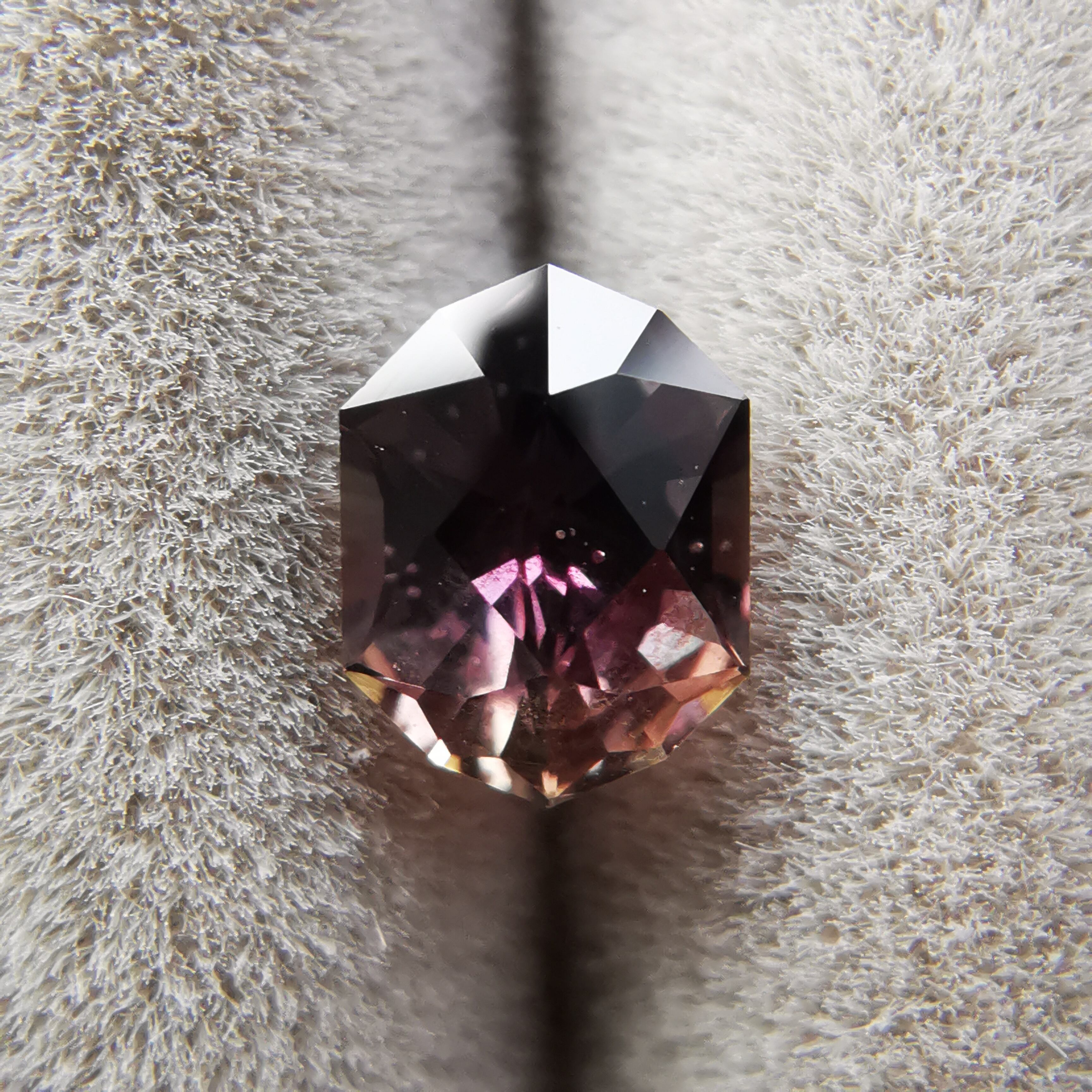 ガードル付近はマスタードカラー~オリーブグリーン、中心部にはパープル~レッドが入り、シルクインクルージョンがシャラシャラと光る、とても複雑な輝きを持つ一石です。