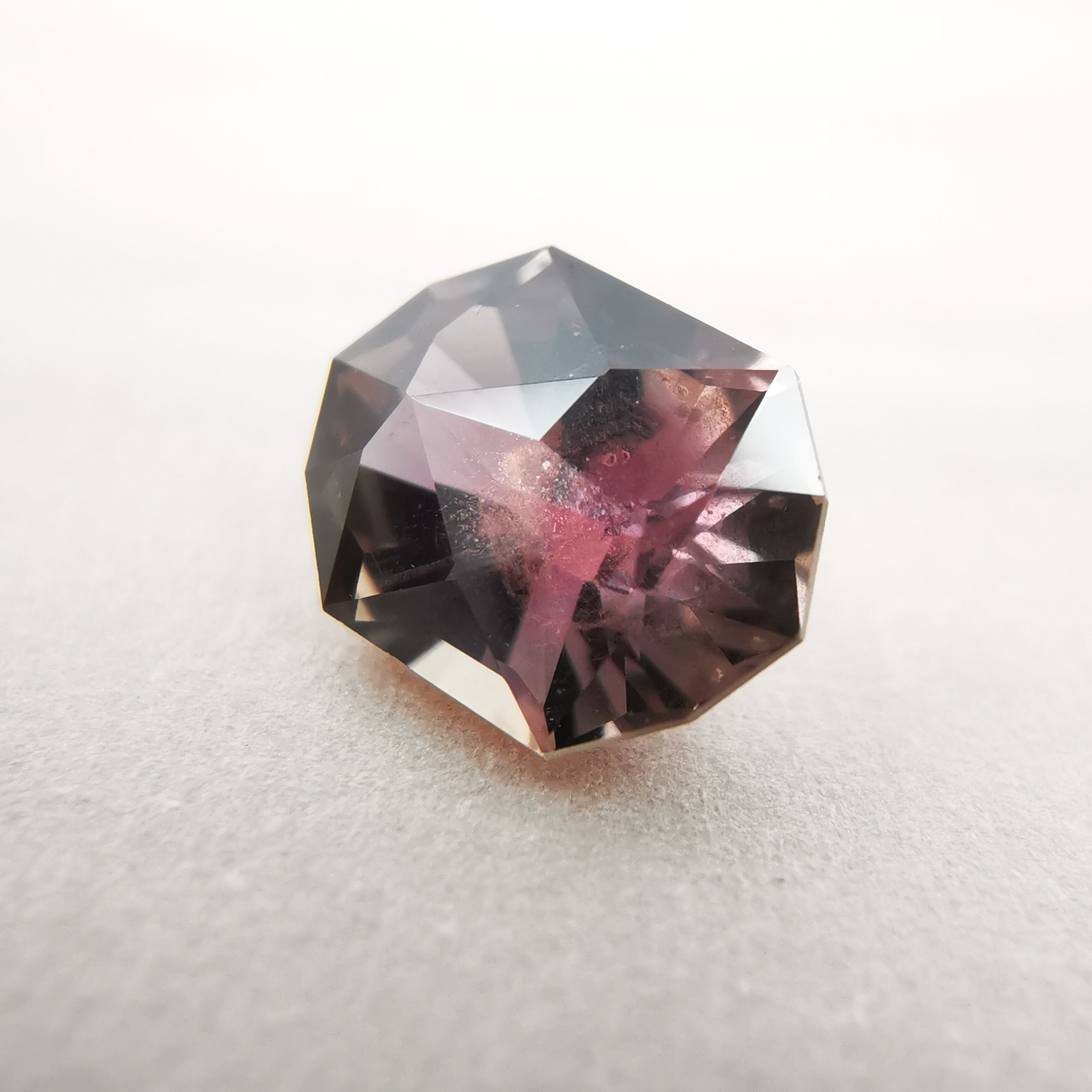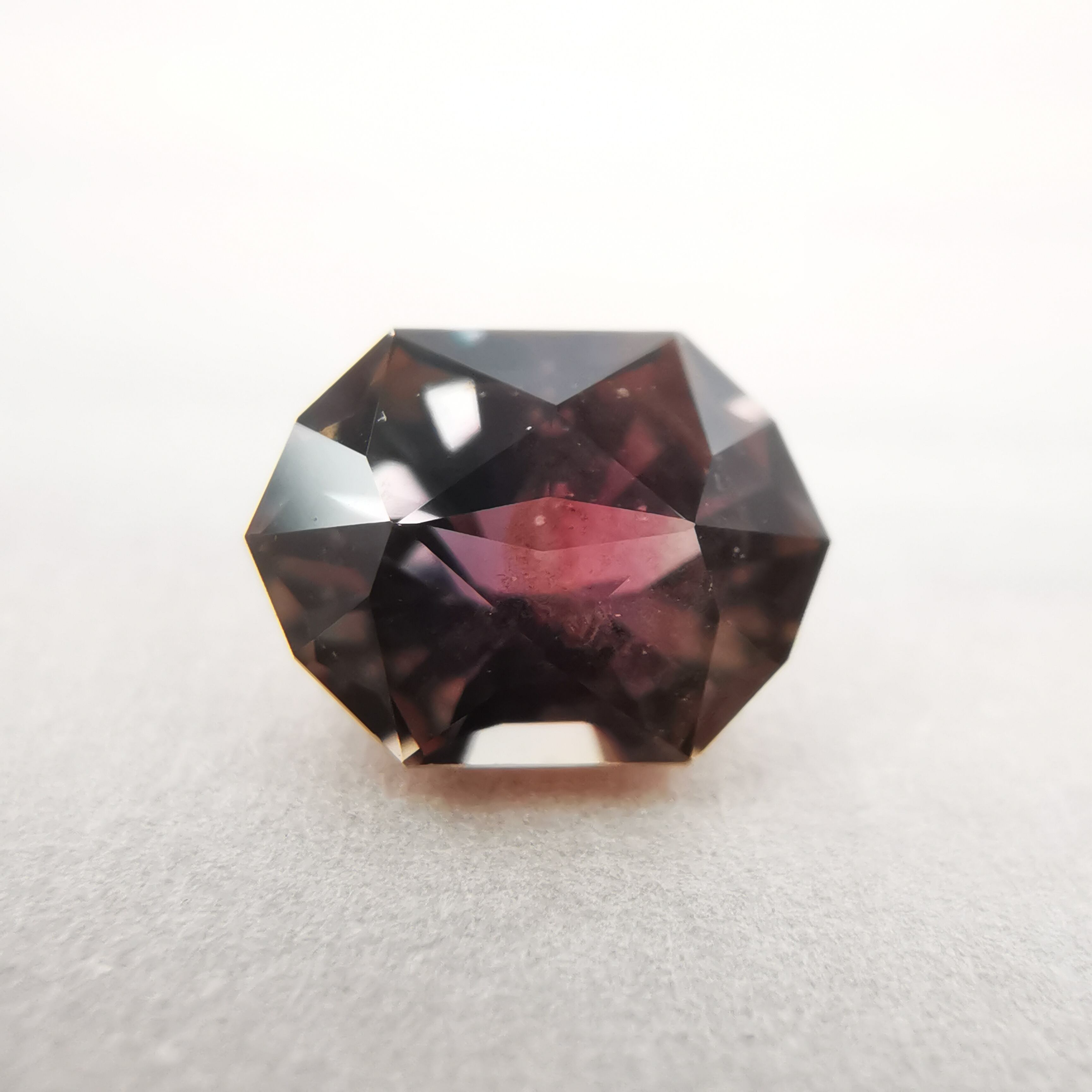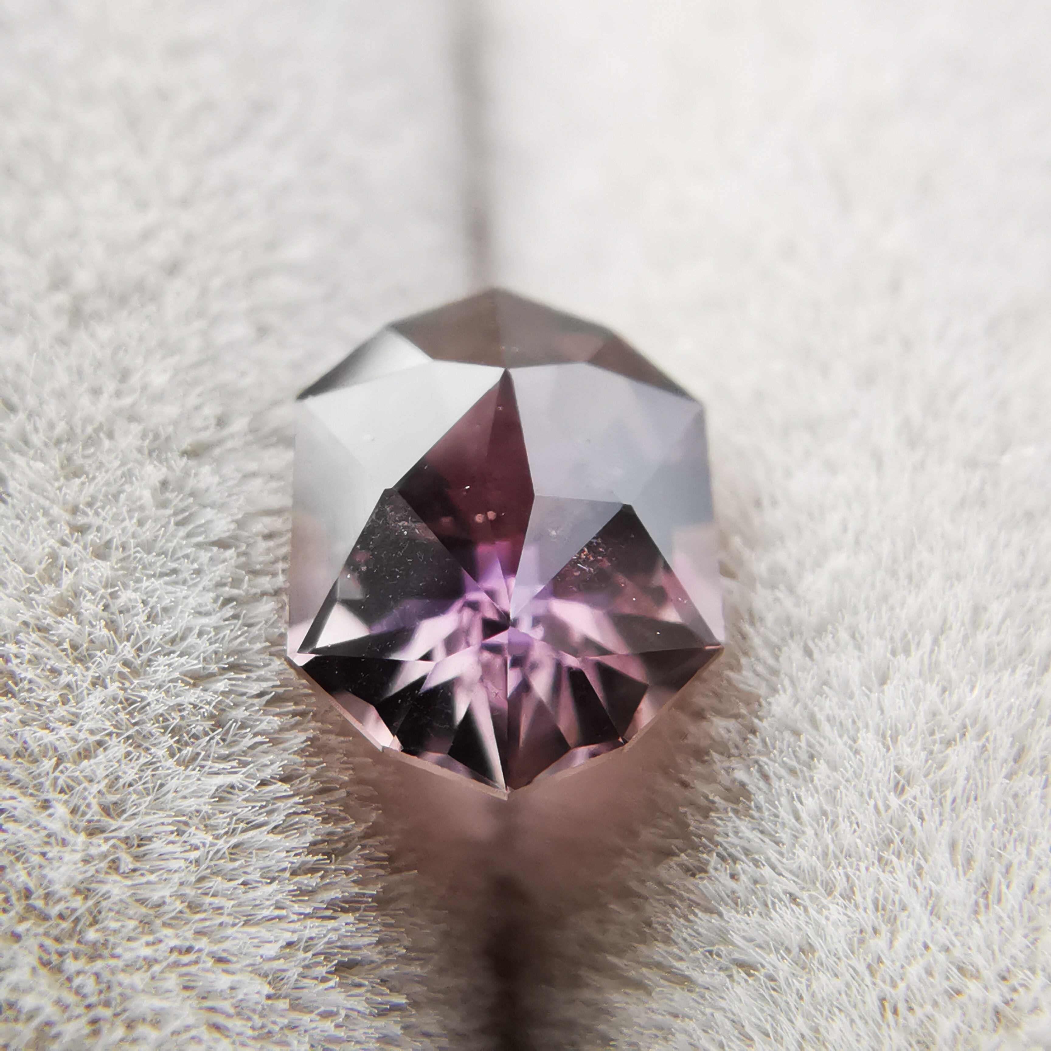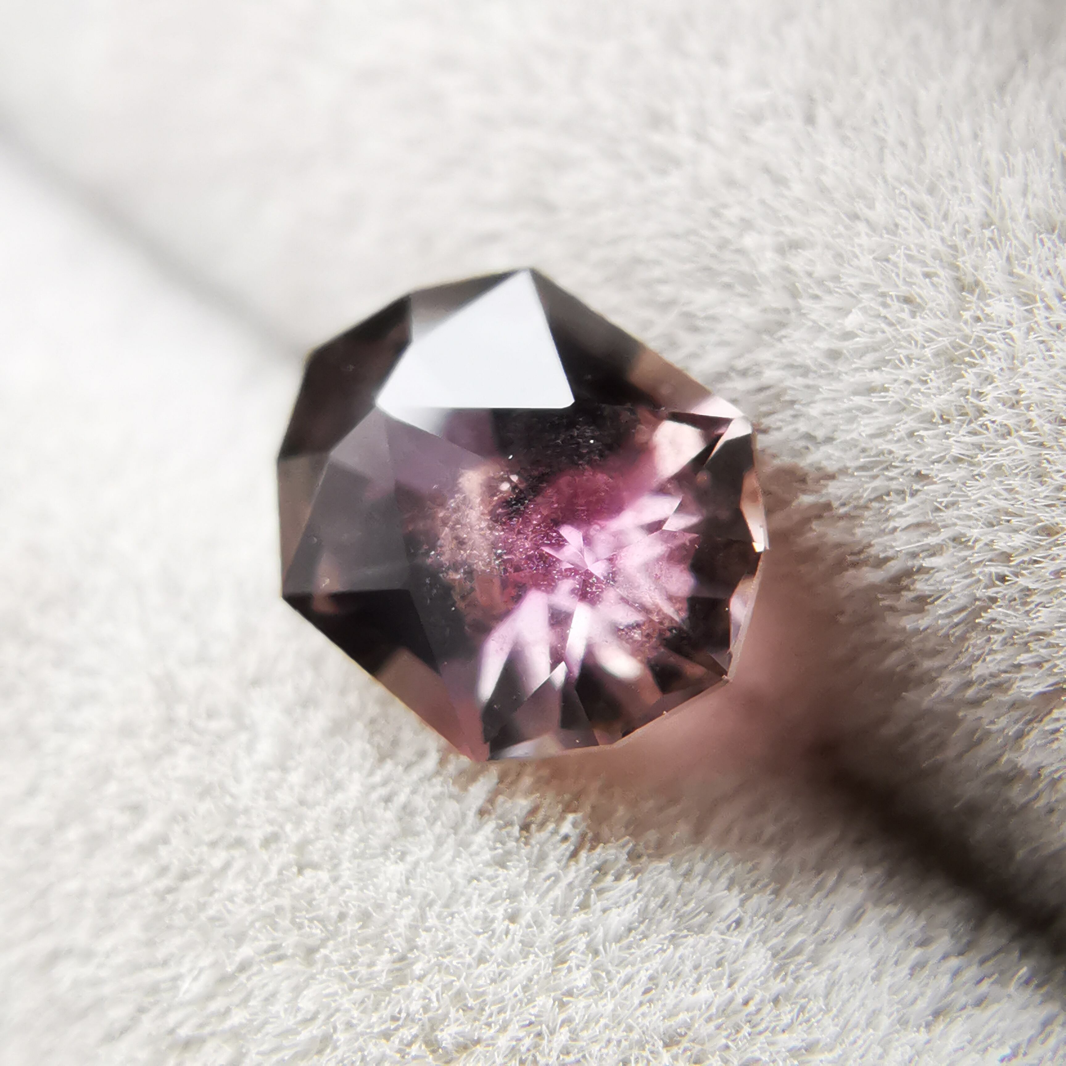 ガードル付近はマスタードカラー~オリーブグリーン、中心部にはパープル~レッドが入り、シルクインクルージョンがシャラシャラと光る、とても複雑な輝きを持つ一石です。