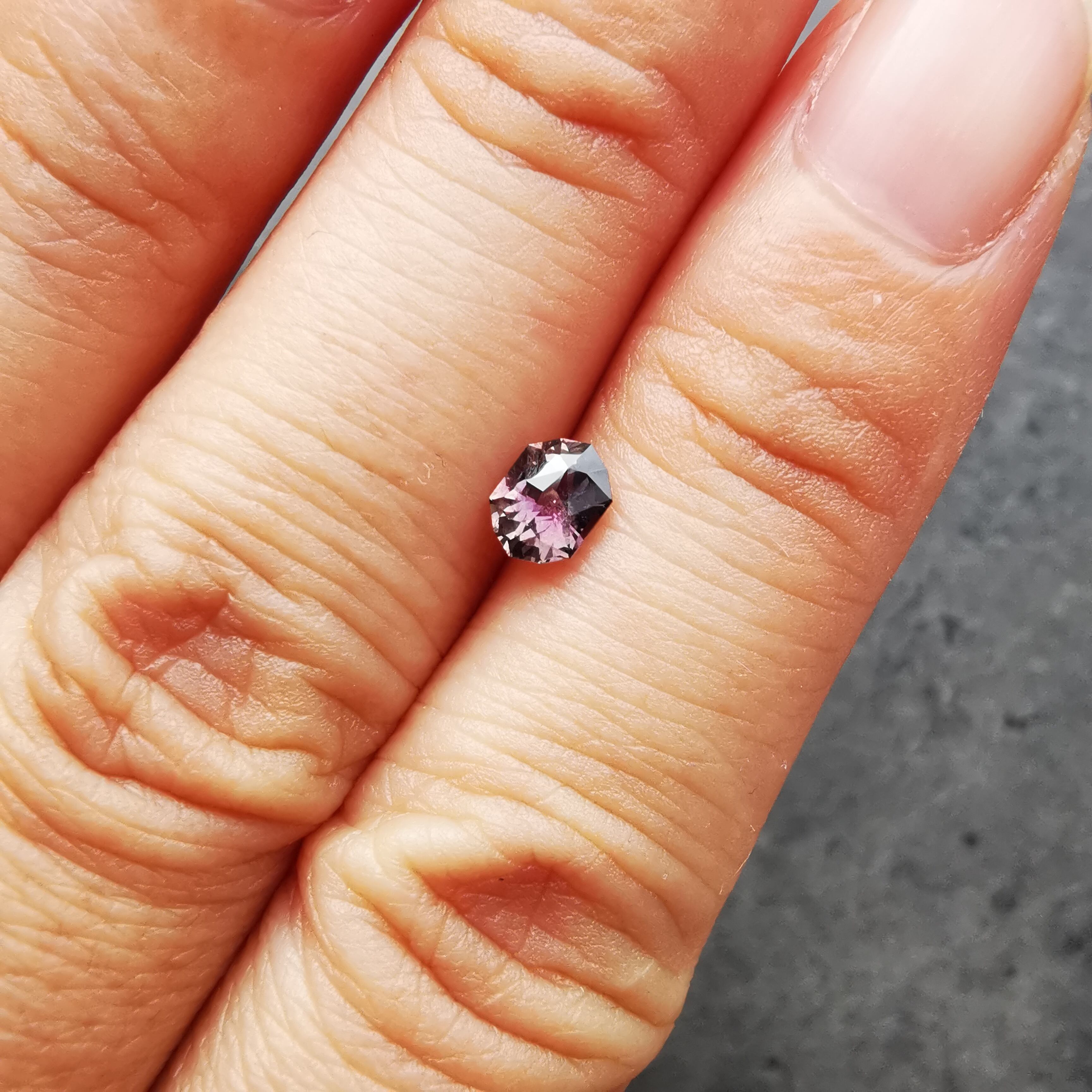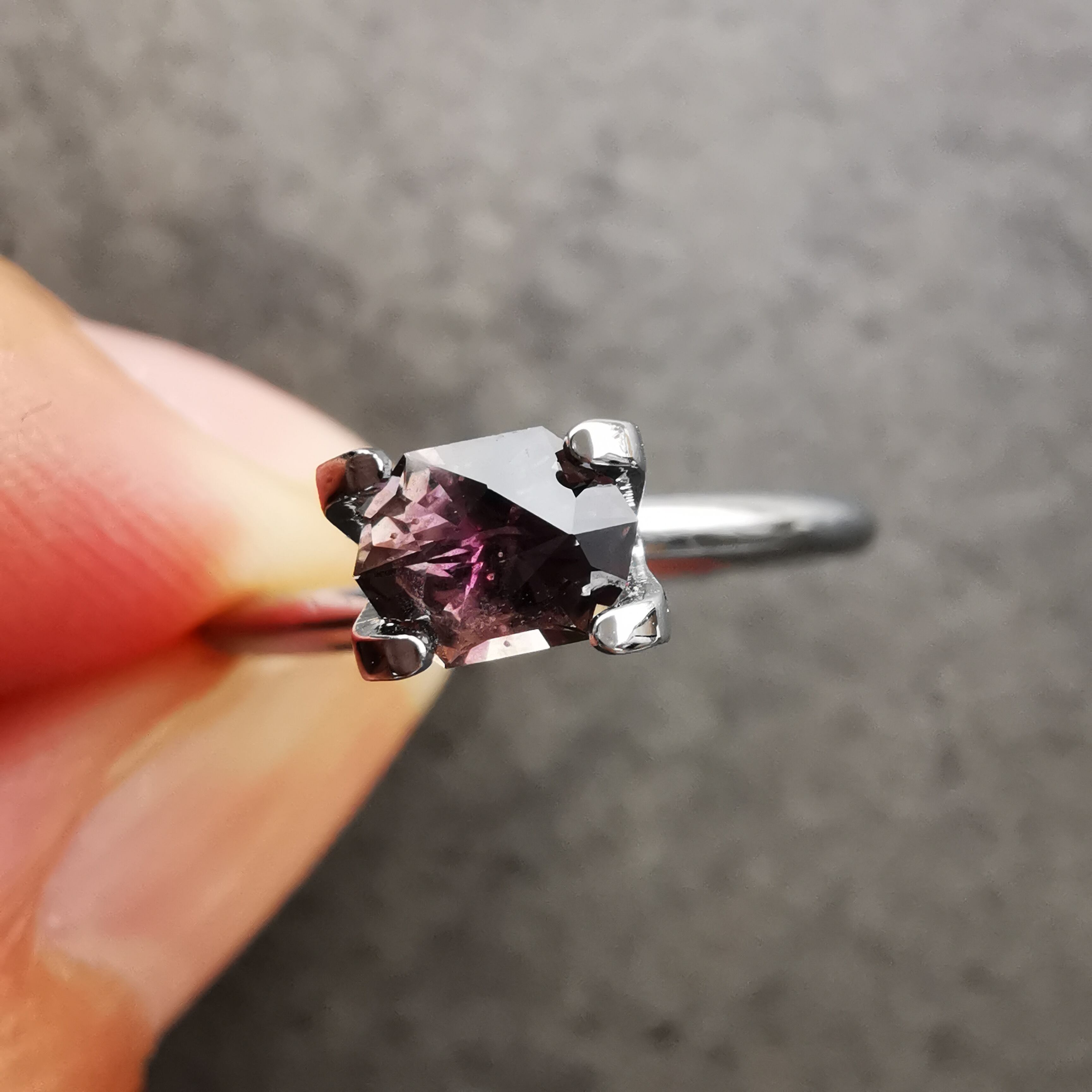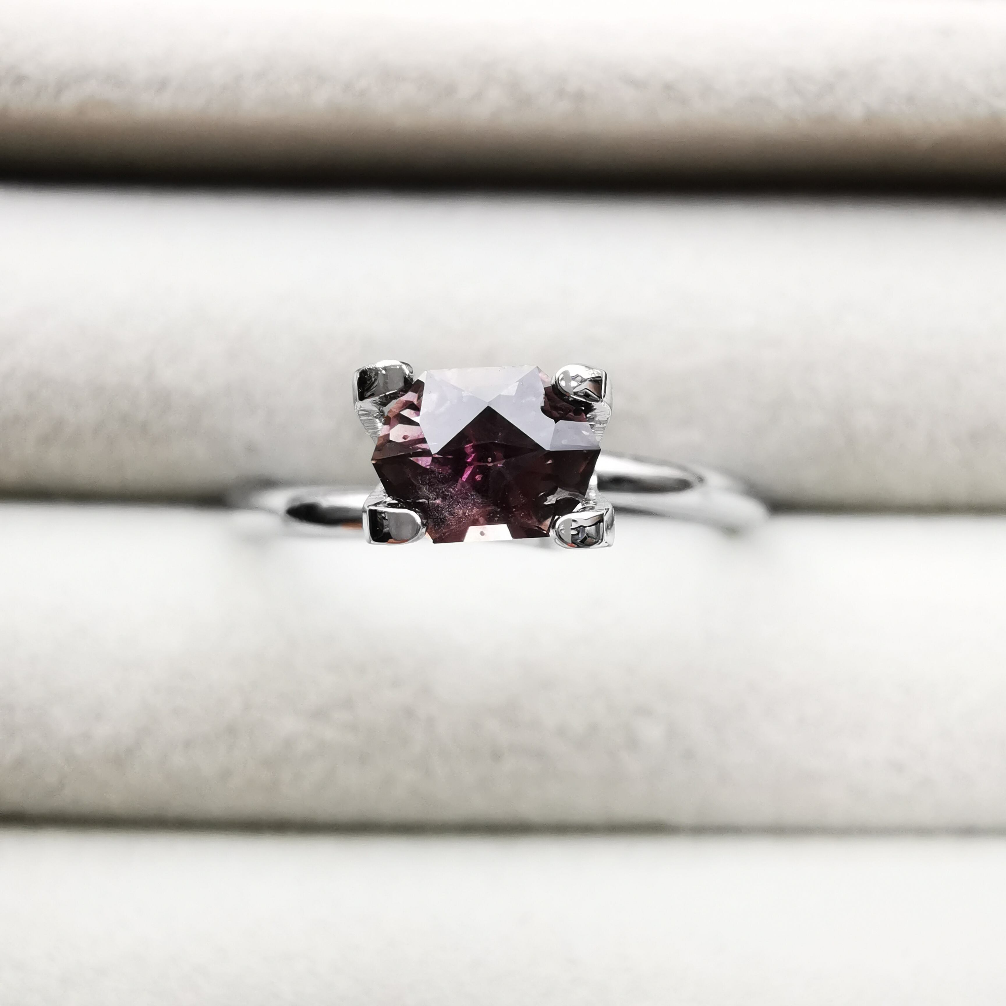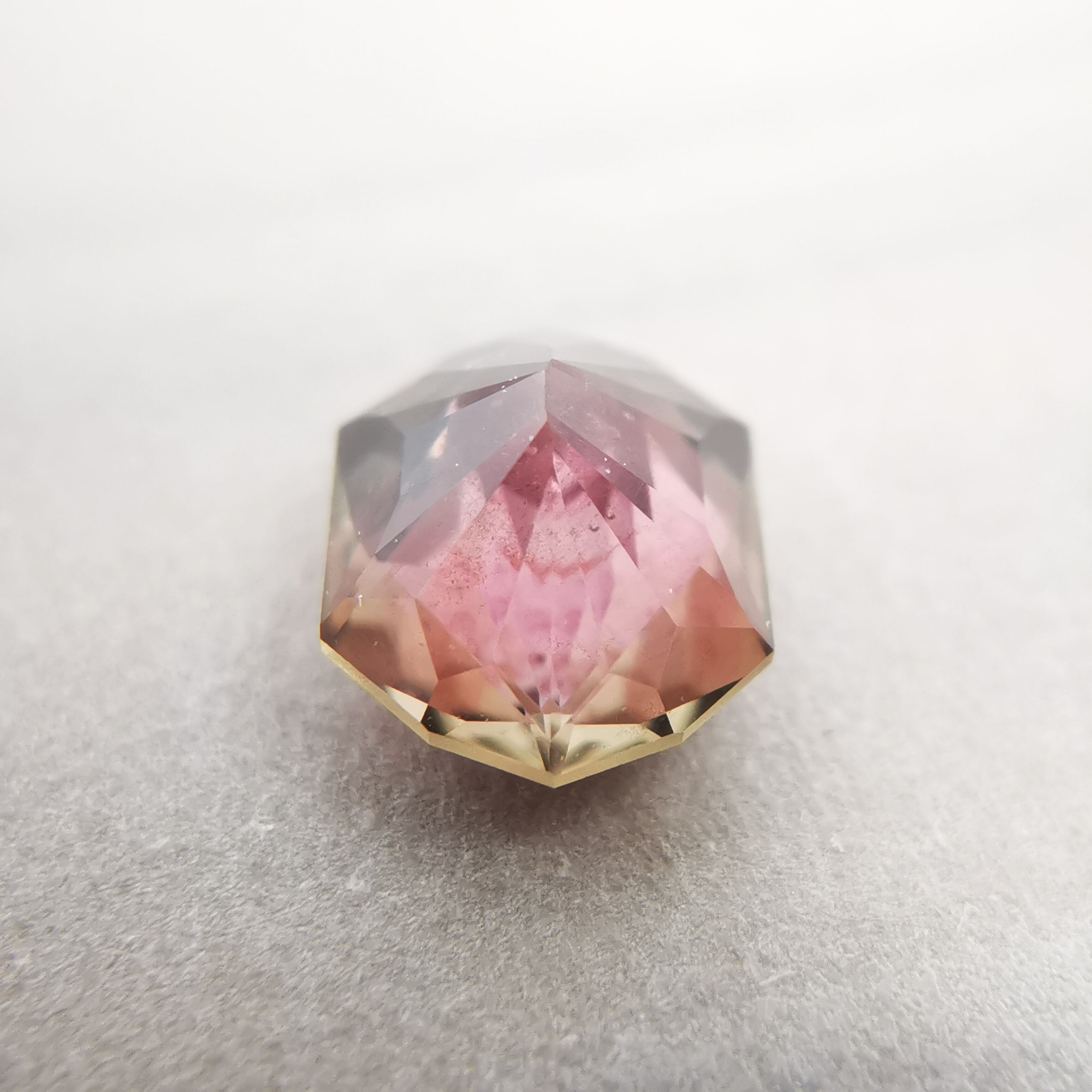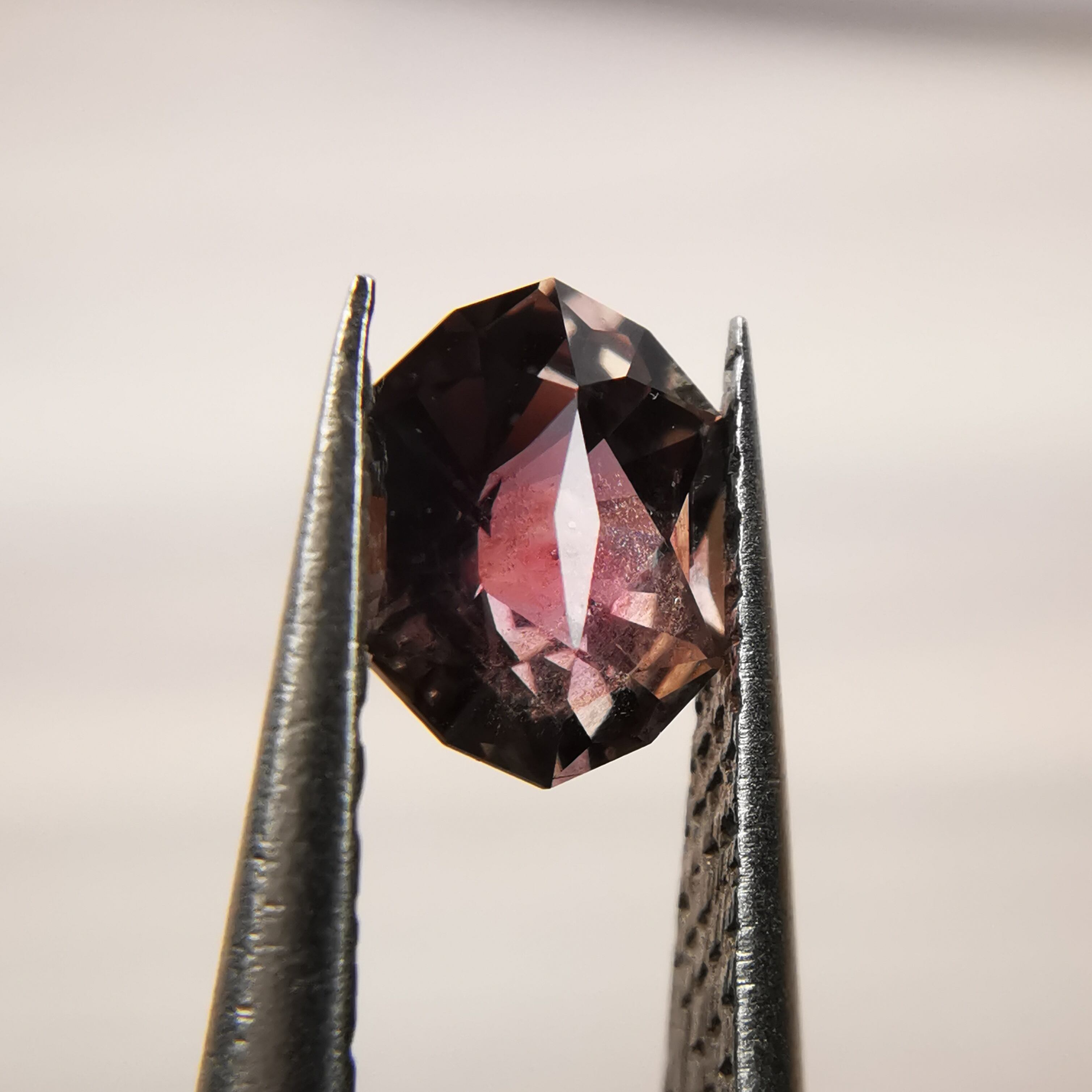 ガードル付近はマスタードカラー~オリーブグリーン、中心部にはパープル~レッドが入り、シルクインクルージョンがシャラシャラと光る、とても複雑な輝きを持つ一石です。