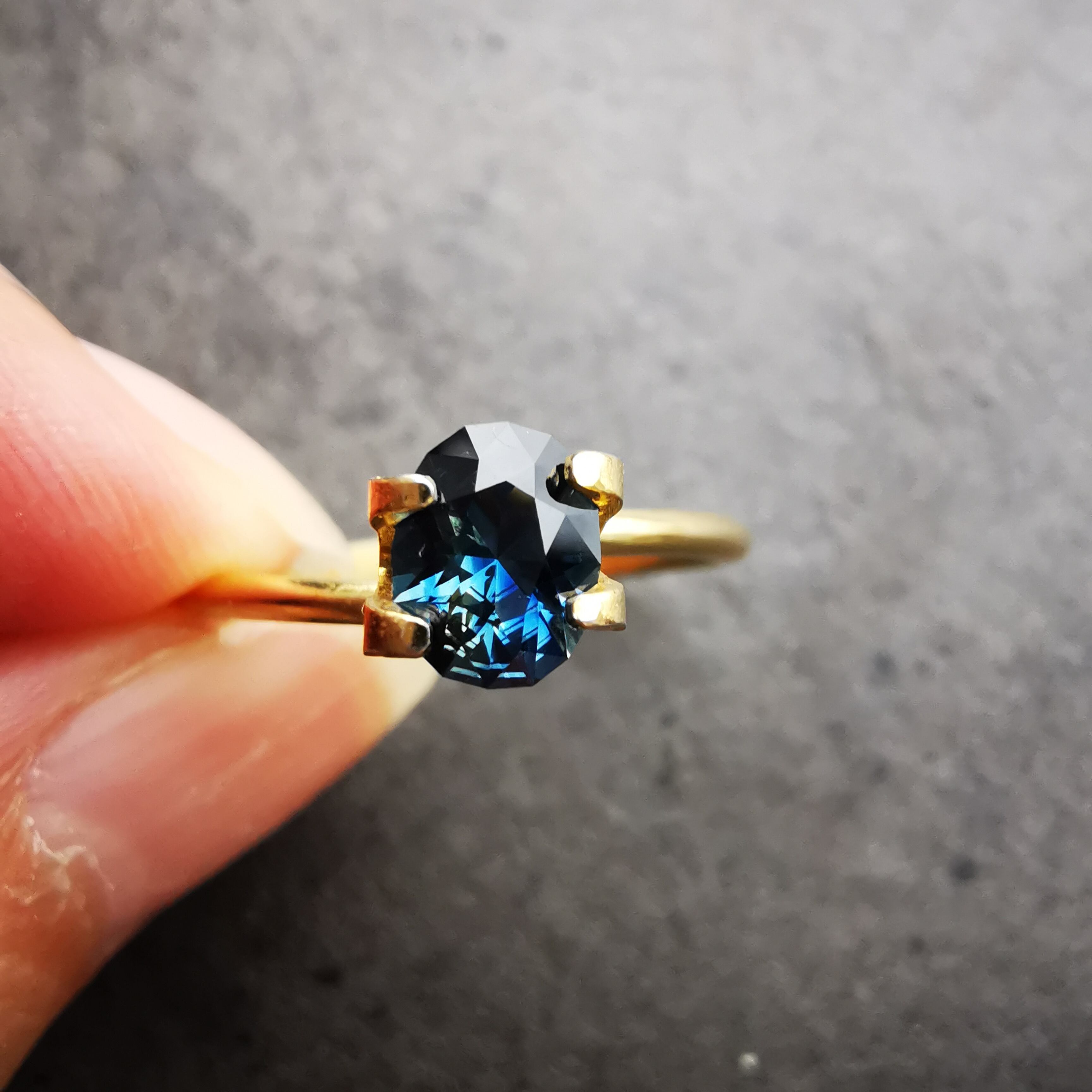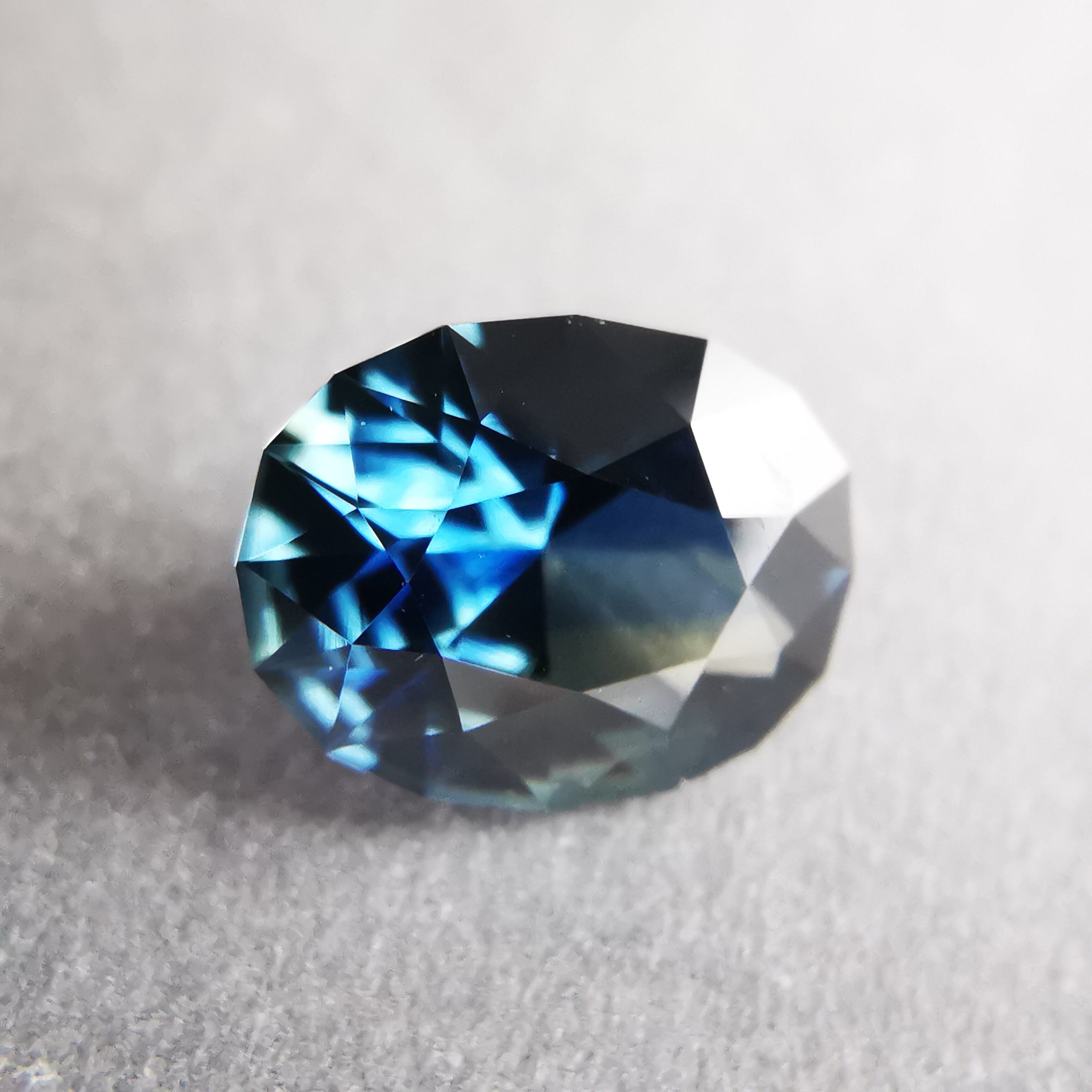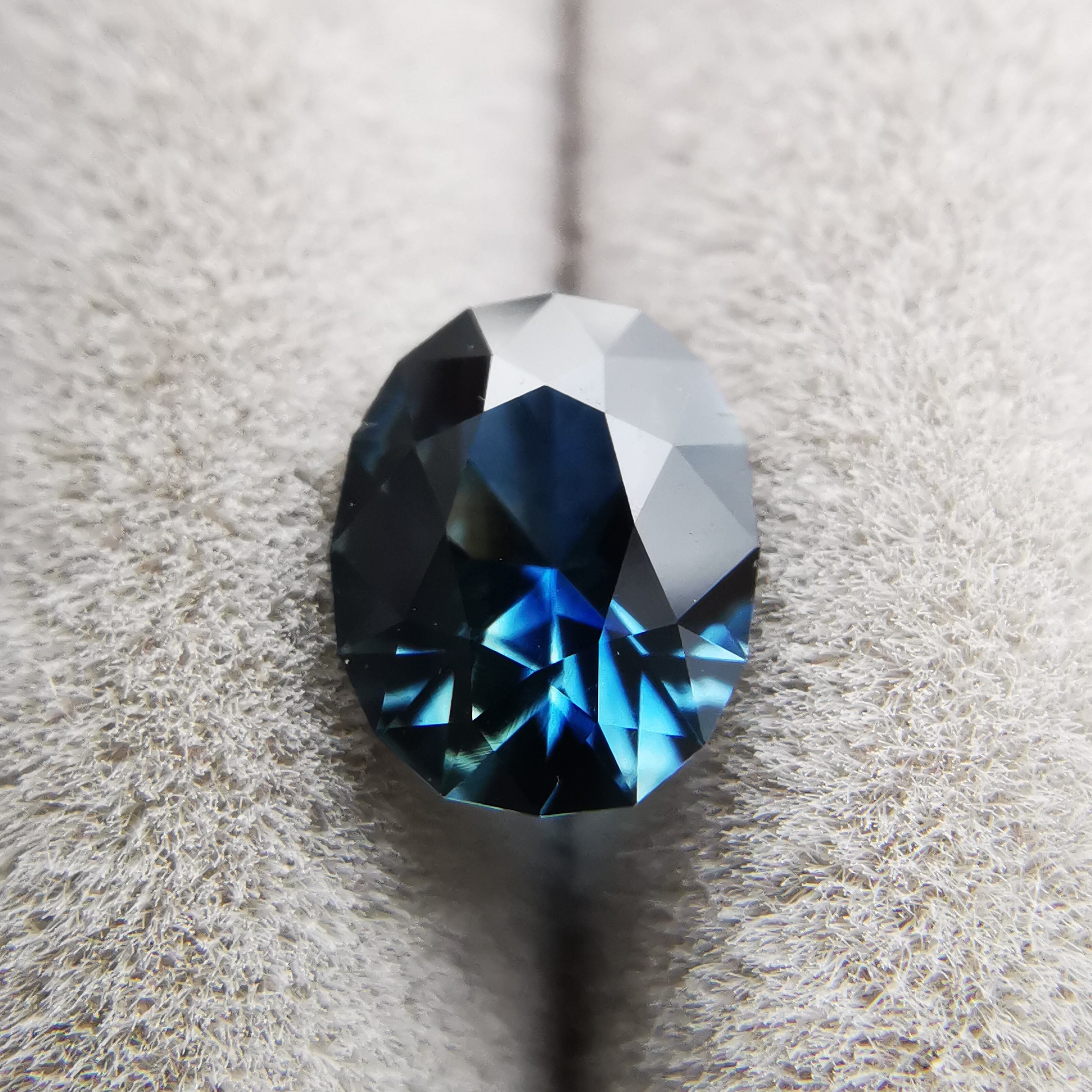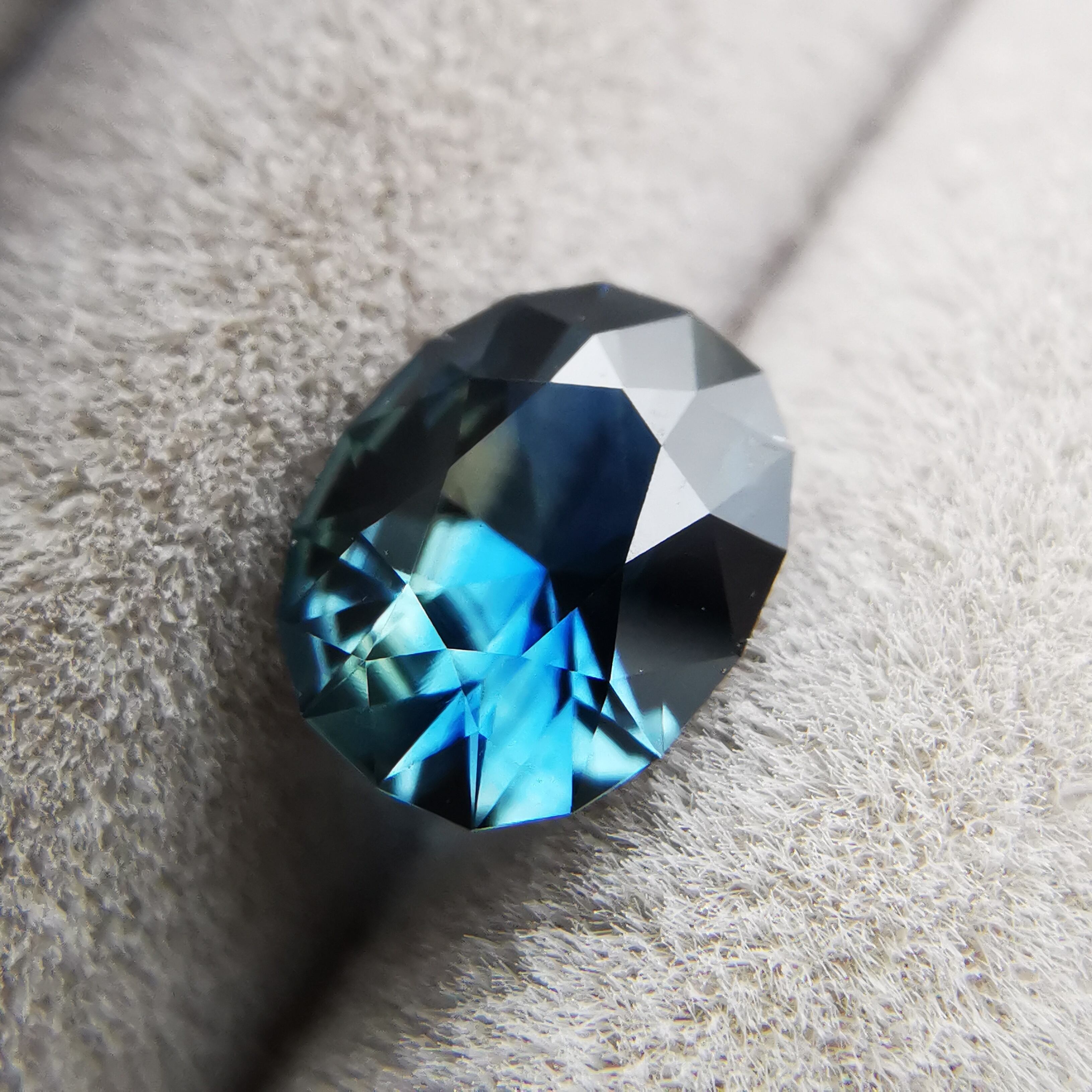 暗い石の中からティールカラーが鋭くきらめくサファイアです。
