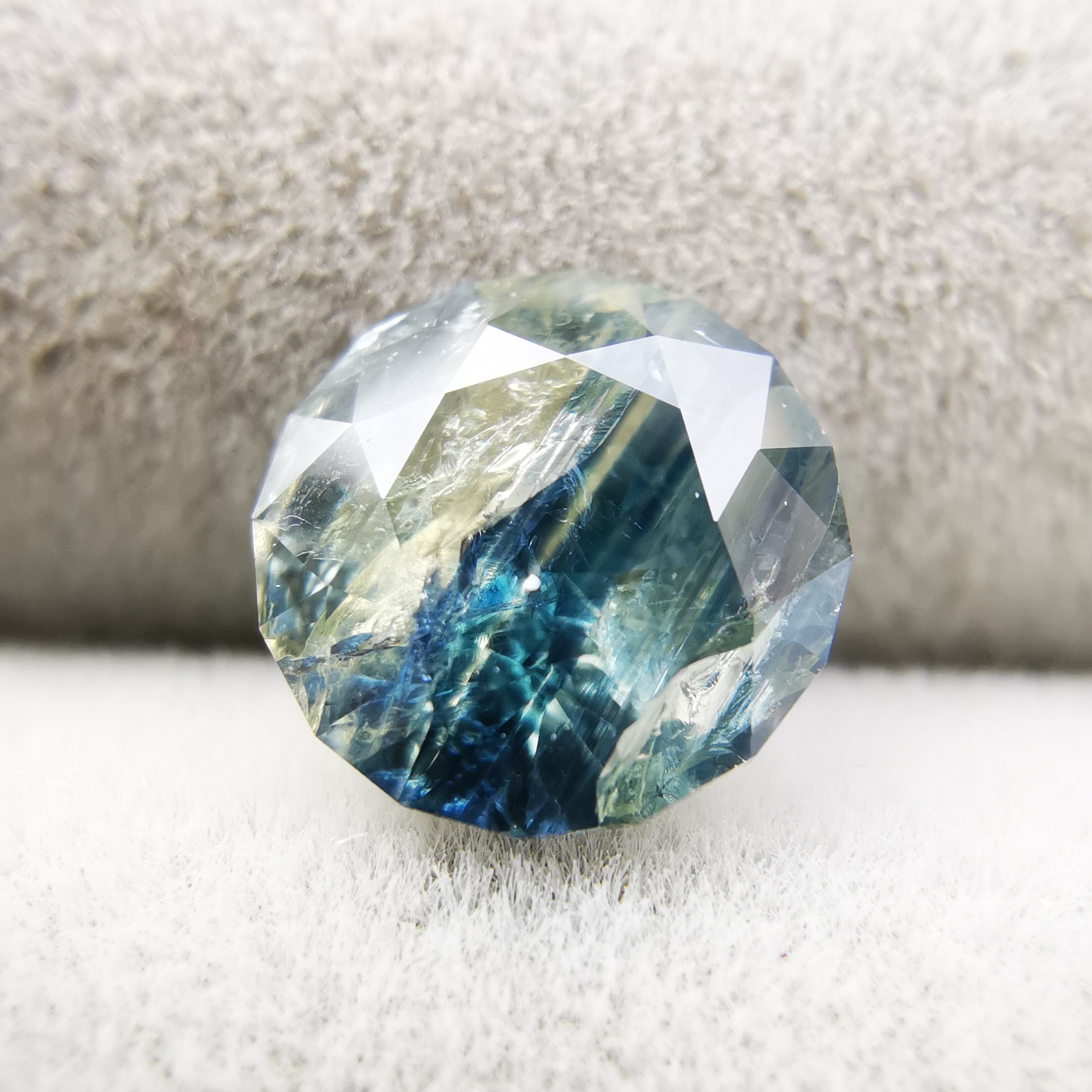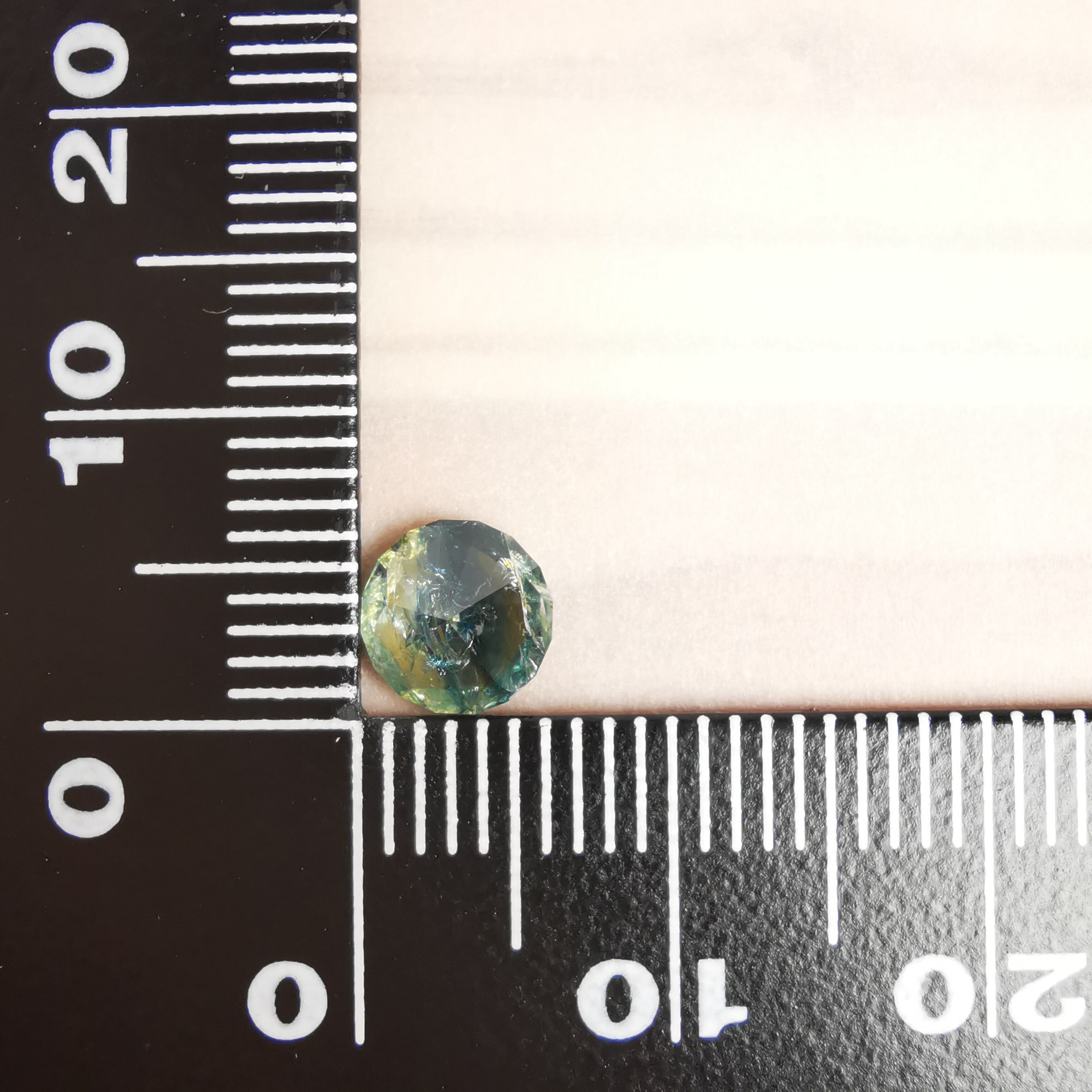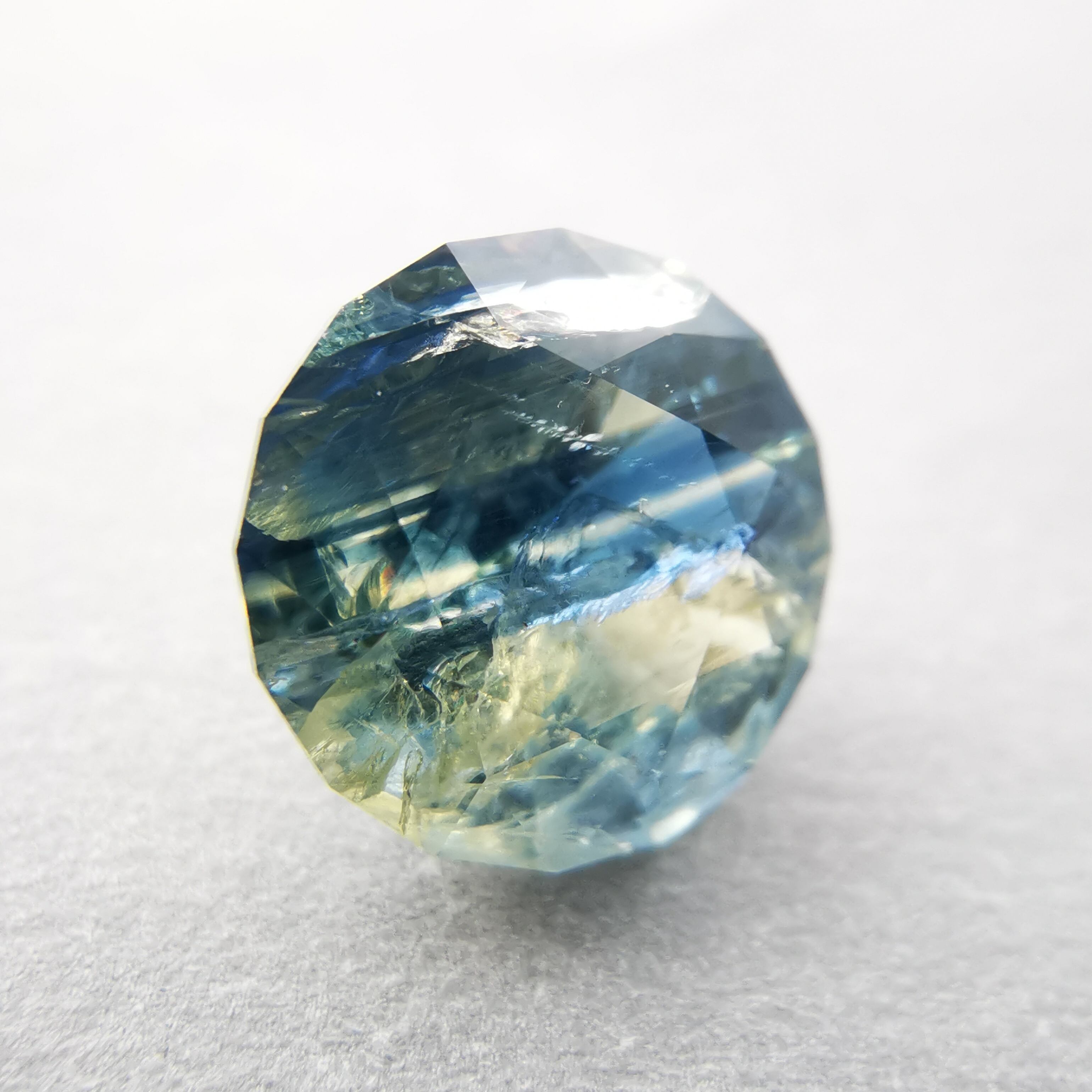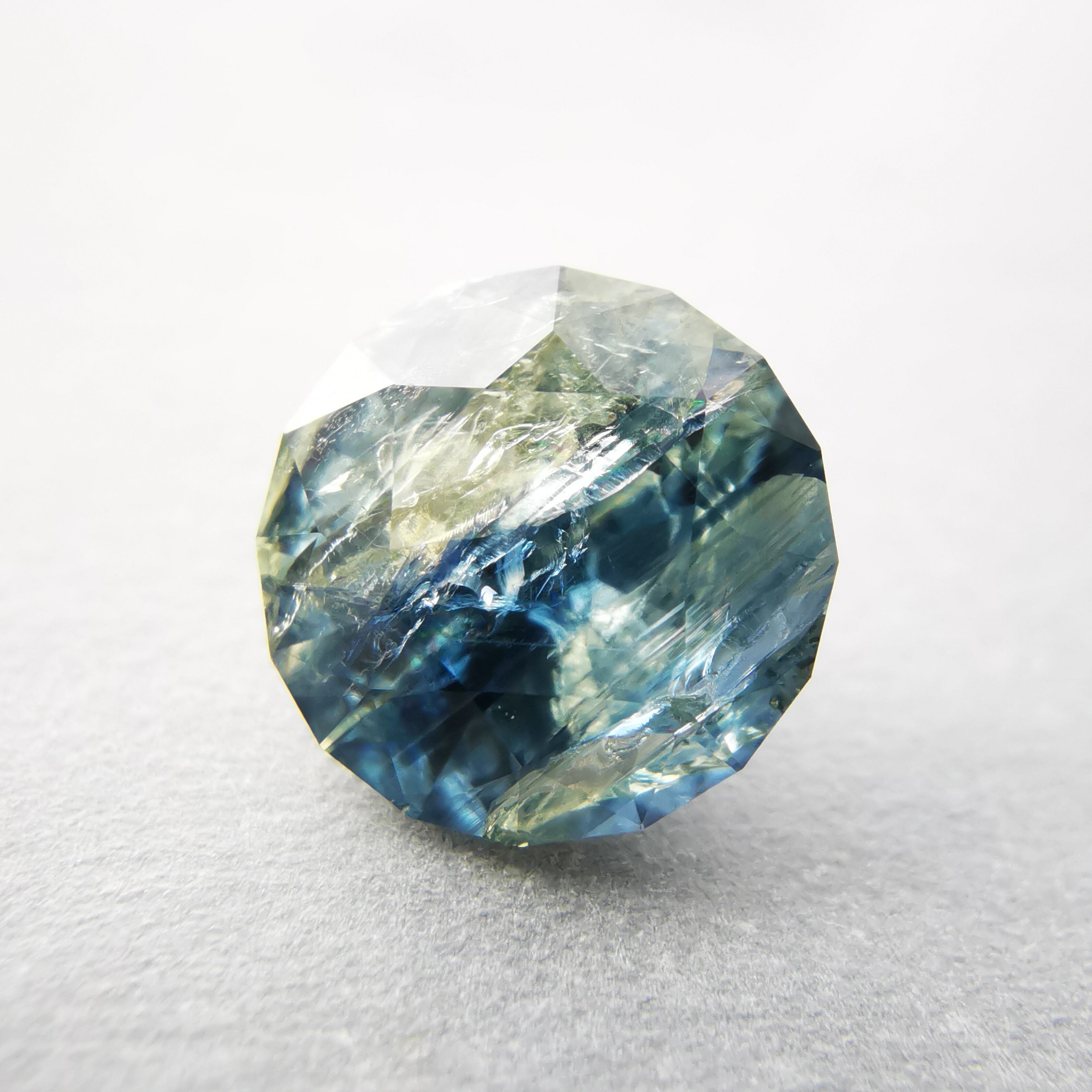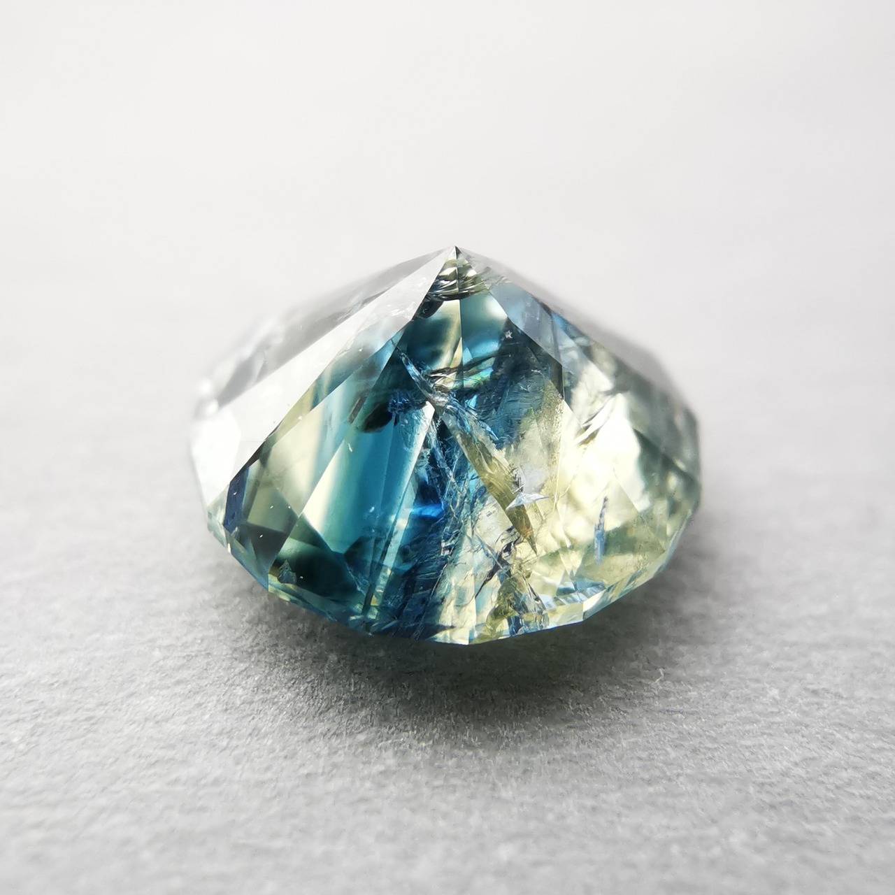 様々なインクルージョンがたっぷりと入った淡いイエローのサファイアに、ざざざっと大きくブルーグリーンのカラーバンドが入りました。