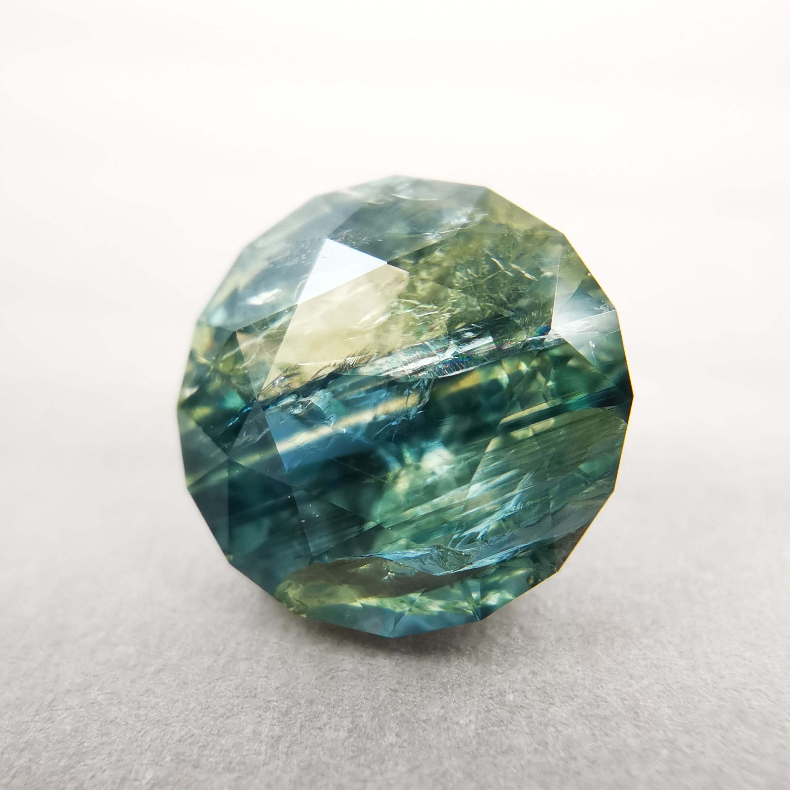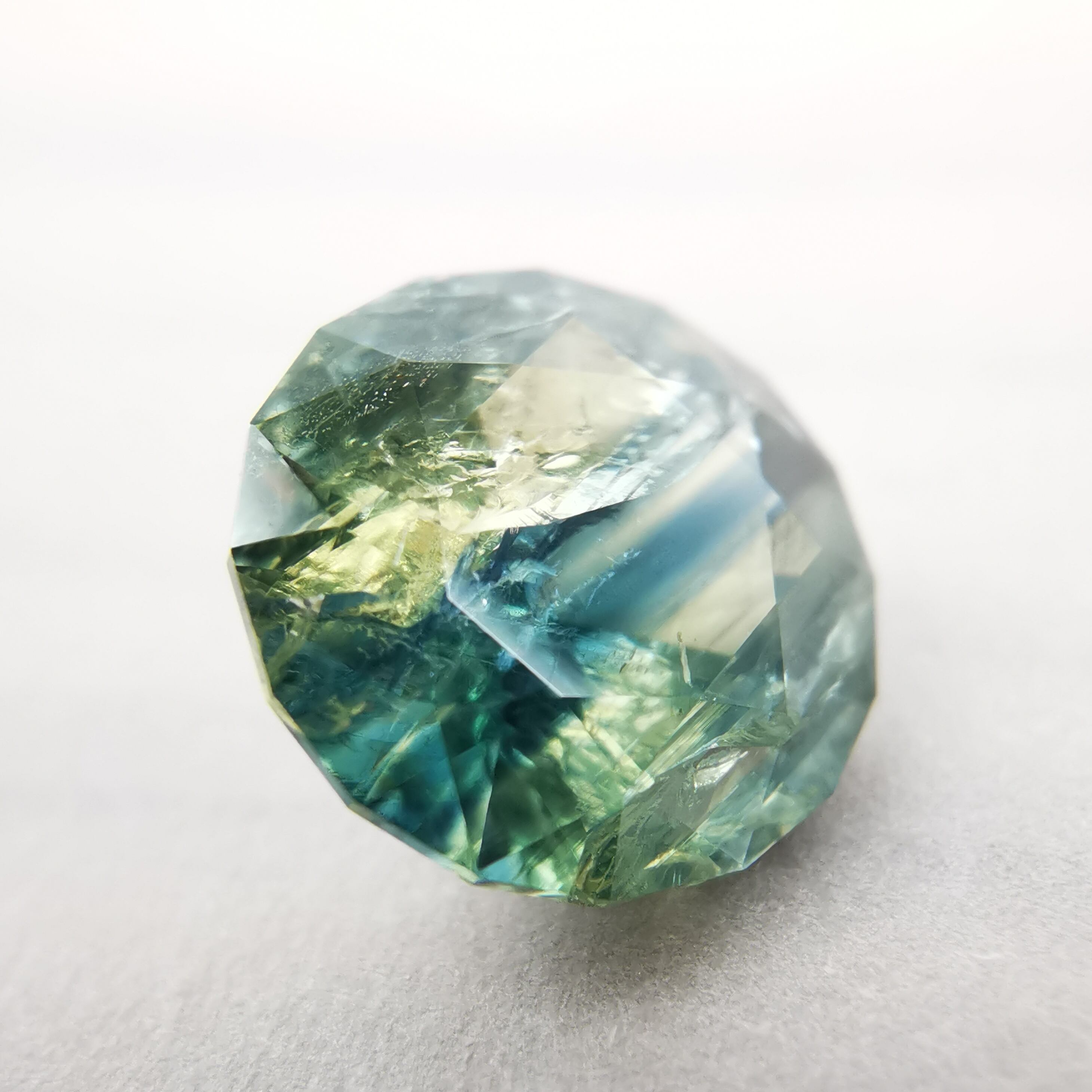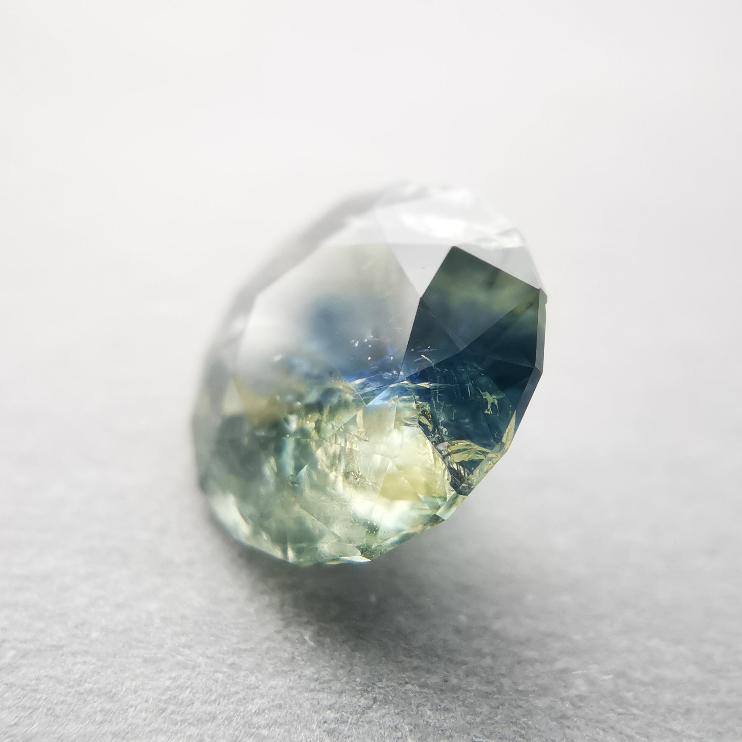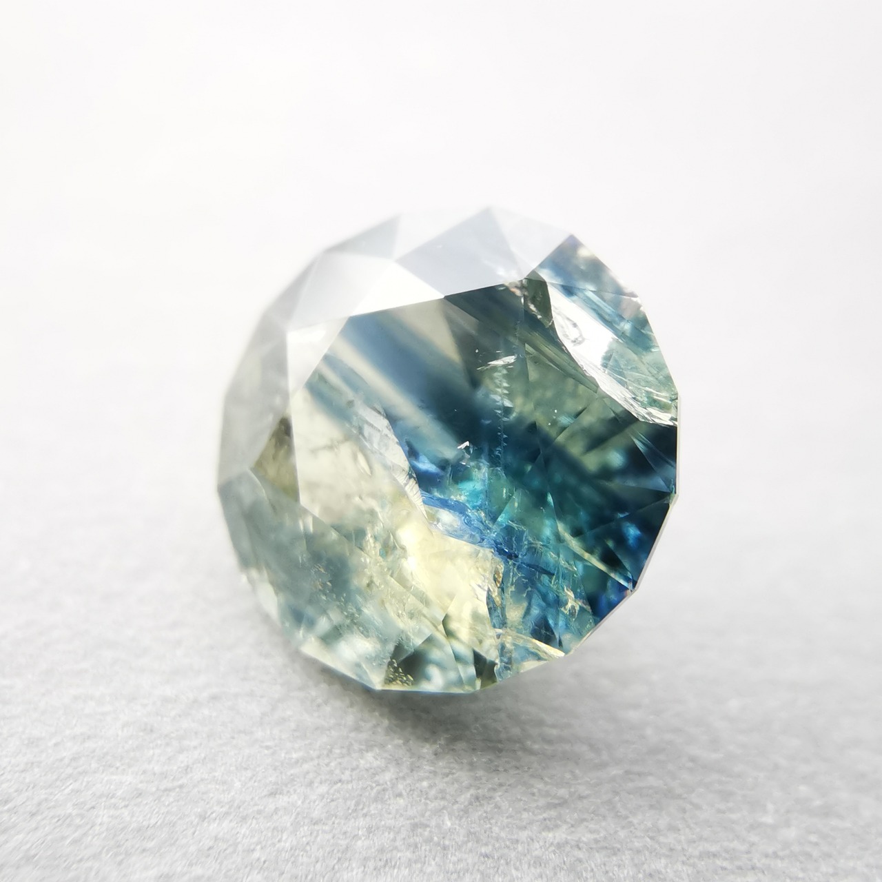 様々なインクルージョンがたっぷりと入った淡いイエローのサファイアに、ざざざっと大きくブルーグリーンのカラーバンドが入りました。